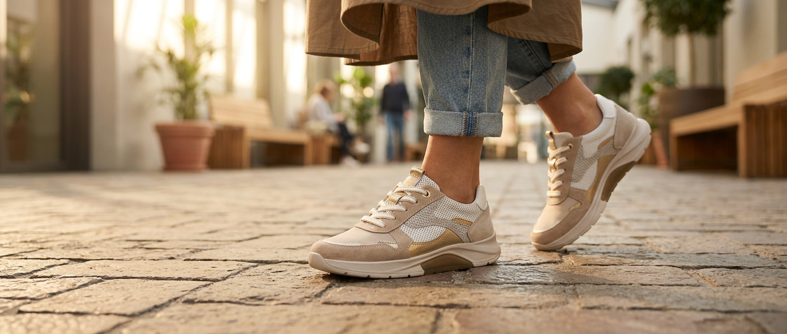Met gevoelige voeten kan een simpele wandeling al snel ongemakkelijk worden. De oplossing? Zachte, flexibele schoenen. Let bij het kiezen op een dempende binnenzool. Merken zoals Gabor staan bekend om hun comfortabele schoenen met goede demping. Naast demping is ook een flexibele zool belangrijk: die beweegt soepel mee met je voet. Vermijd harde leersoorten en stiksels waar mogelijk.