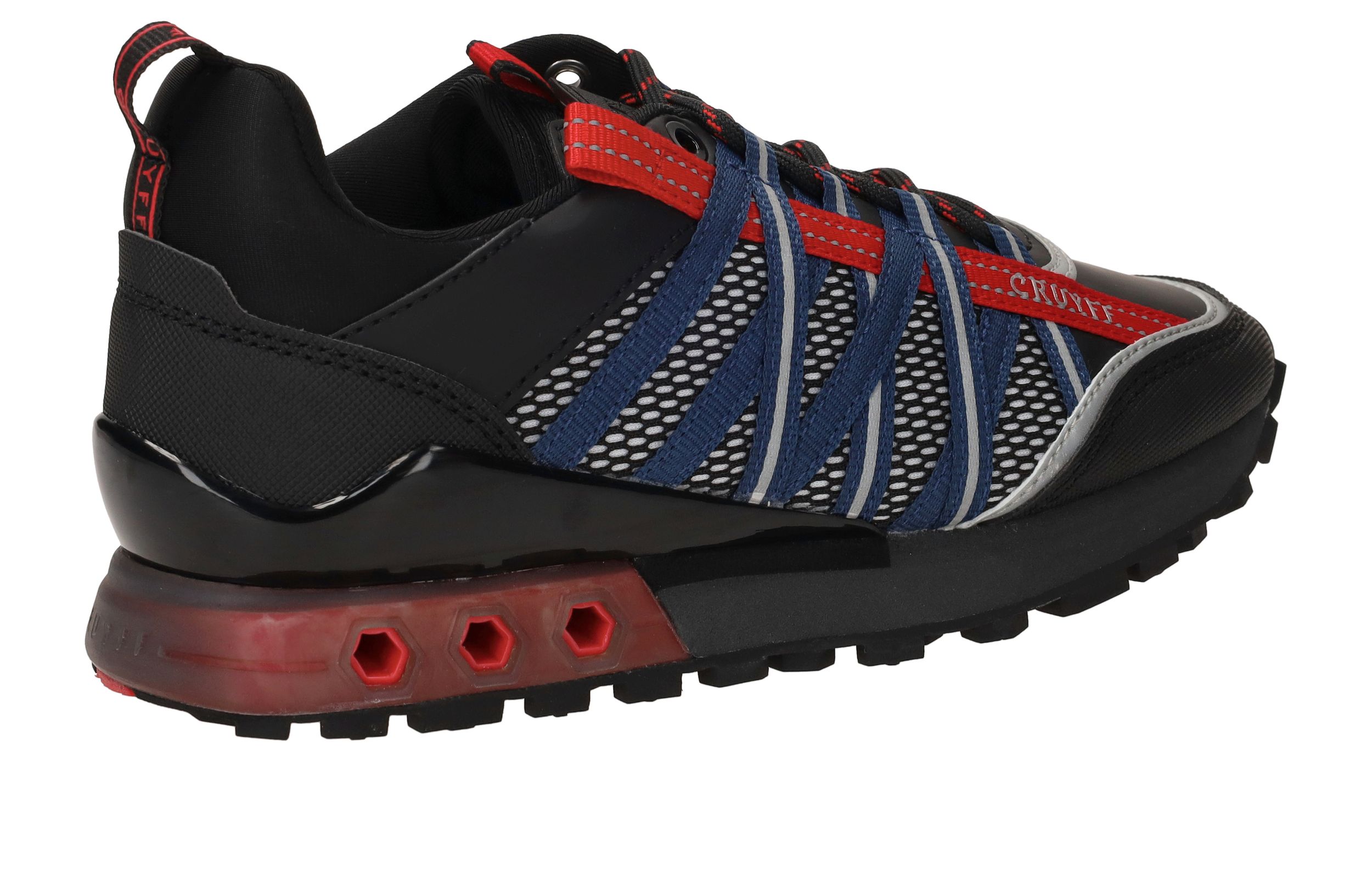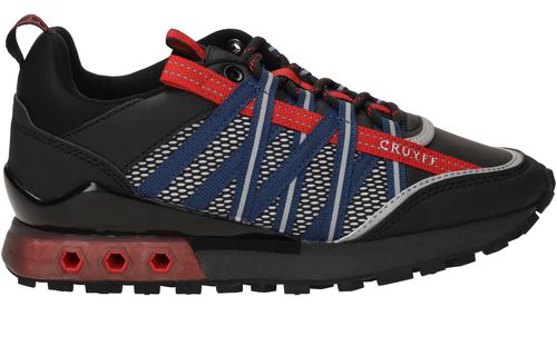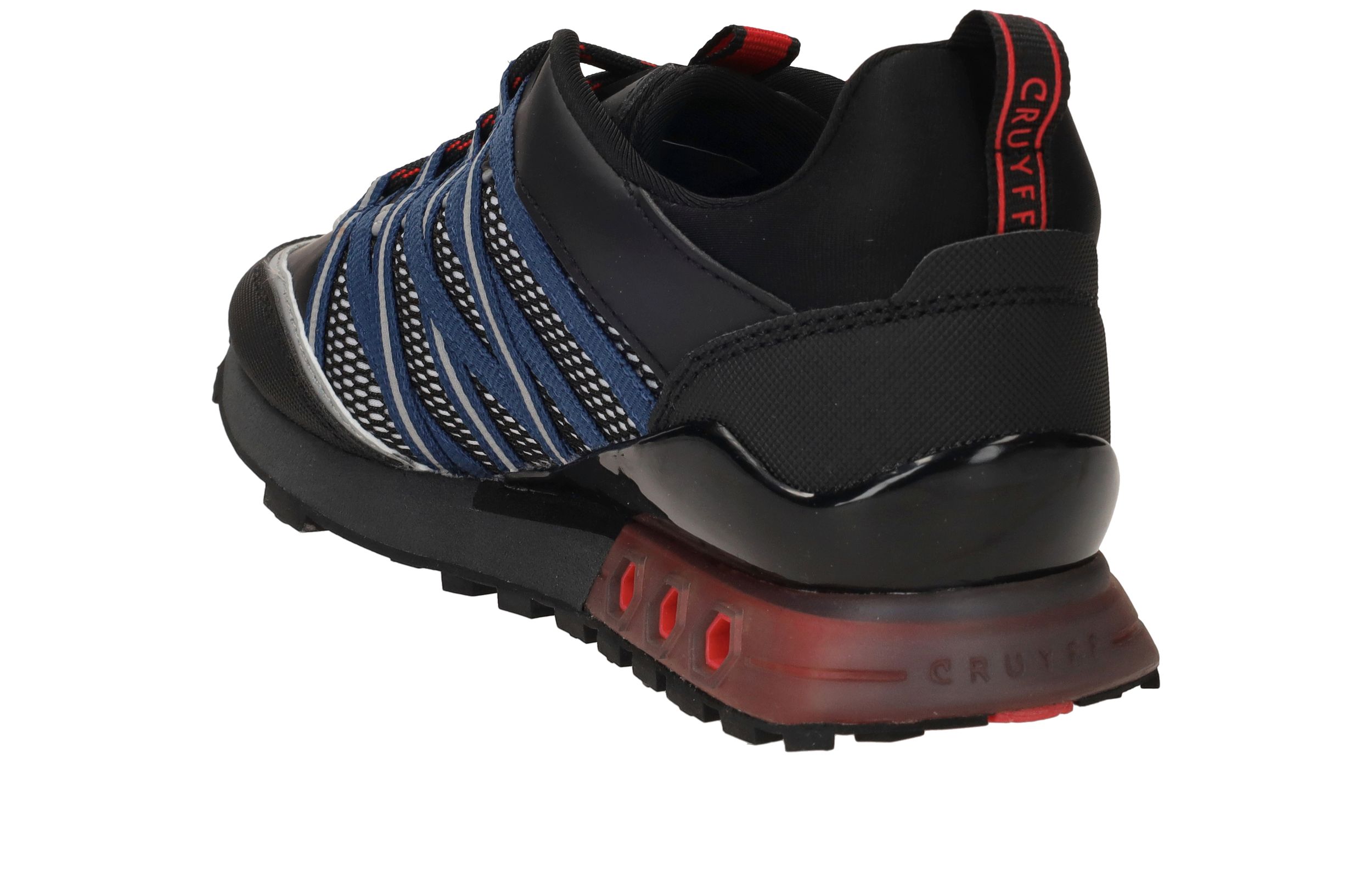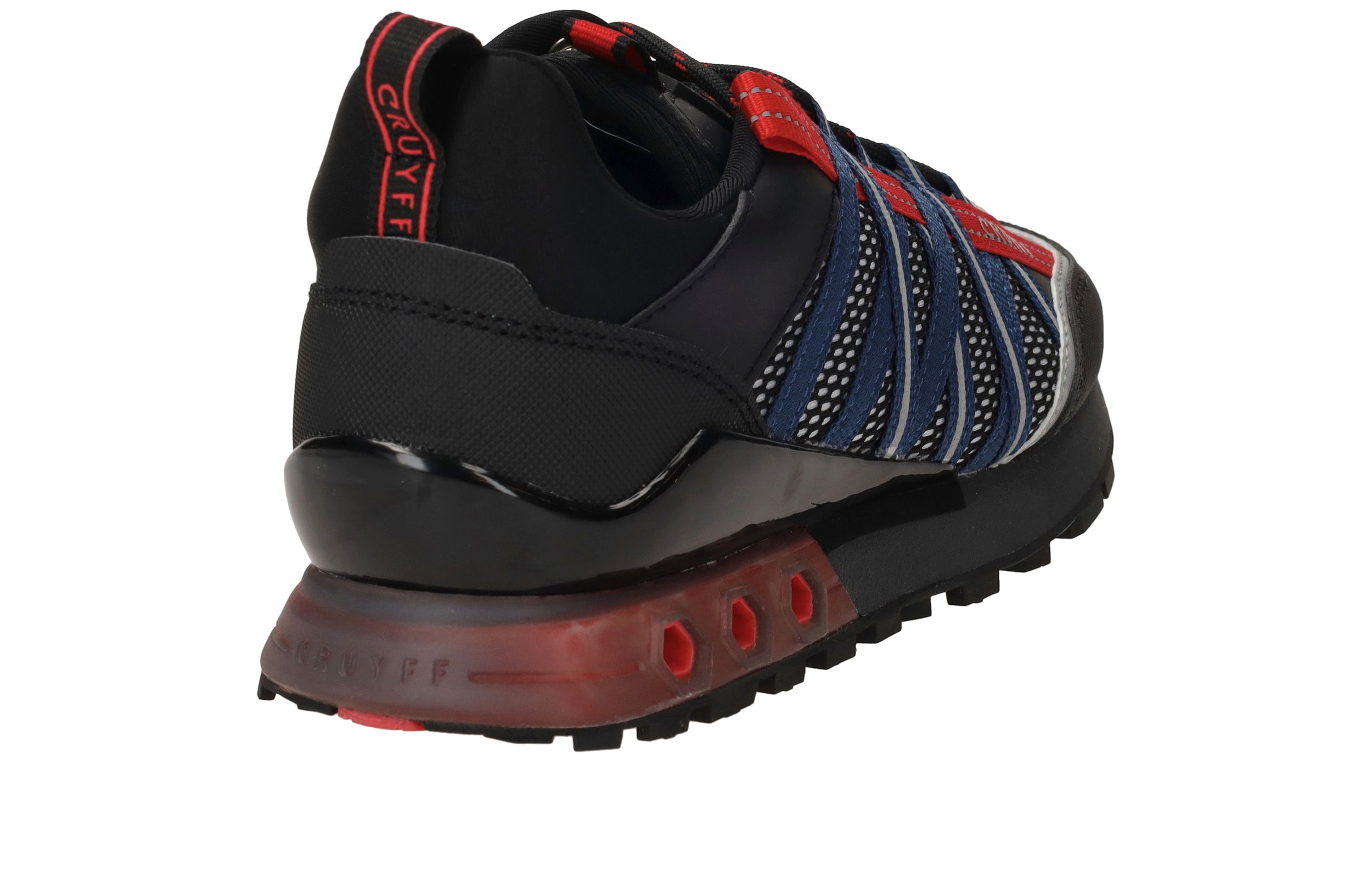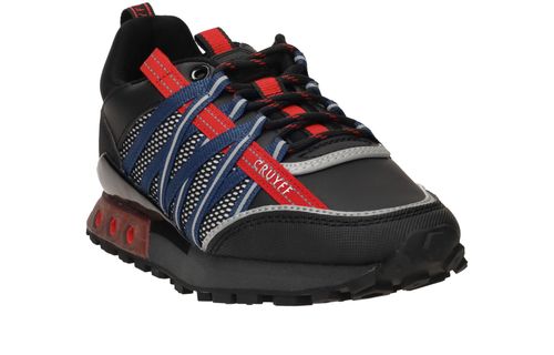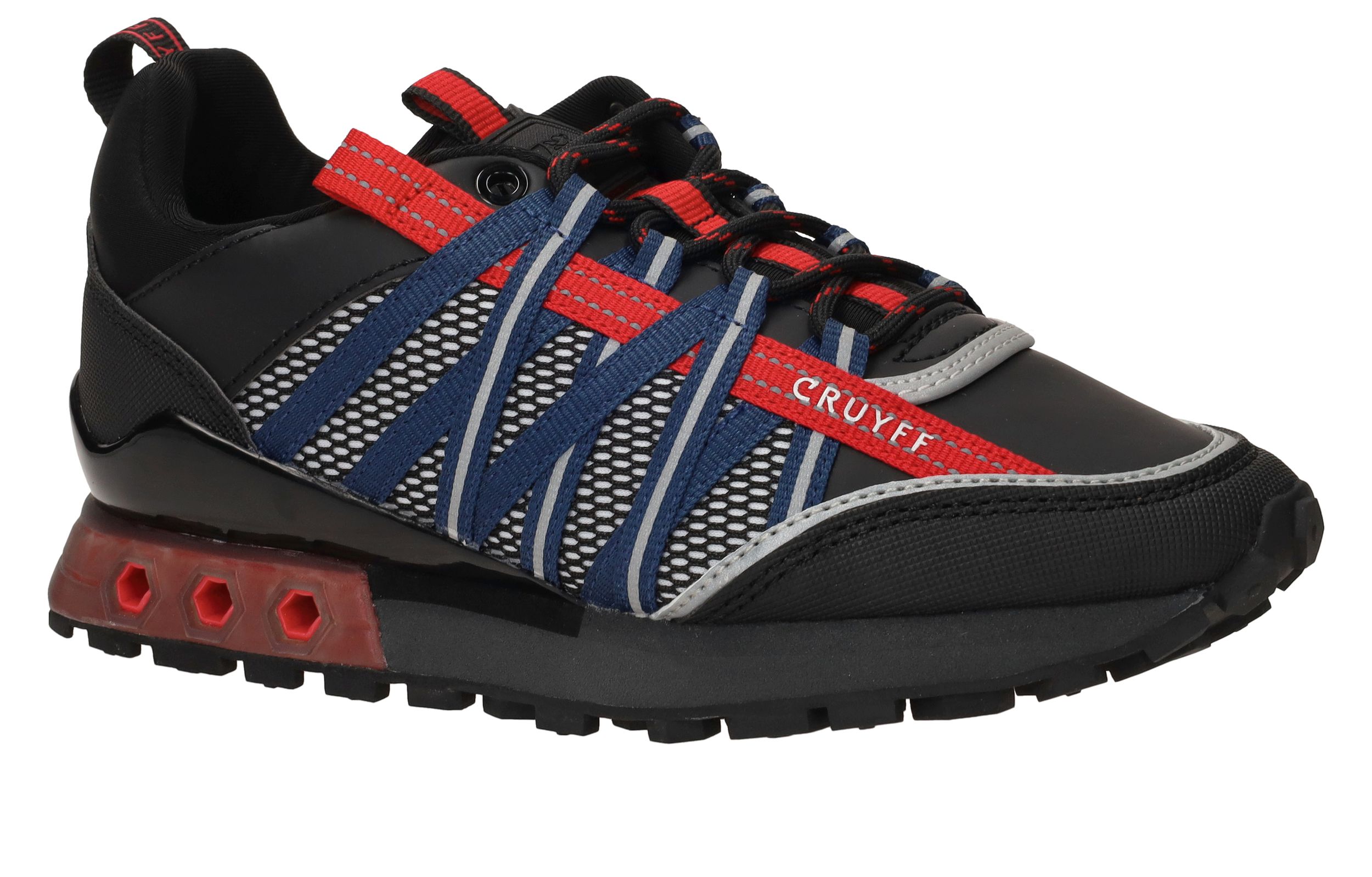 Sportieve Cruyff Fearia sneaker voor jongens met toffe blauwe en rode accenten. Deze zwarte sneaker combineer je makkelijk met al je outfits en is geschikt om alle seizoenen te dragen.