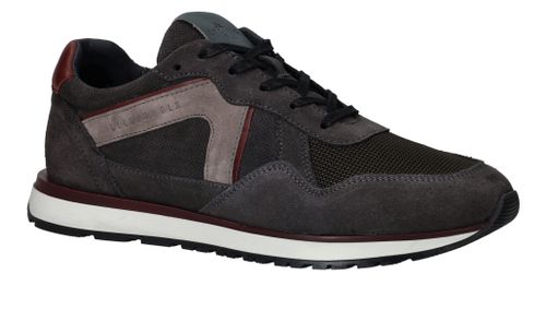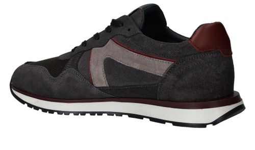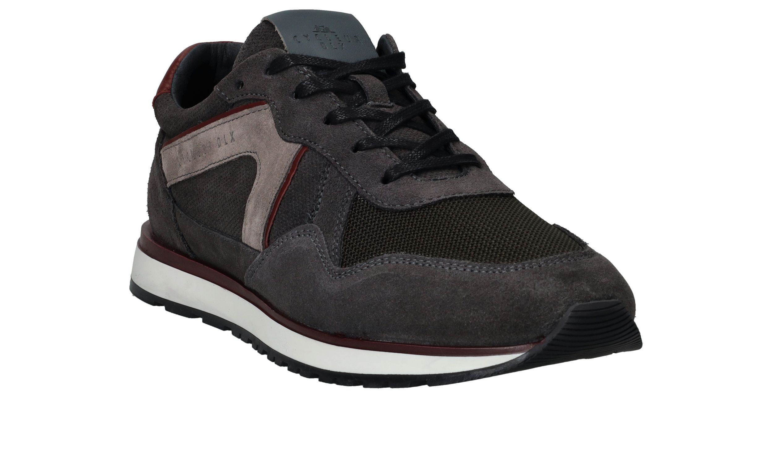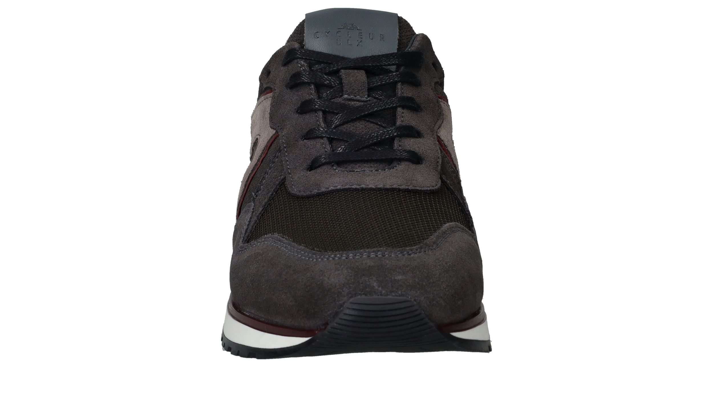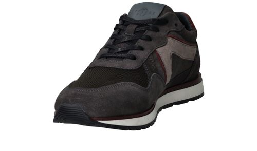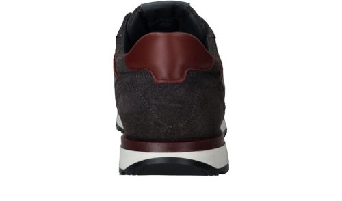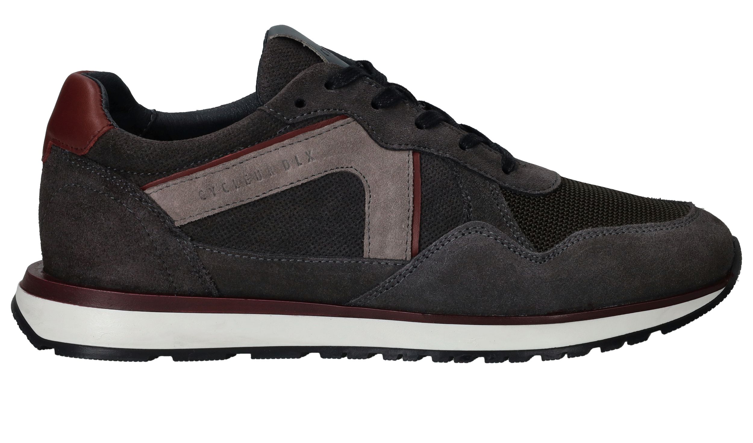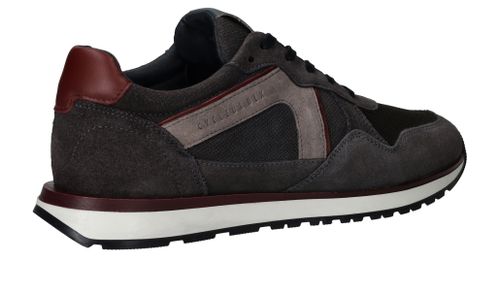 Sportieve Cycleur DLX Coffin sneaker voor heren in een warme grijze kleur. De sneaker is helemaal gemaakt van suède en de bordeauxrode accenten maken de schoen helemaal af.