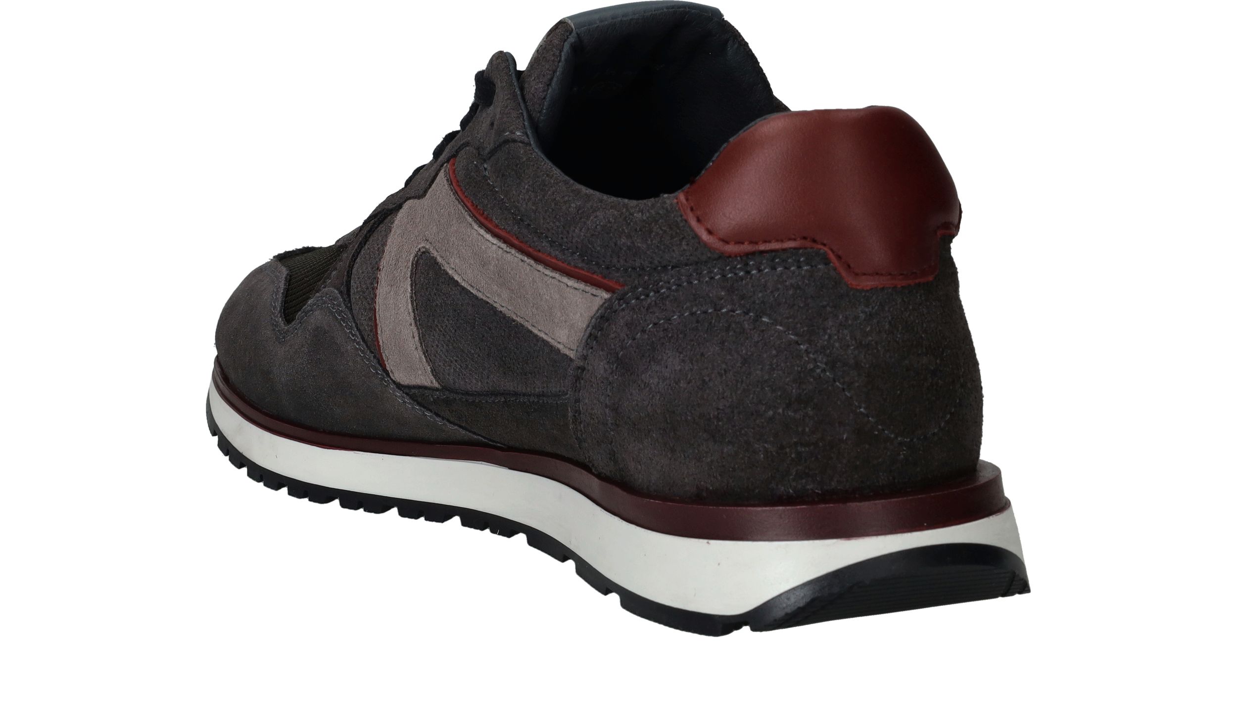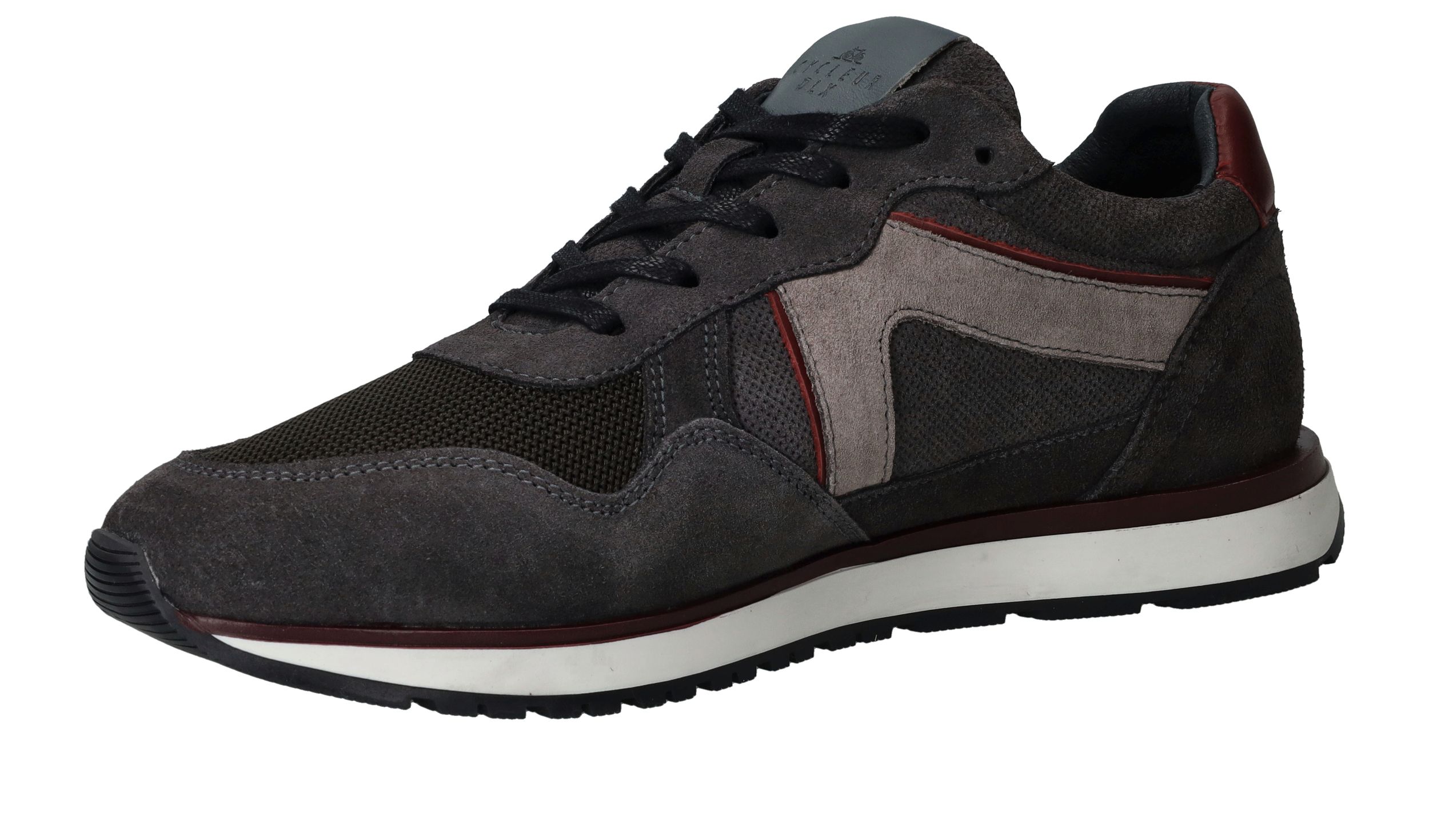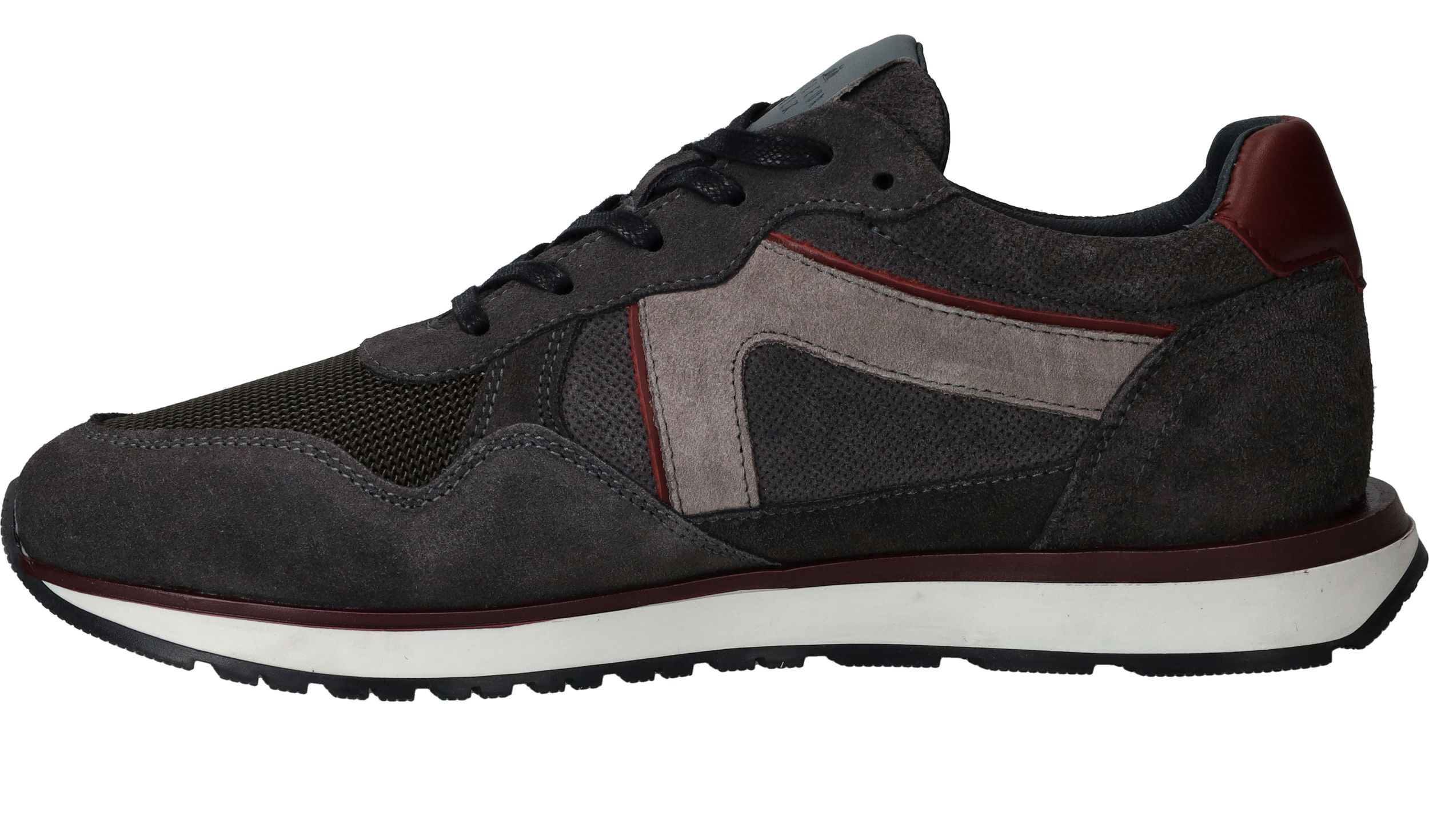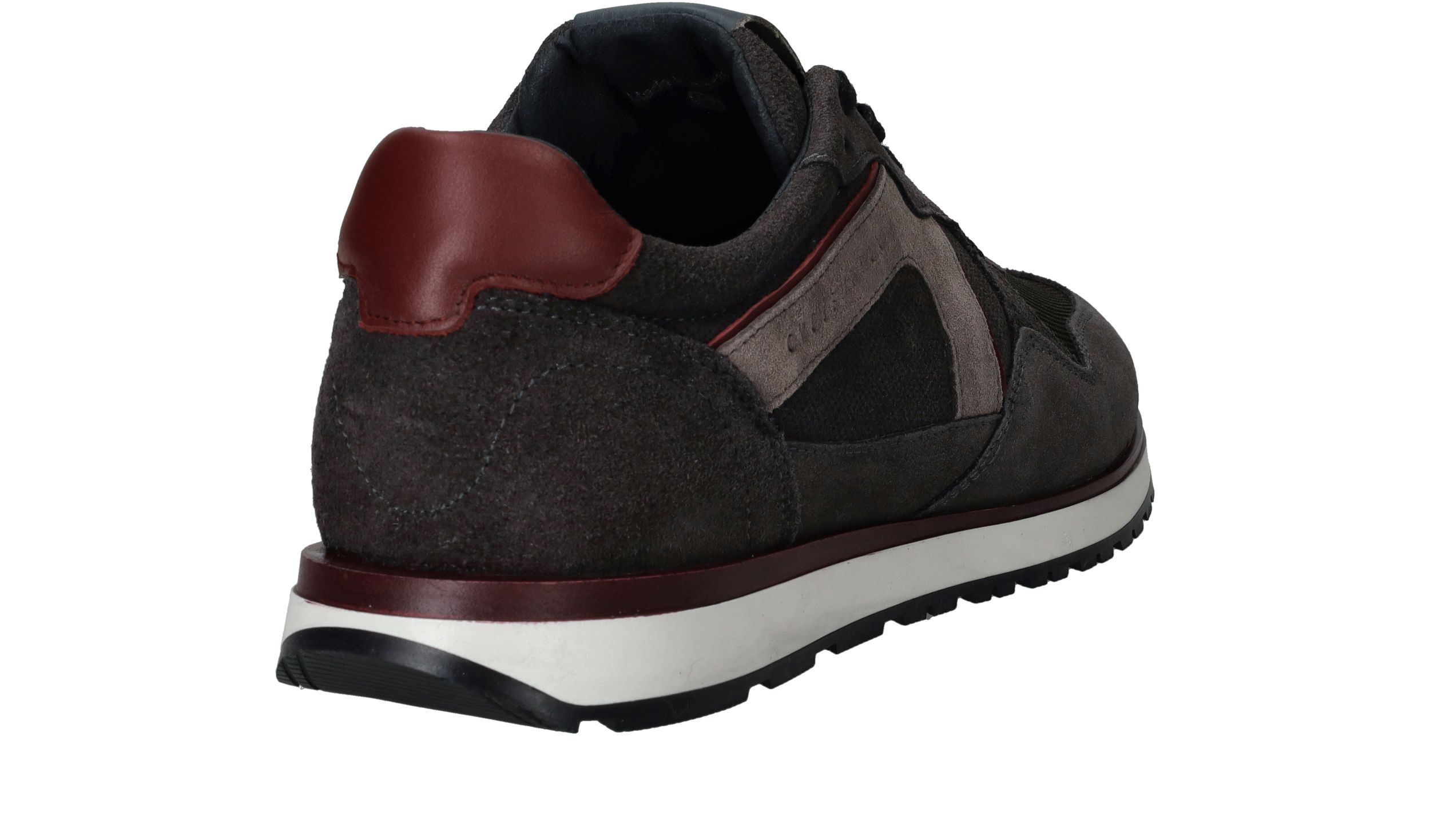 Sportieve Cycleur DLX Coffin sneaker voor heren in een warme grijze kleur. De sneaker is helemaal gemaakt van suède en de bordeauxrode accenten maken de schoen helemaal af.