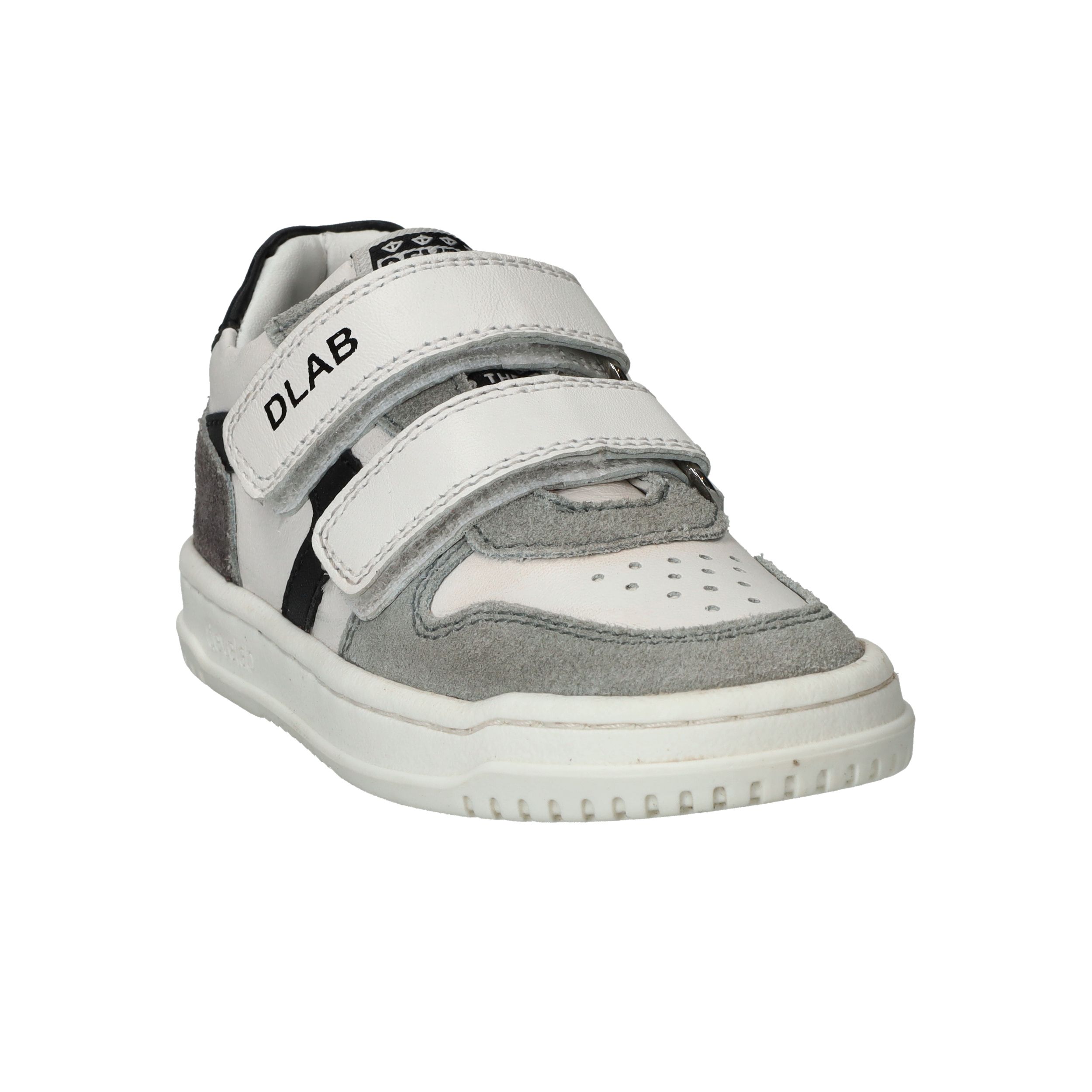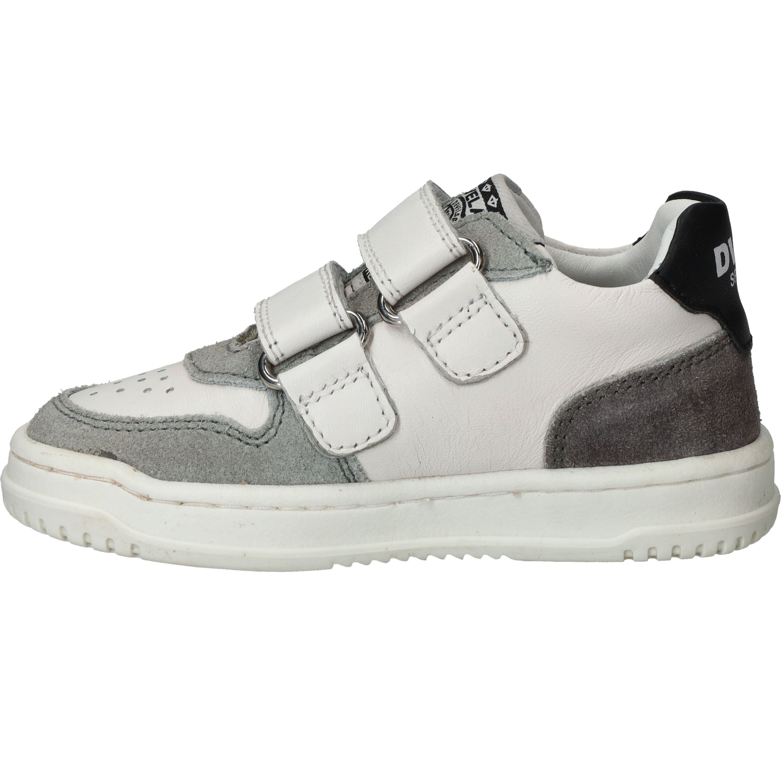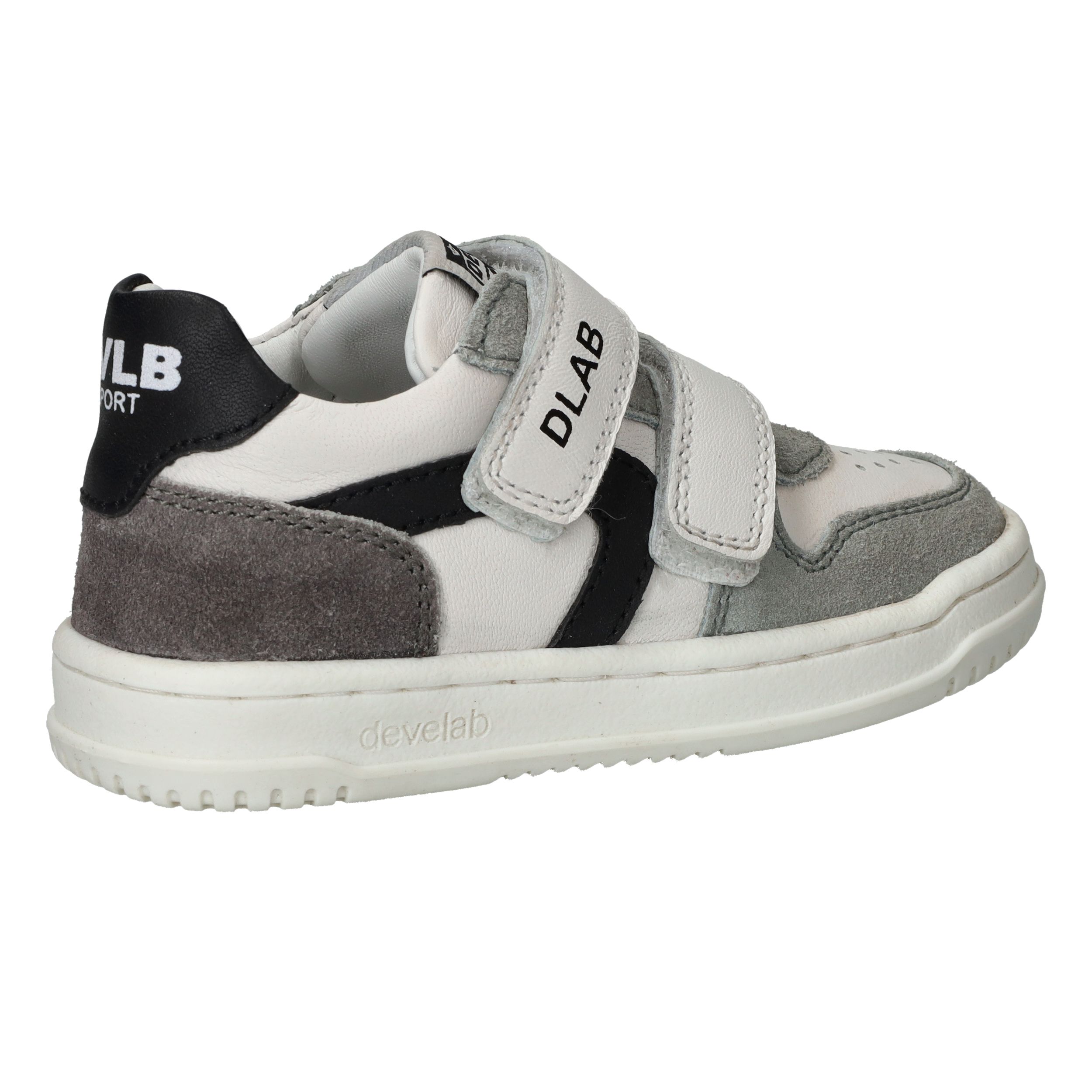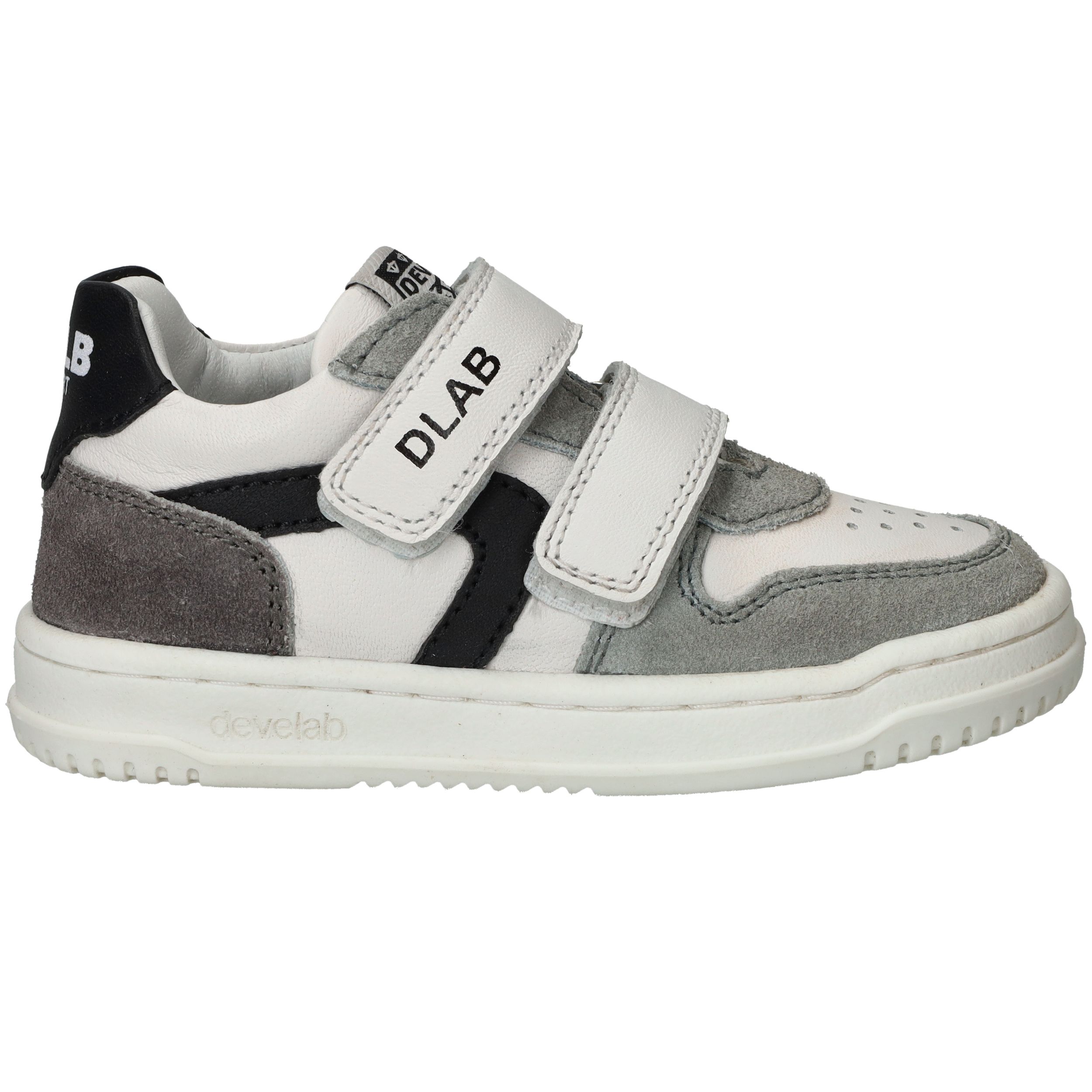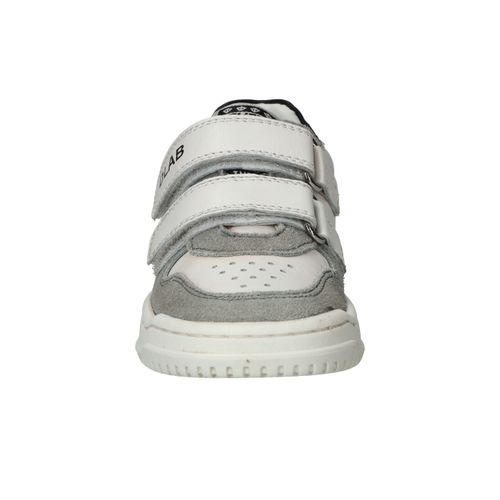 Stevige Develab sneaker voor jongens. De witte sneaker heeft suède kleurvlakken en zwarte details.