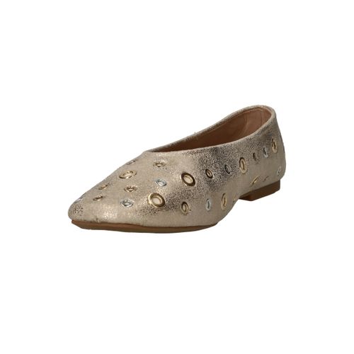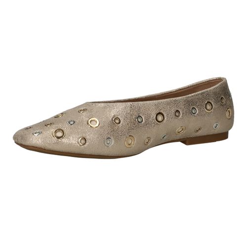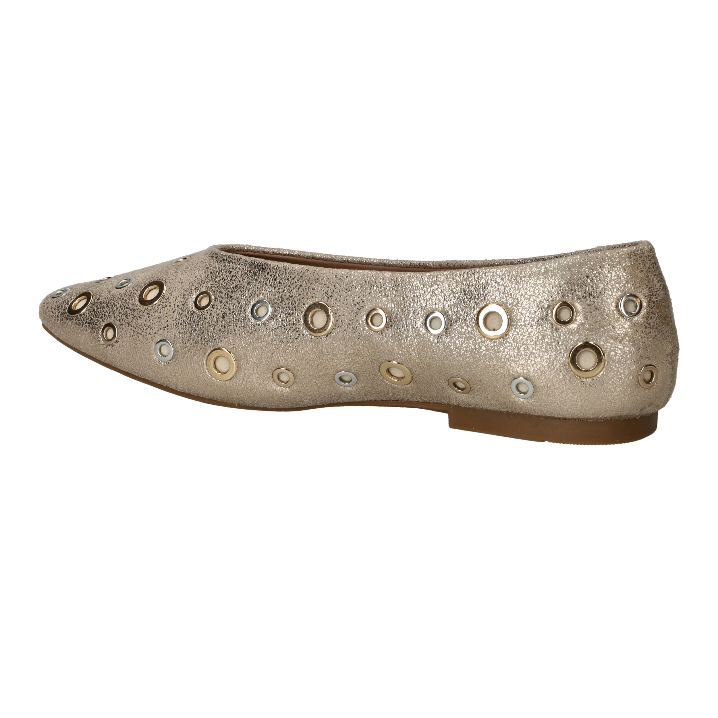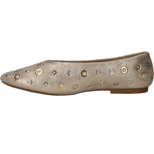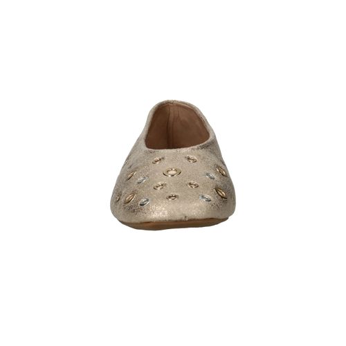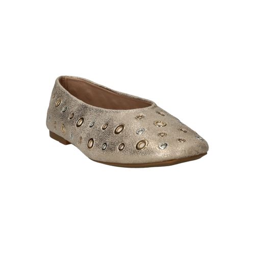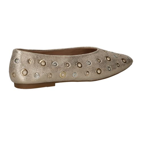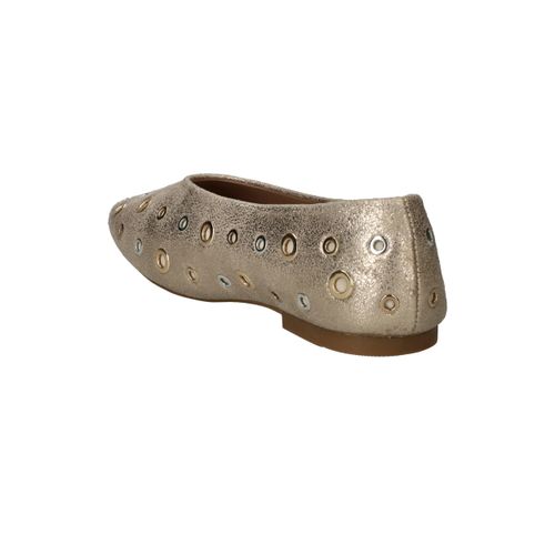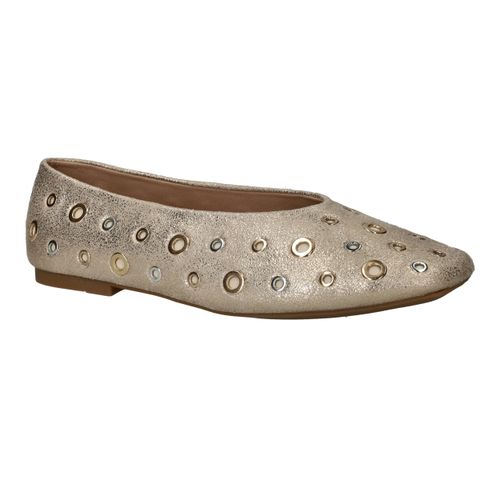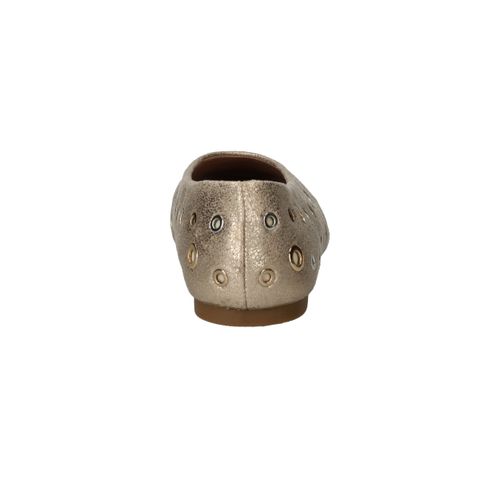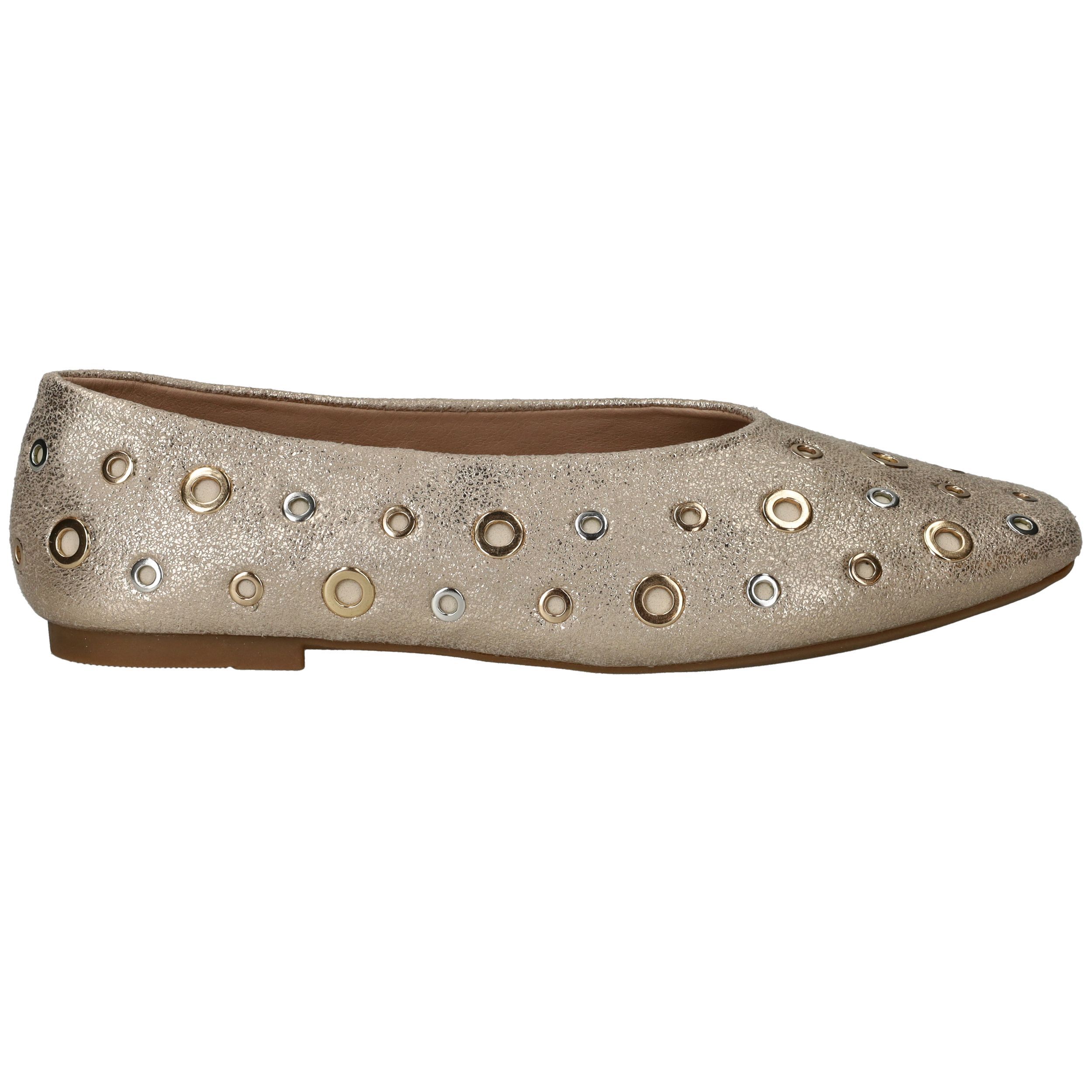 Deze sprankelende ballerina is perfect voor wie houdt van een vleugje glamour. Het model is uitgevoerd in glanzend goudkleurig leer en is versierd met speelse metalen ringen in zilver- en goudtinten. Dankzij de platte zool en het zachte voetbed biedt deze ballerina niet alleen stijl, maar ook comfort. Ideaal voor feestelijke gelegenheden of om je dagelijkse outfit een extra touch te geven!