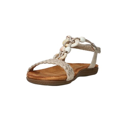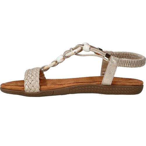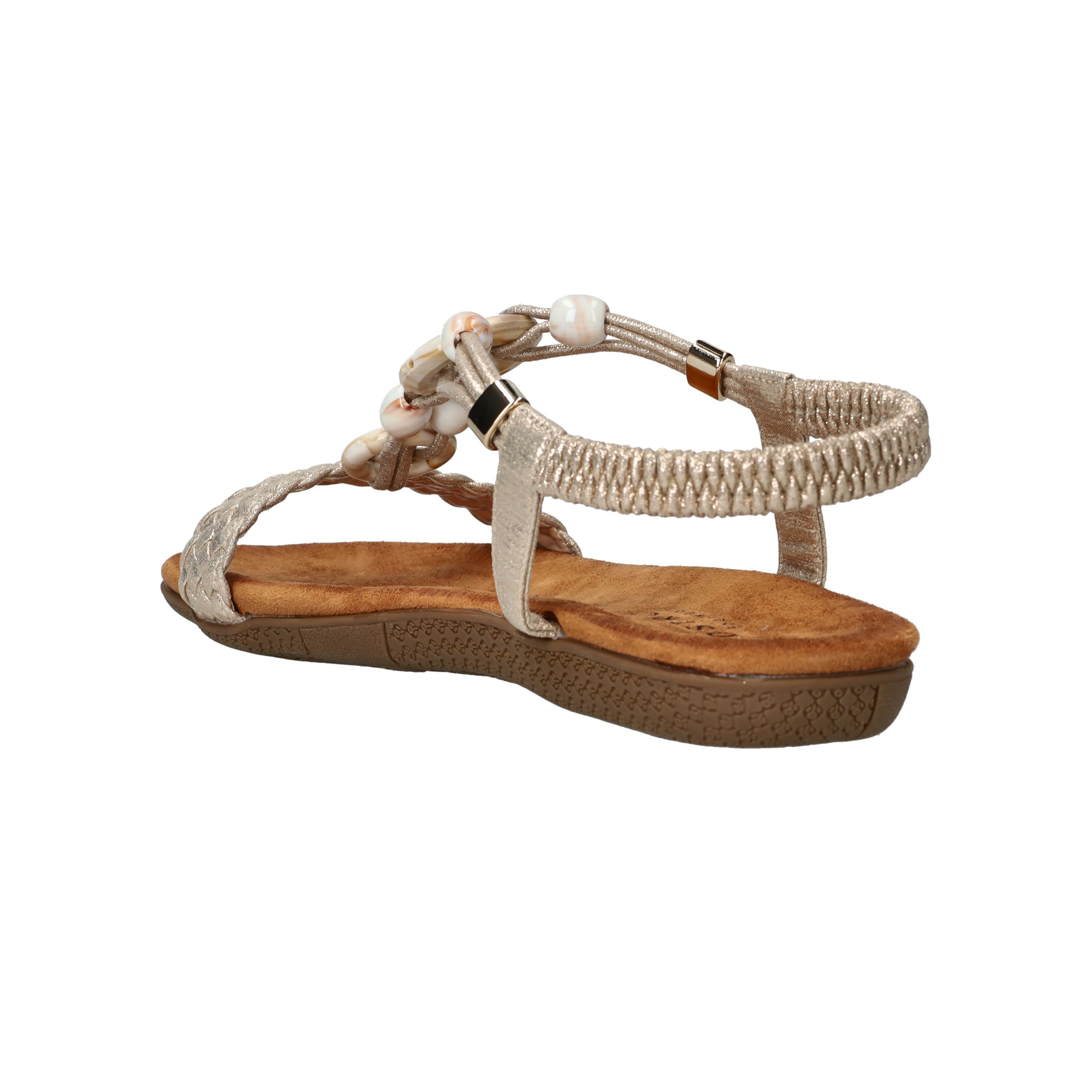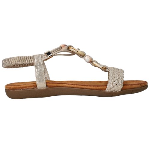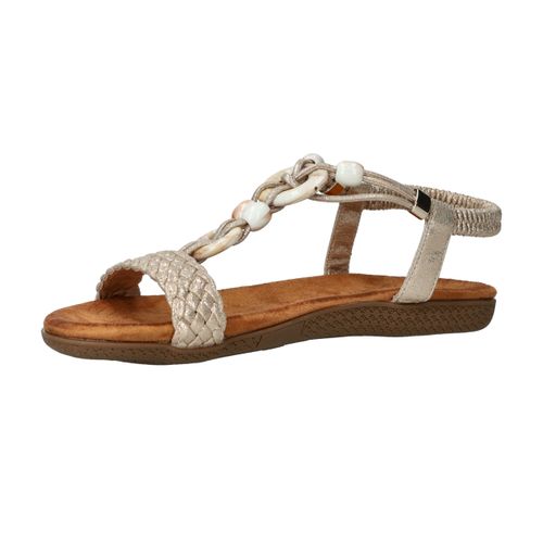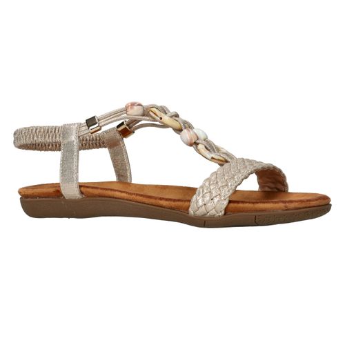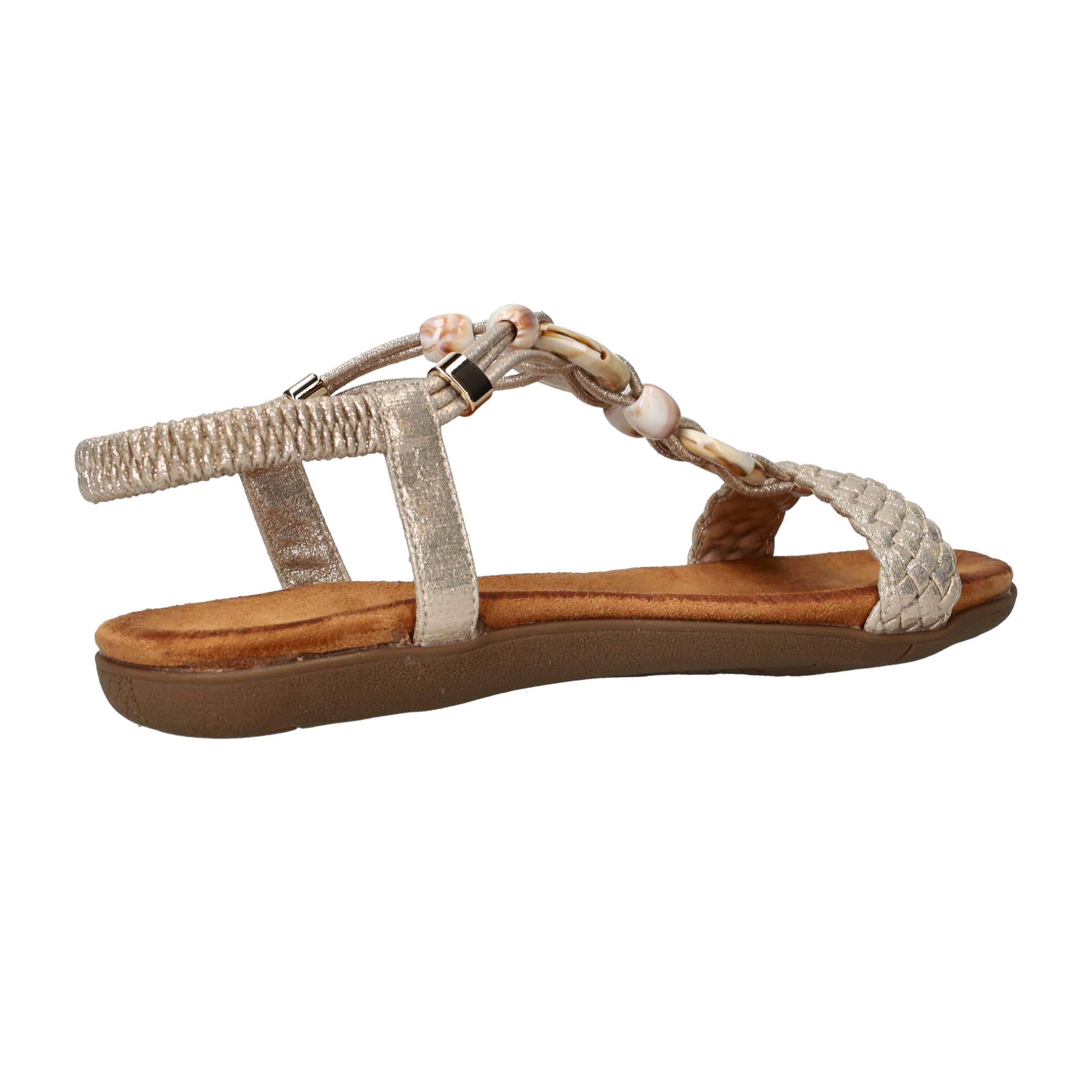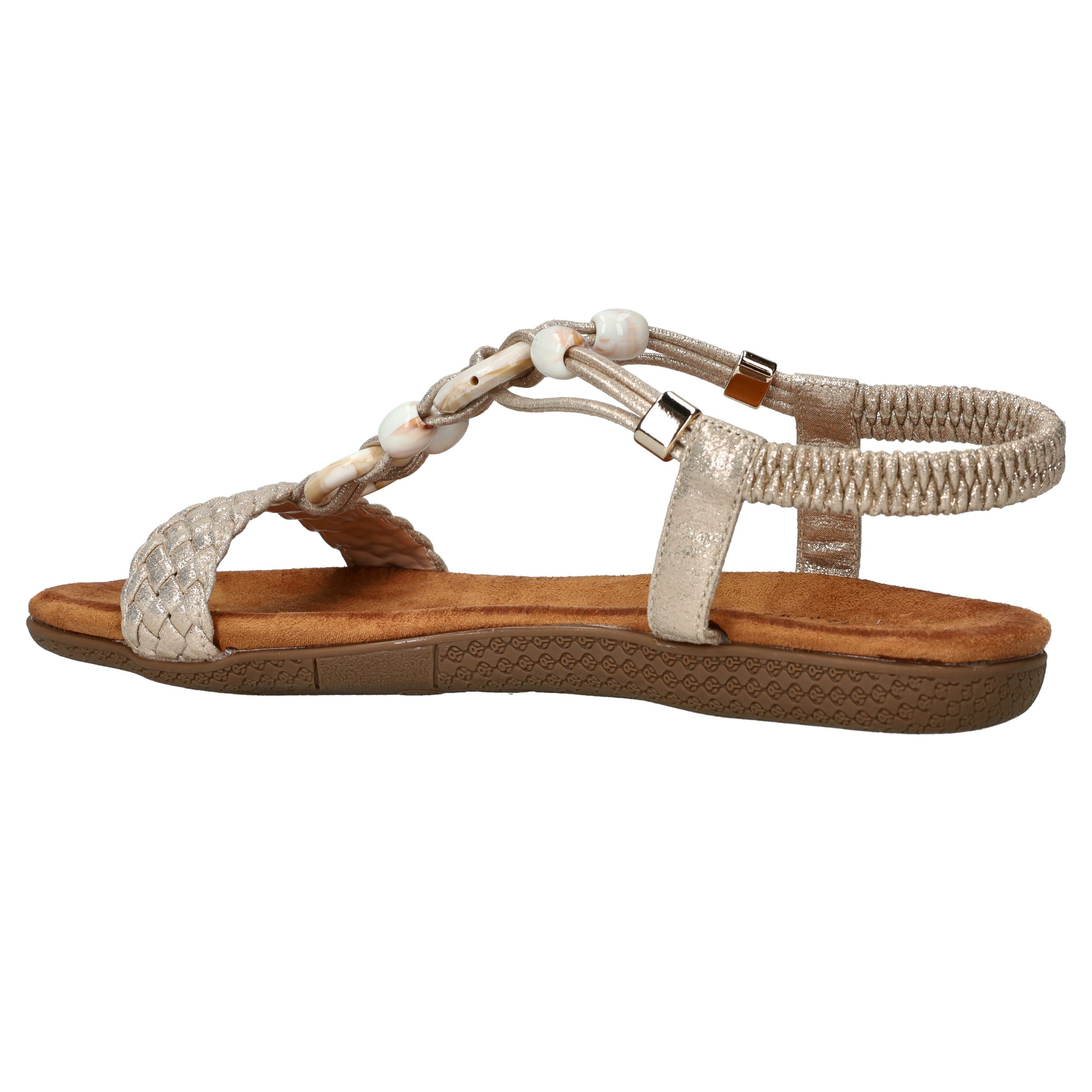 Deze gouden sandalen van DSTRCT zijn dé perfecte combinatie van stijl en comfort. De sierlijke kralen, gevlochten band en glanzend textiel geven deze sandaal een elegante, zomerse uitstraling. Dankzij de elastische instap stap je er moeiteloos in en loop je er de hele dag fijn op rond.