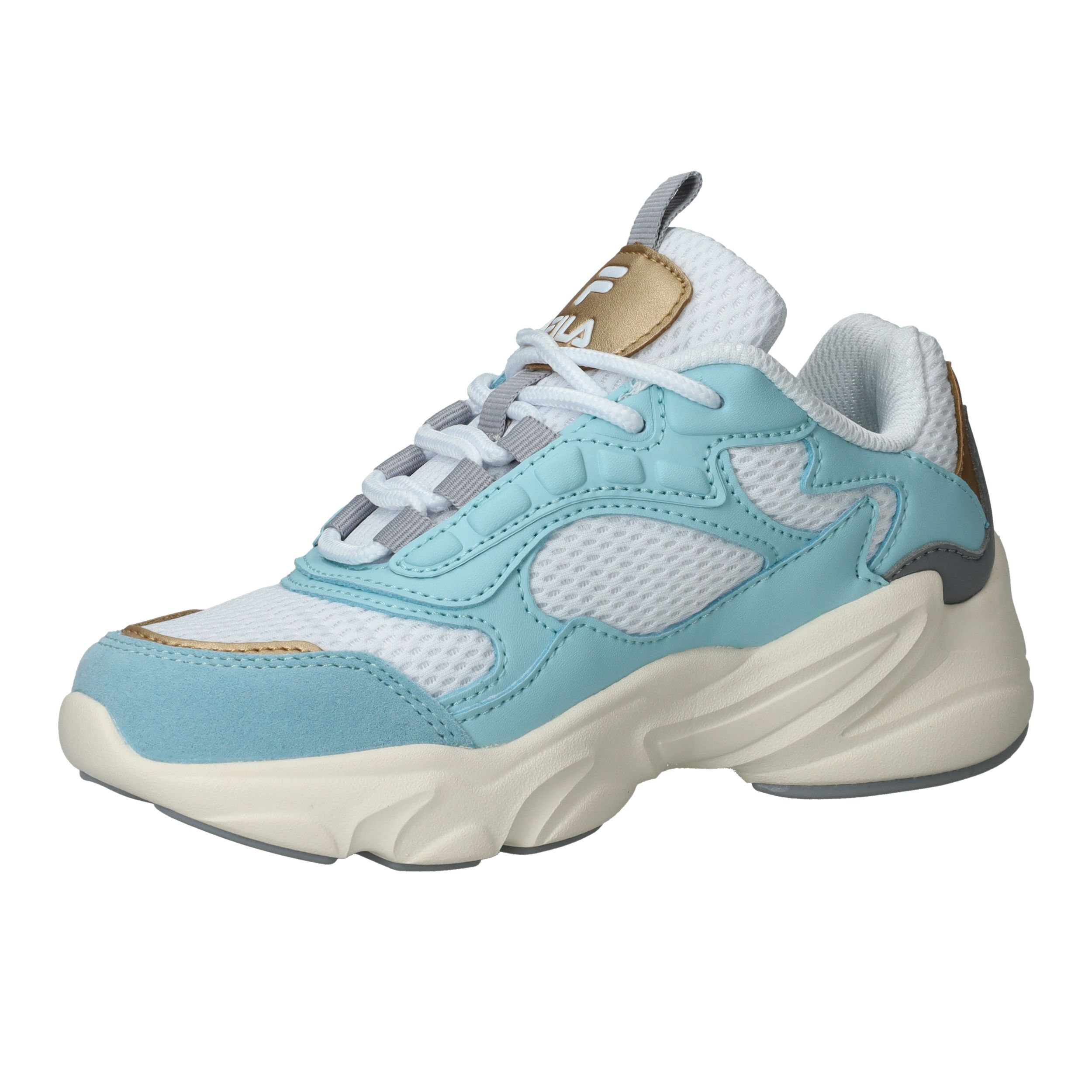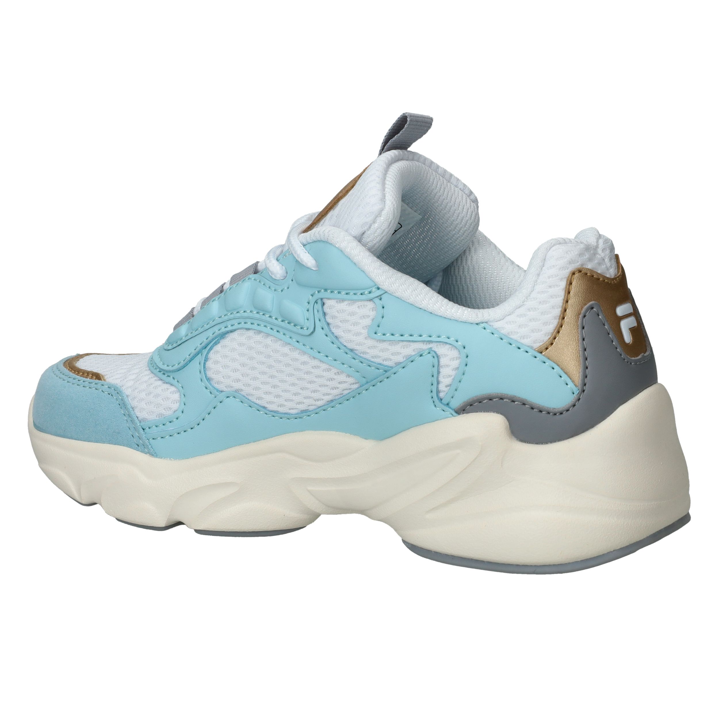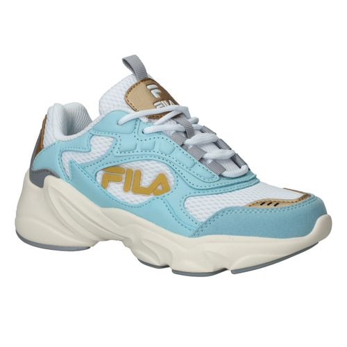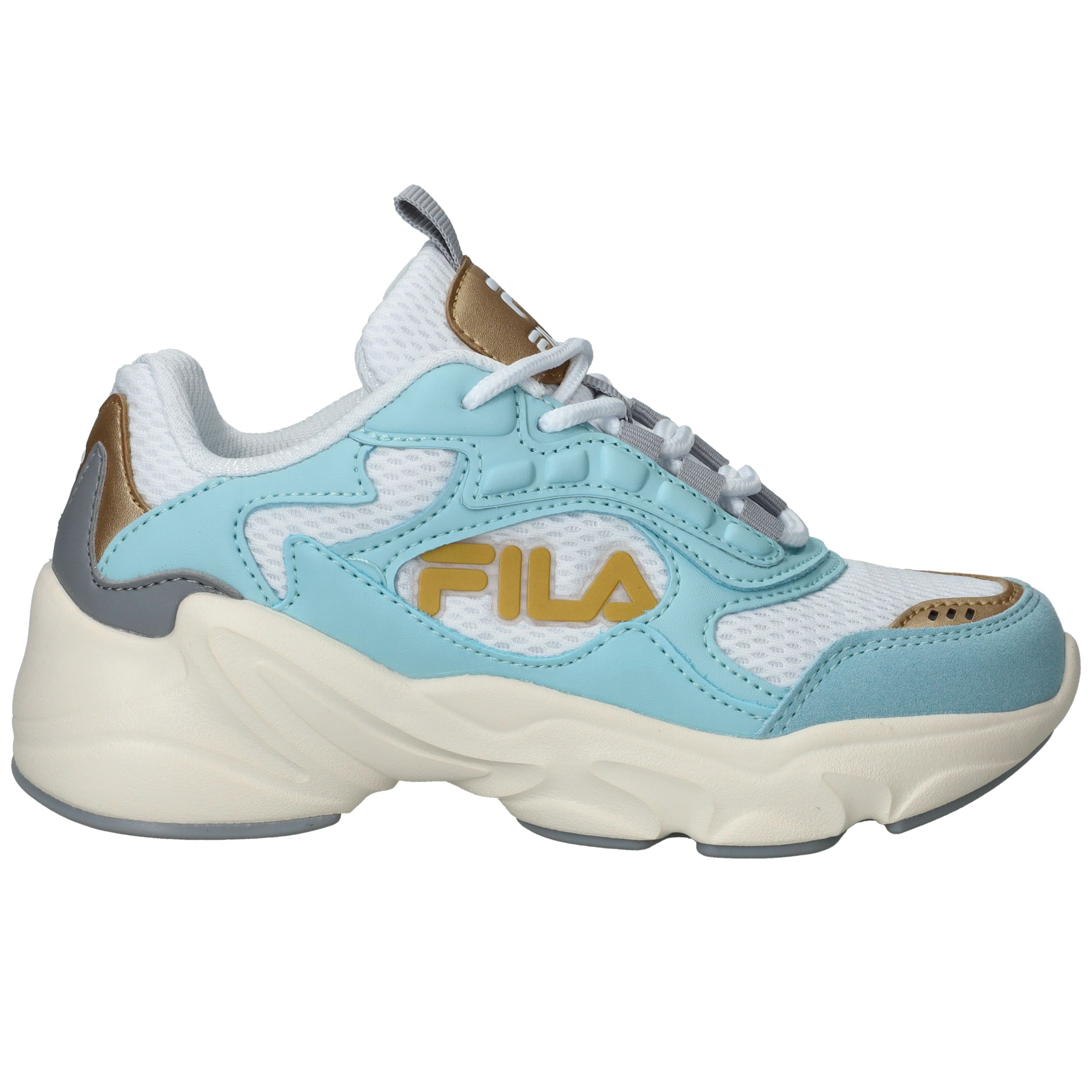Geef je outfit een frisse touch met de Fila Collene sneakers. Deze meisjesschoenen in een lichtblauwe met witte en gouden accenten zijn vervaardigd uit een combinatie van synthetisch materiaal en textiel, wat zorgt voor een lichtgewicht en comfortabele pasvorm. De Collene sneakers combineren een retro design met moderne details, waardoor ze perfect zijn voor dagelijks gebruik. Met deze sneakers loop je niet alleen comfortabel, maar maak je ook een fashion statement.