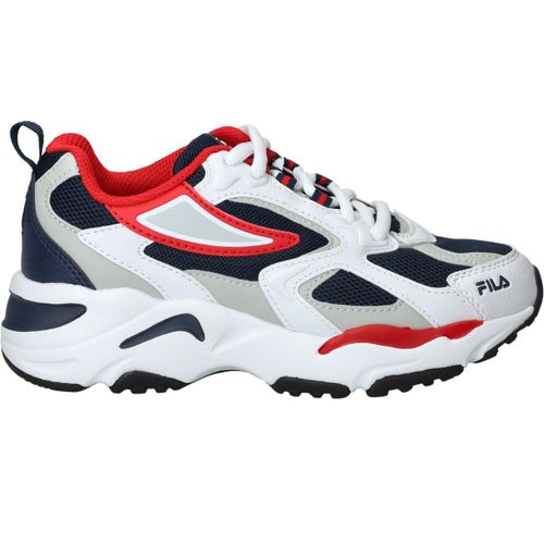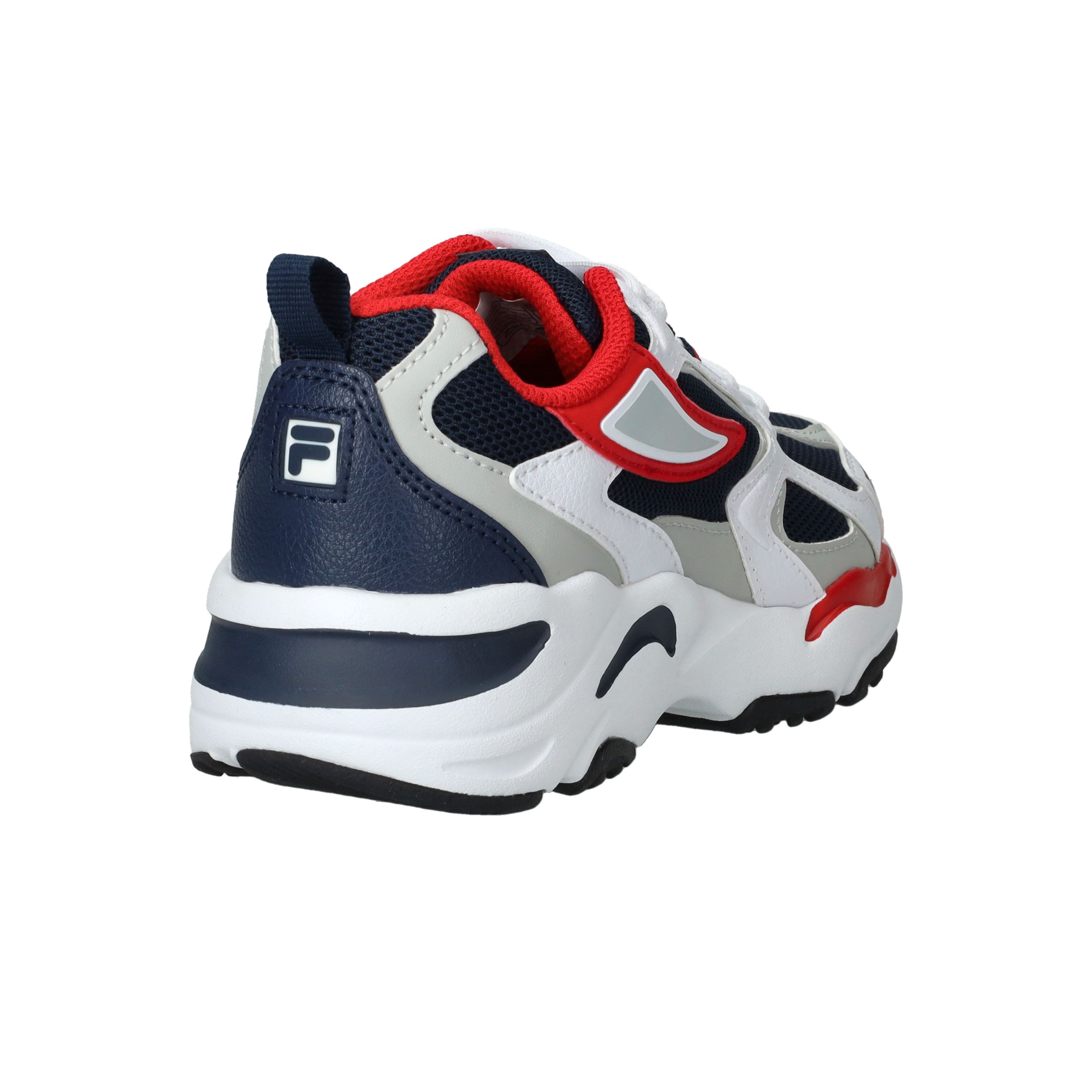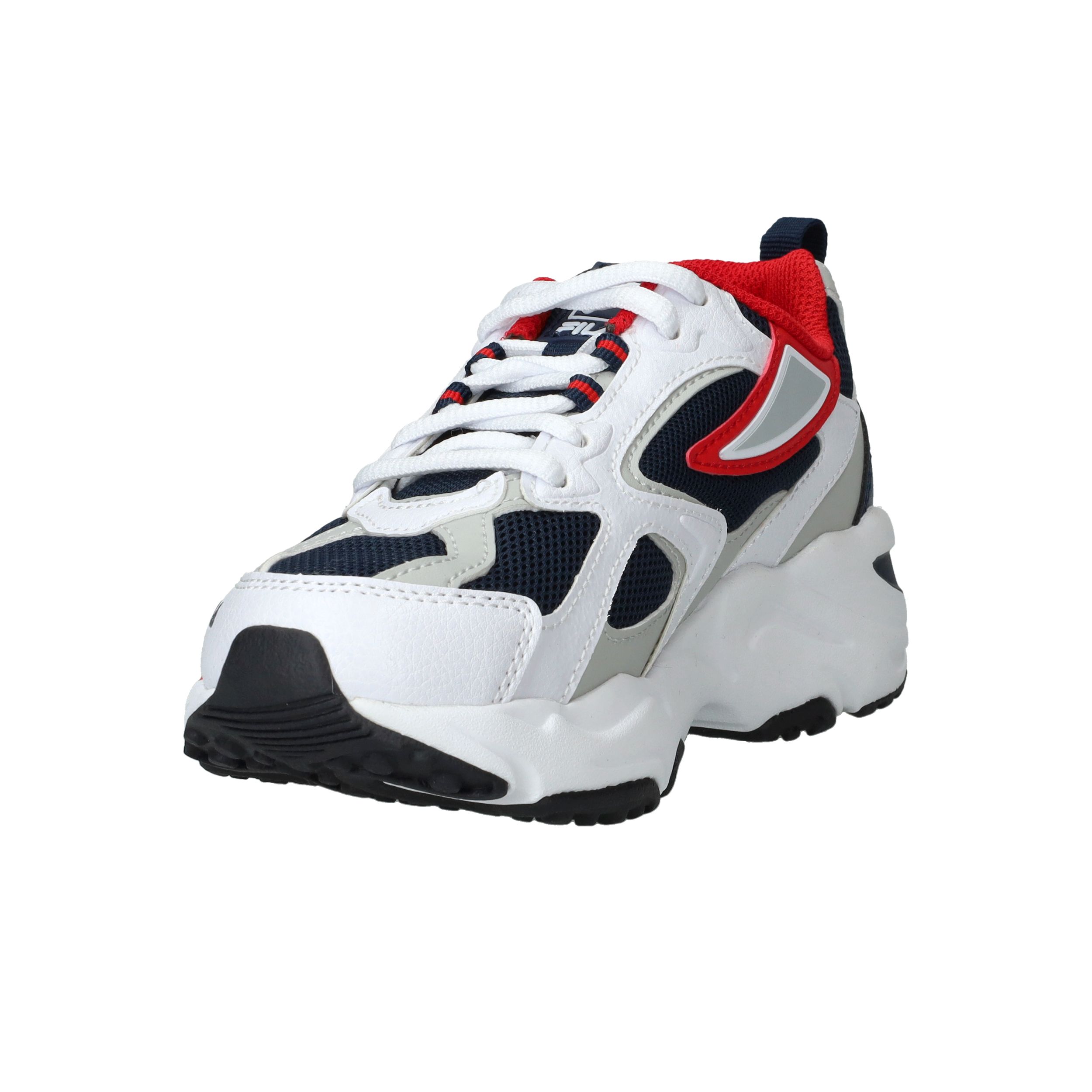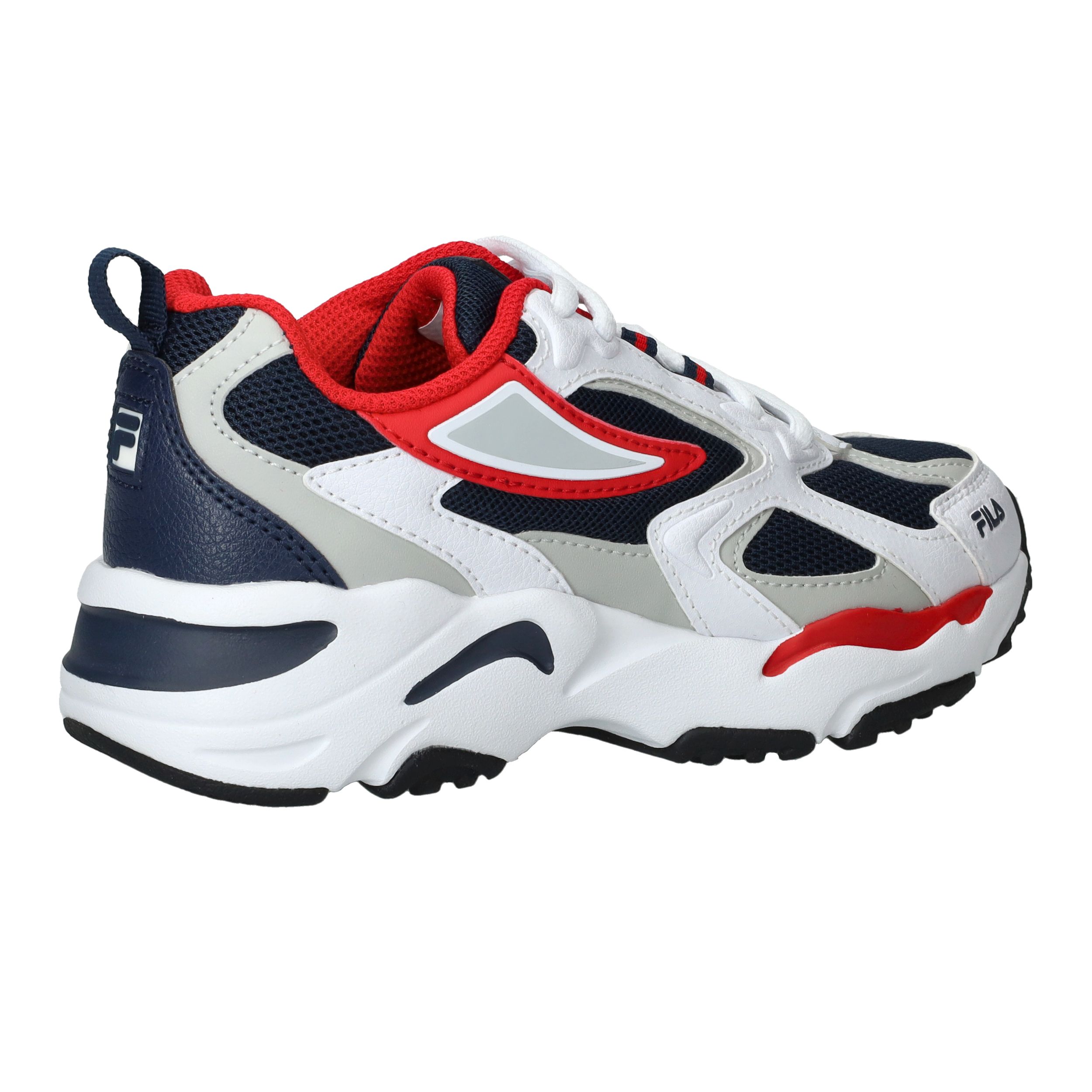 Sportieve Fila CR-CW02 Ray Tracer sneaker voor jongens. De sneaker heeft een kleurenpalet van wit, rood en donker blauw.