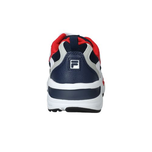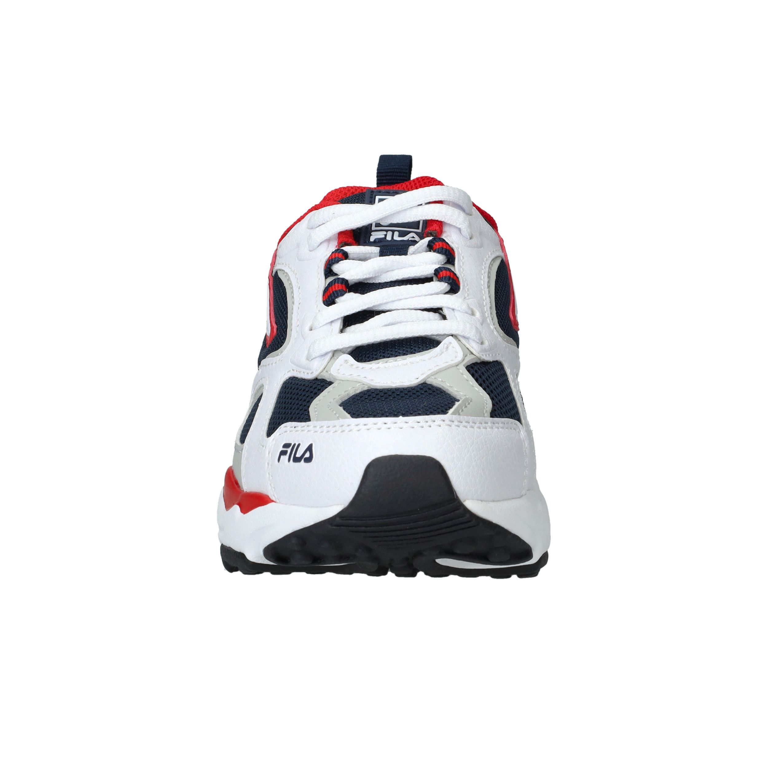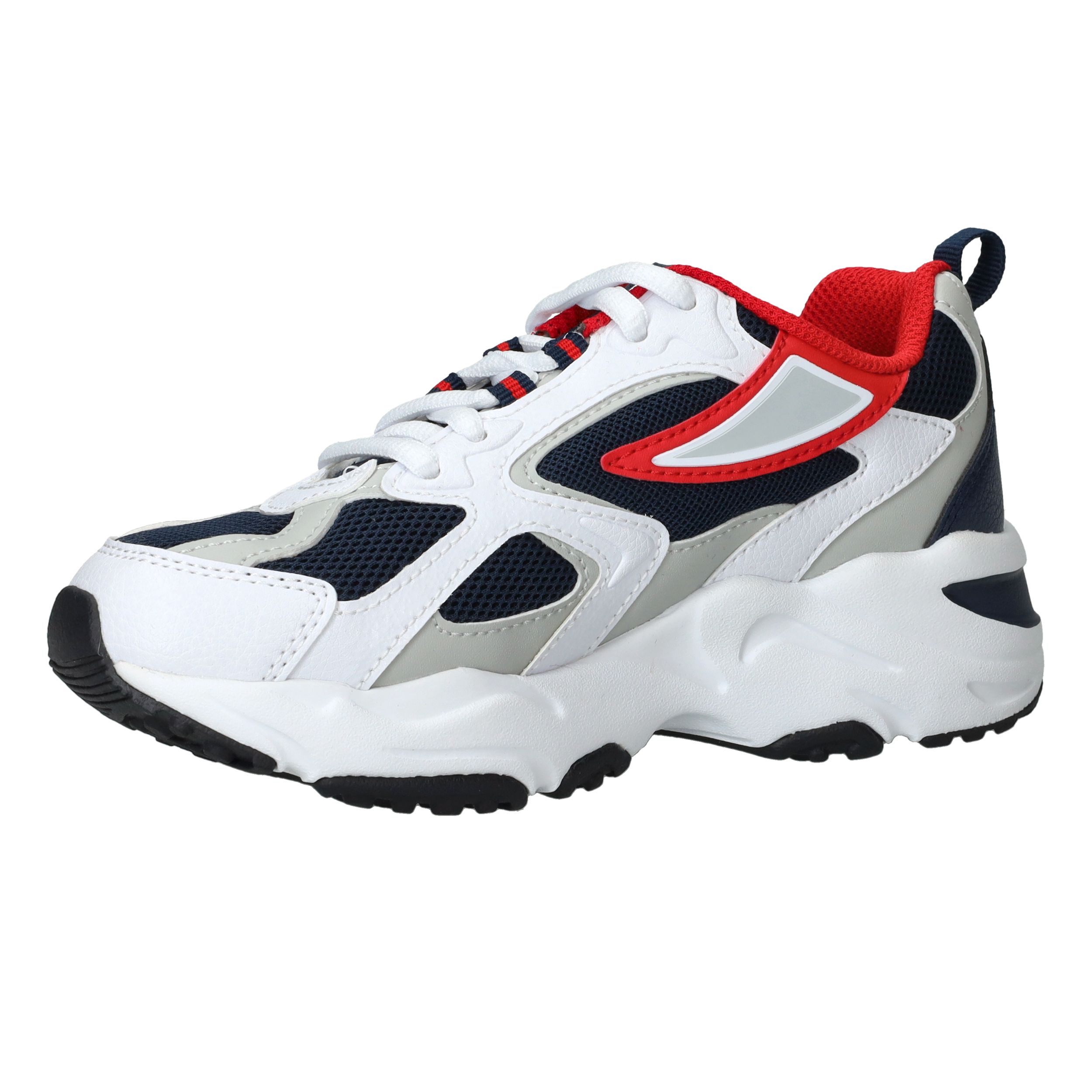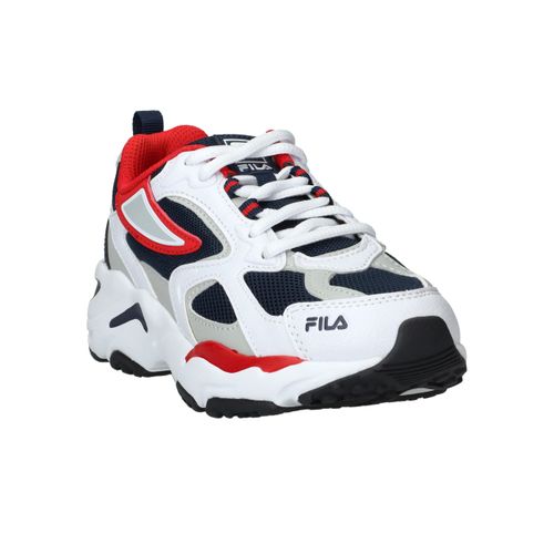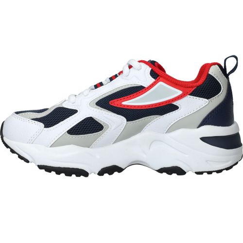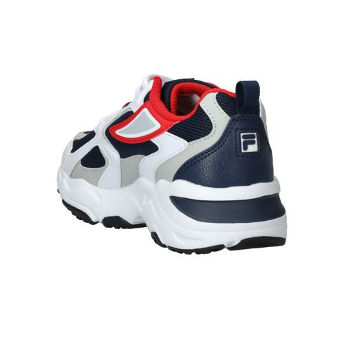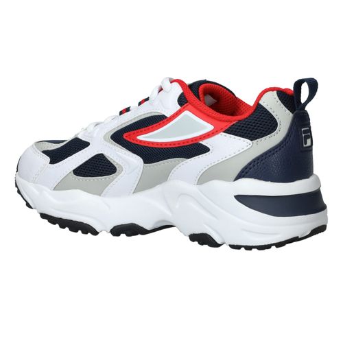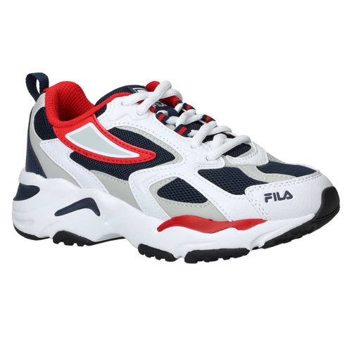 Sportieve Fila CR-CW02 Ray Tracer sneaker voor jongens. De sneaker heeft een kleurenpalet van wit, rood en donker blauw.