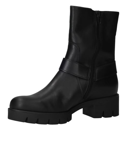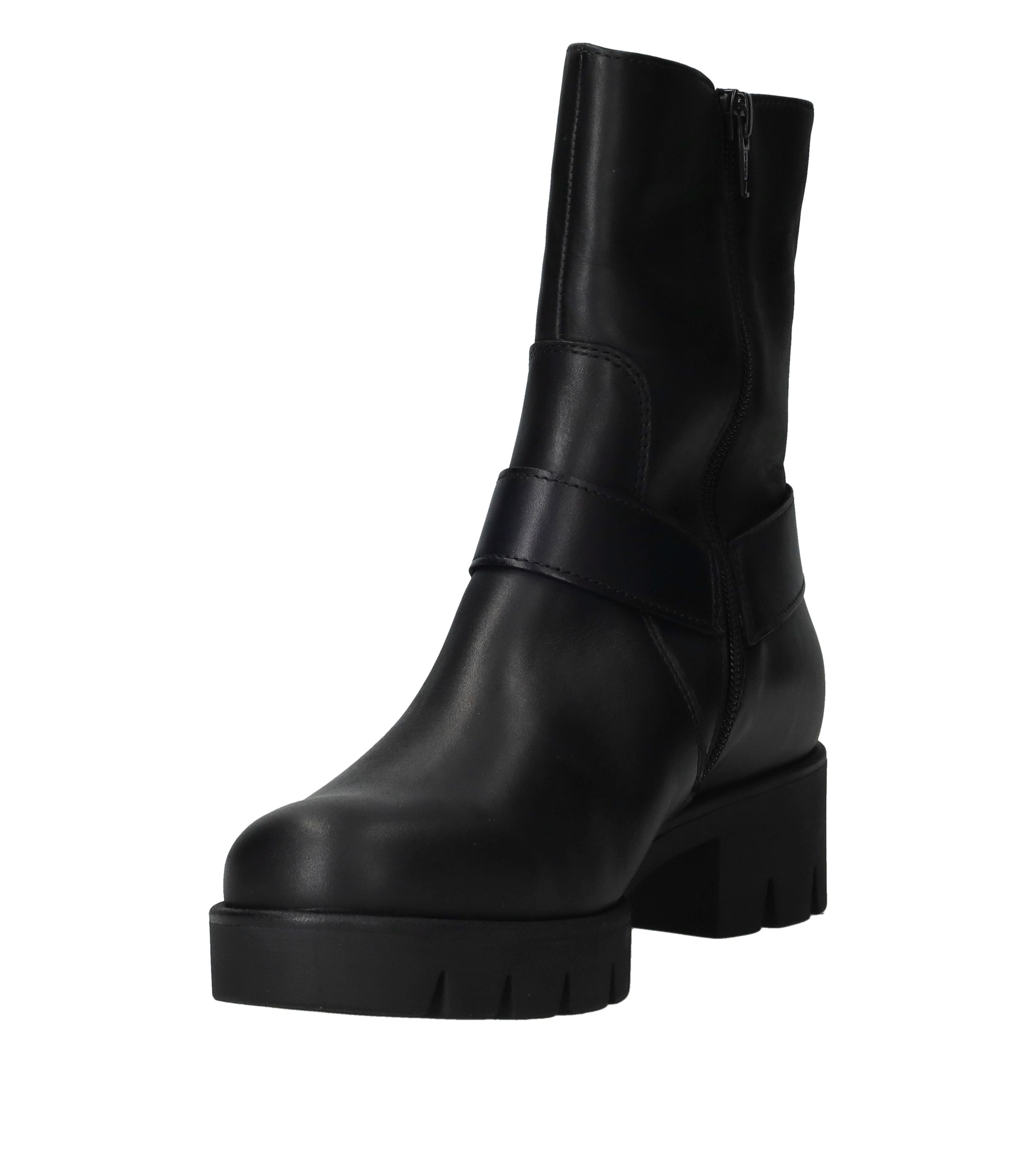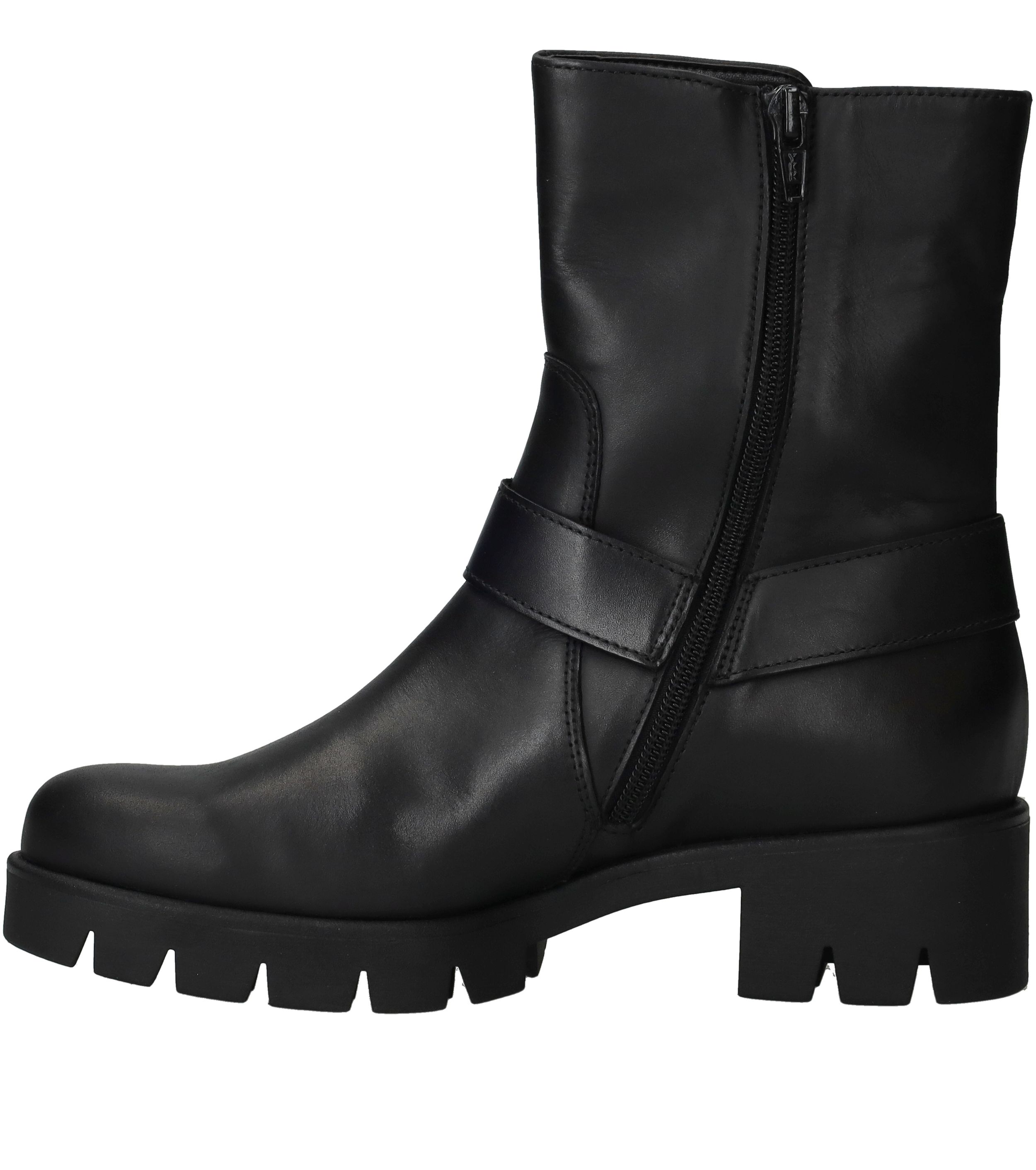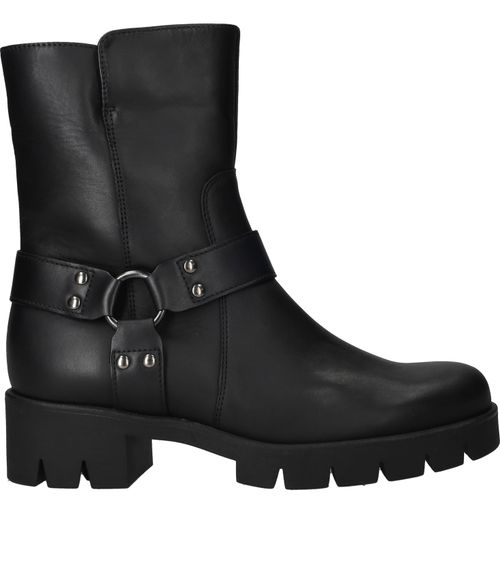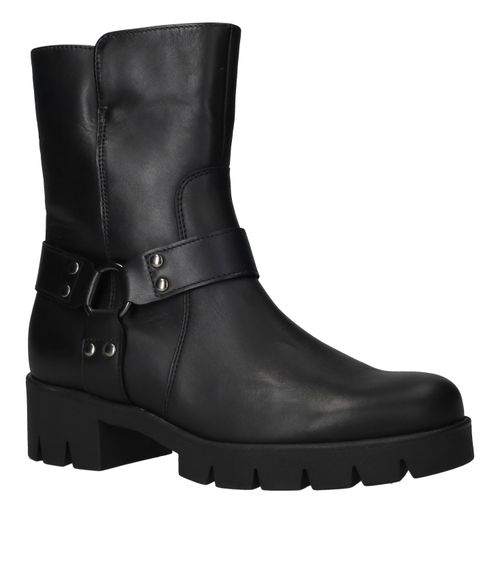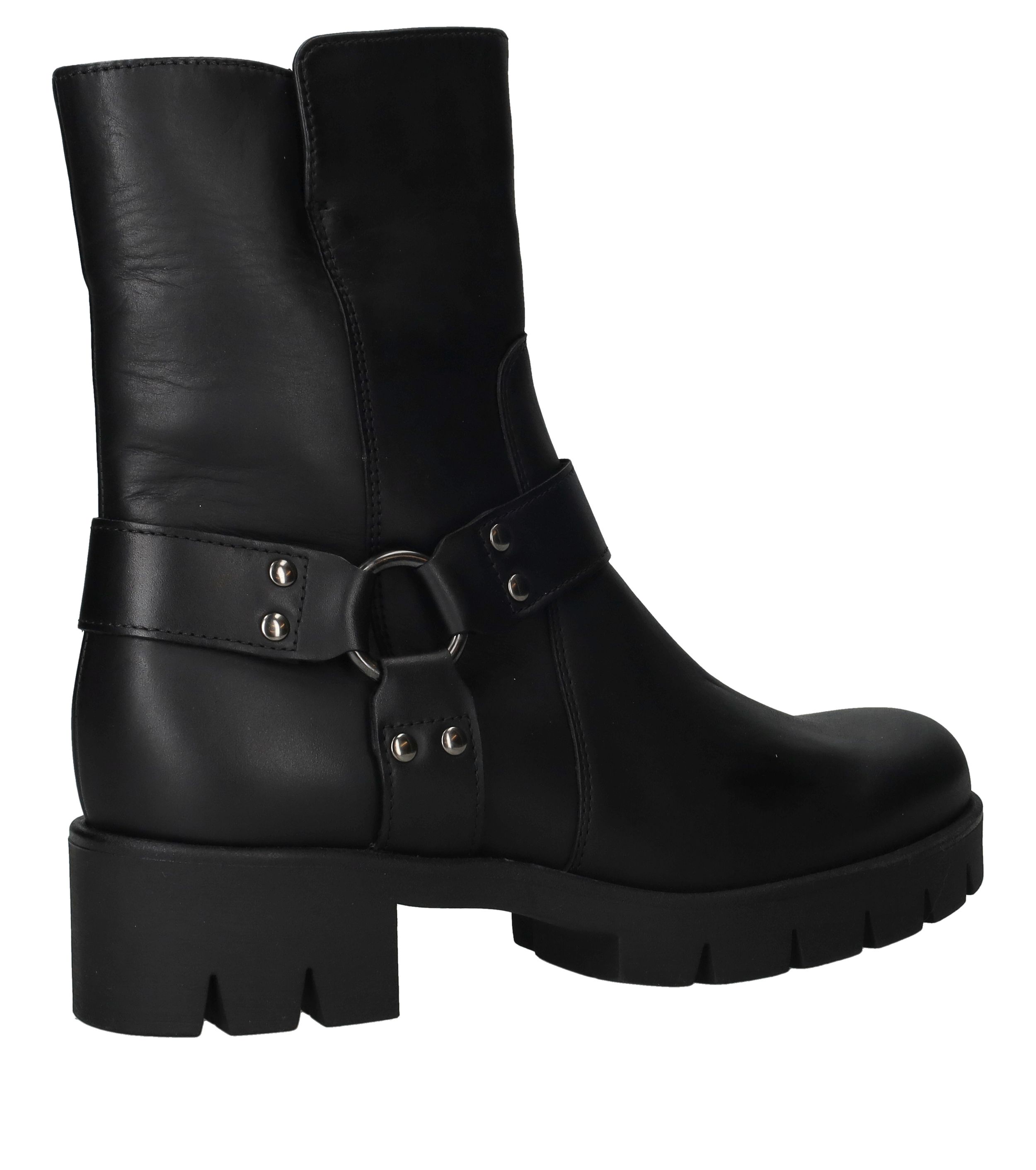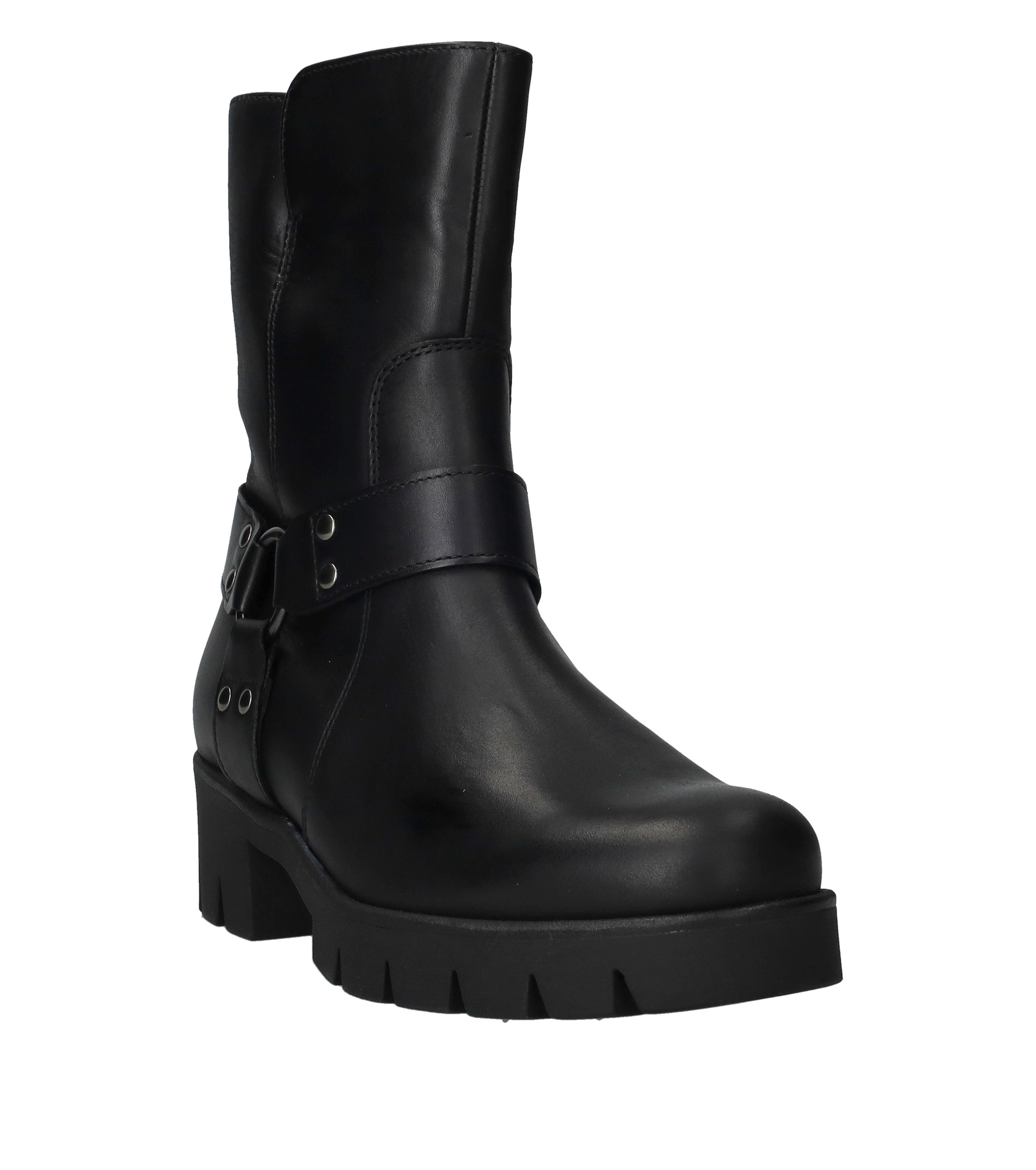 Superstoere zwarte leren bikerboot voor dames van het merk Gabor. De buckle bikerboot heeft zilveren metallic details aan de zijkant.