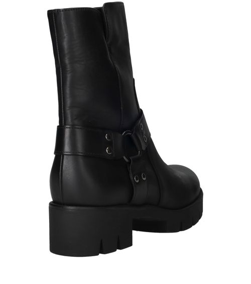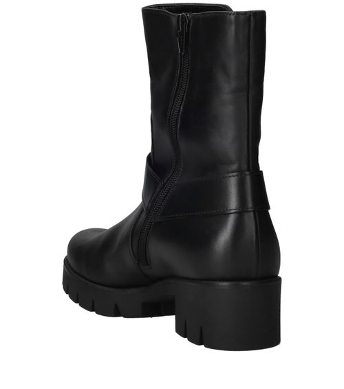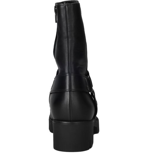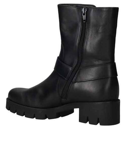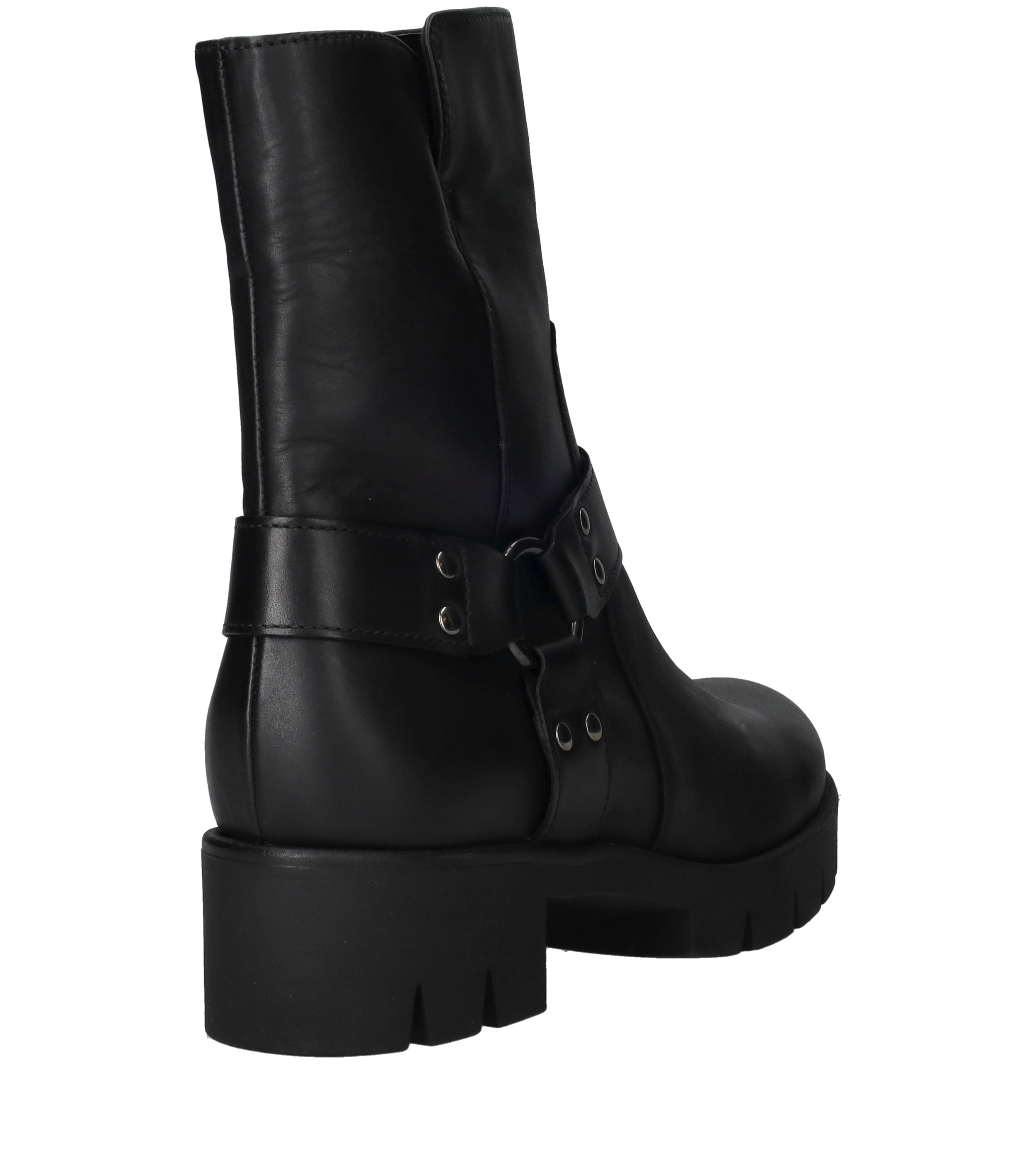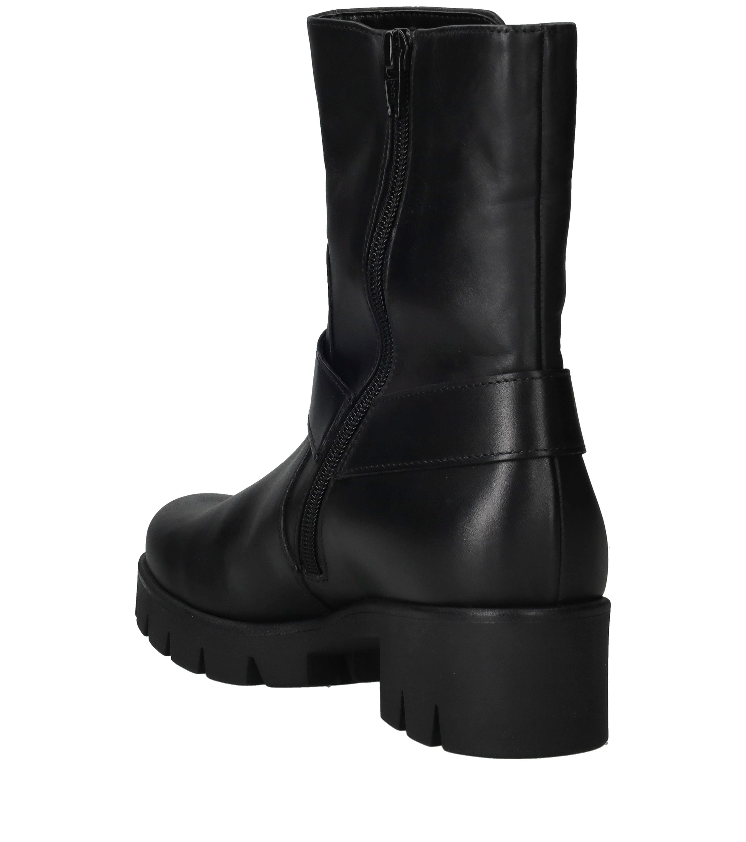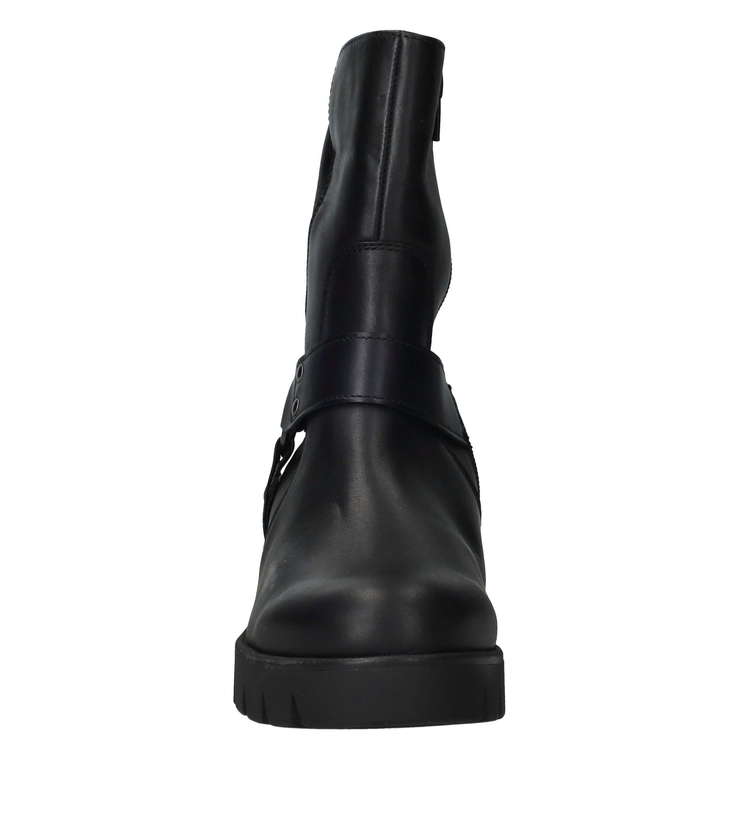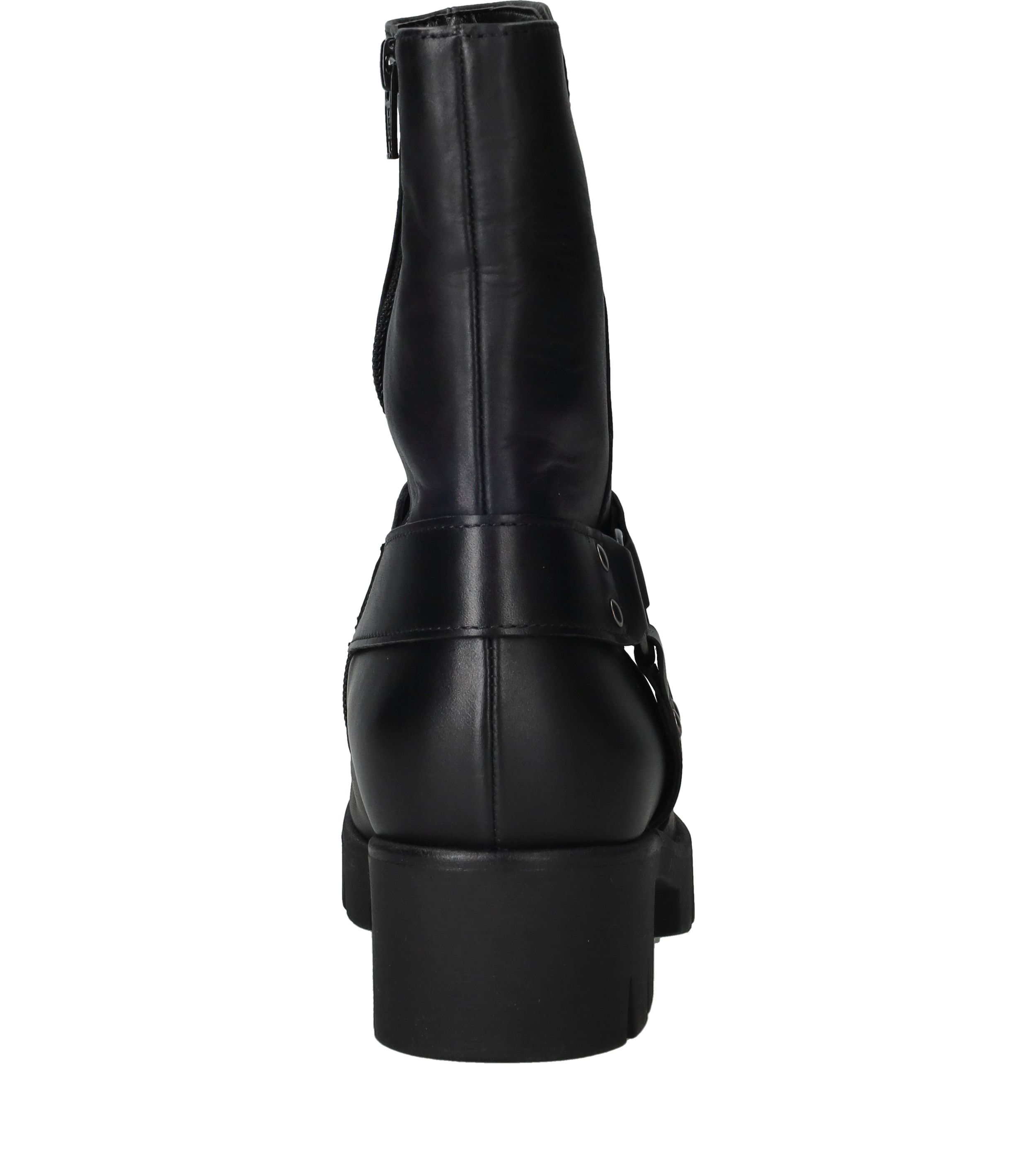 Superstoere zwarte leren bikerboot voor dames van het merk Gabor. De buckle bikerboot heeft zilveren metallic details aan de zijkant.