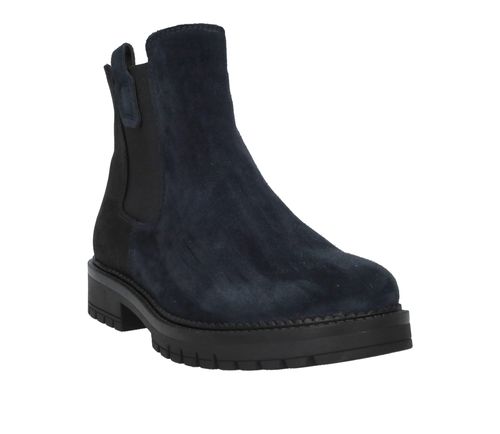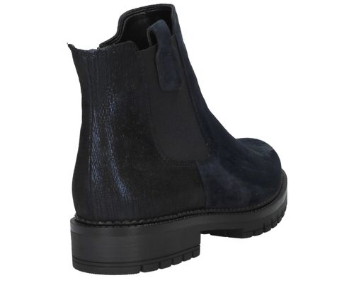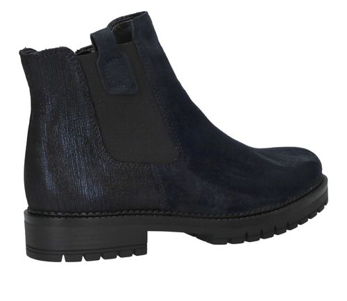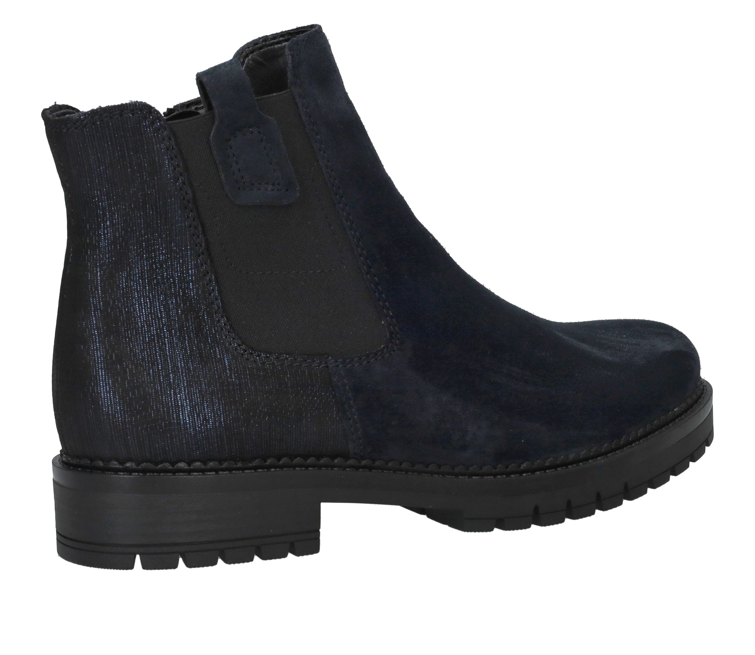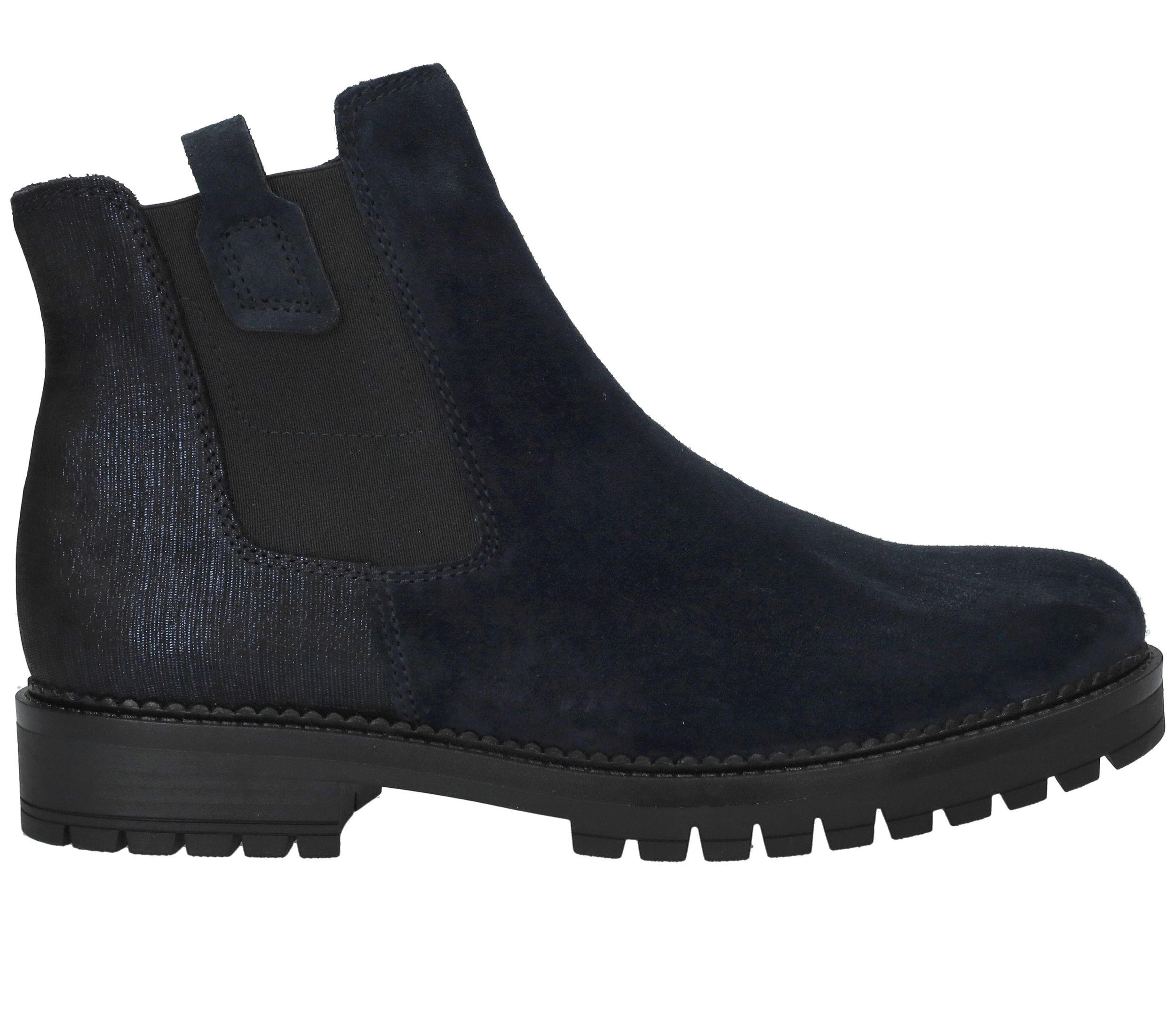 Deze Gabor chelseaboot is zowel stijlvol als stoer. De donkerblauwe damesschoen is helemaal gemaakt van suède en de achterkant heeft een subtiele metallic glans.