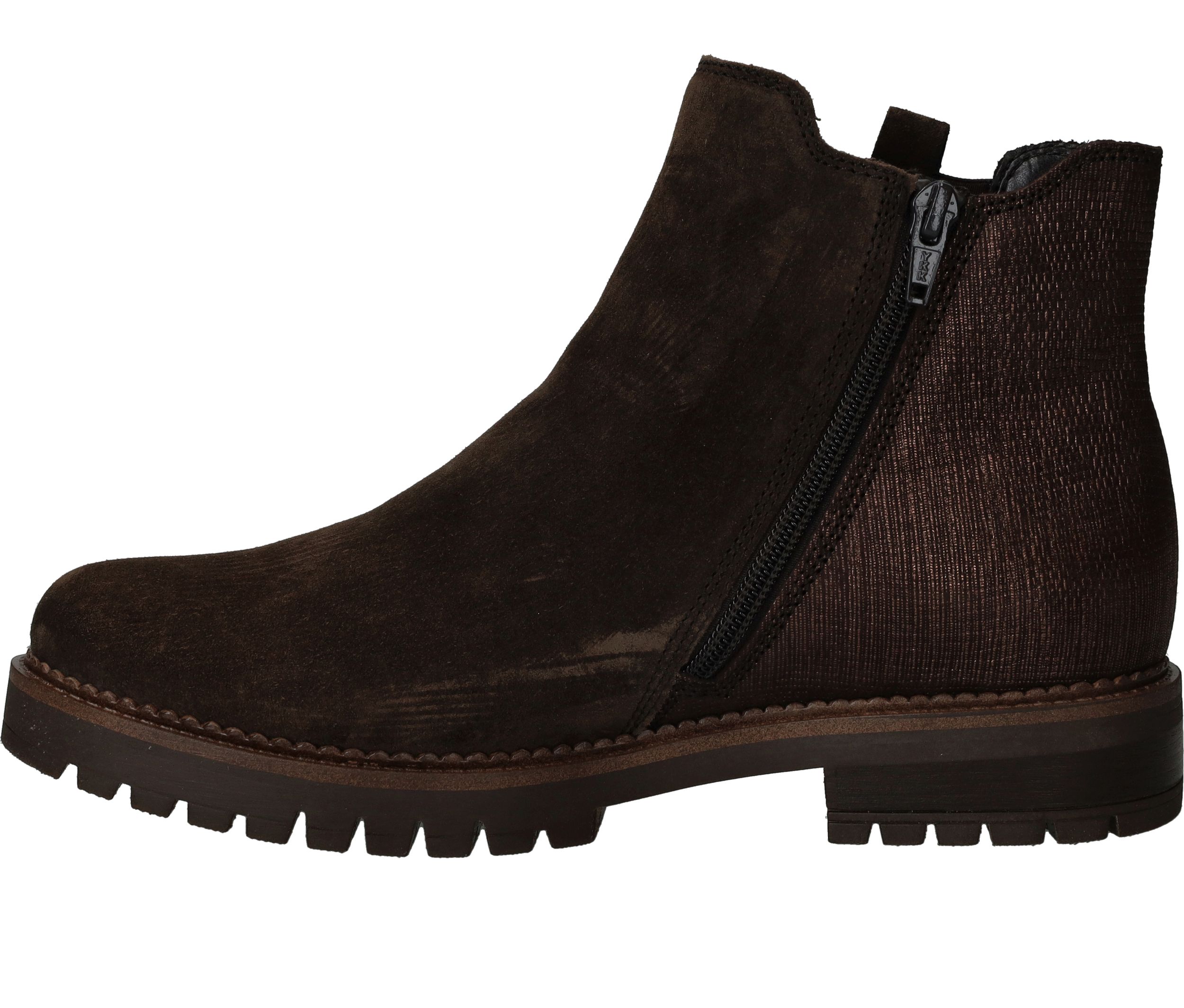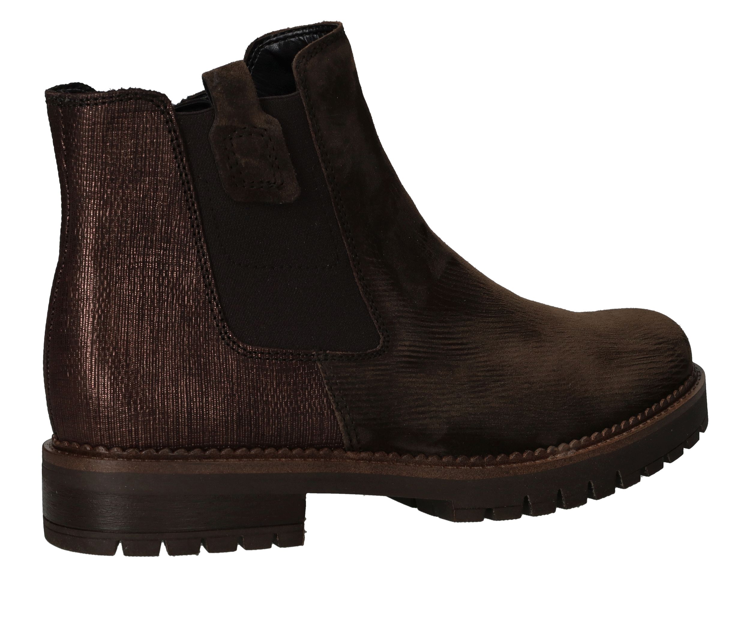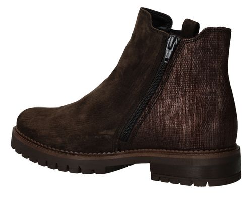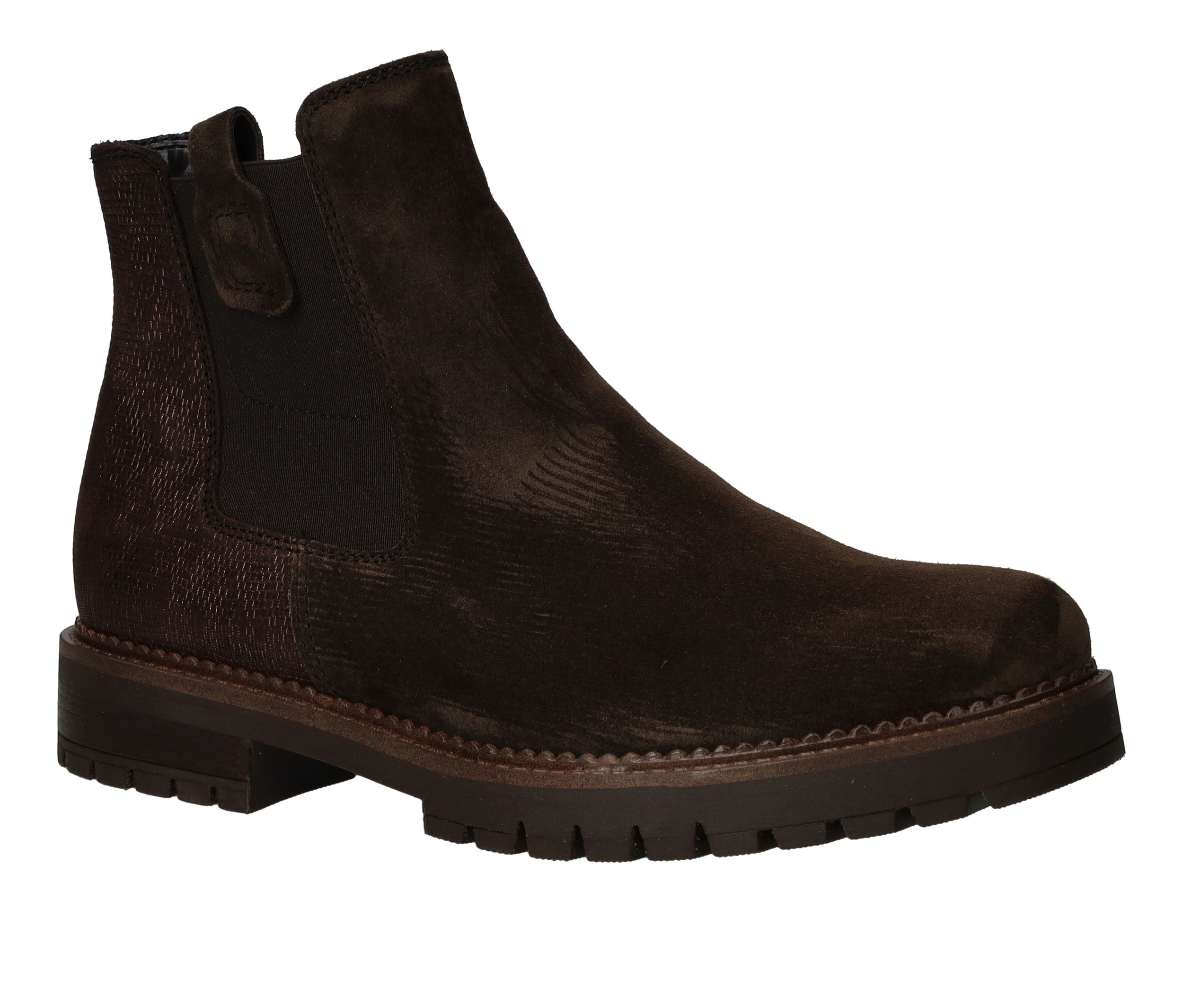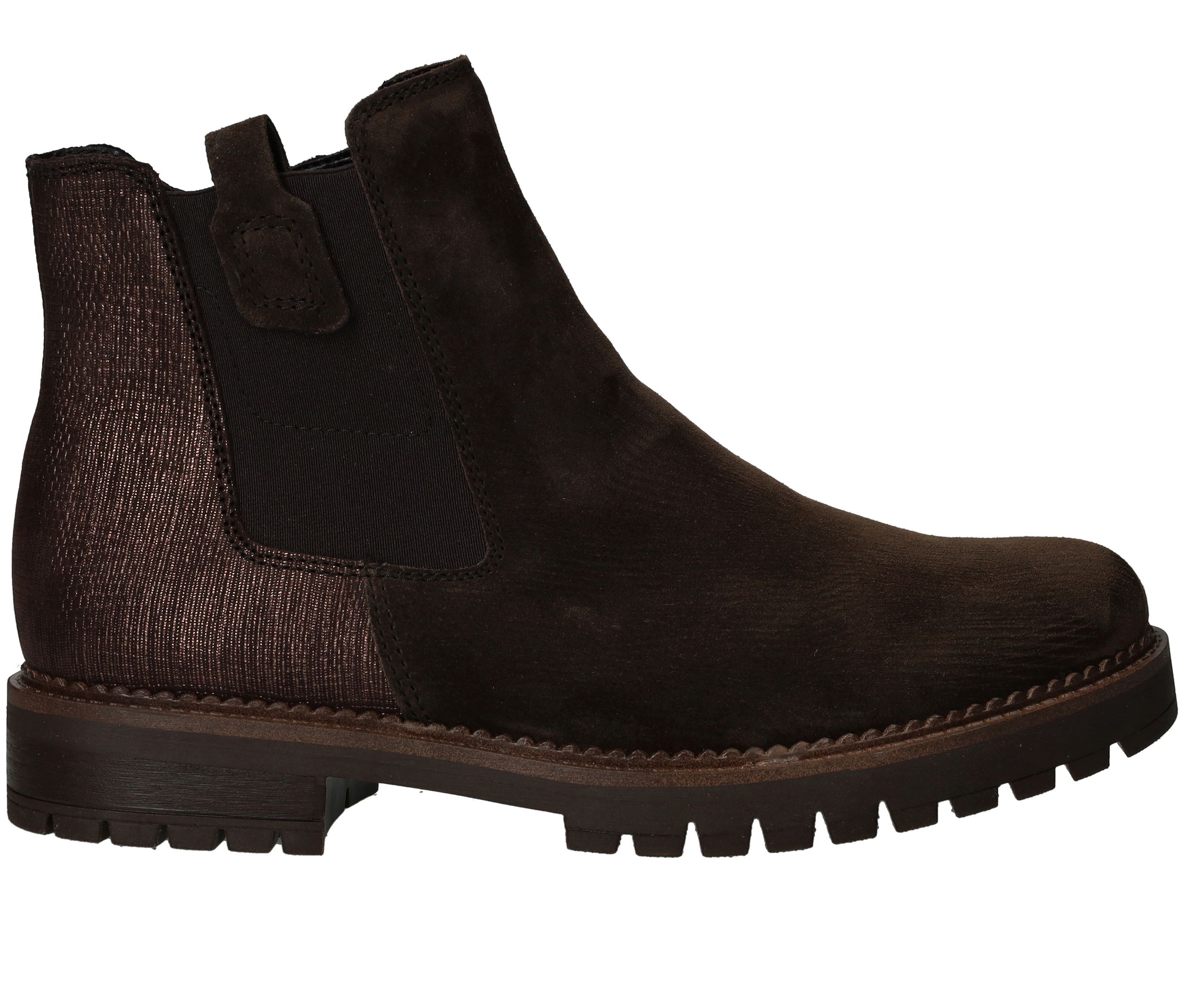 Deze Gabor chelseaboot is zowel stijlvol als stoer. De bruine damesschoen is helemaal gemaakt van suède en de achterkant heeft een subtiele metallic glans.