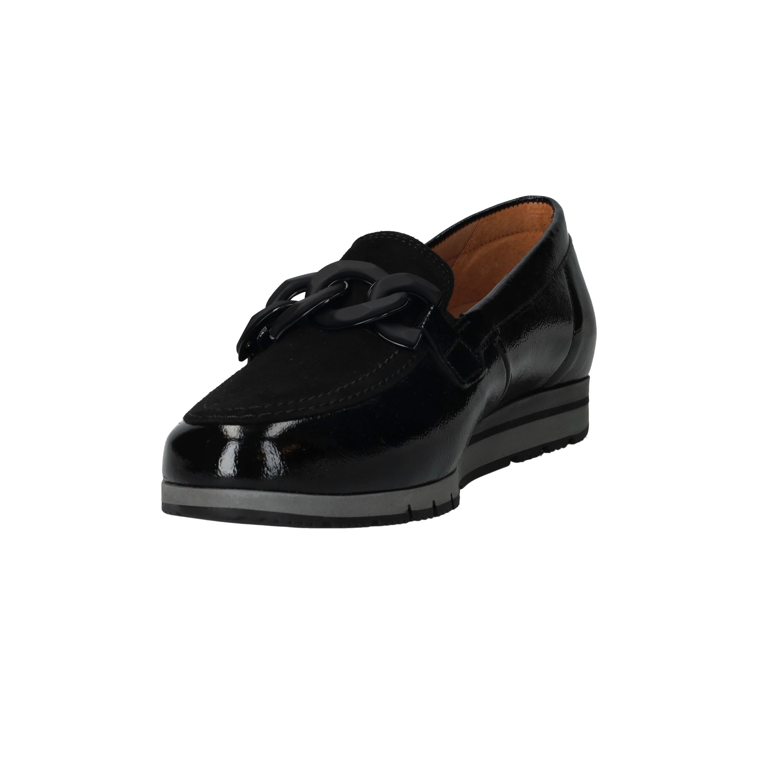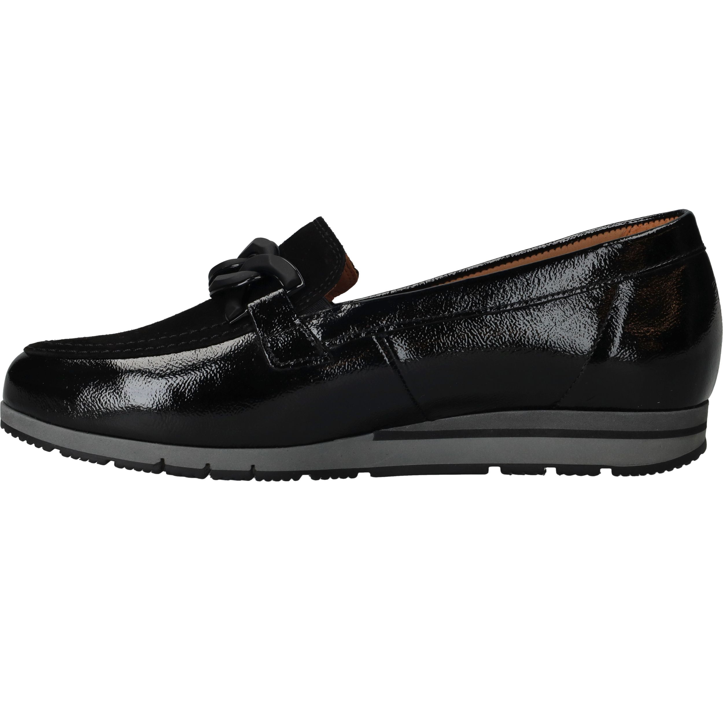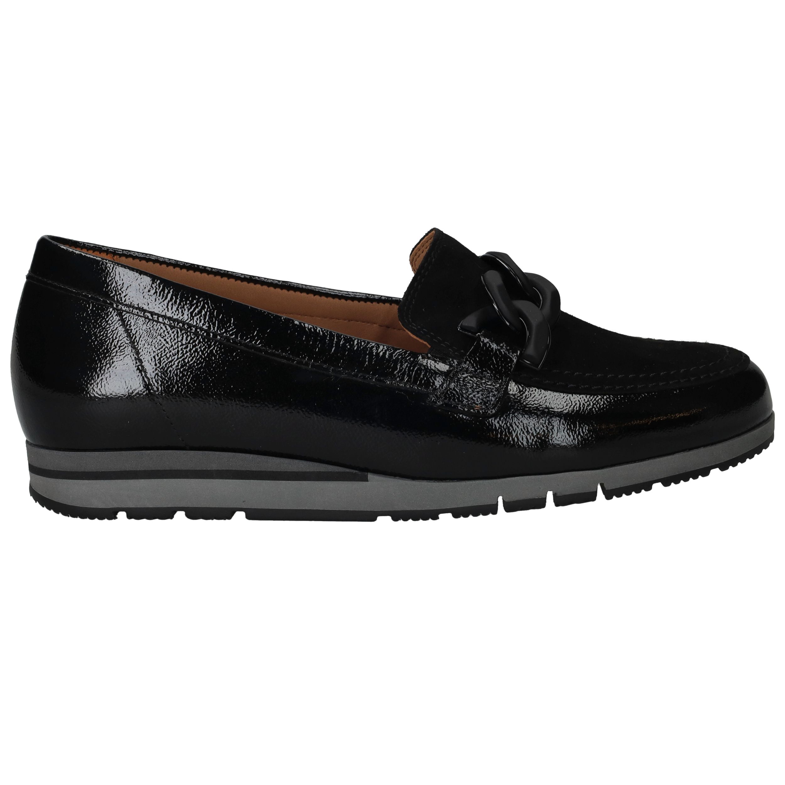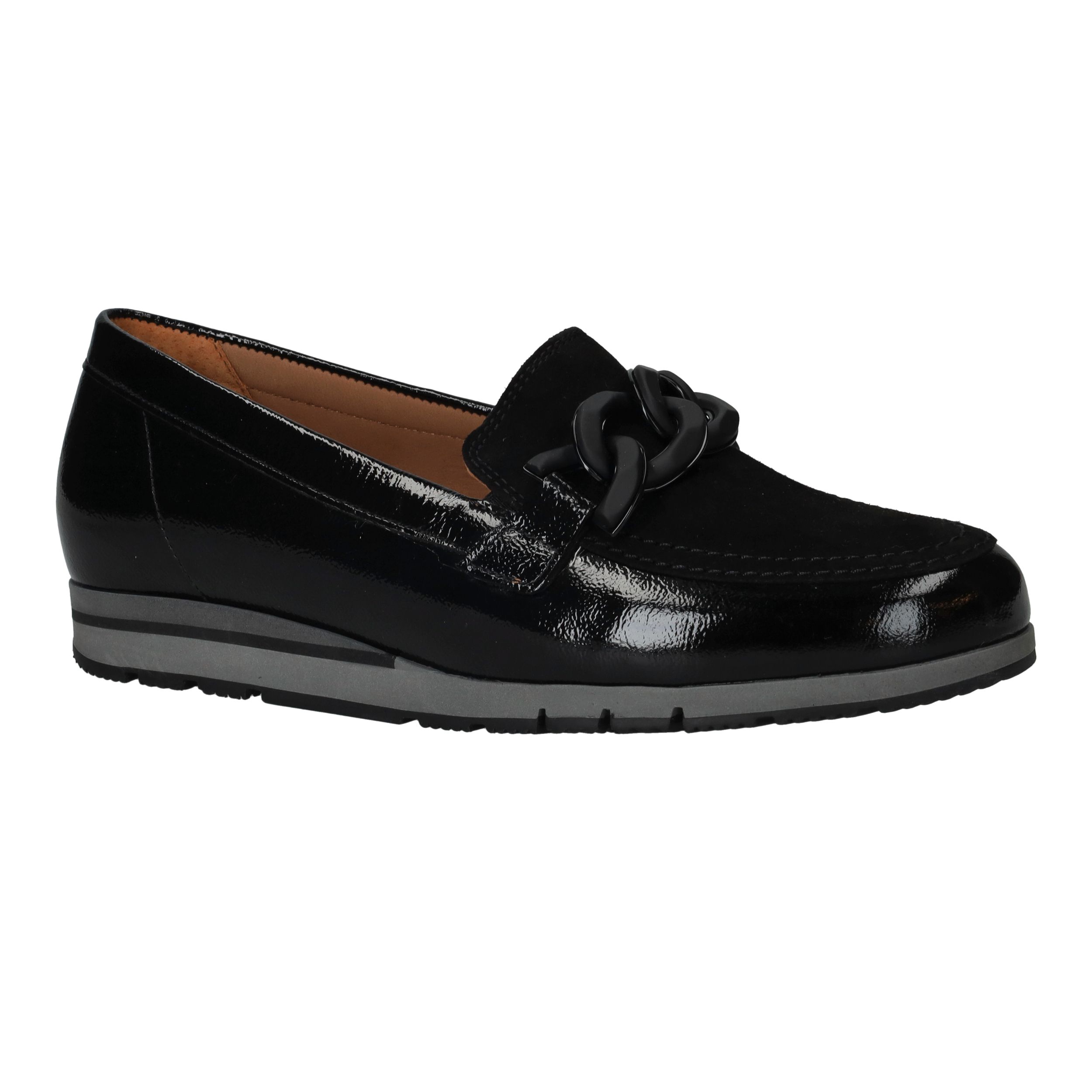 Deze chique dames instappers van Gabor zijn een perfecte mix van elegantie en comfort. Het zwarte lakleer in combinatie met suède details zorgt voor een rijke, verfijnde uitstraling. De sportieve zool en normale voetbreedte G maken dit model geschikt voor dagelijks gebruik met een stijlvolle twist.