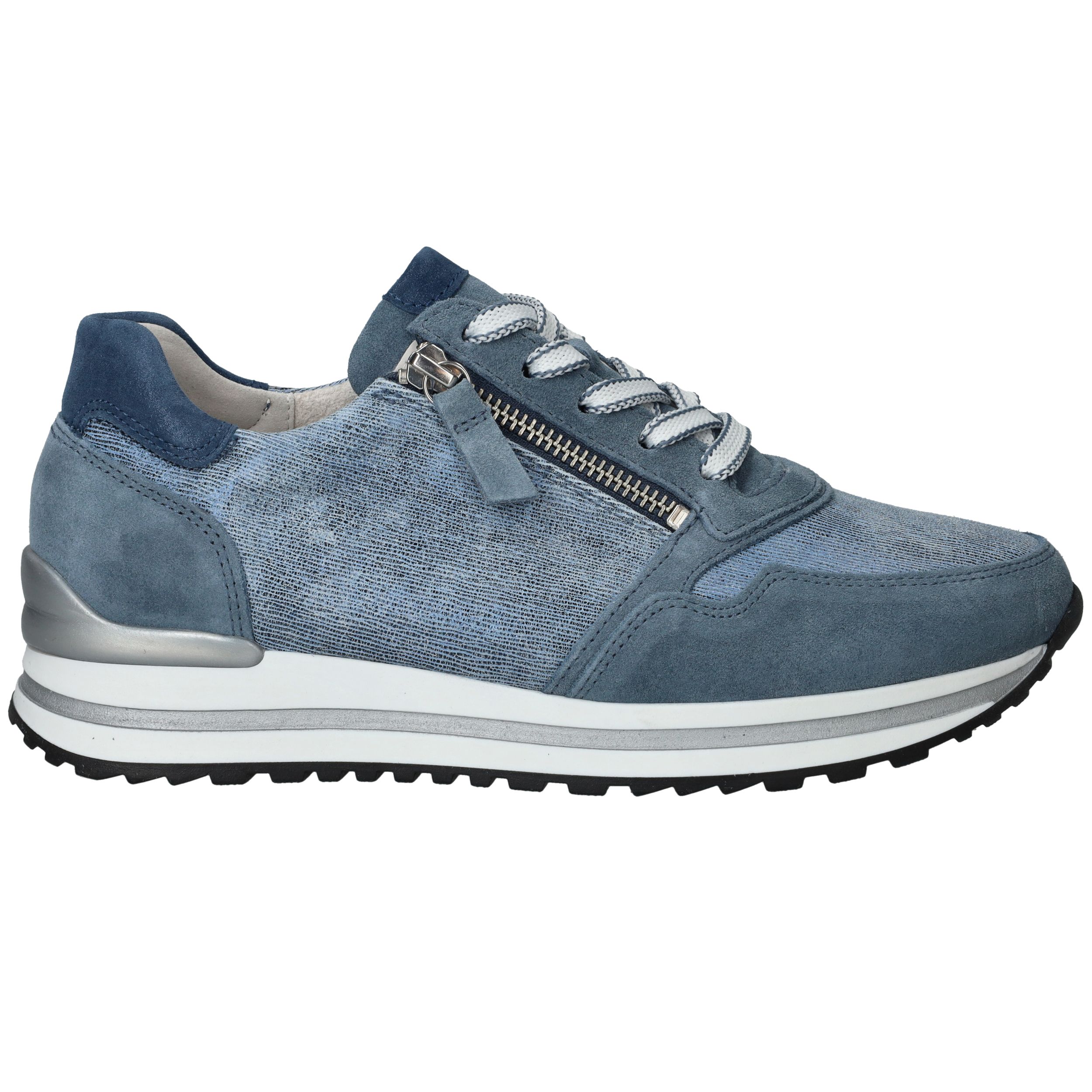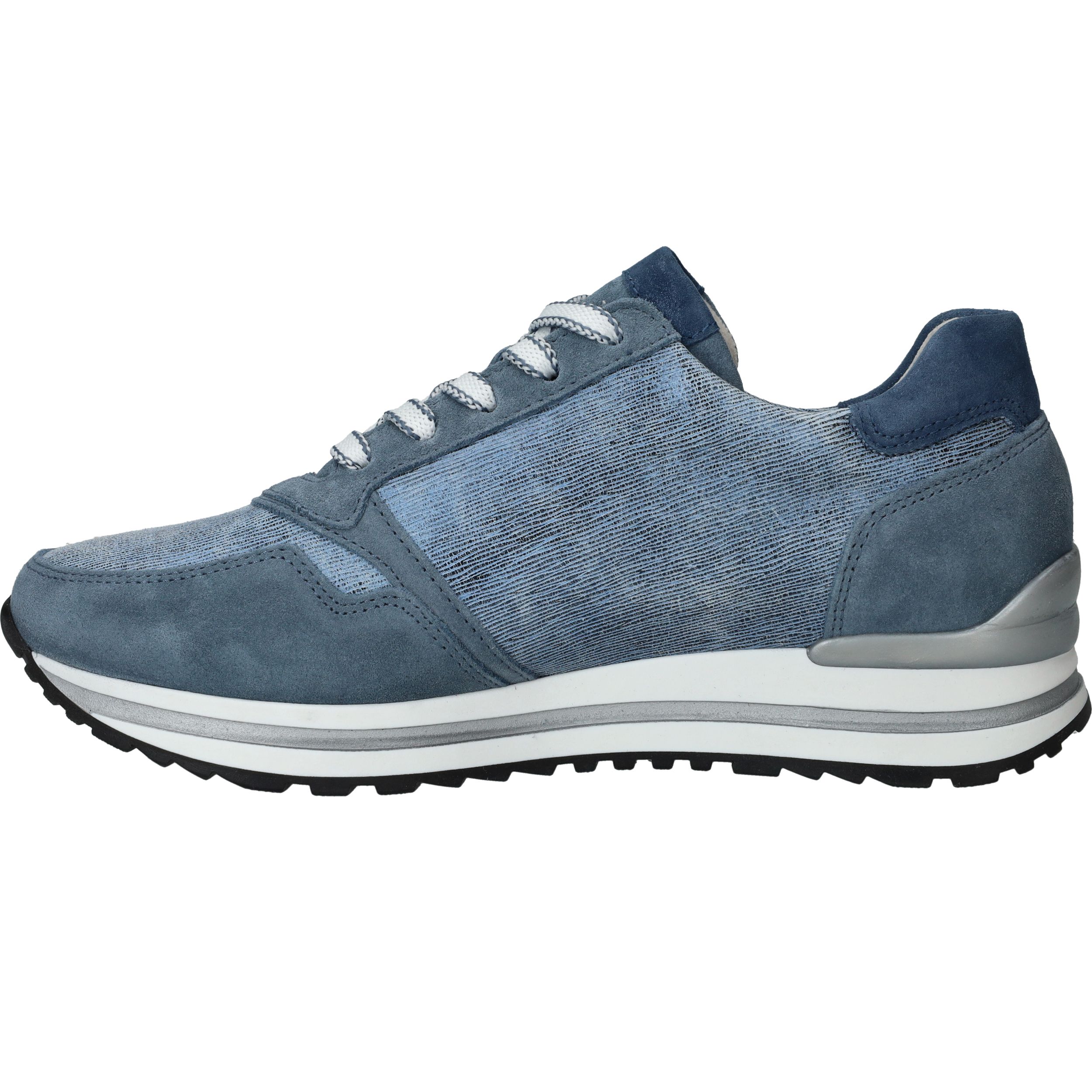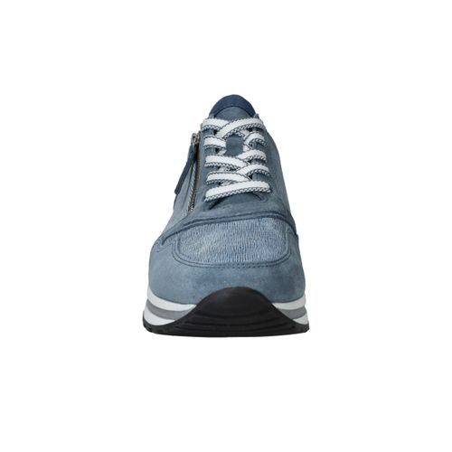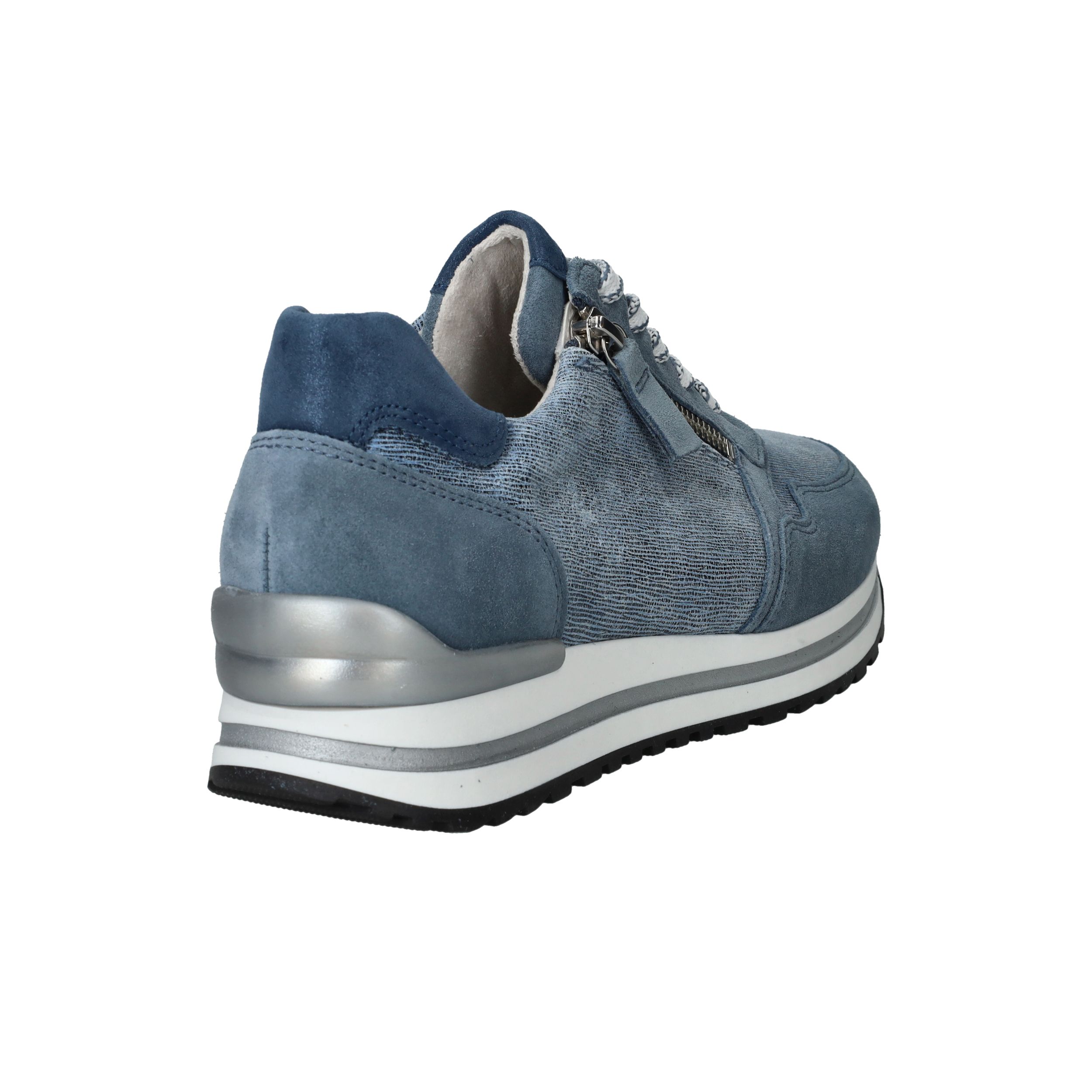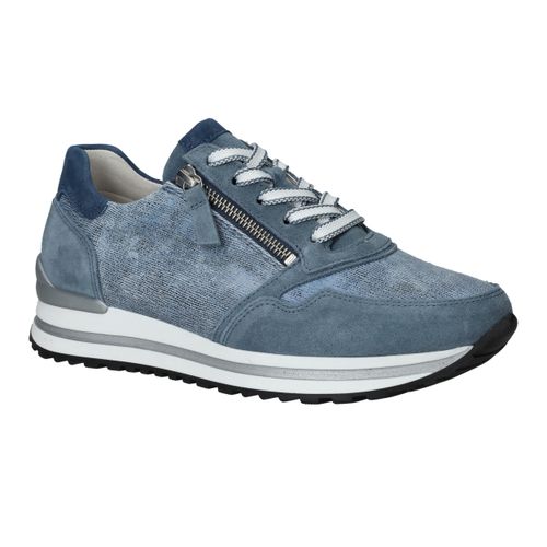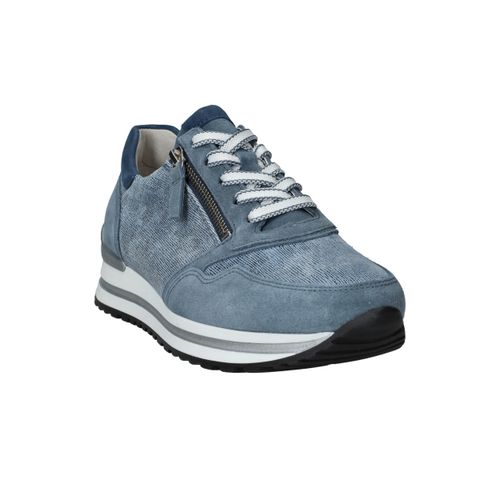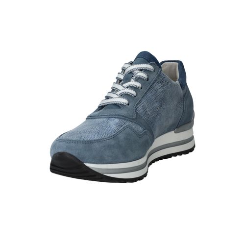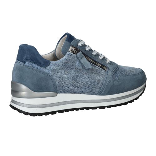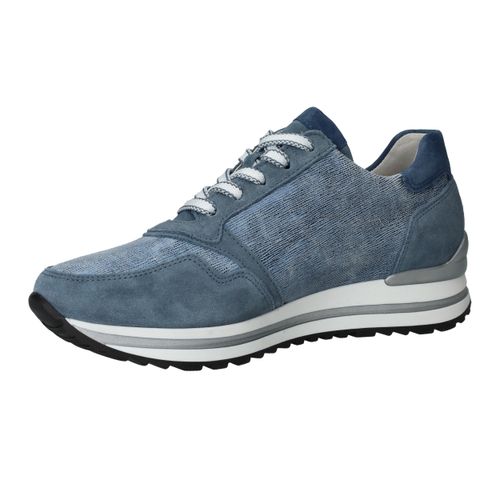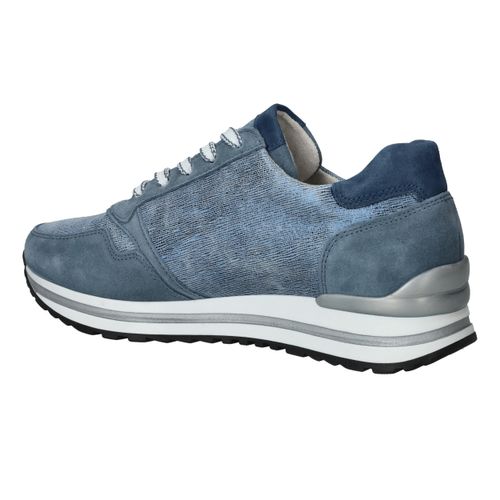 Mooie jeansblauwe Gabor sneaker voor dames. De sneaker heeft een speels blauw patroon en de zool is afgewerkt met zilveren details.