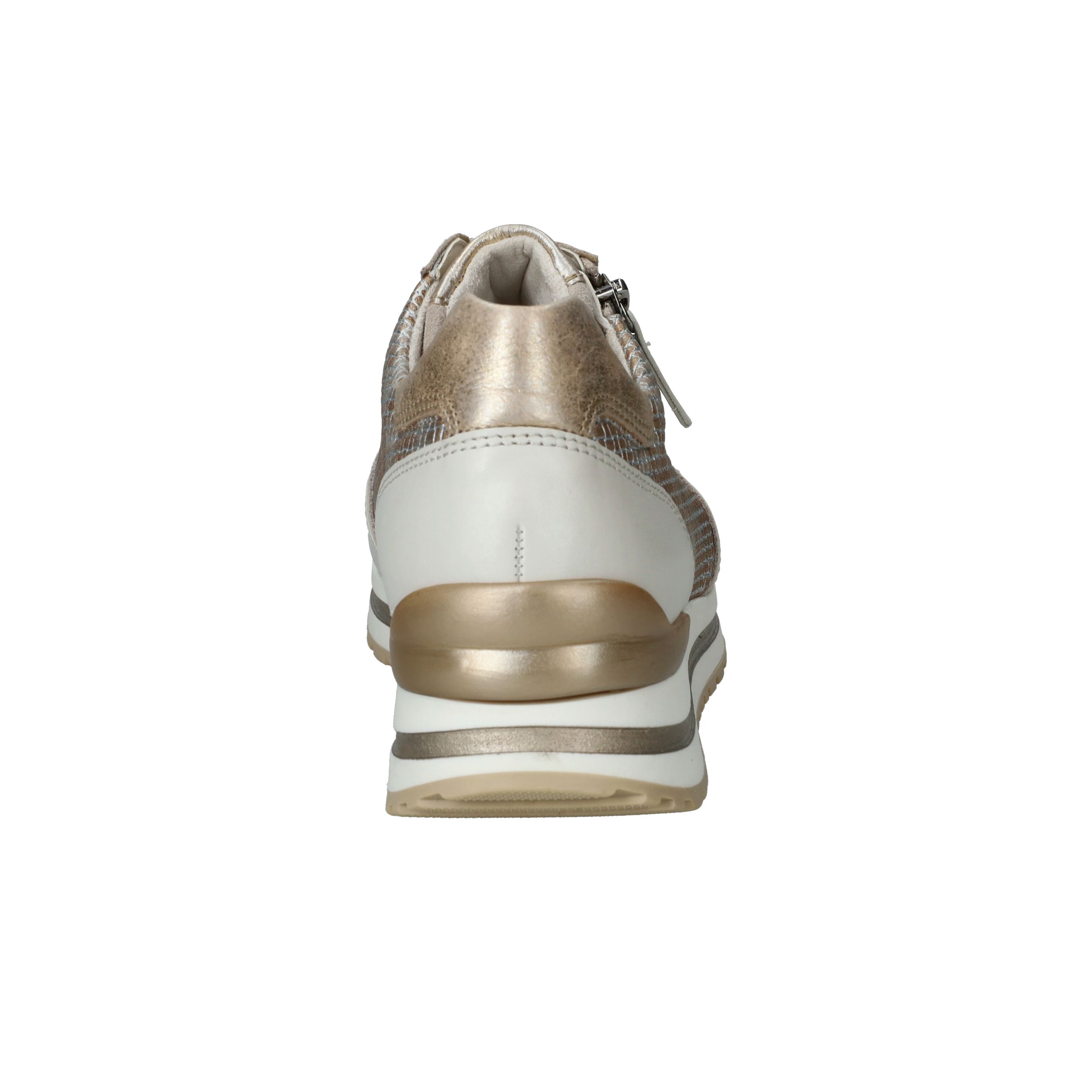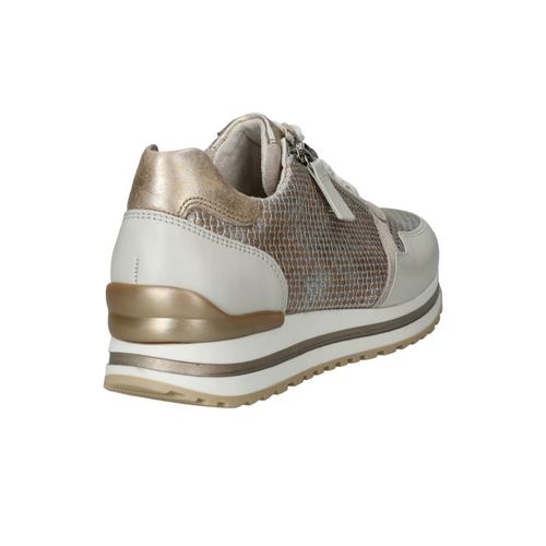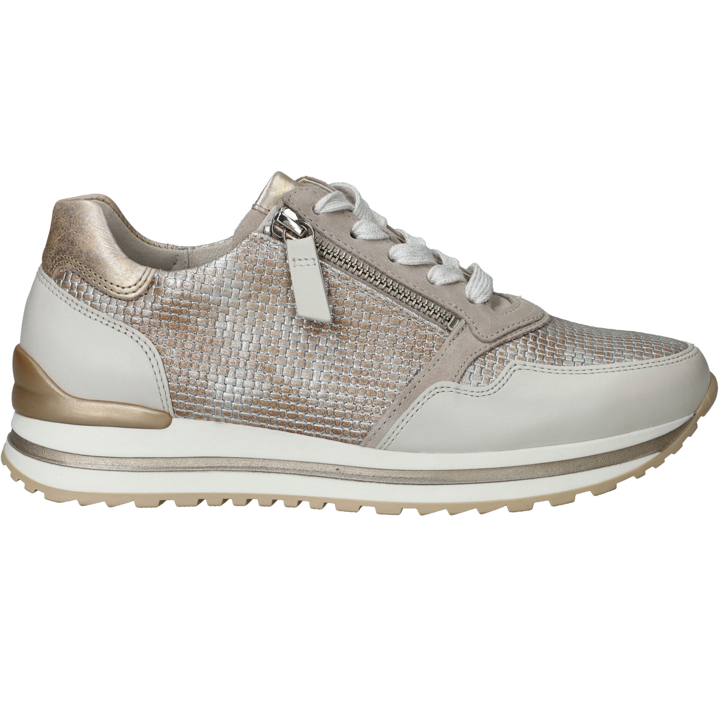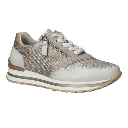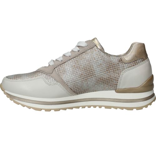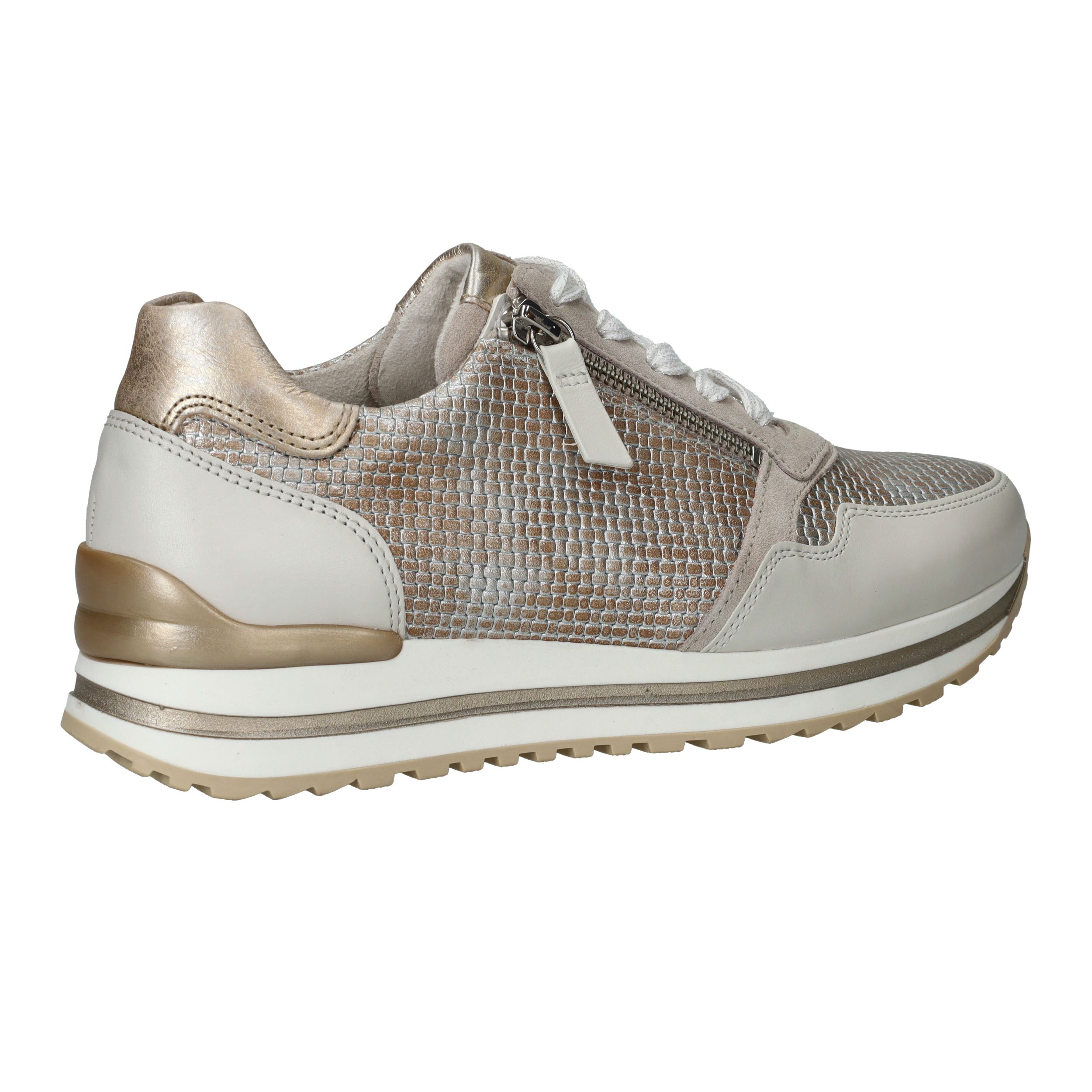 Stijlvolle en comfortabele Gabor sneaker voor dames. De sneaker heeft een metallic gouden patroon en ook de zool is afgewerkt met gouden details.