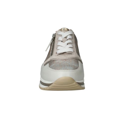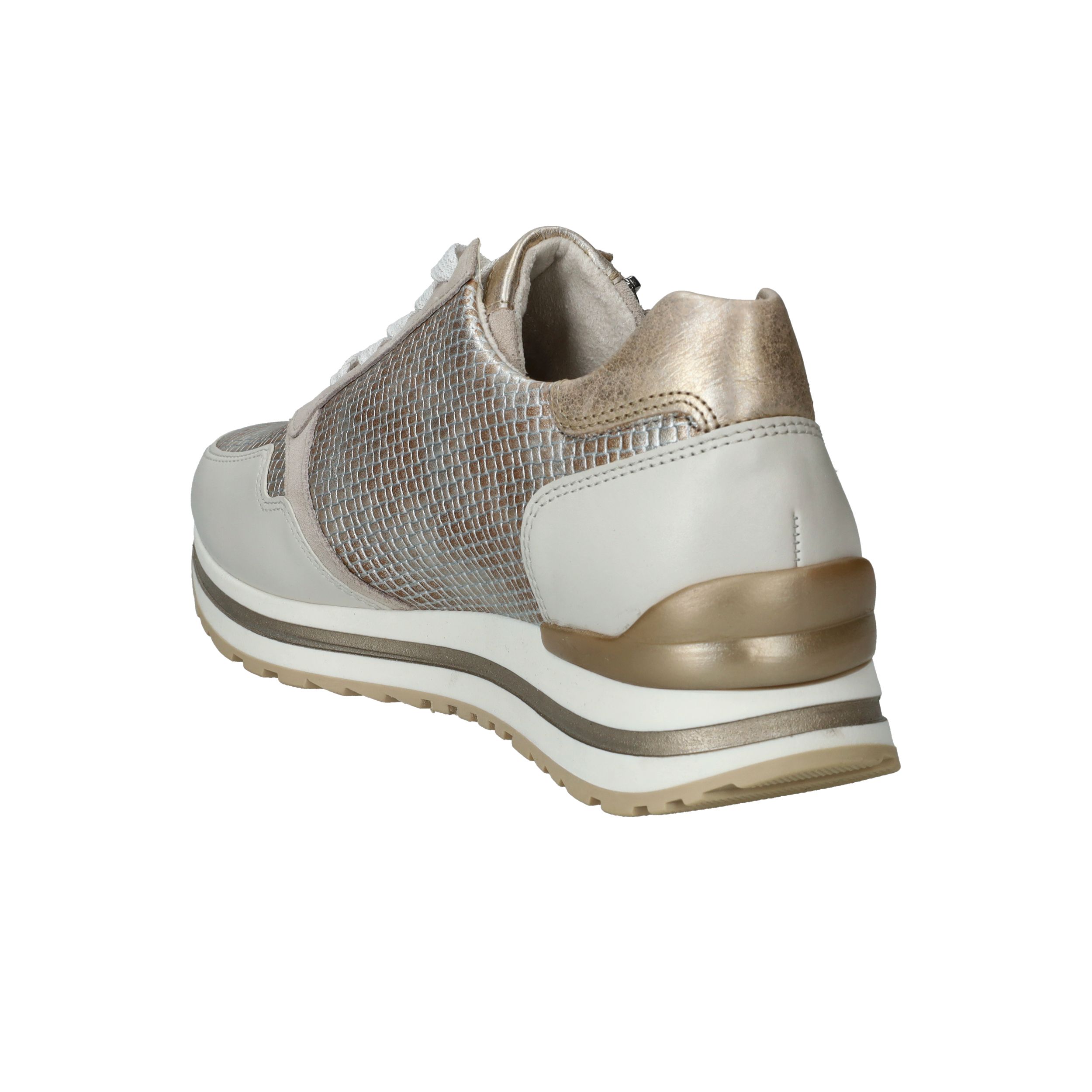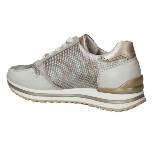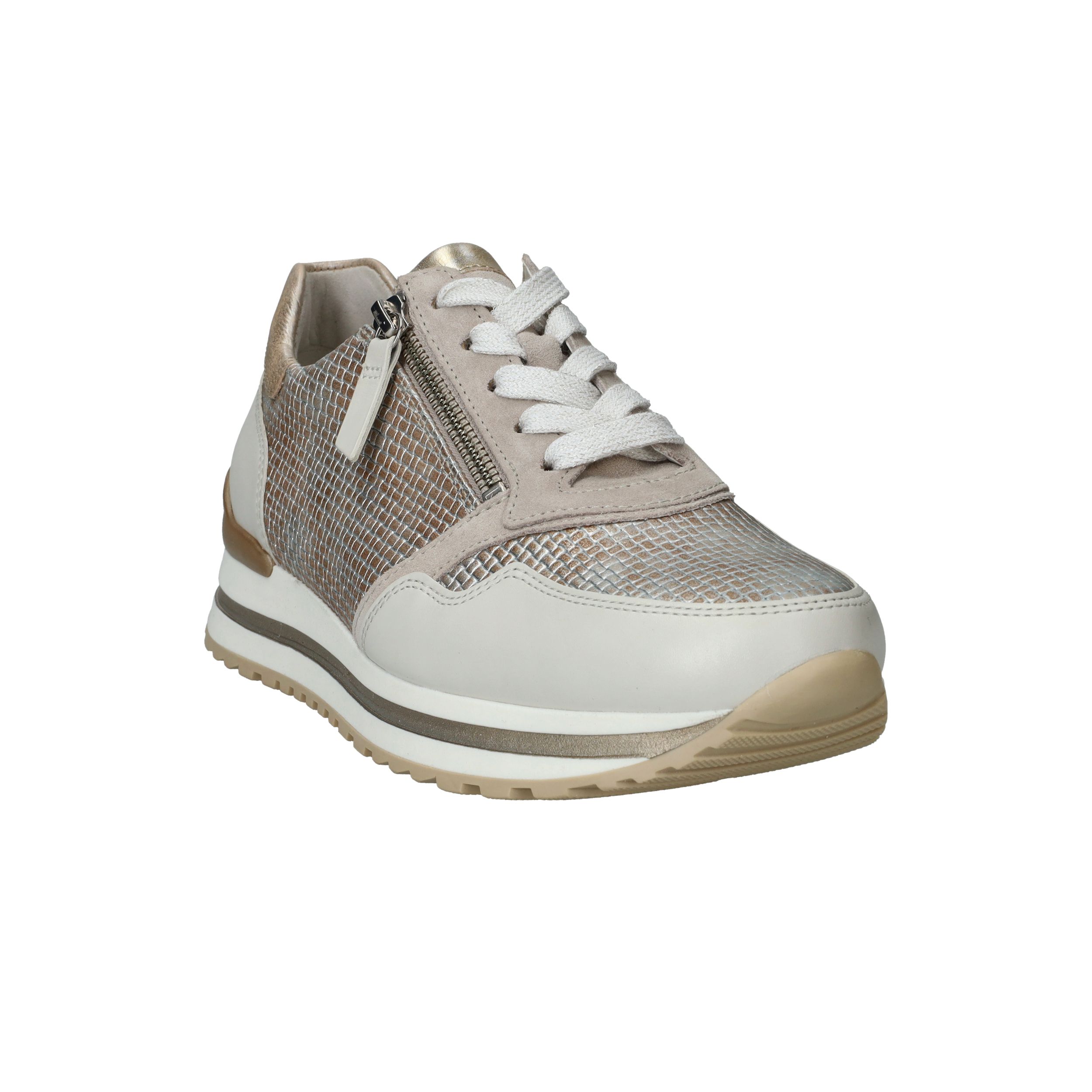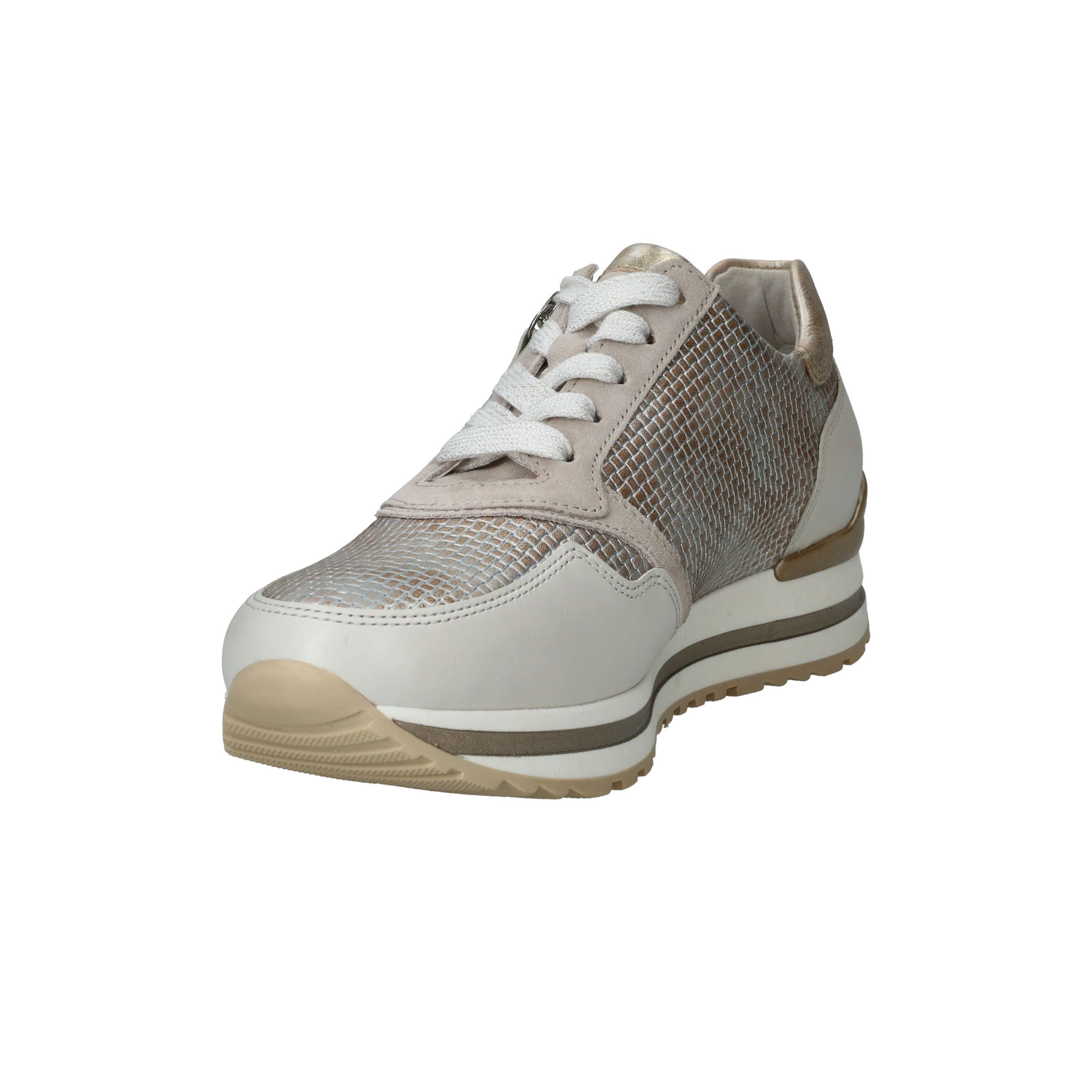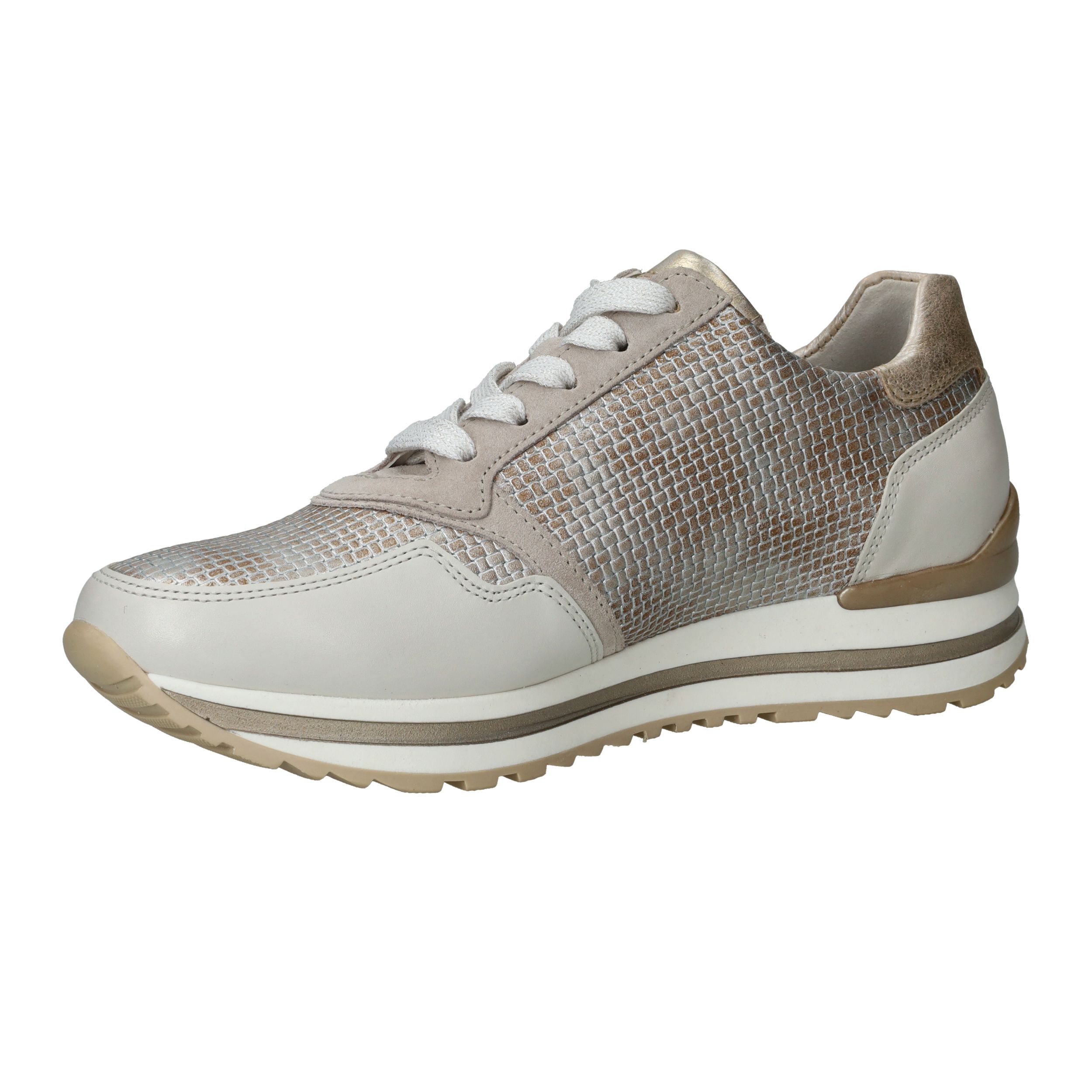 Stijlvolle en comfortabele Gabor sneaker voor dames. De sneaker heeft een metallic gouden patroon en ook de zool is afgewerkt met gouden details.