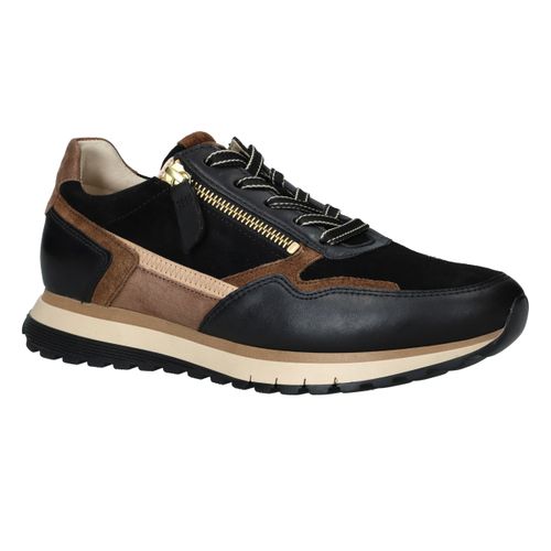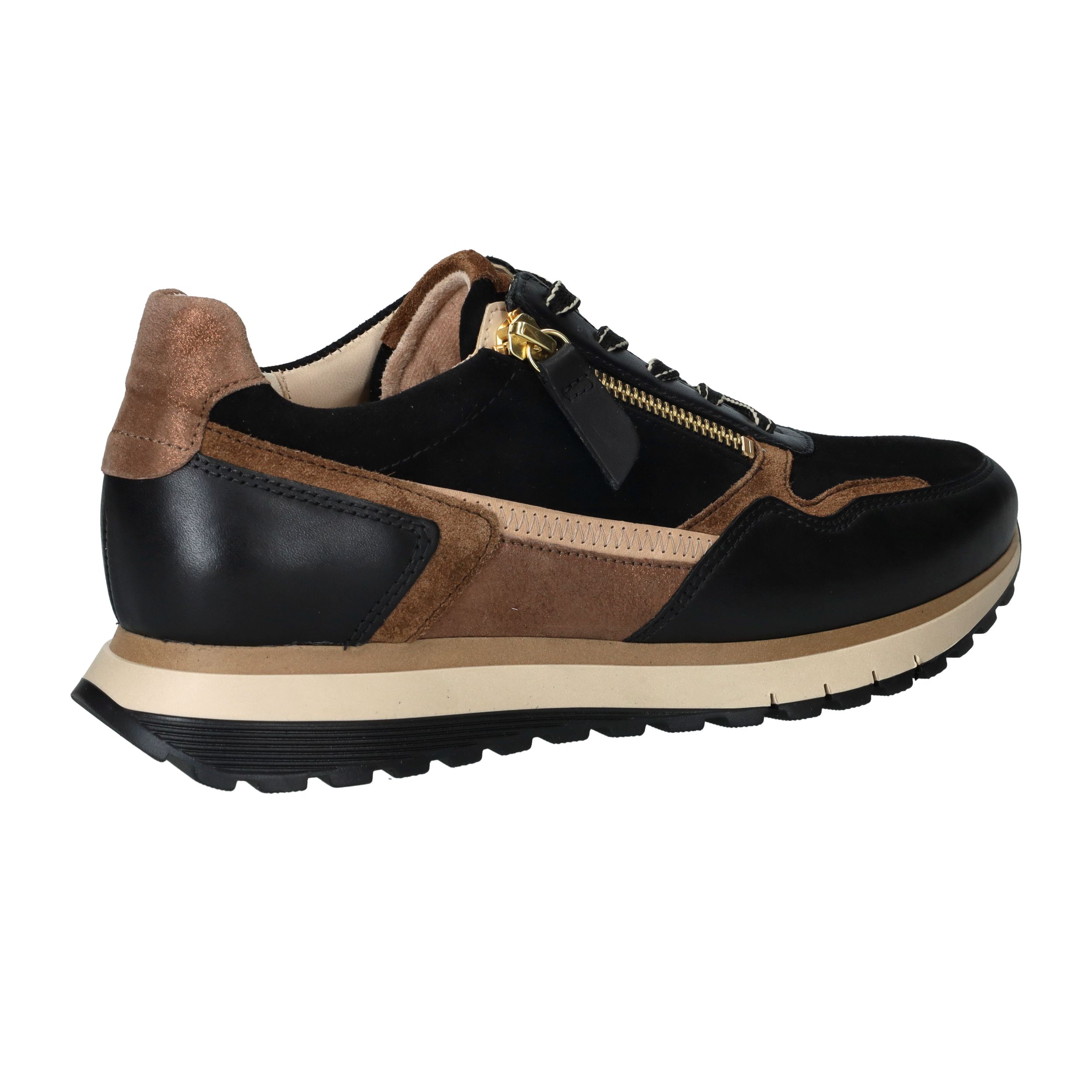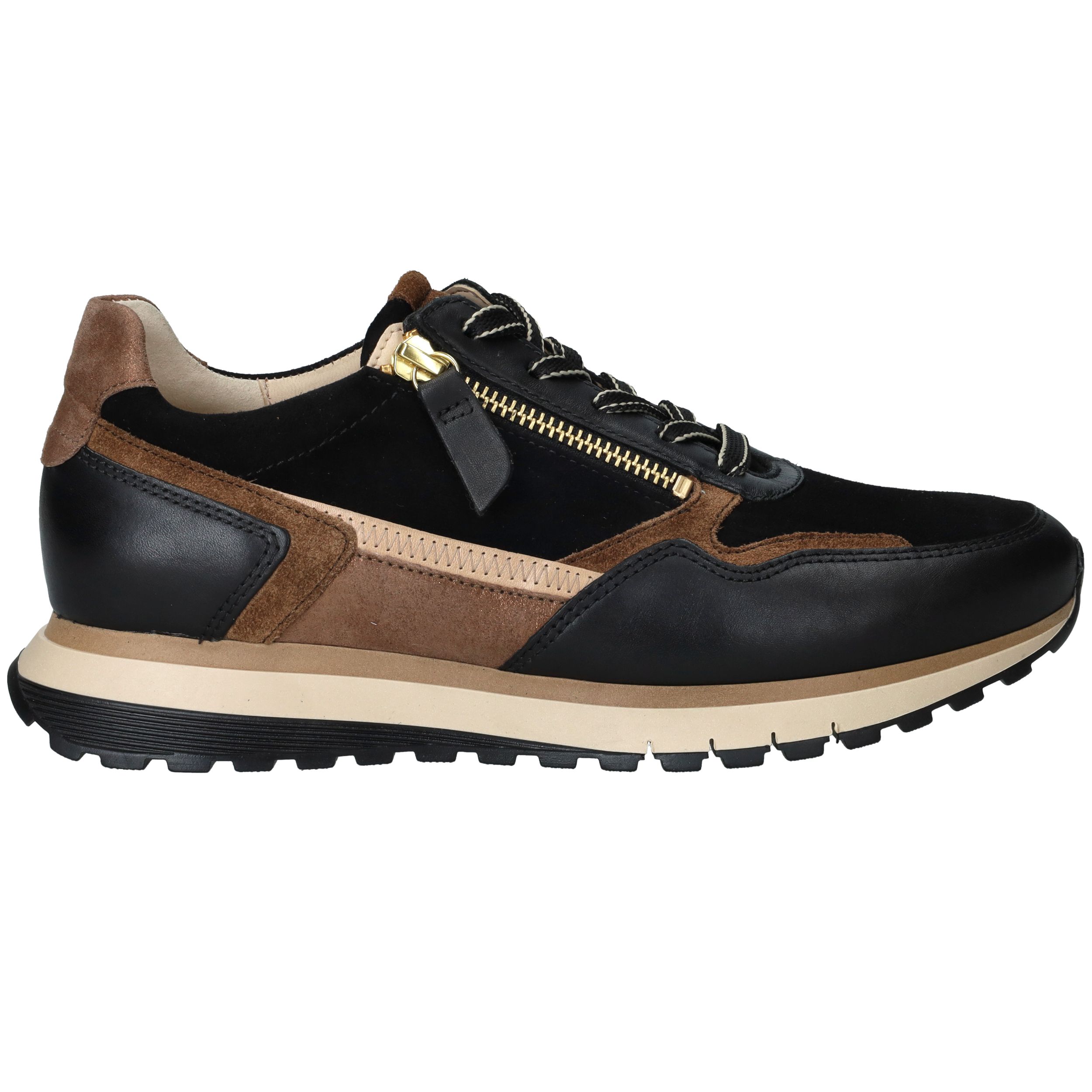 Deze elegante dames sneakers van Gabor combineren comfort met klasse. De mix van zwart leer, suède en beige accenten geeft deze sneaker een rijke, luxe uitstraling. Dankzij de ritssluiting naast de veters trek je ze gemakkelijk aan. De normale voetbreedte G en zachte voering zorgen voor een uitstekende pasvorm.