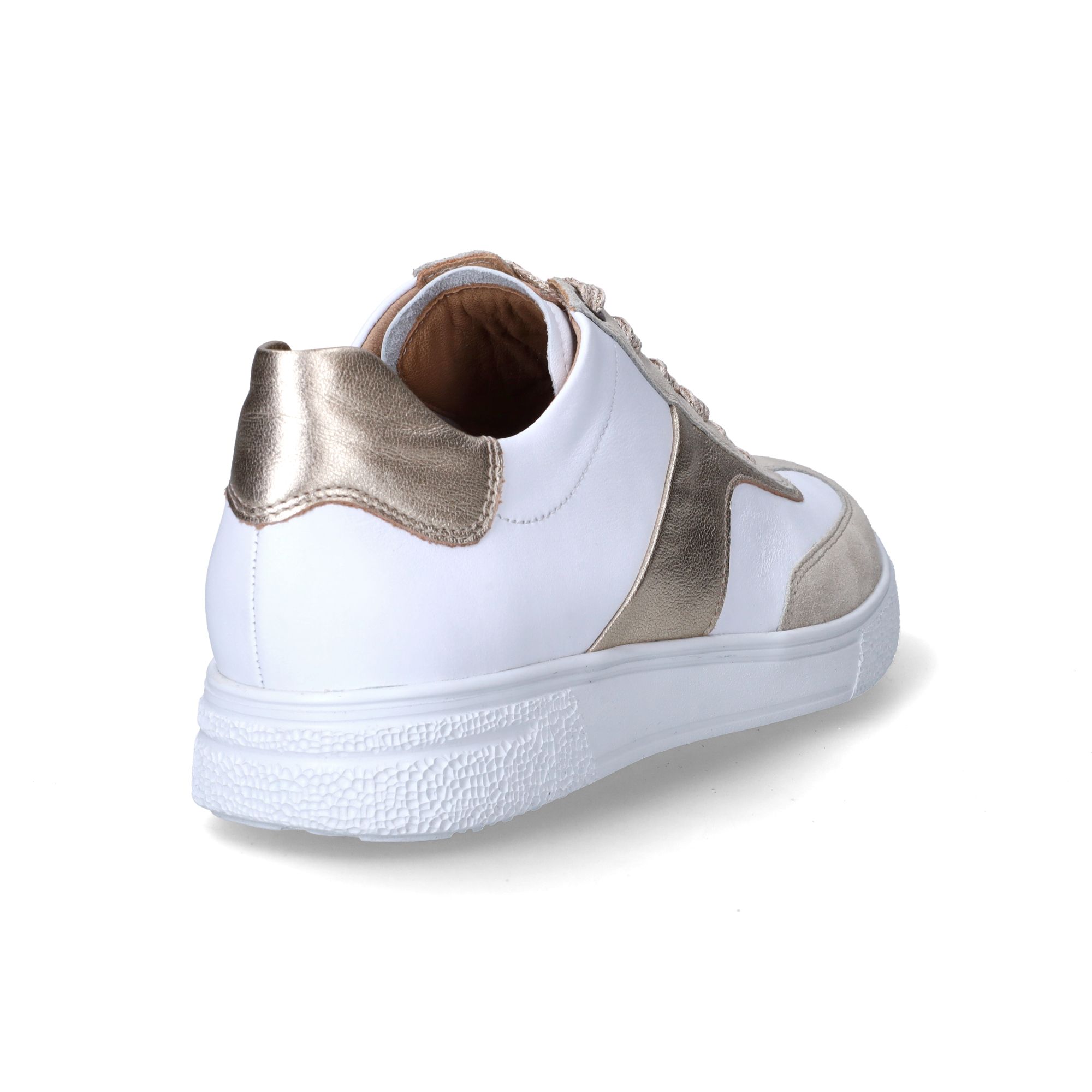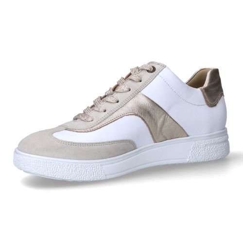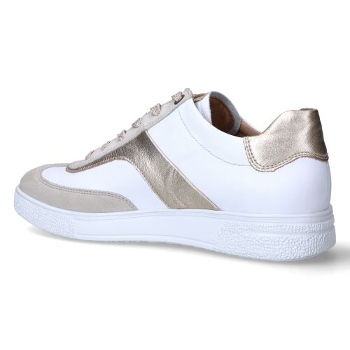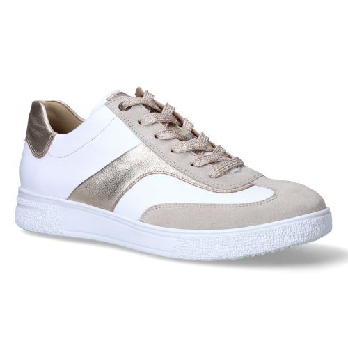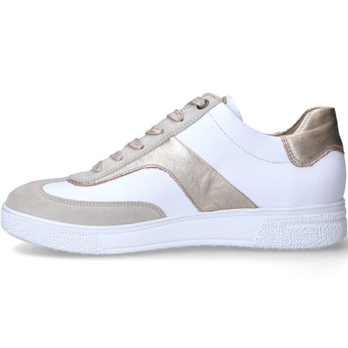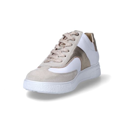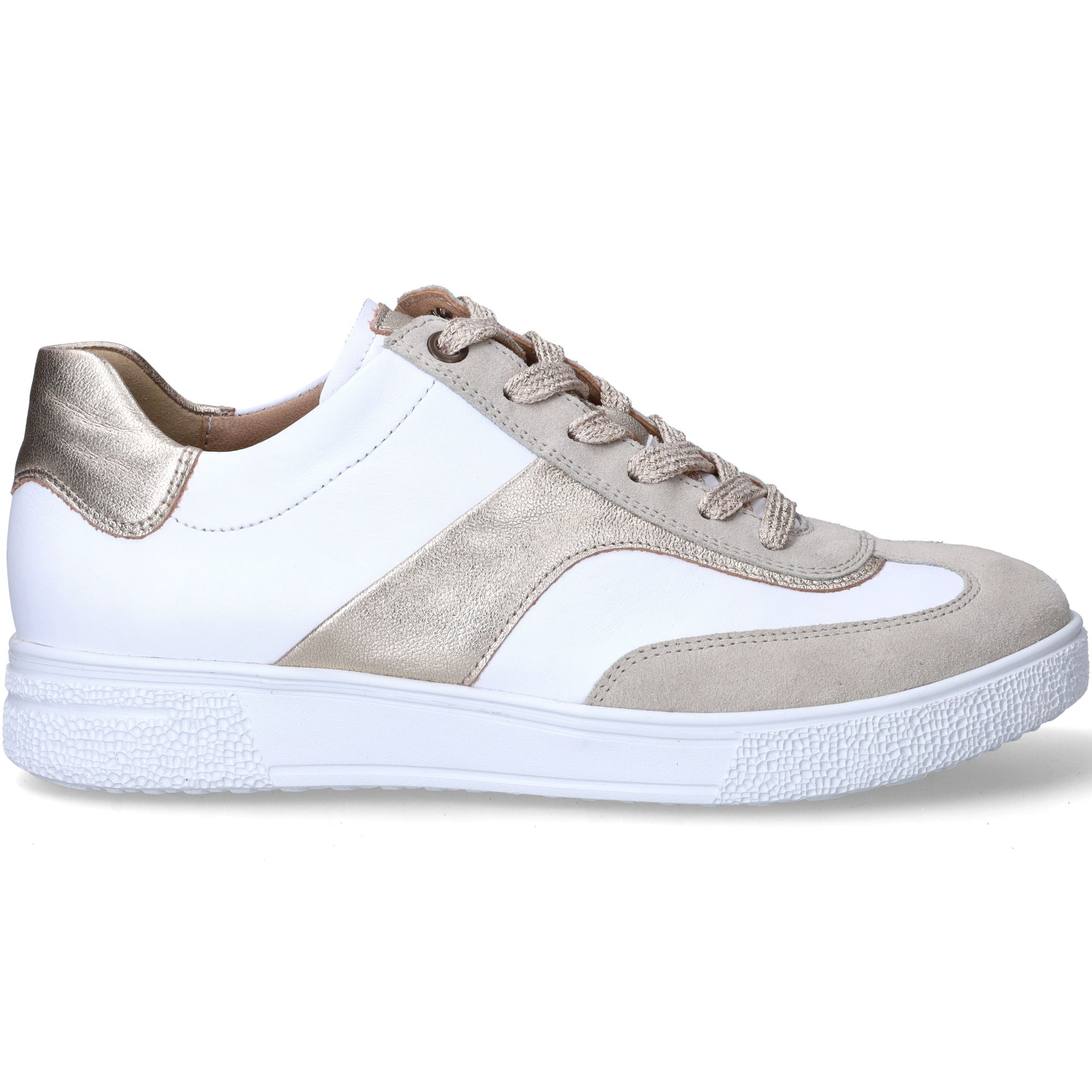 De dames sneakers van Hartjes, in een prachtige combinatie van beige met metallic en subtiel wit, zijn een genot voor je voeten. Deze schoenen, uitgevoerd in leer en suède, voegen een vleugje elegantie toe aan je dagelijkse look, terwijl ze tegelijkertijd een uitzonderlijk draagcomfort bieden. Het ontwerp is zorgvuldig gekozen om de vorm van je voet te volgen, wat zorgt voor een natuurlijke pasvorm. Je merkt direct de fijne drukverdeling onder je voeten, wat bijdraagt aan een ontspannen loopervaring, zelfs na lange dagen. Het gevoel van de sneakers aan je voeten is licht en soepel, alsof ze met je meebewegen bij elke stap. Ze zijn niet alleen mooi om te zien, maar vooral ook prettig om te dragen.- Deze sneakers sluiten met veters, zodat je de pasvorm perfect kunt aanpassen voor een stevige en comfortabele omsluiting van je voet.
