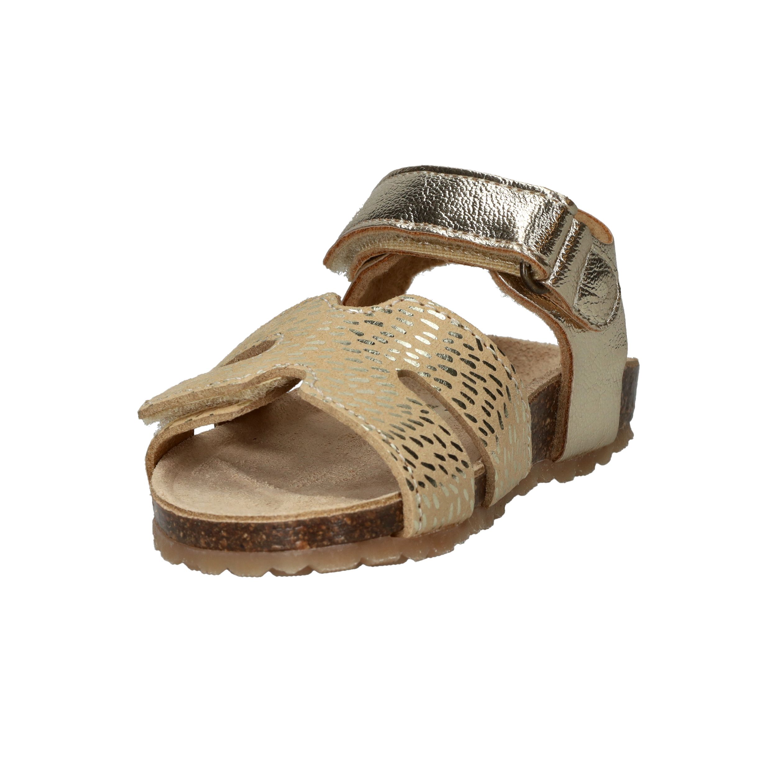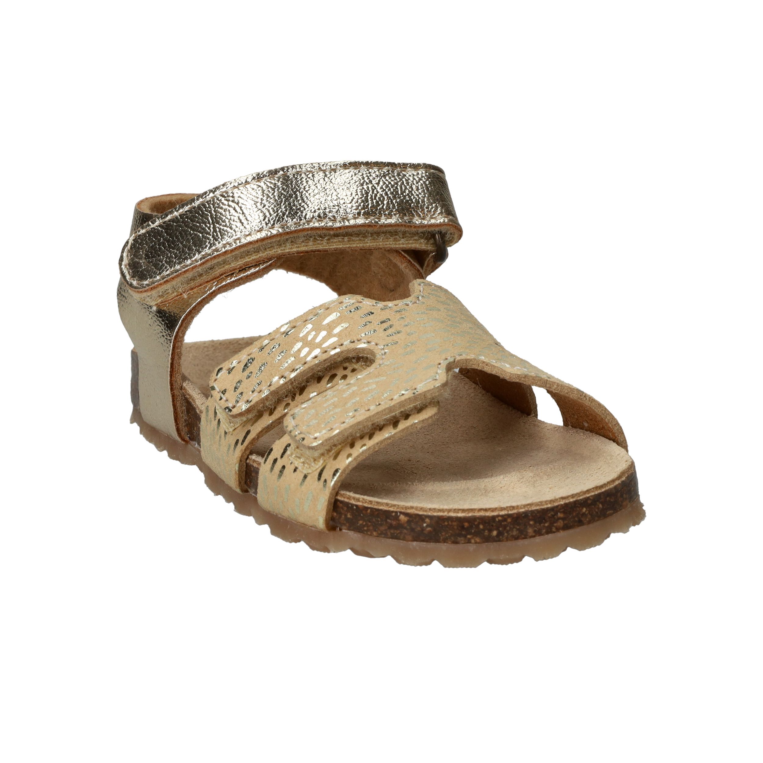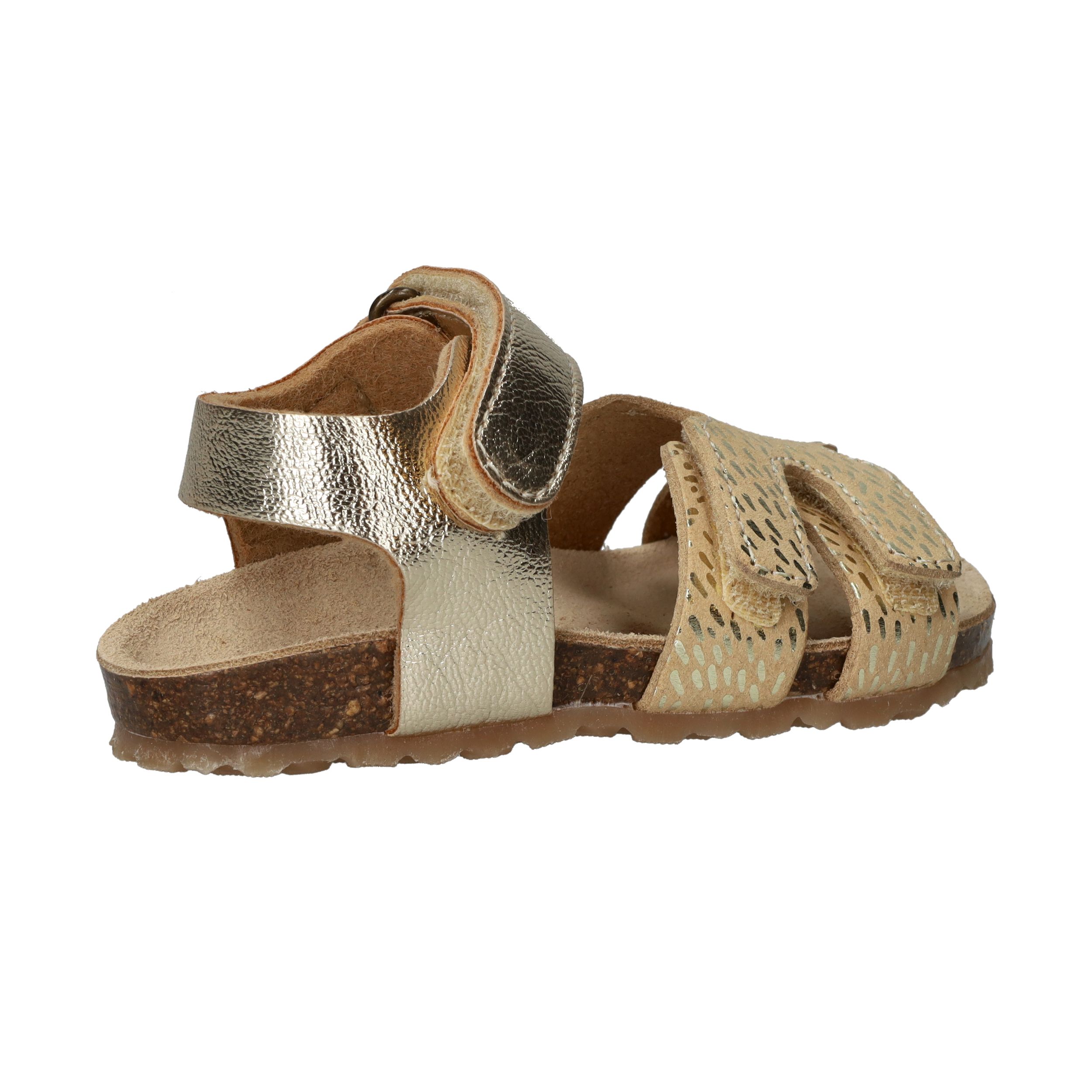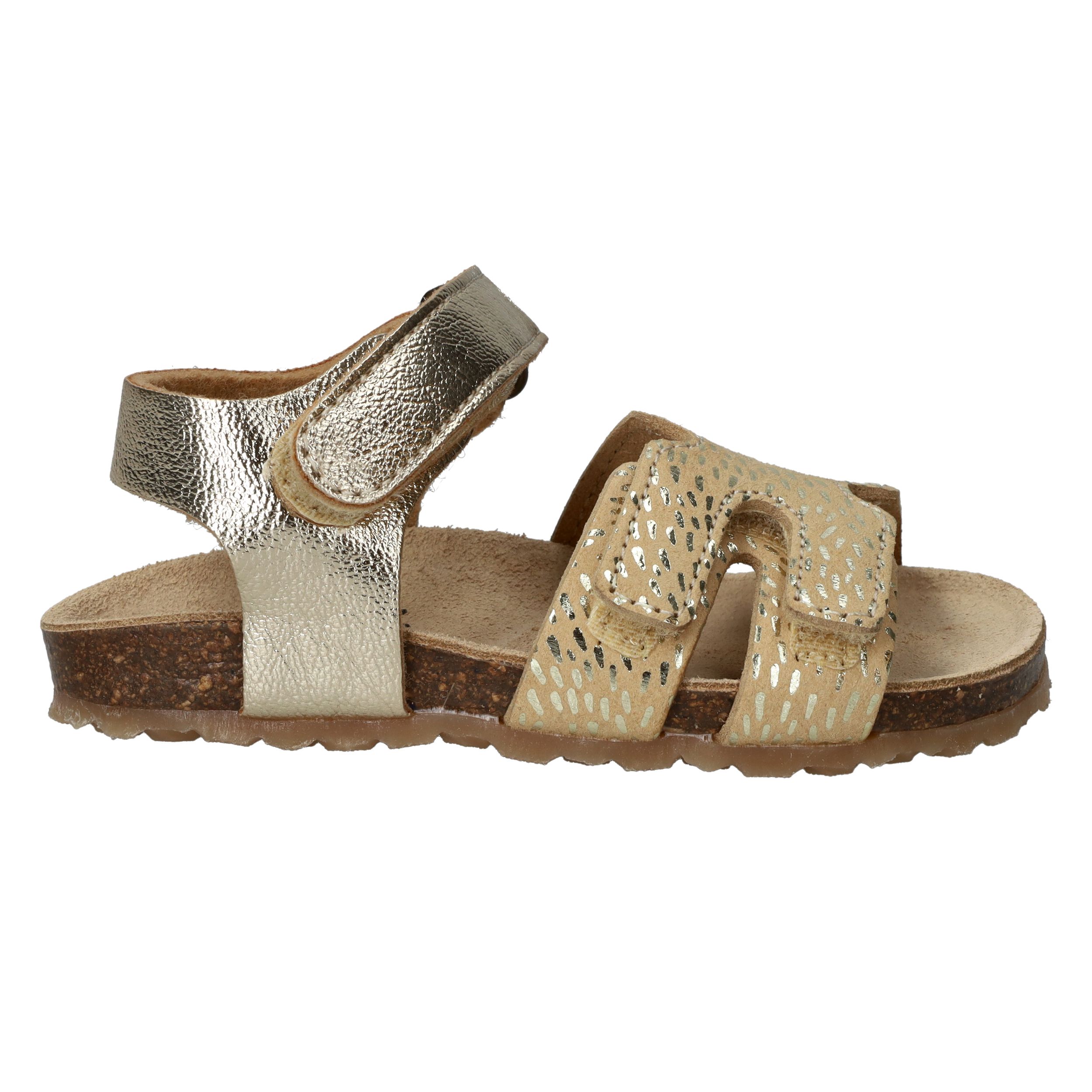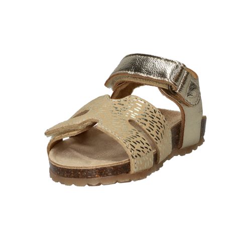 Deze goudkleurige sandalen van IK-KE geven elke outfit van jouw kleine meid een feestelijke touch. Het glanzende kunstleer en de subtiele textuur zorgen voor een speelse, stralende uitstraling. Dankzij de klittenbandsluitingen kunnen kinderen ze helemaal zelf aan- en uittrekken. Het zachte voetbed en de flexibele kurkzool zorgen voor fijn draagcomfort, ideaal voor eindeloze zomerdagen vol plezier.