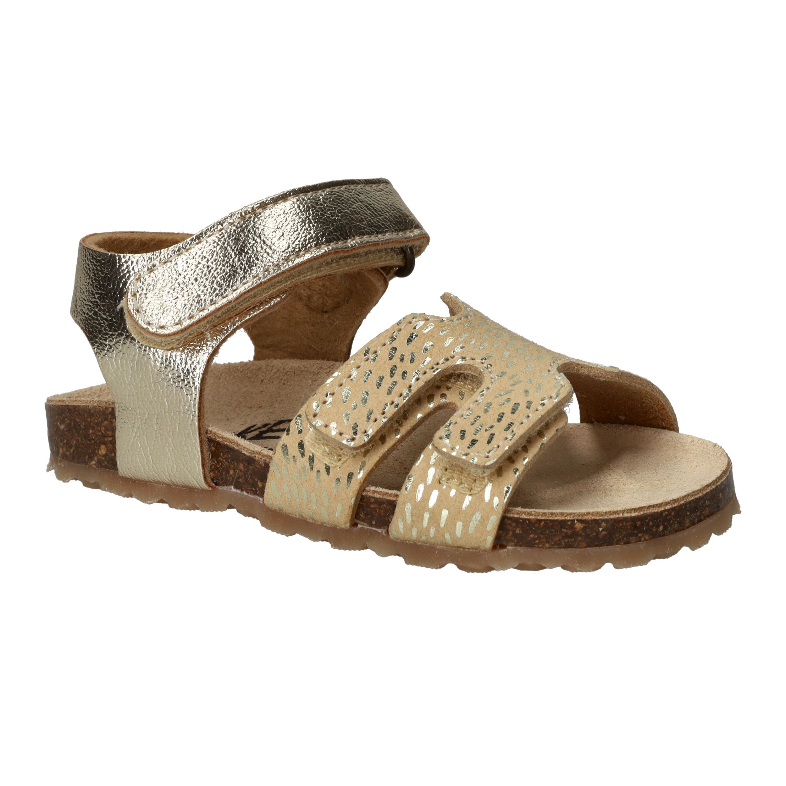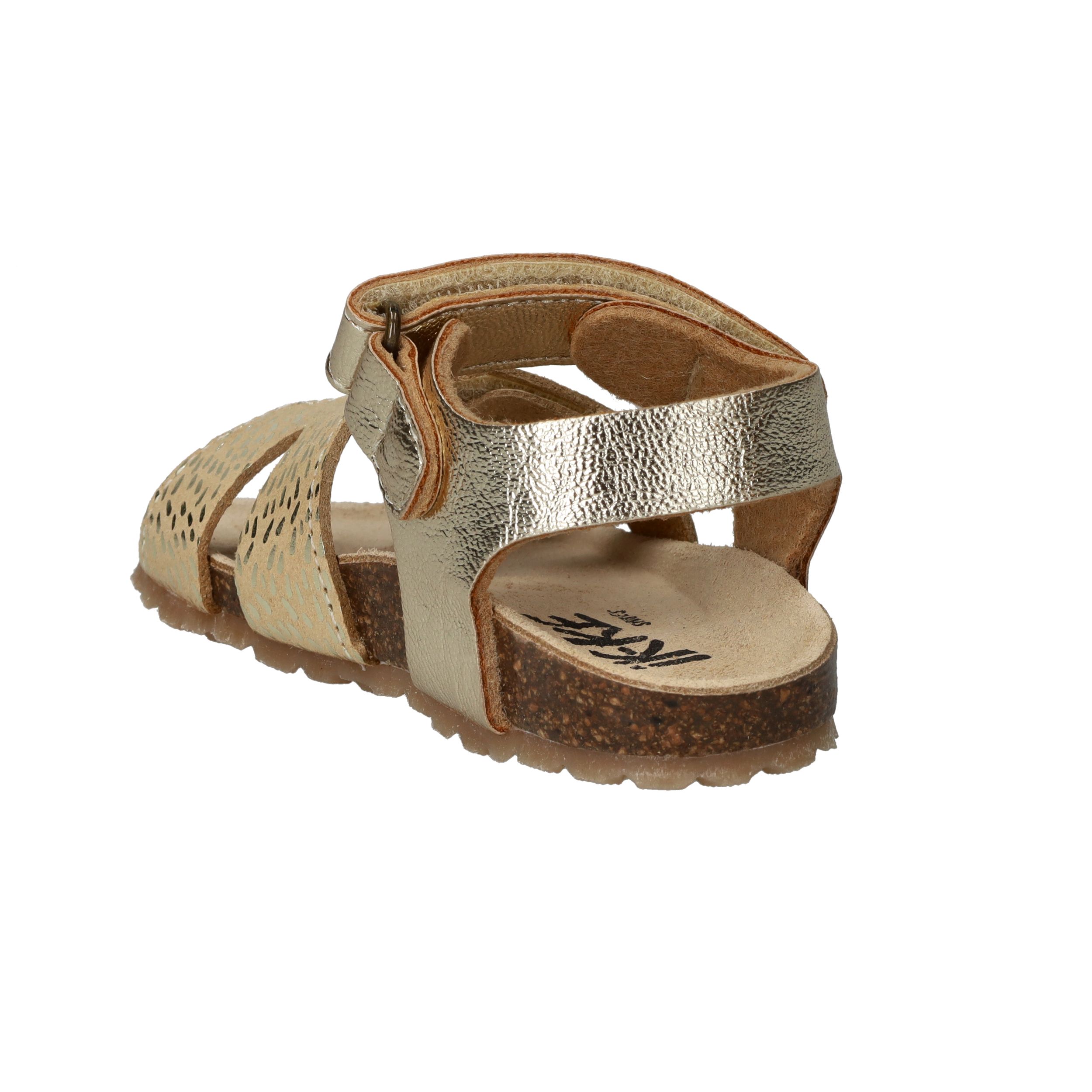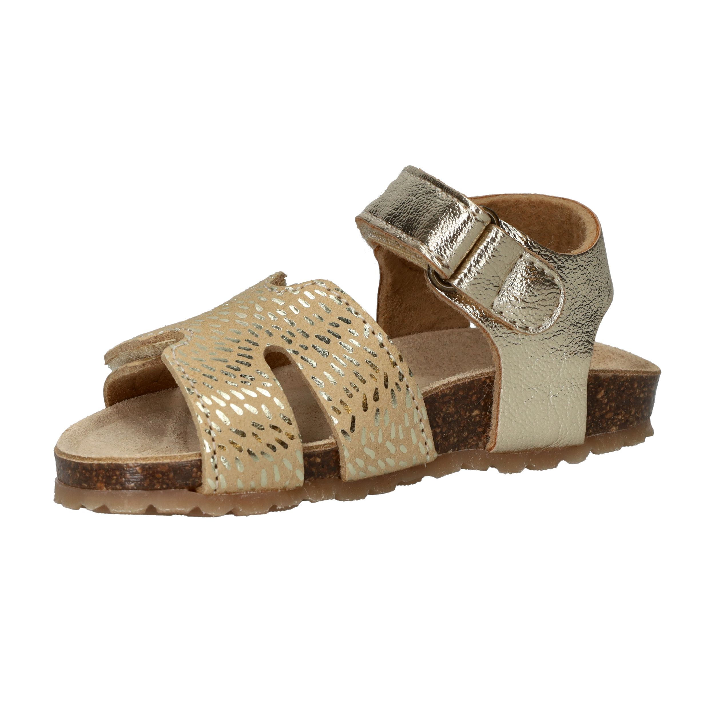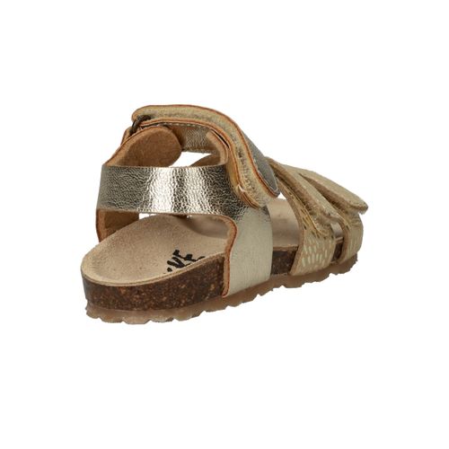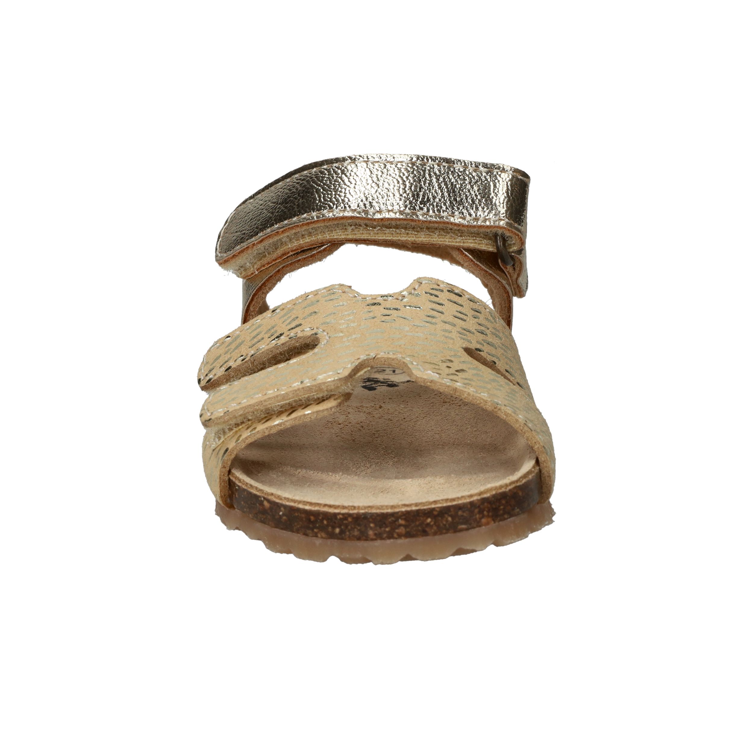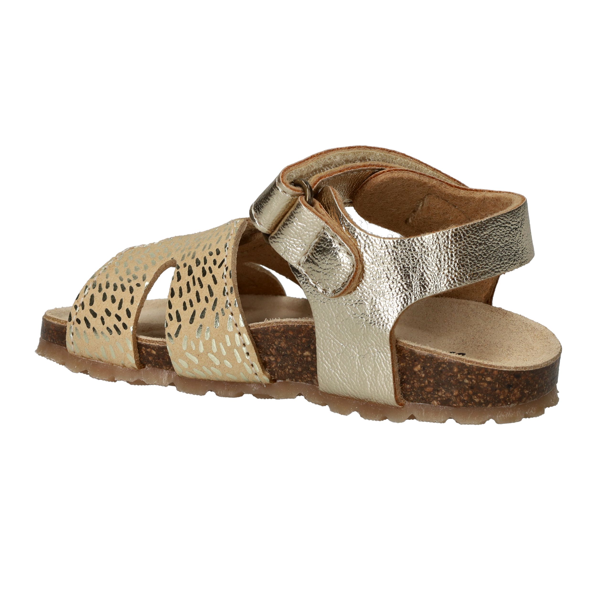 Deze goudkleurige sandalen van IK-KE geven elke outfit van jouw kleine meid een feestelijke touch. Het glanzende kunstleer en de subtiele textuur zorgen voor een speelse, stralende uitstraling. Dankzij de klittenbandsluitingen kunnen kinderen ze helemaal zelf aan- en uittrekken. Het zachte voetbed en de flexibele kurkzool zorgen voor fijn draagcomfort, ideaal voor eindeloze zomerdagen vol plezier.