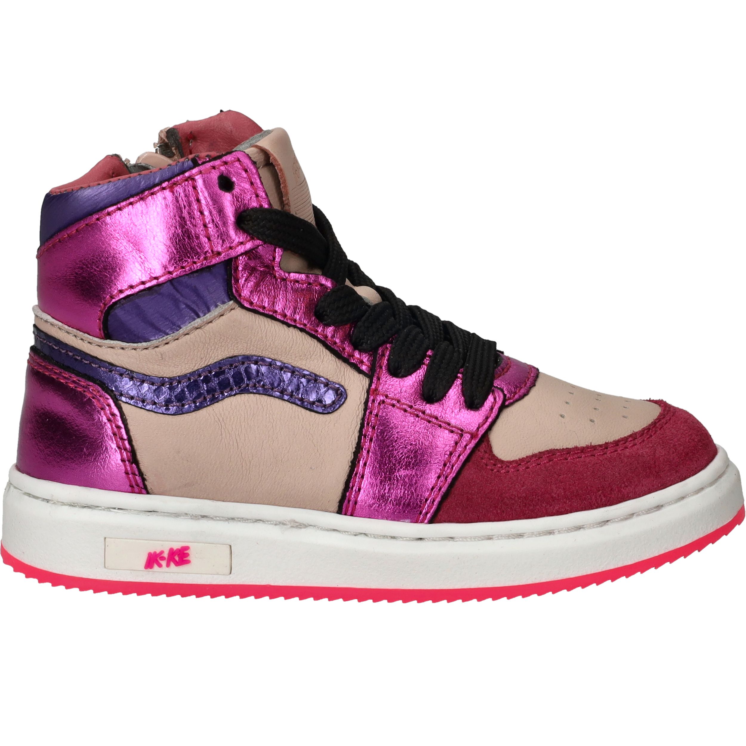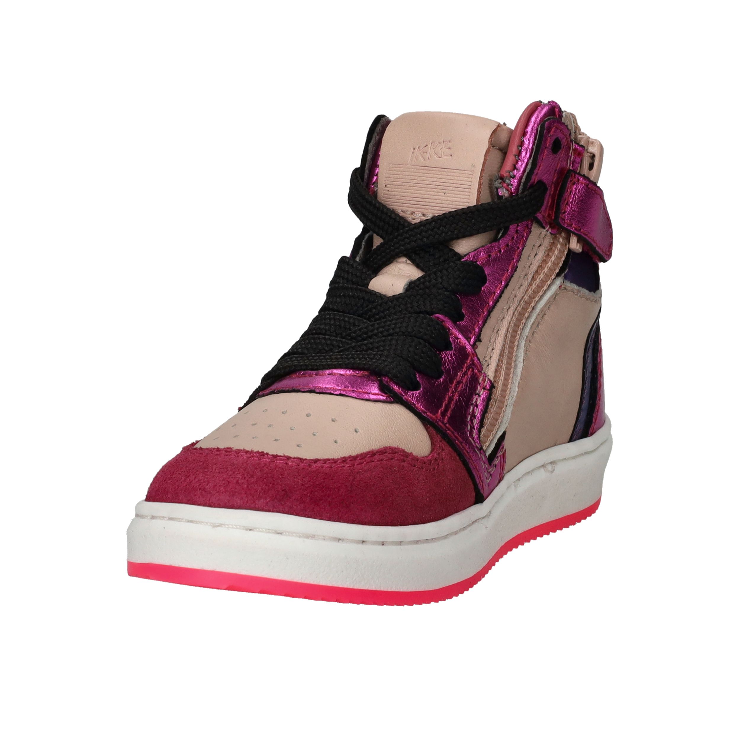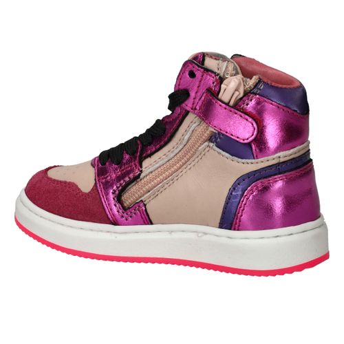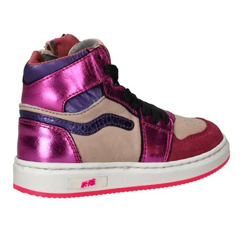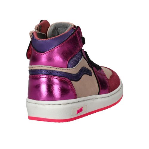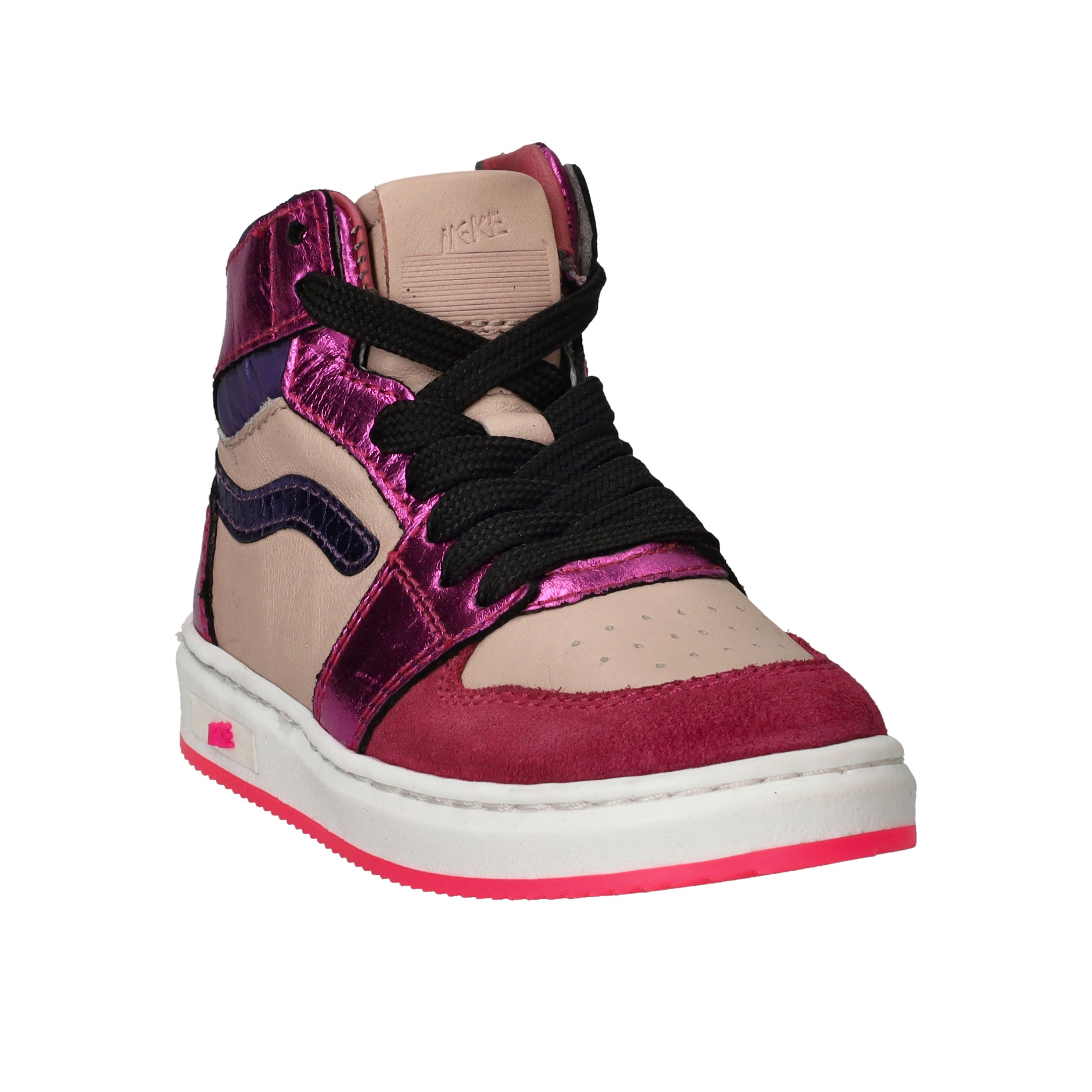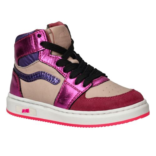 Met deze kleurrijke IK-KE sneakers maak je elke outfit vrolijk en stoer. Deze hoge meisjes sneakers combineren leer met metallic accenten in roze en paars, waardoor ze direct opvallen. De fijne pasvorm met G-voetbreedte zorgt voor comfort tijdens het spelen of naar school. Ideaal voor meiden die houden van mode en kleur in hun schoenen.