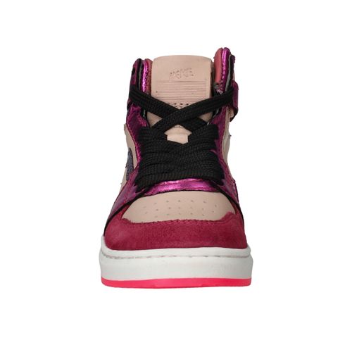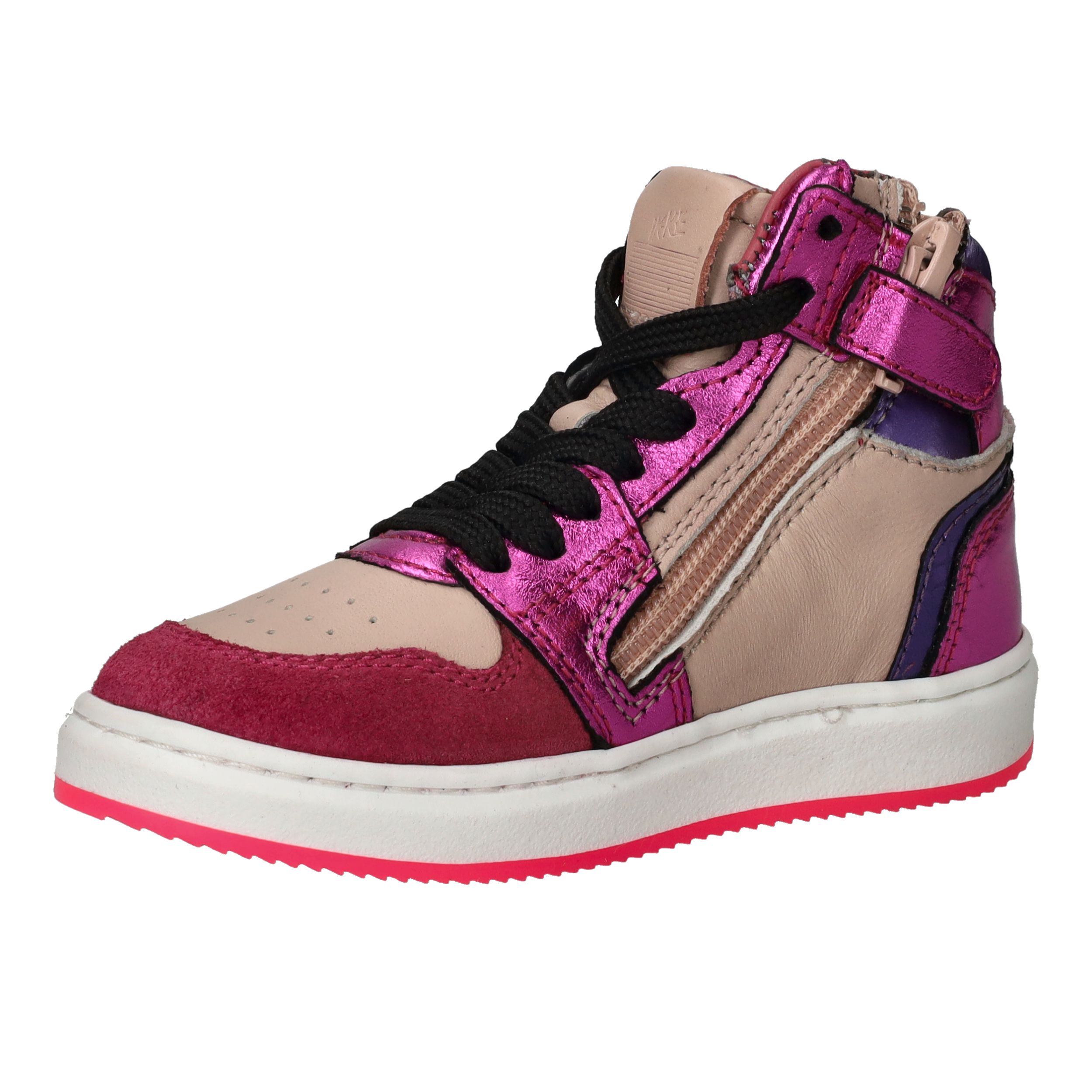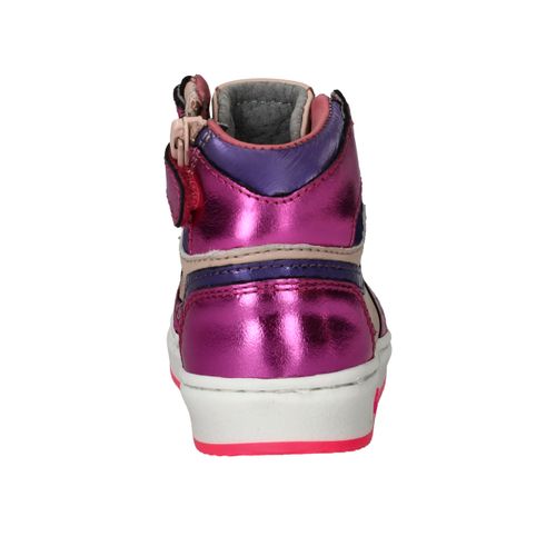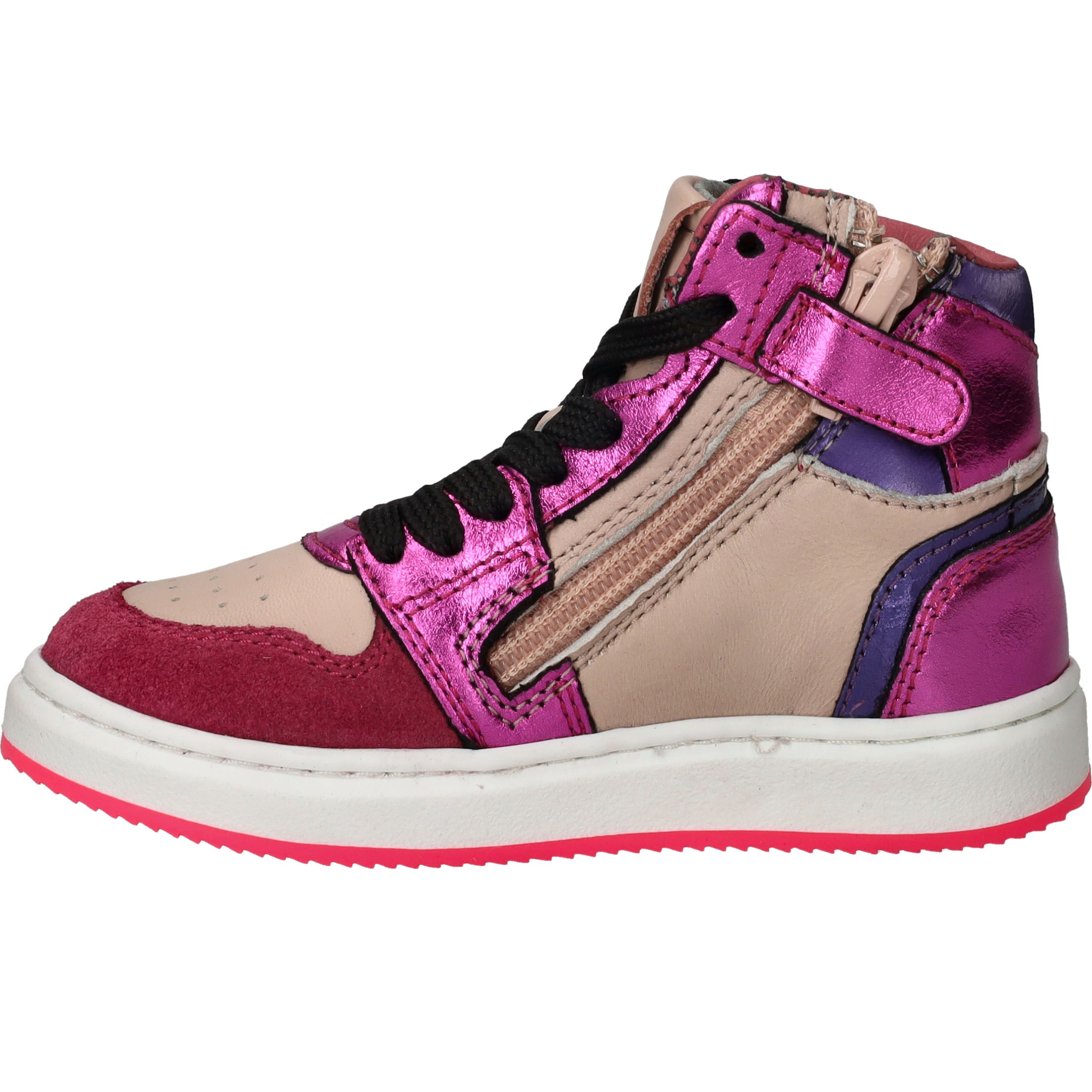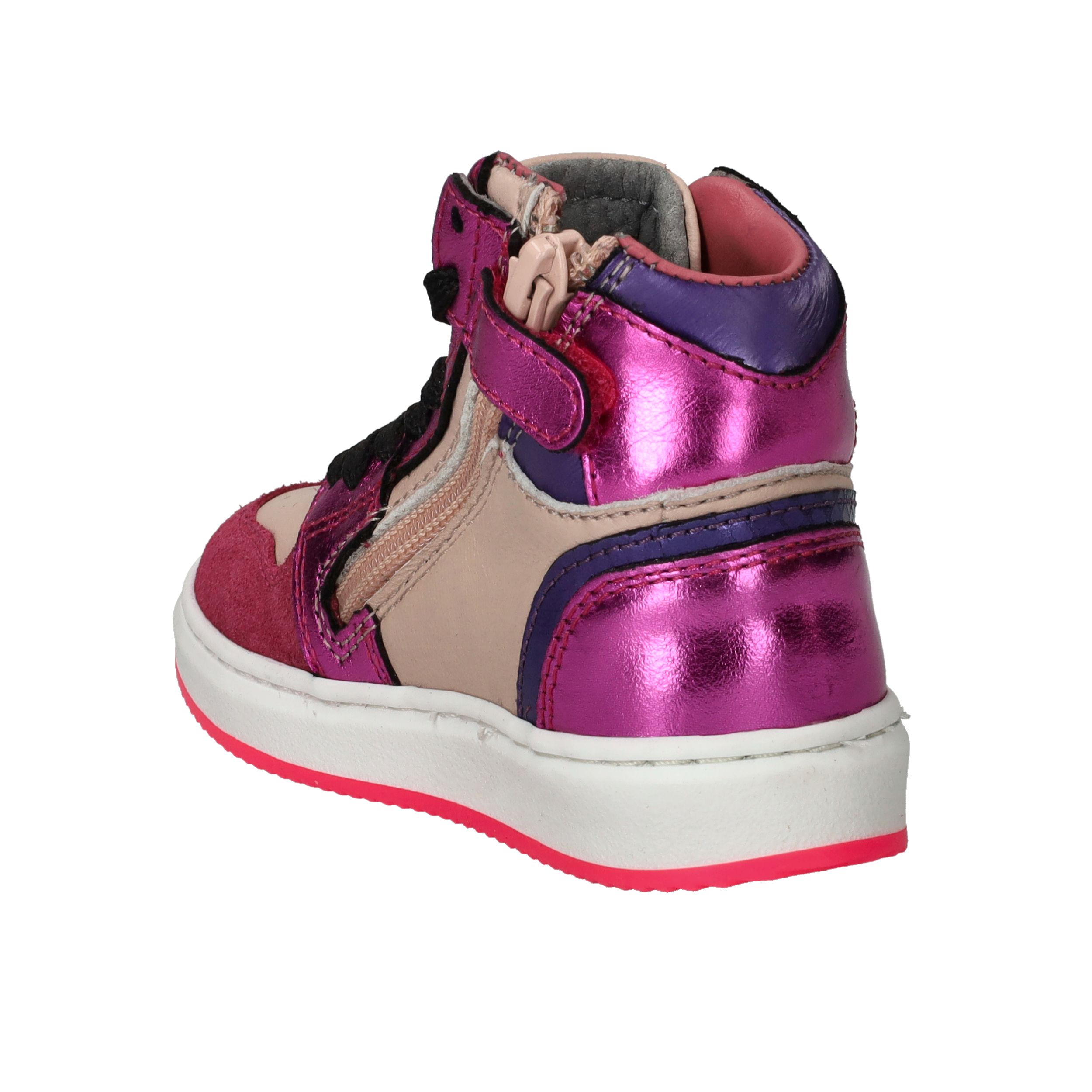 Met deze kleurrijke IK-KE sneakers maak je elke outfit vrolijk en stoer. Deze hoge meisjes sneakers combineren leer met metallic accenten in roze en paars, waardoor ze direct opvallen. De fijne pasvorm met G-voetbreedte zorgt voor comfort tijdens het spelen of naar school. Ideaal voor meiden die houden van mode en kleur in hun schoenen.