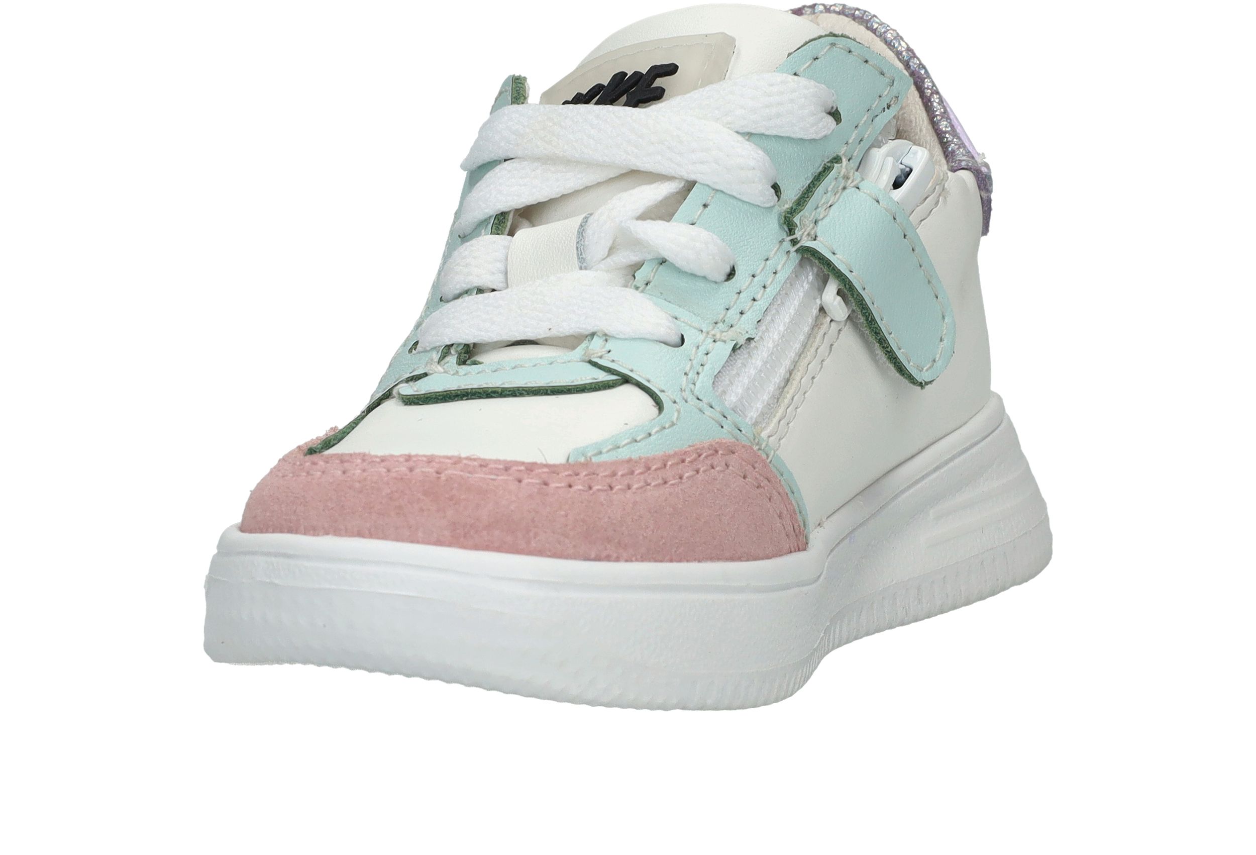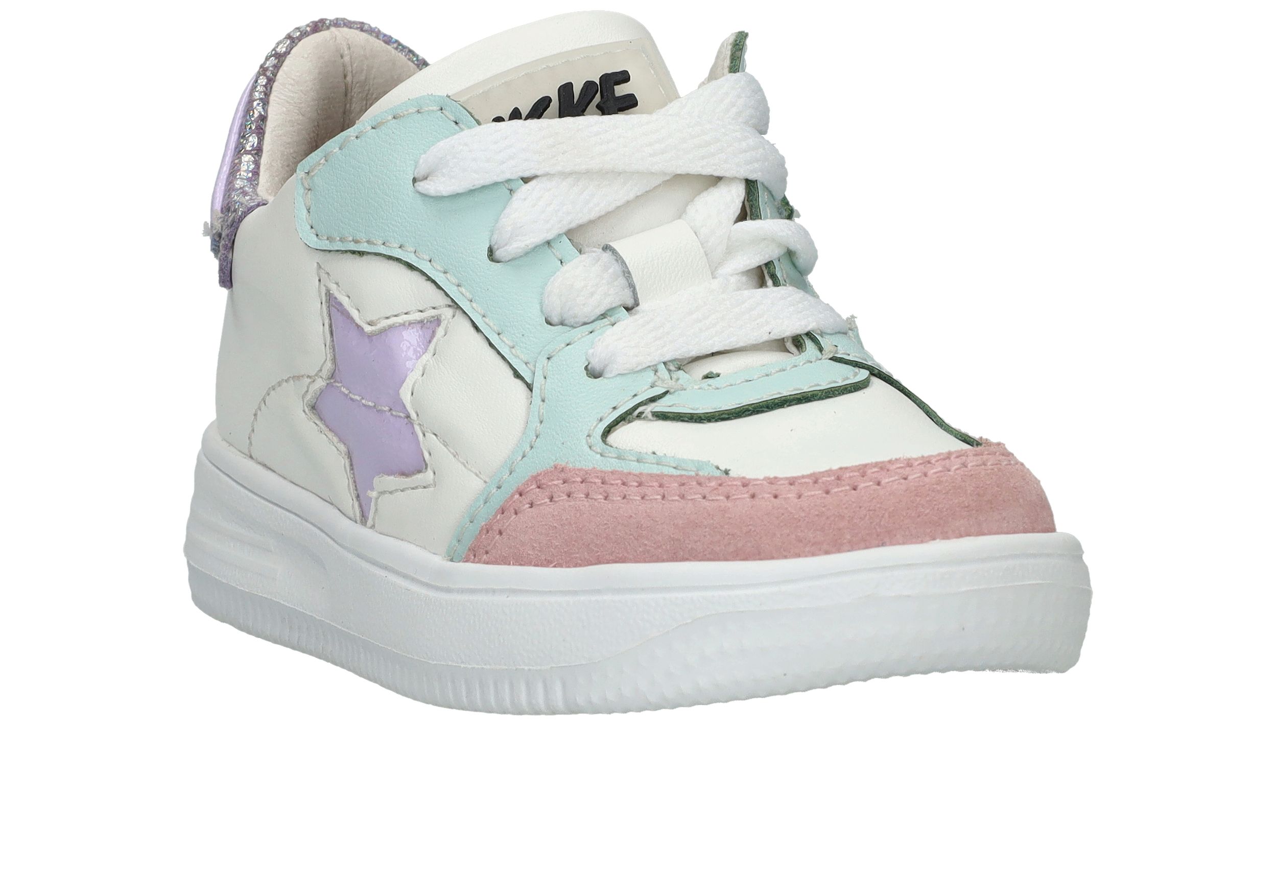 Wat een fijne IK-KE veterschoen is dit! De witte meidenschoen heeft zachte pastelkleuren. Extra handig is de veter- en ritssluiting.