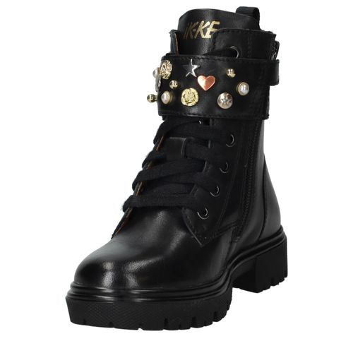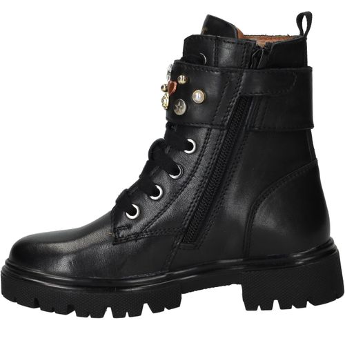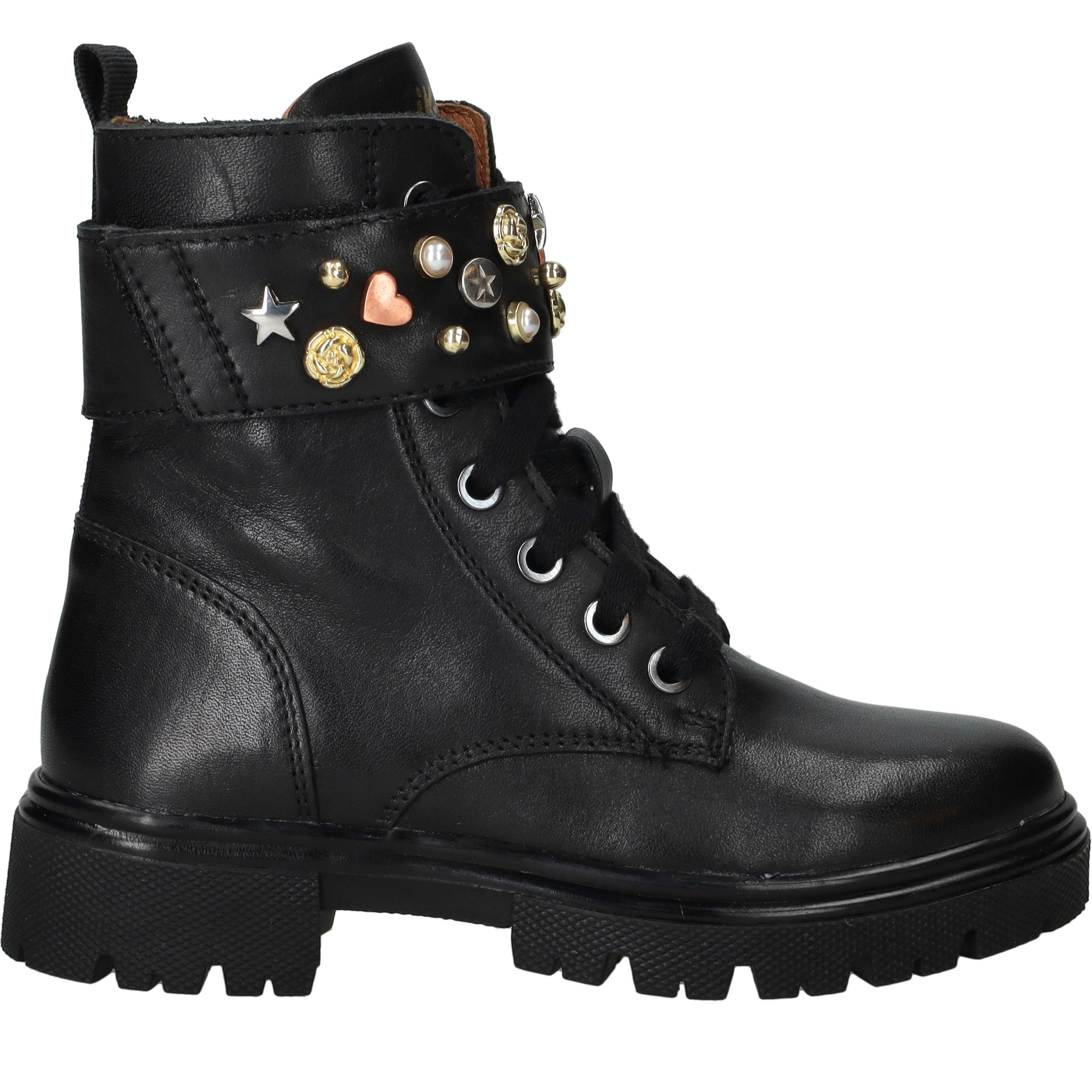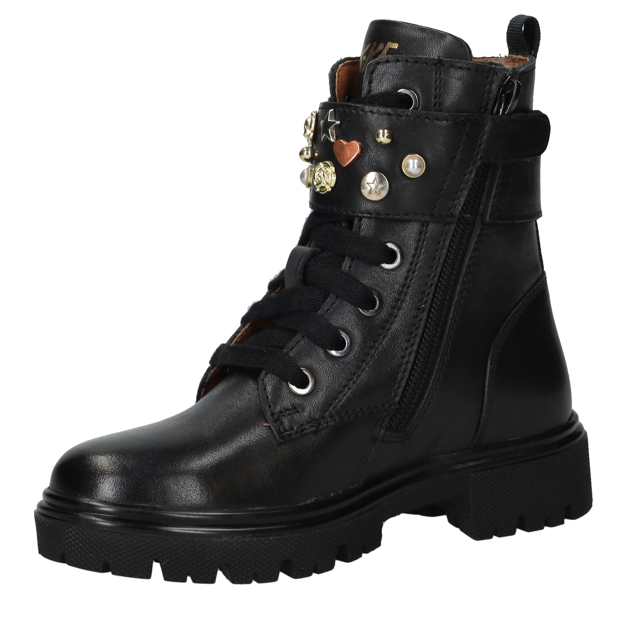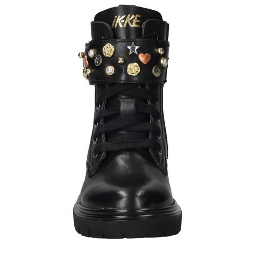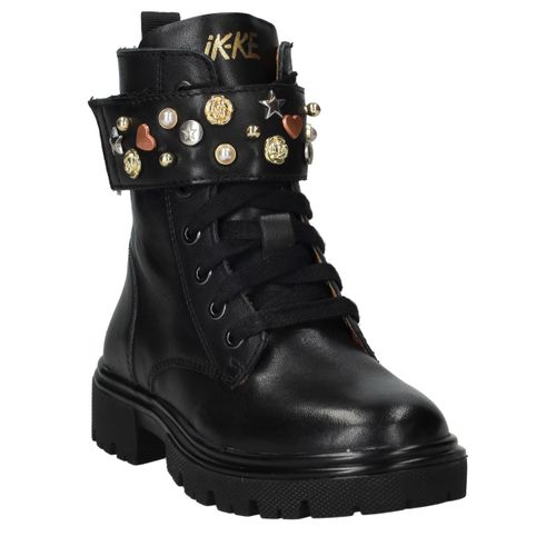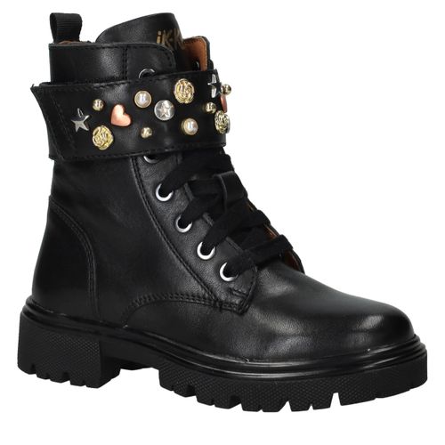 Deze stoere zwarte IK-KE veterboot is helemaal van nu. Het gladde leer is stevig en soepel tegelijk en de brede omslag met vrolijke studs geeft elke outfit extra glans. De voering van leer en synthetisch zit zacht en comfortabel zodat ze de hele dag fijn lopen en spelen.