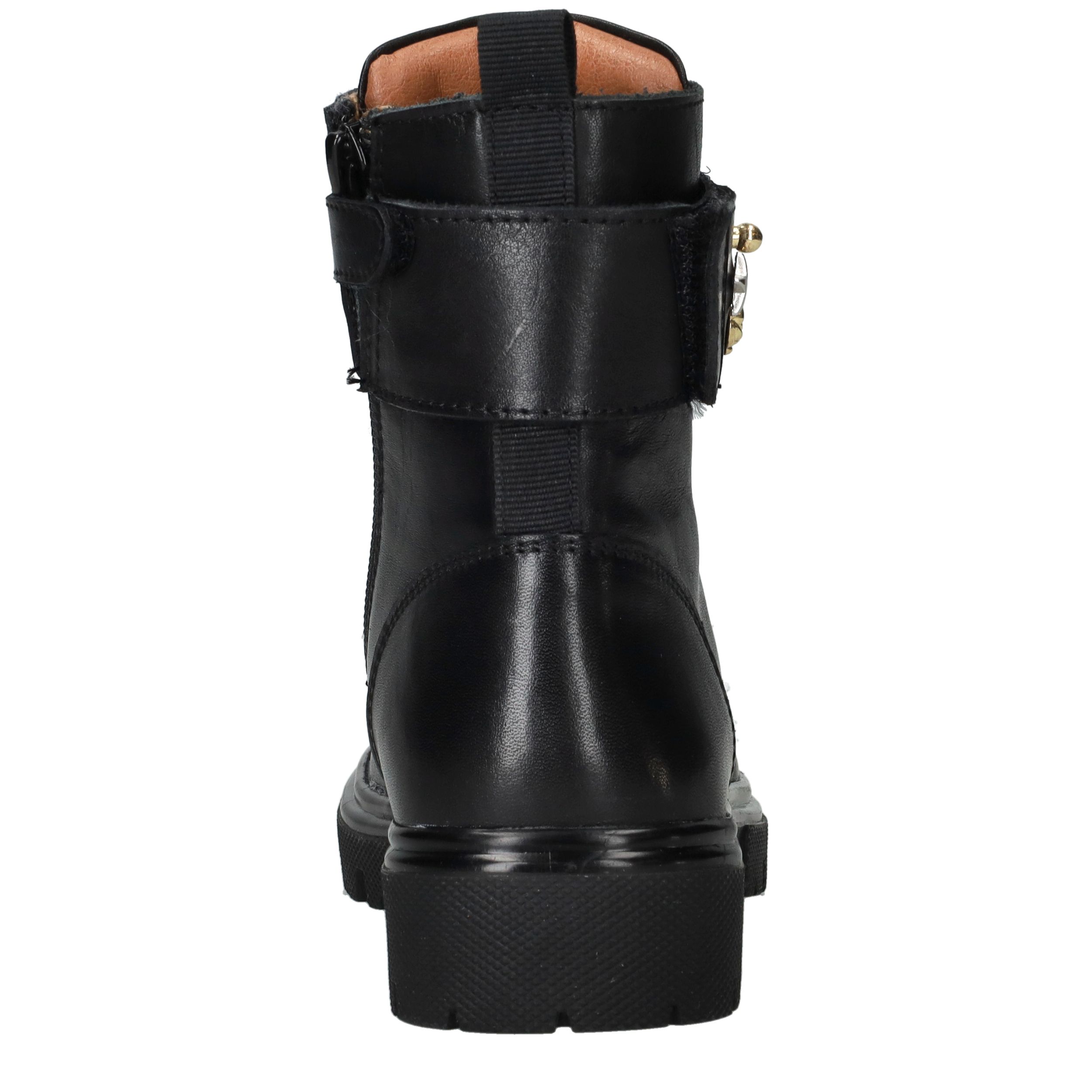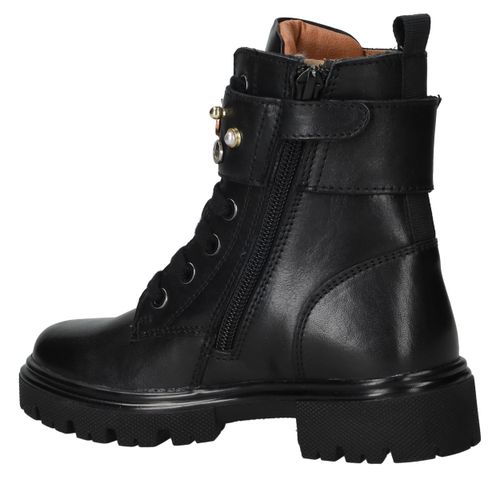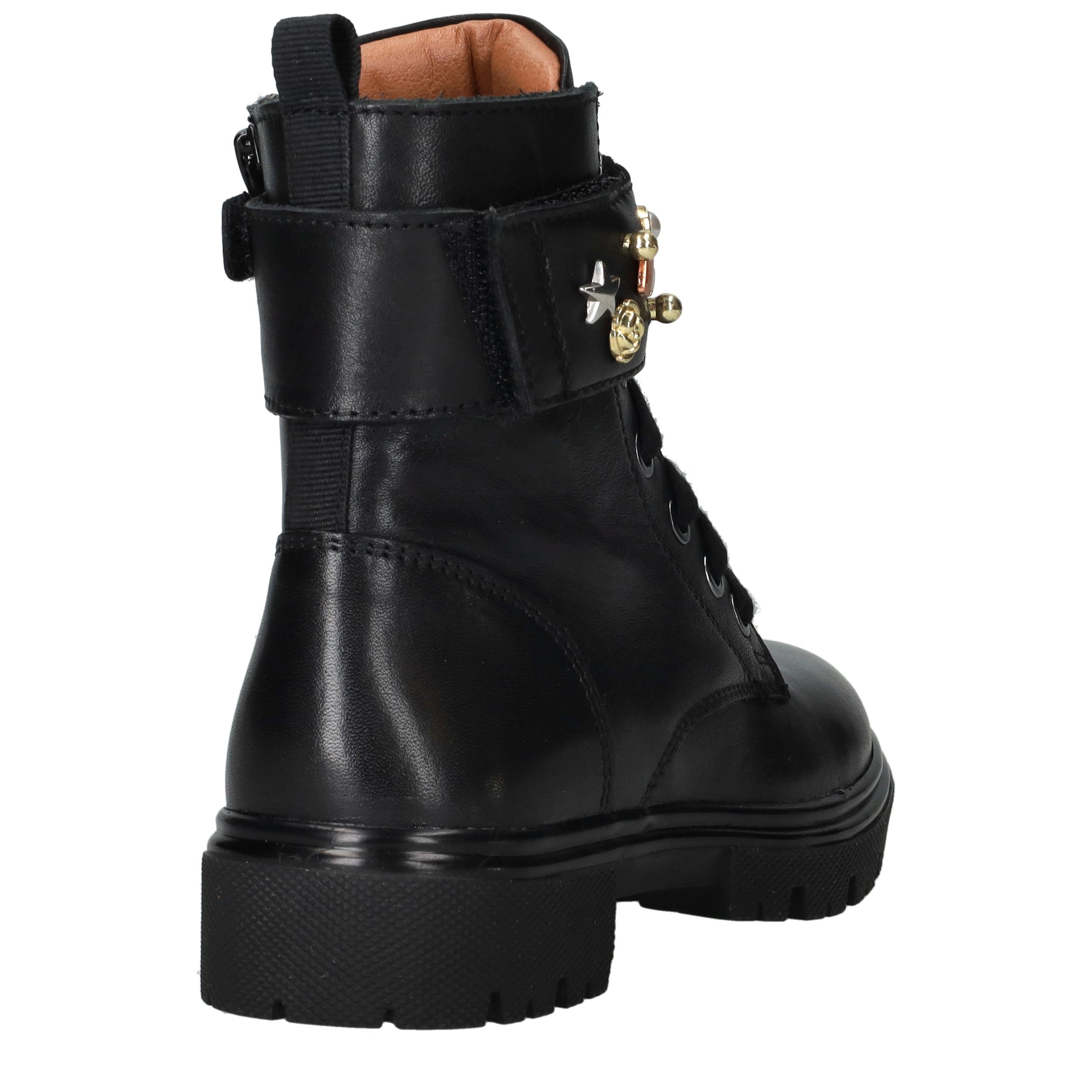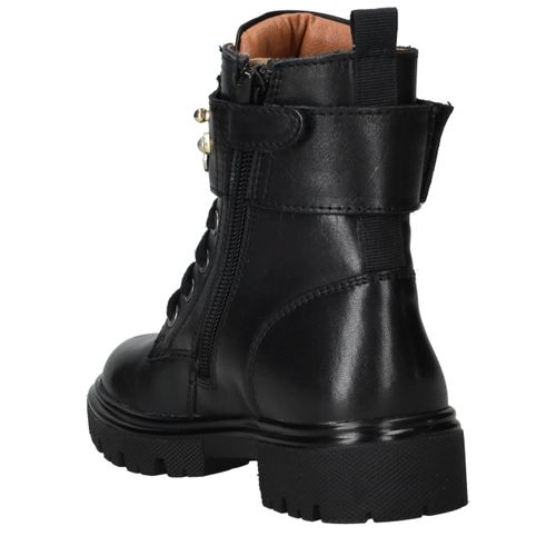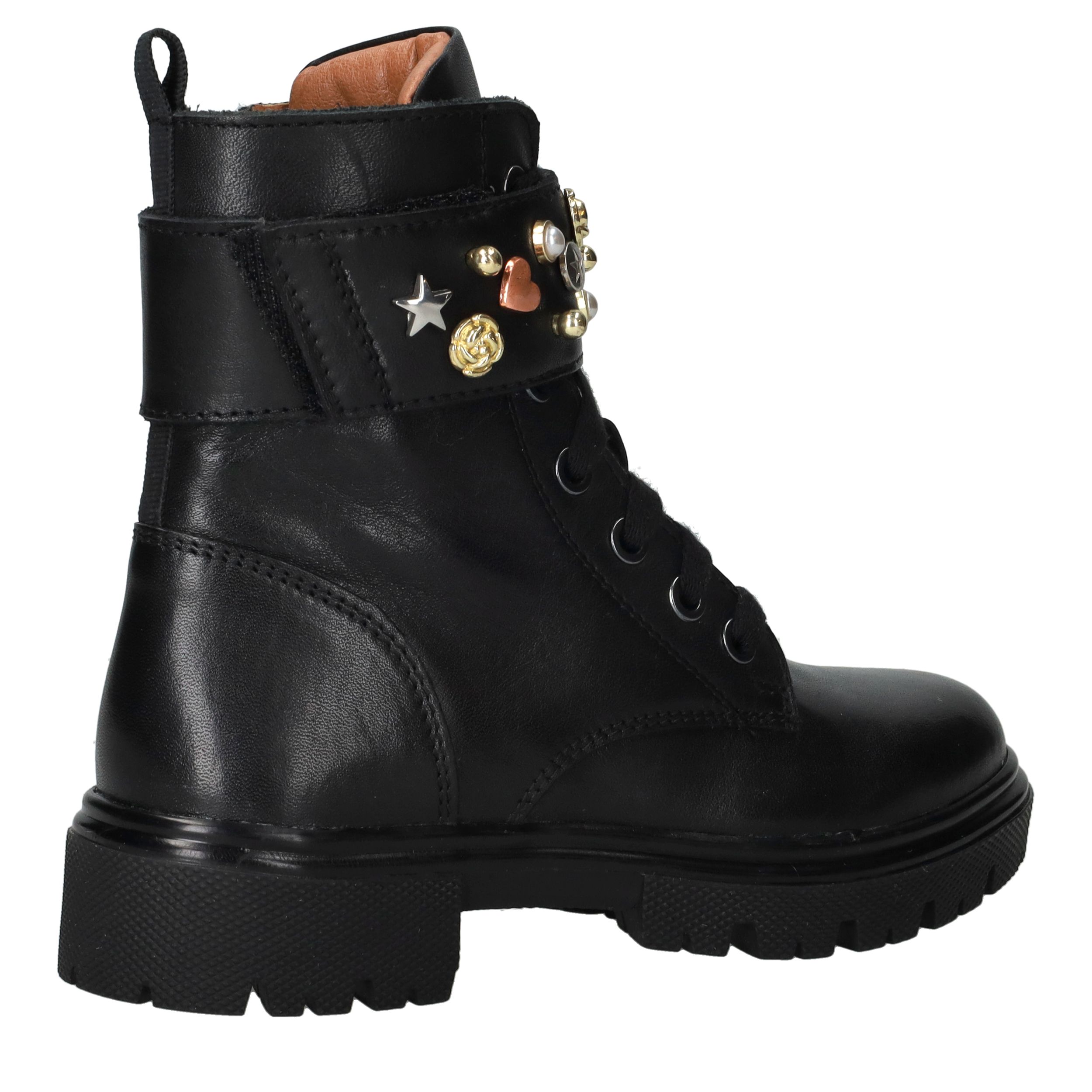 Deze stoere zwarte IK-KE veterboot is helemaal van nu. Het gladde leer is stevig en soepel tegelijk en de brede omslag met vrolijke studs geeft elke outfit extra glans. De voering van leer en synthetisch zit zacht en comfortabel zodat ze de hele dag fijn lopen en spelen.