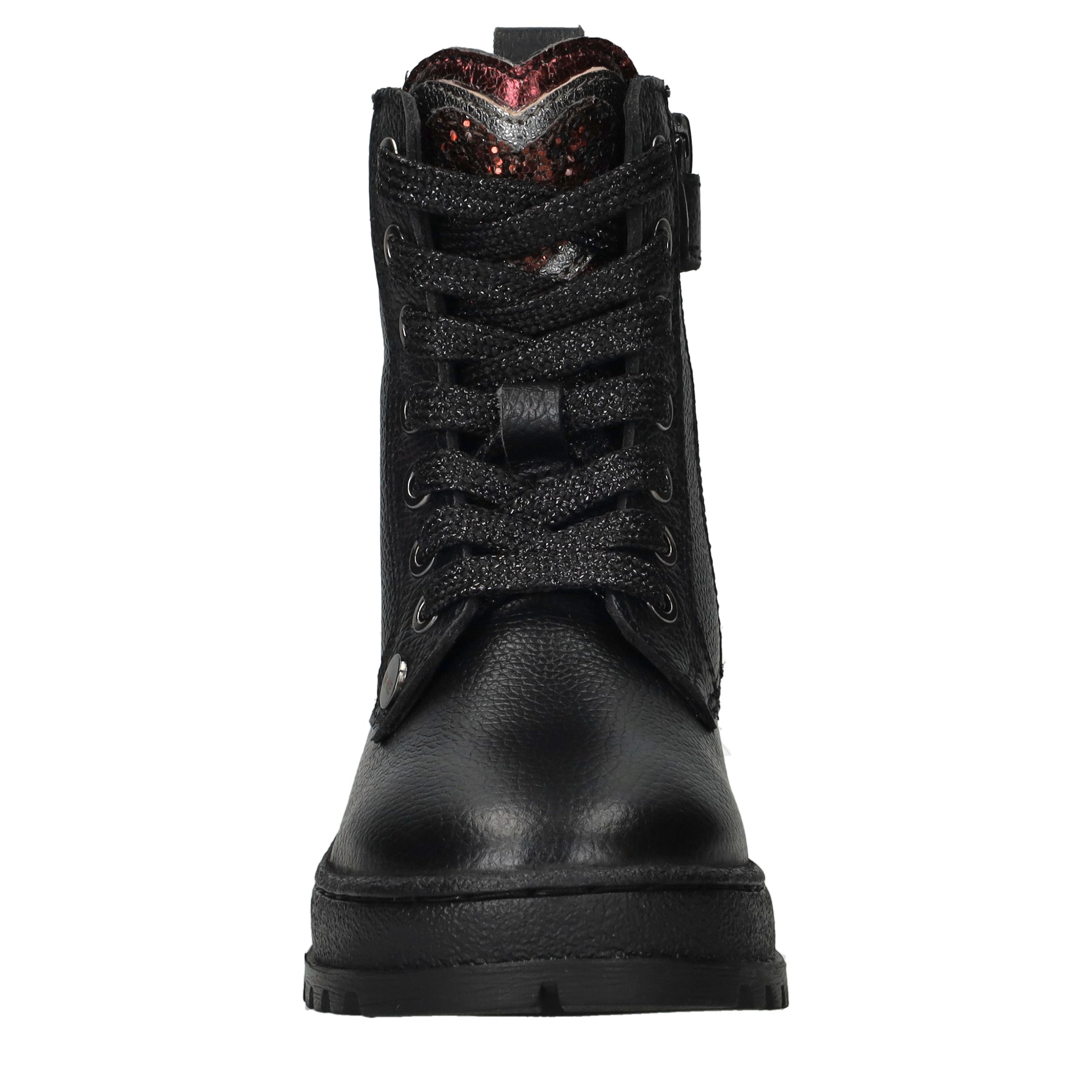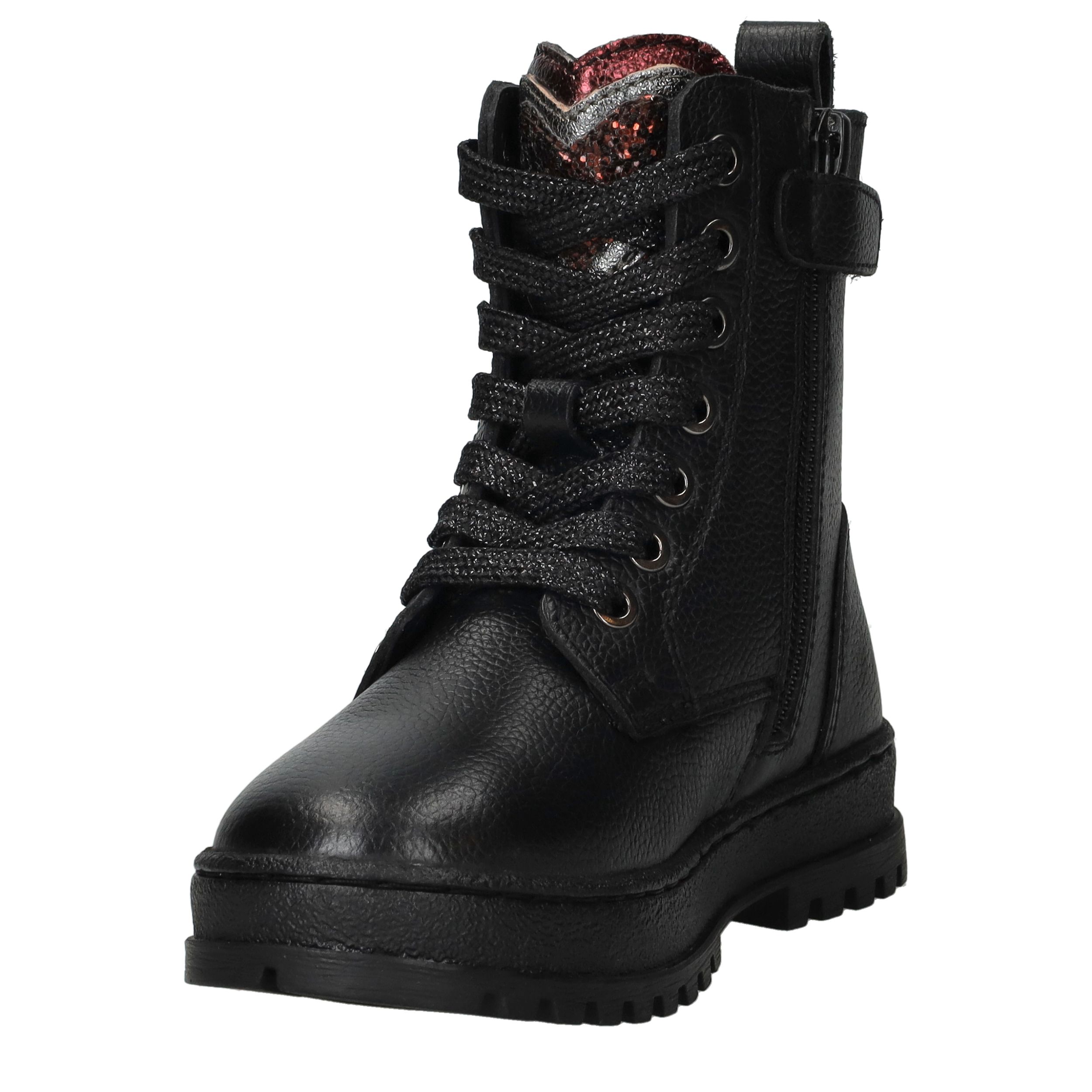 Deze stoere zwarte IK-KE veterboots zijn perfect voor meiden die comfort en stijl willen combineren. Het bovenwerk van leer geeft de schoen een robuuste uitstraling en zorgt voor duurzaamheid. De combinatie van leren en textielen voering zorgt voor een prettig draagcomfort, ook tijdens lange dagen op school of buiten spelen. Een leuk detail is het roze glitterhart op de tong, wat de veterboot een speelse en unieke look geeft. Met hun stevige profielzool bieden deze boots uitstekende grip.