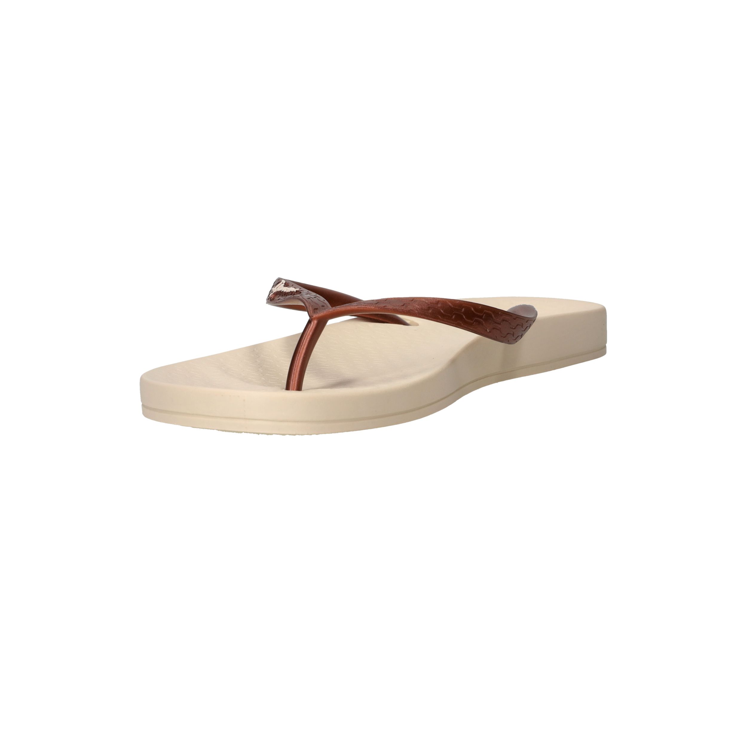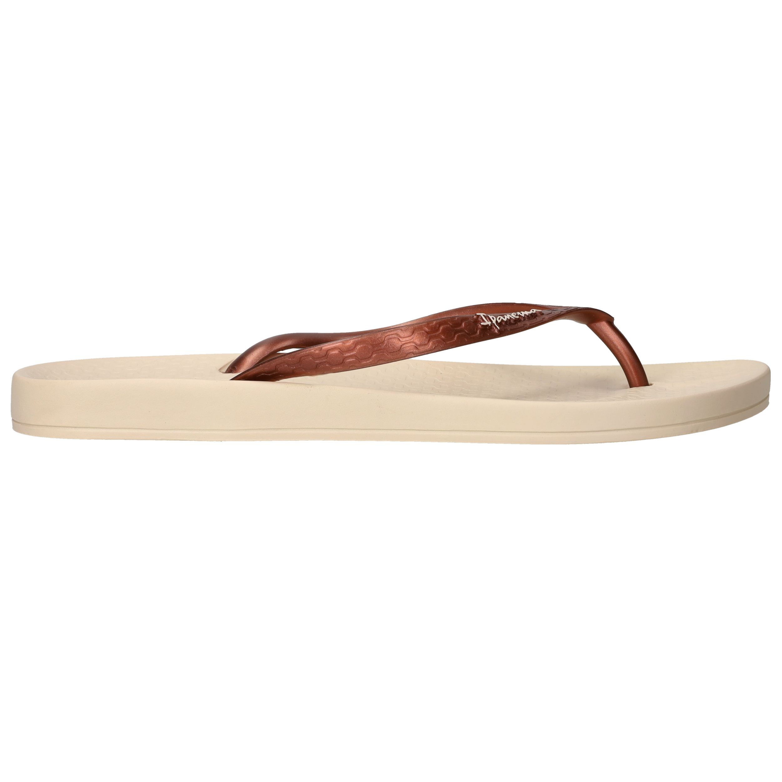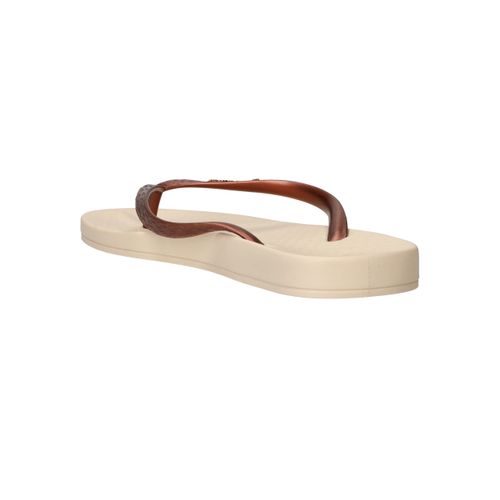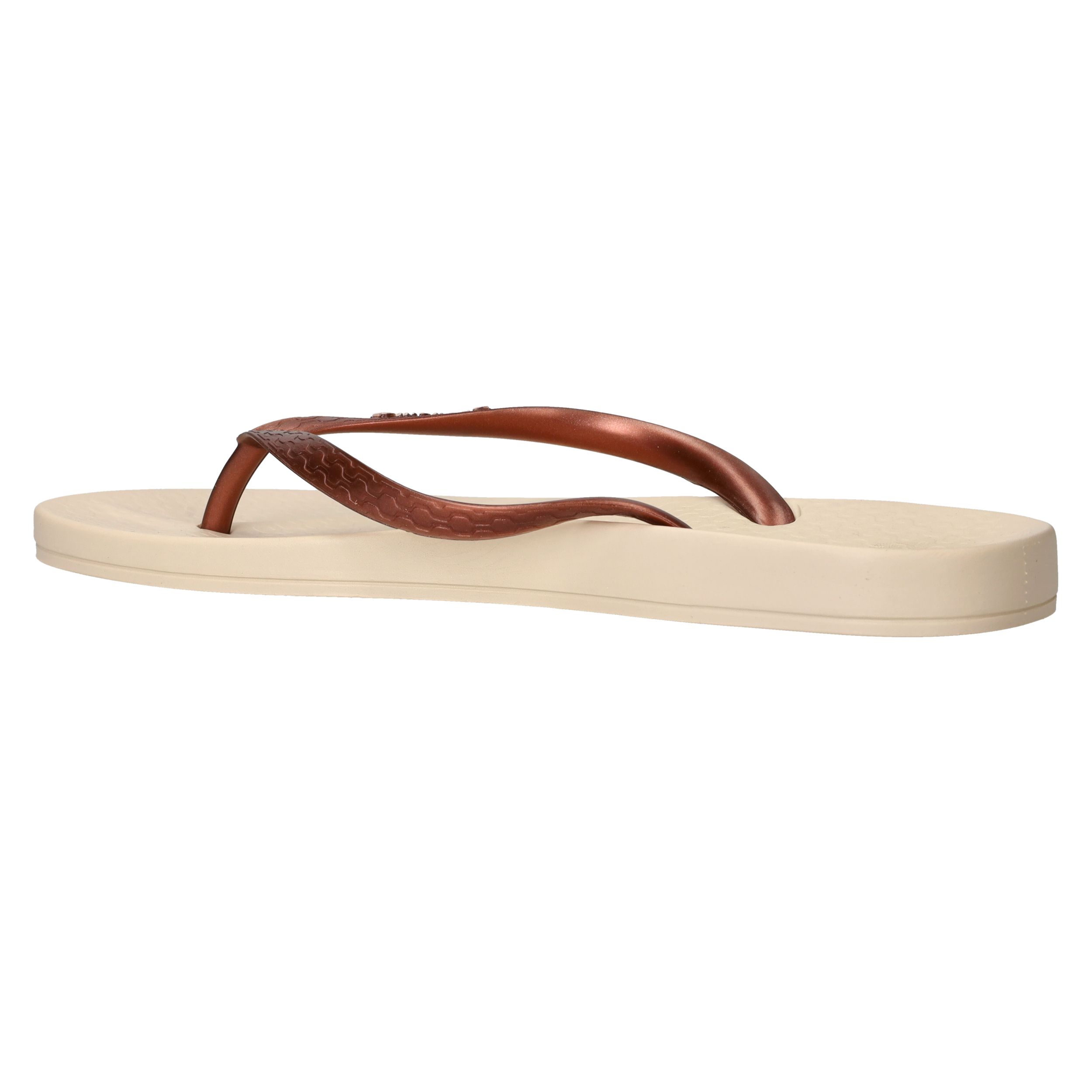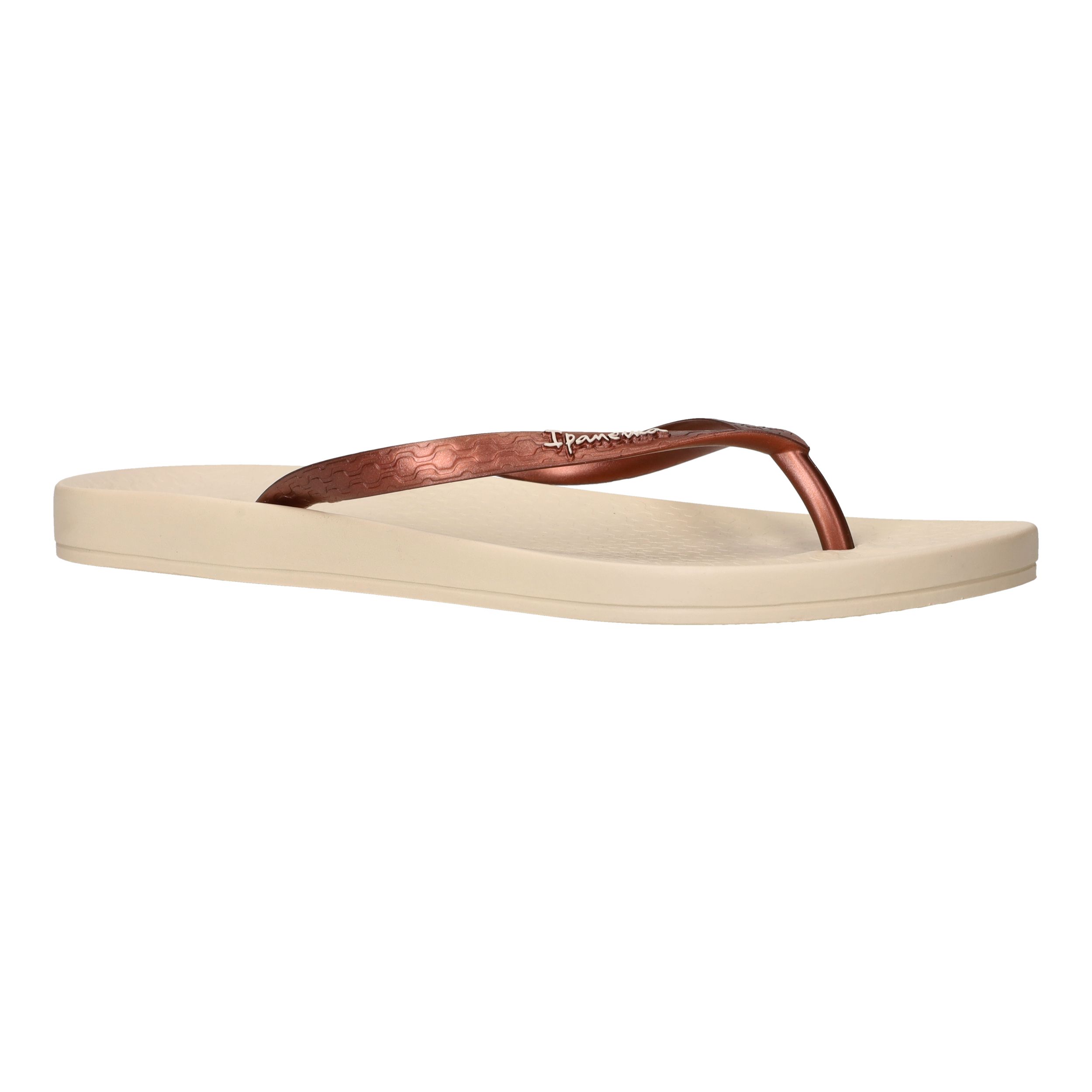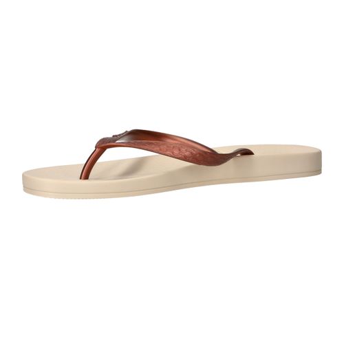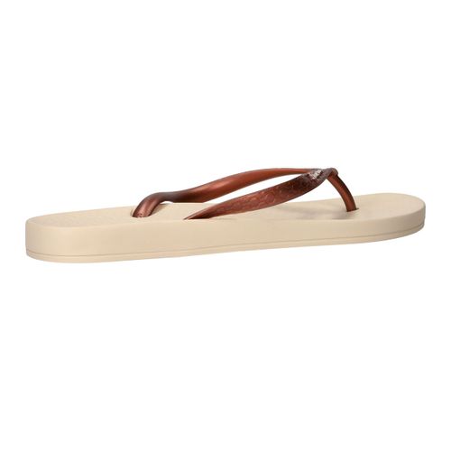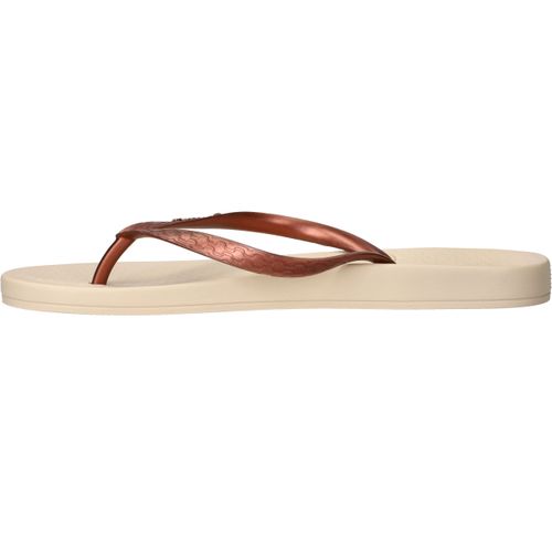 De slippers Ipanema Anatomic Tan in brons met beige zool zijn de perfecte keuze voor dames die comfort willen combineren met een stijlvolle uitstraling. Deze Ipanema slippers voelen licht aan en bieden dankzij het anatomisch gevormde voetbed ondersteuning waar je voeten blij van worden. Het bronzen bandje geeft een subtiele glans en past prachtig bij de warme tint van de zool.
