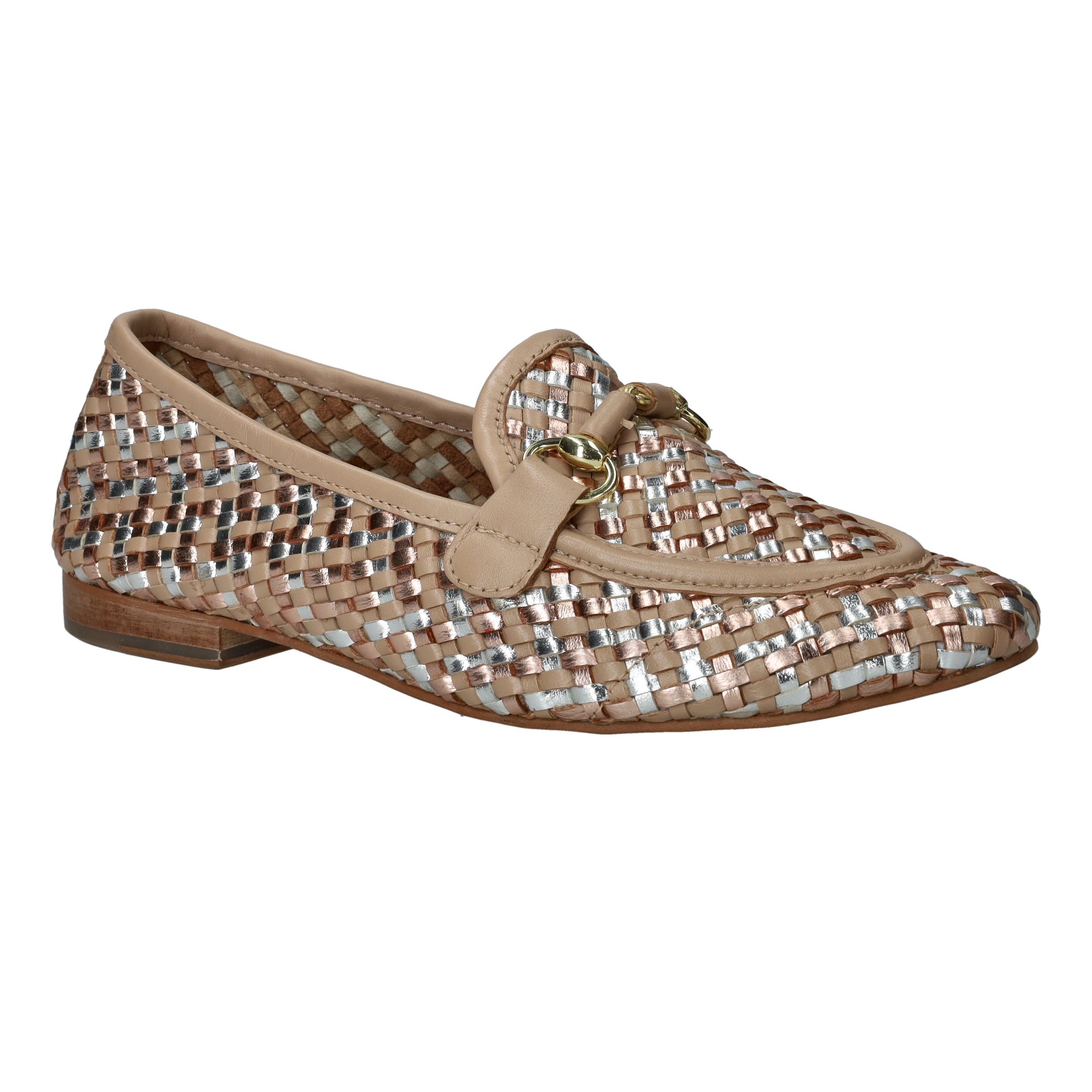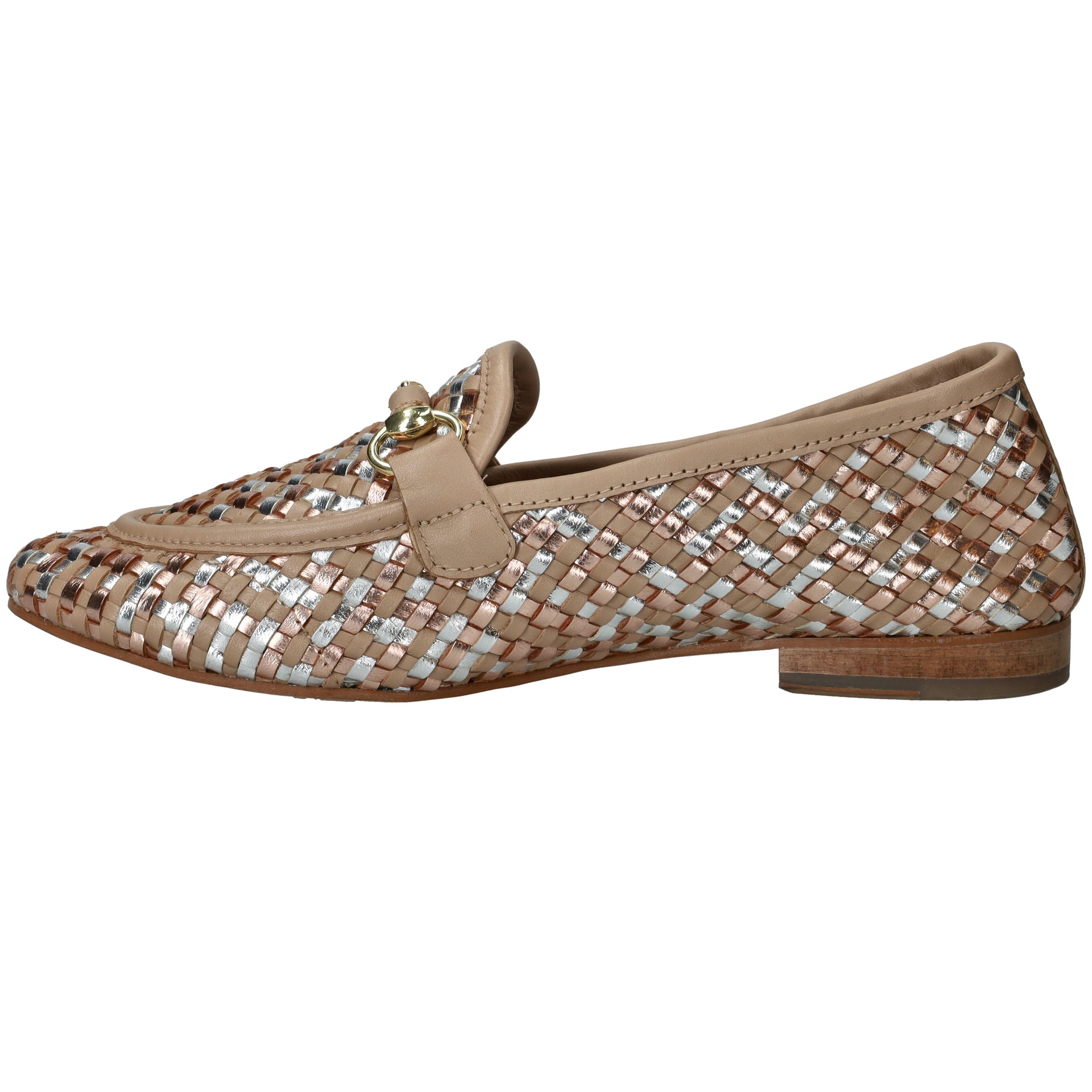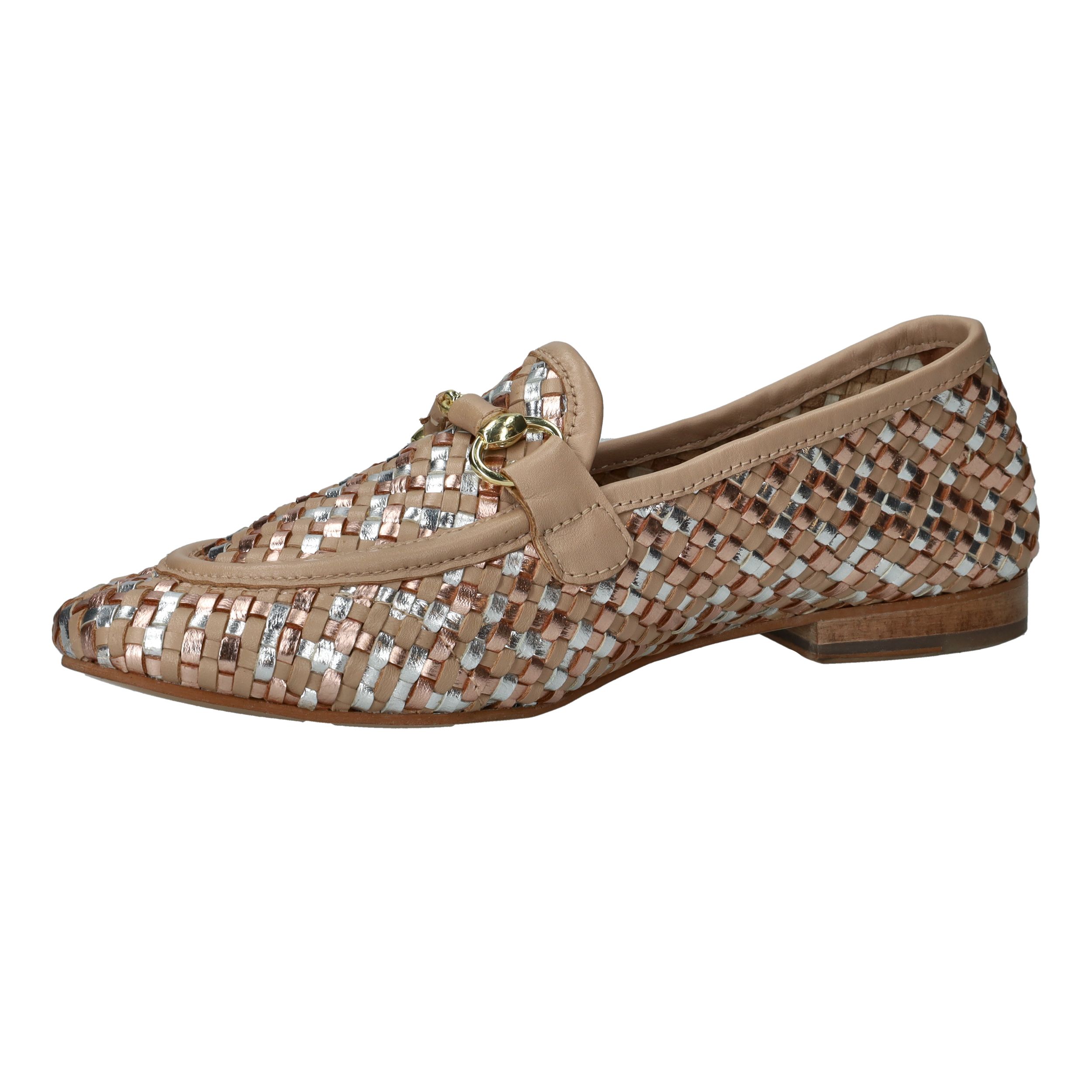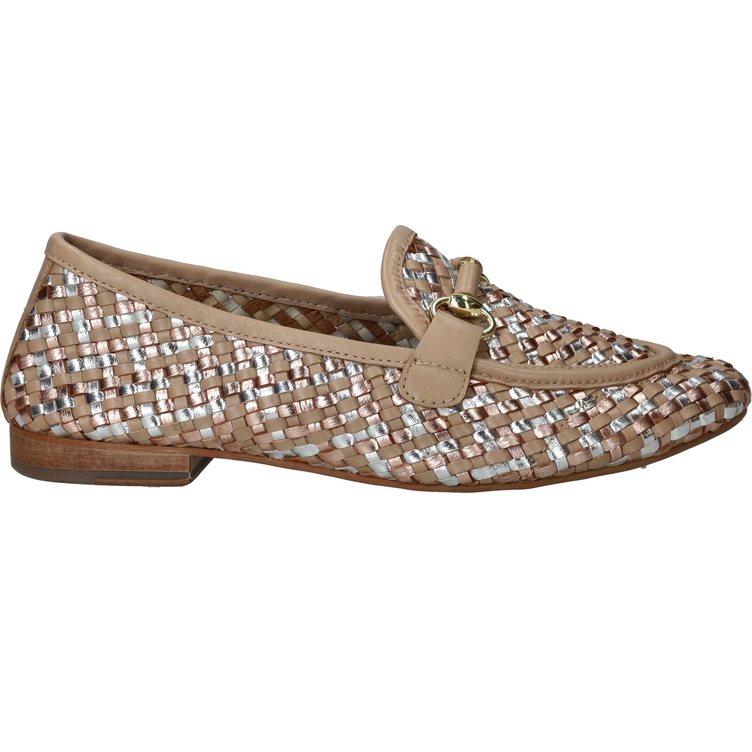 Deze loafers van LOFF1881 zijn een stijlvolle blikvanger voor de lente en zomer. Het gevlochten bovenwerk in beige leer met subtiele metallic accenten geeft je look een chique en frisse uitstraling. De soepele pasvorm zorgt ervoor dat je ze moeiteloos de hele dag draagt. Perfect voor dames met een normale voetbreedte die houden van comfort en elegantie.