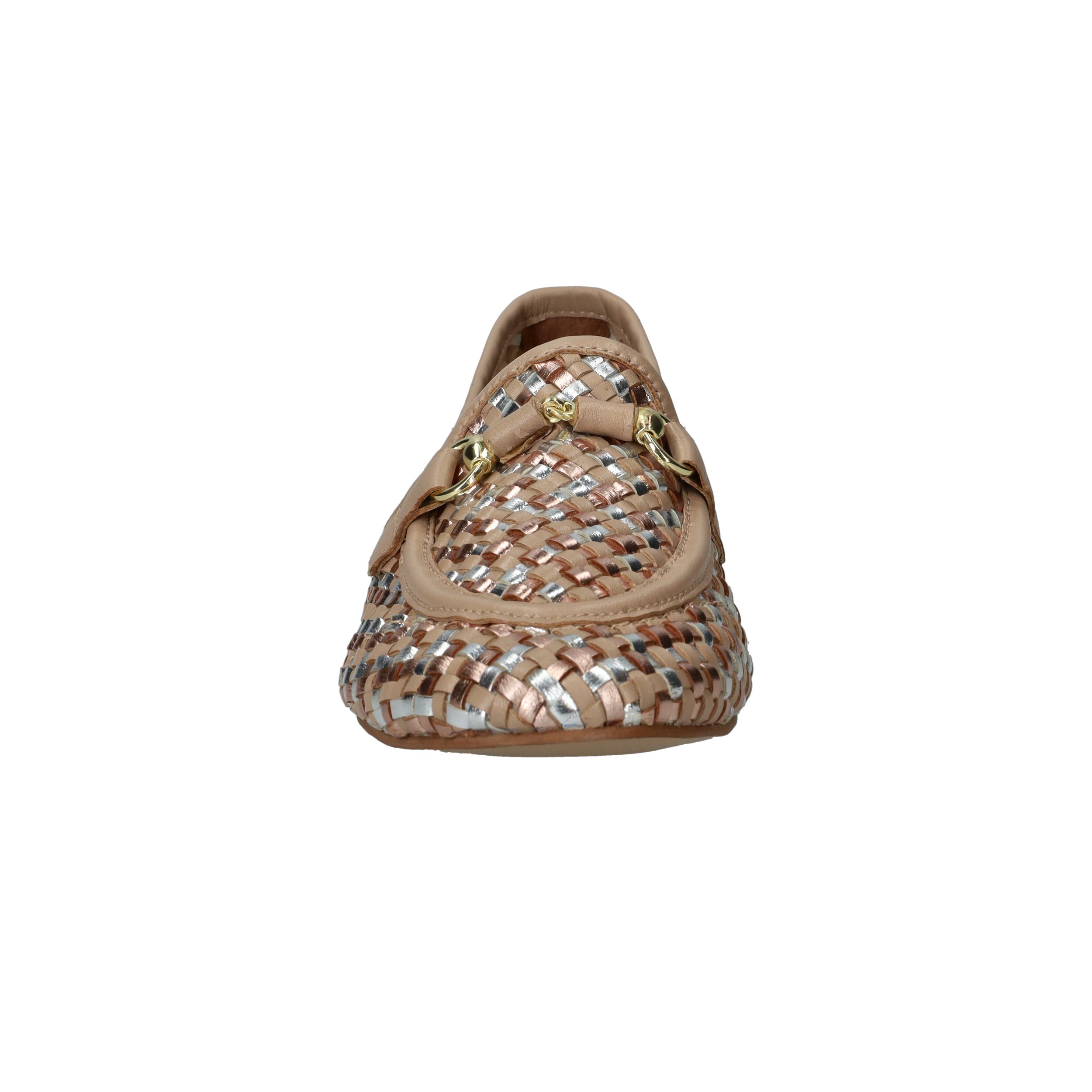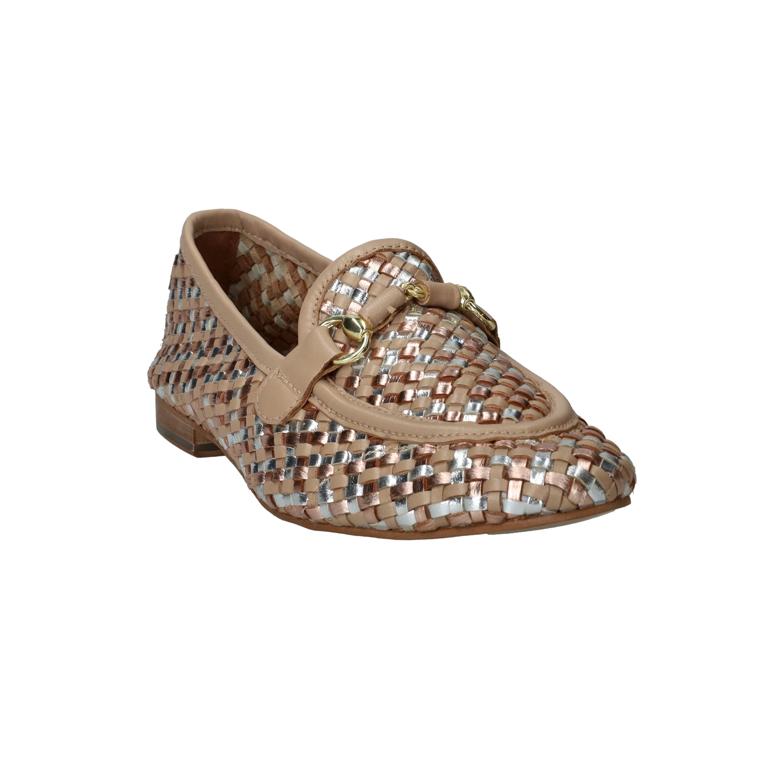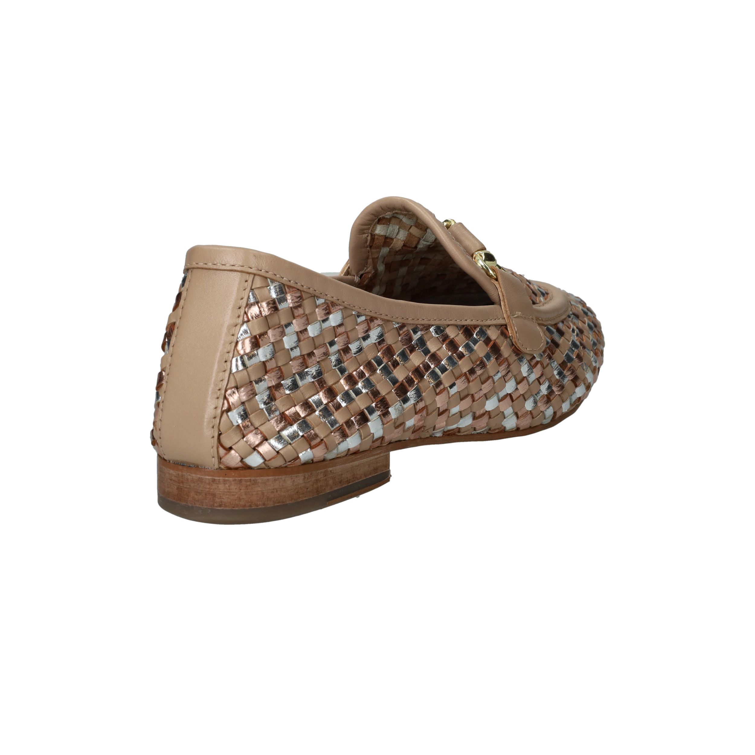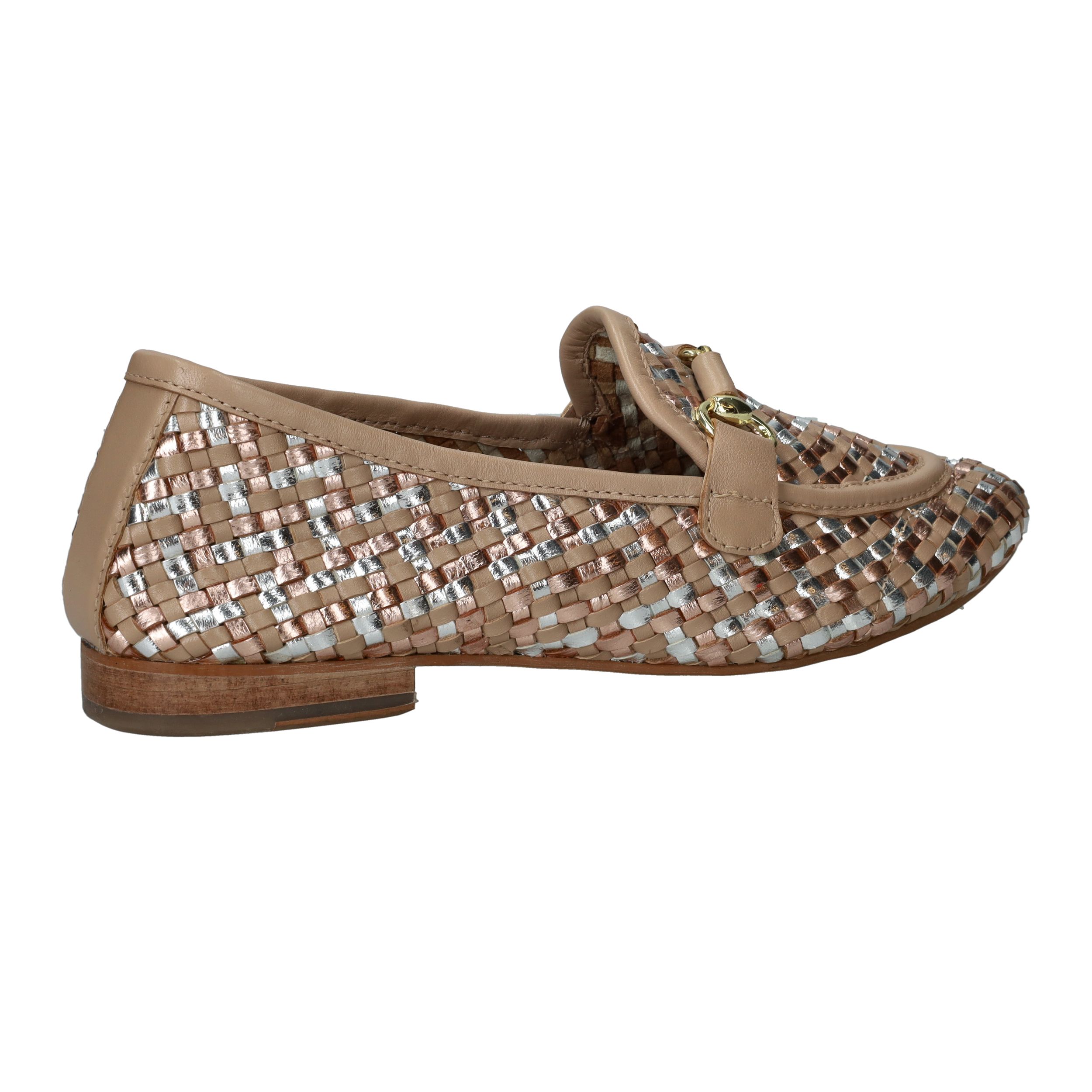 Deze loafers van LOFF1881 zijn een stijlvolle blikvanger voor de lente en zomer. Het gevlochten bovenwerk in beige leer met subtiele metallic accenten geeft je look een chique en frisse uitstraling. De soepele pasvorm zorgt ervoor dat je ze moeiteloos de hele dag draagt. Perfect voor dames met een normale voetbreedte die houden van comfort en elegantie.