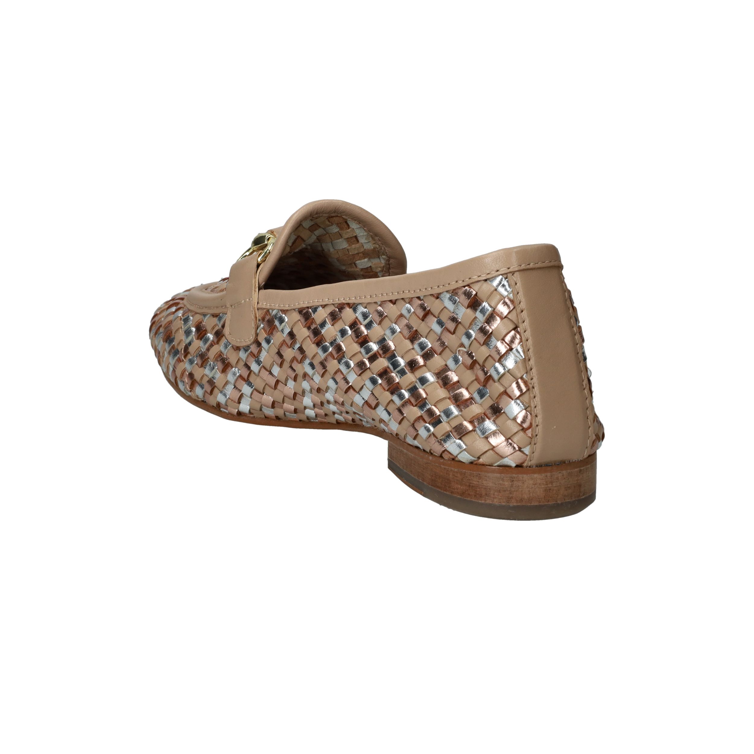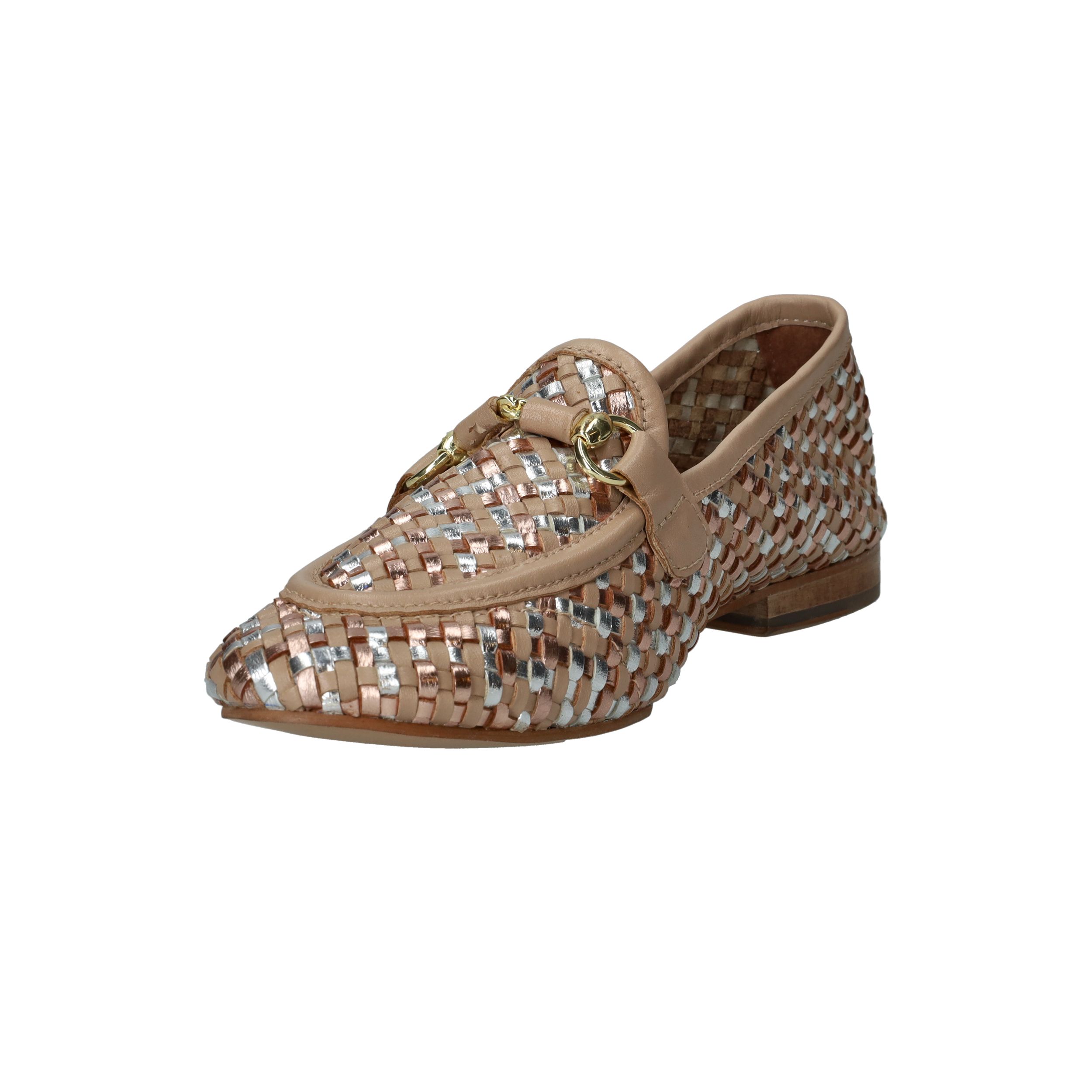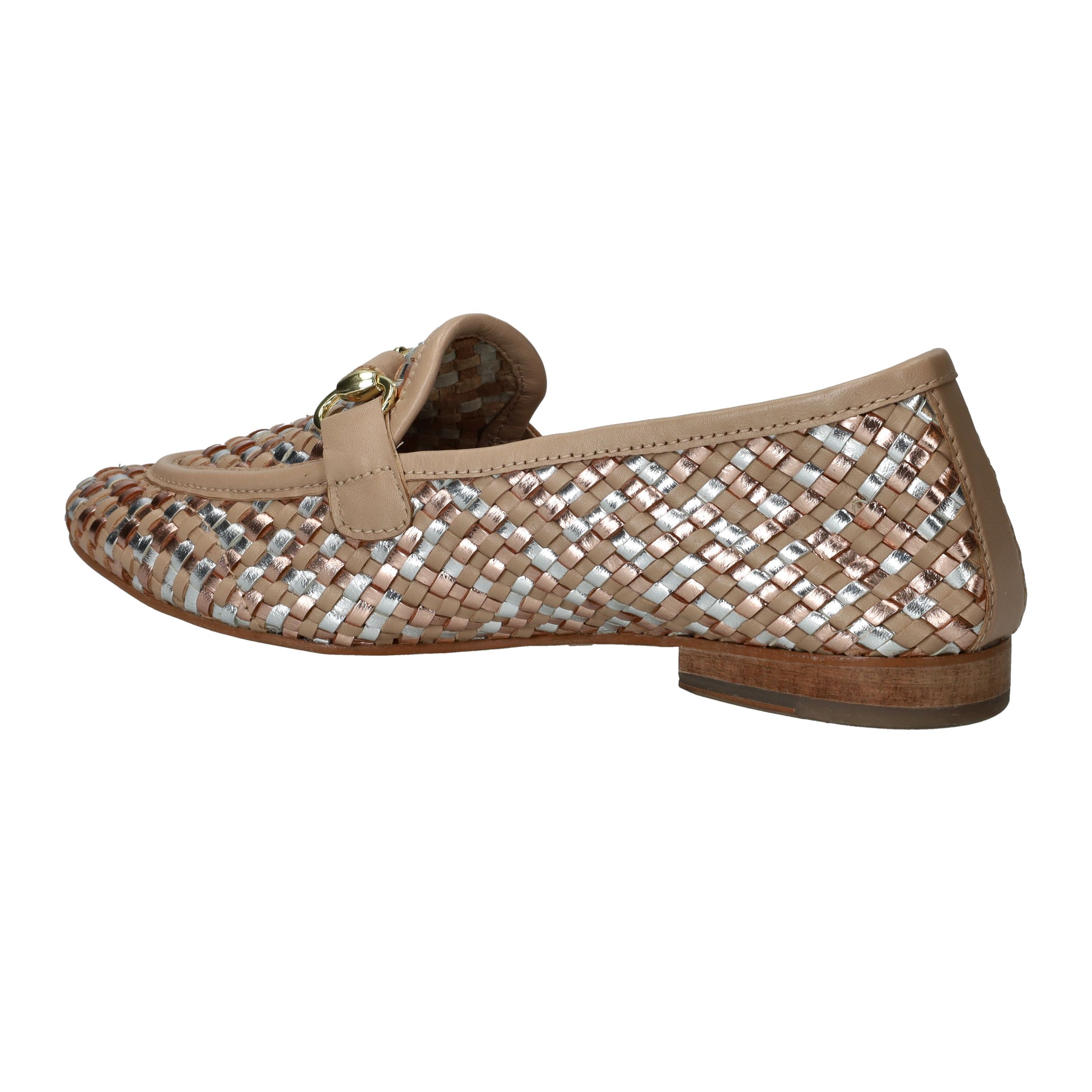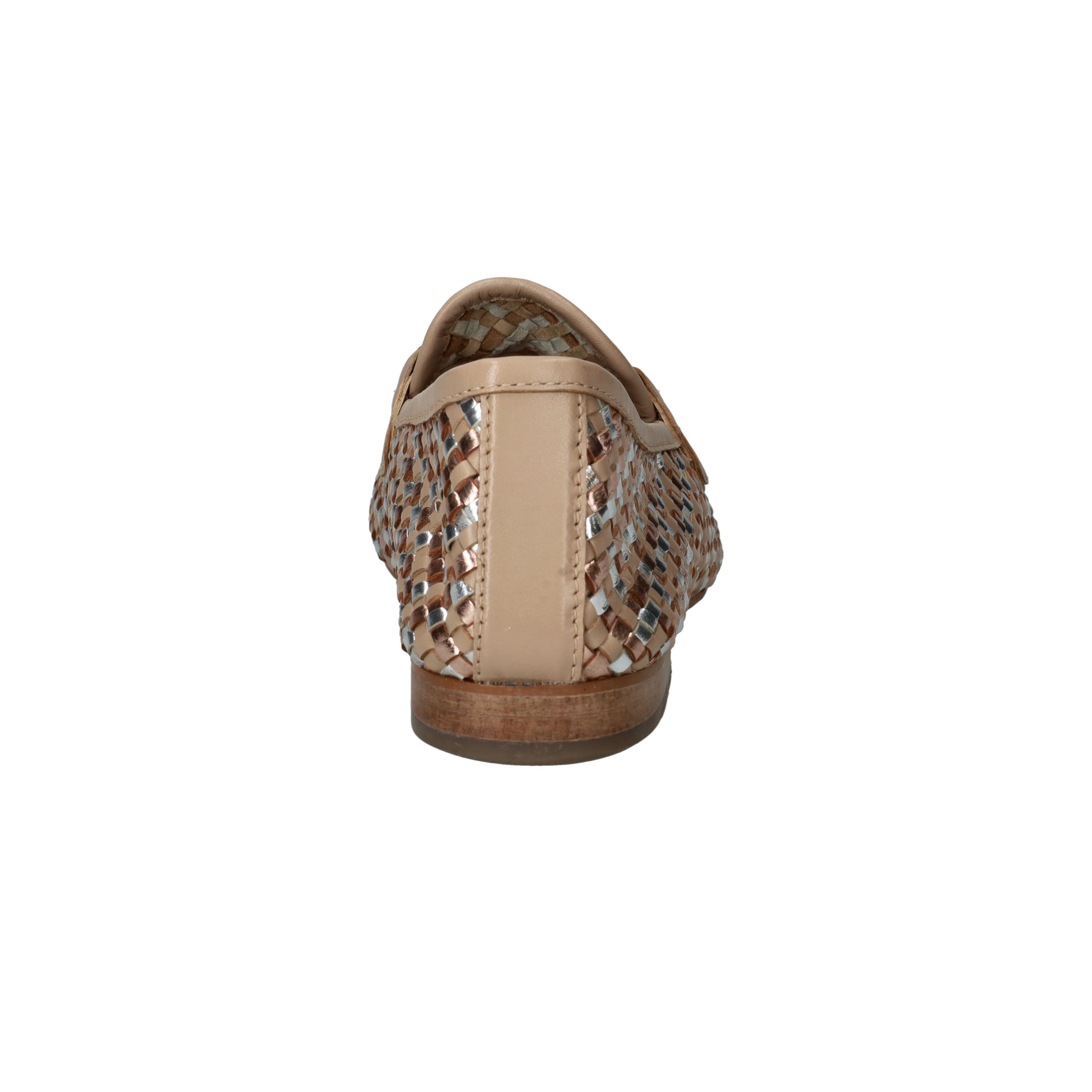 Deze loafers van LOFF1881 zijn een stijlvolle blikvanger voor de lente en zomer. Het gevlochten bovenwerk in beige leer met subtiele metallic accenten geeft je look een chique en frisse uitstraling. De soepele pasvorm zorgt ervoor dat je ze moeiteloos de hele dag draagt. Perfect voor dames met een normale voetbreedte die houden van comfort en elegantie.