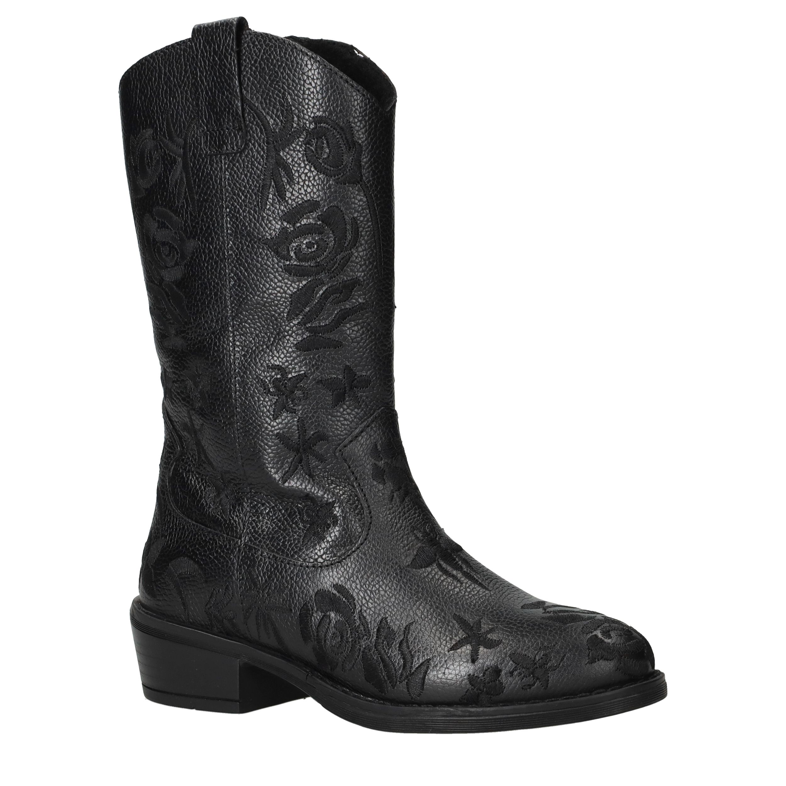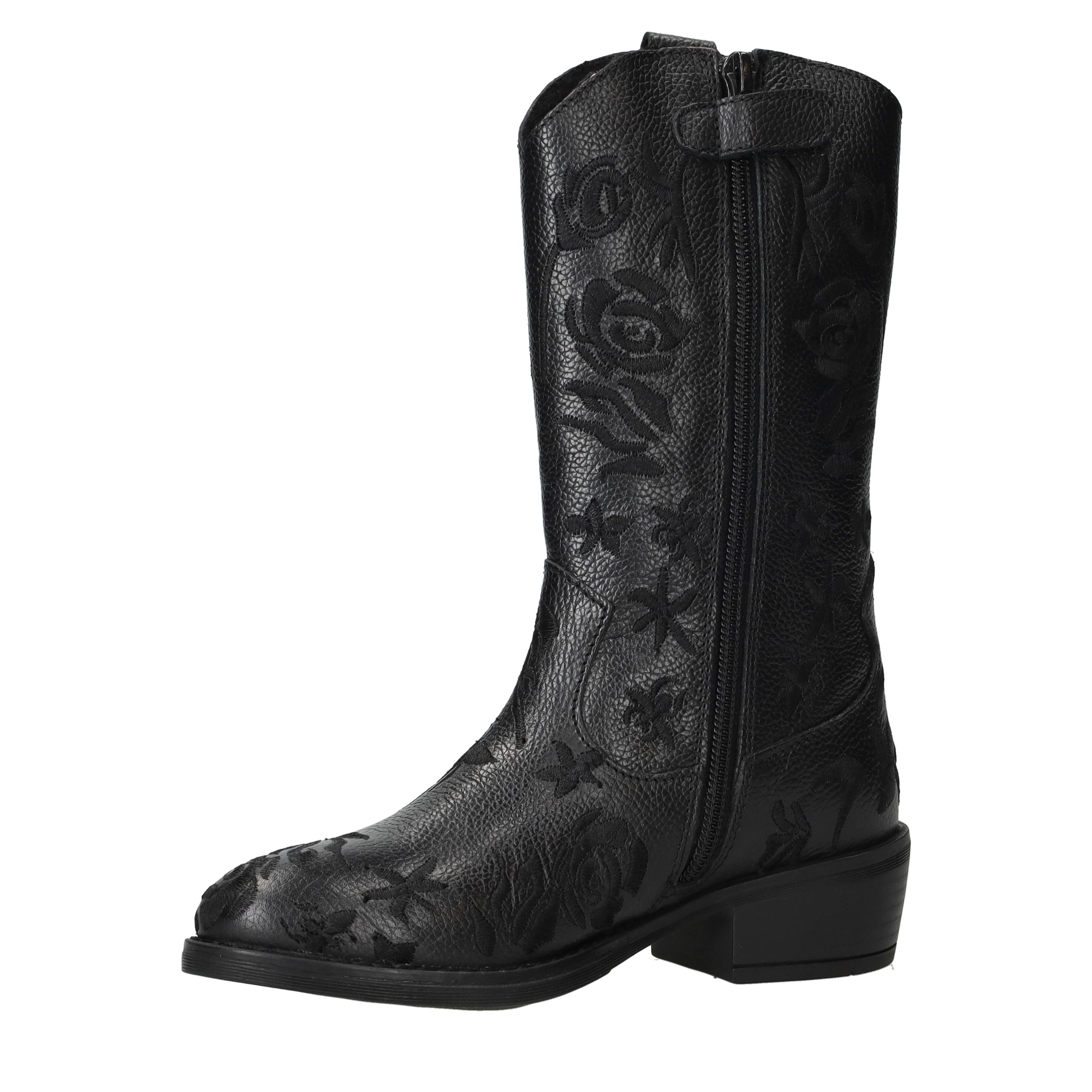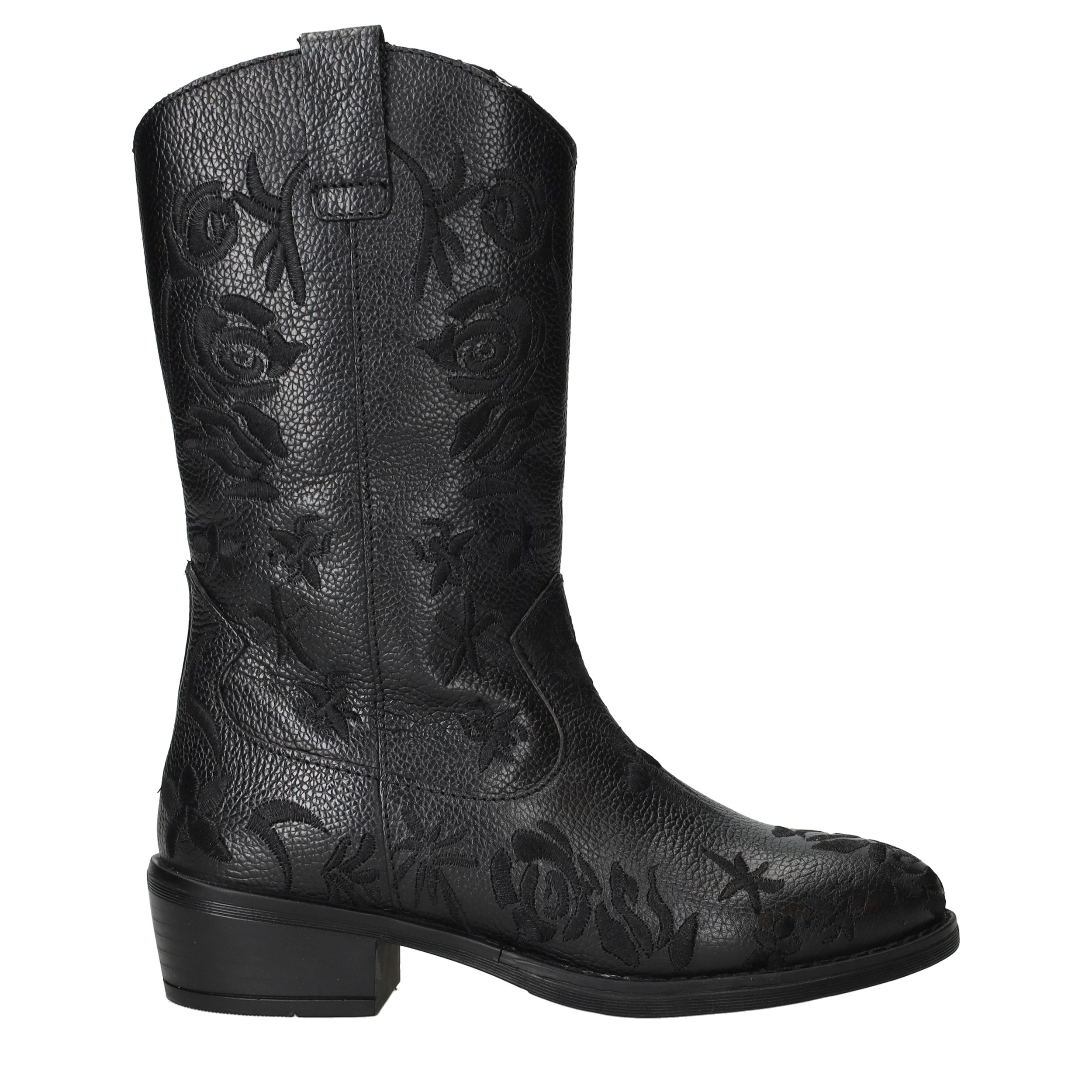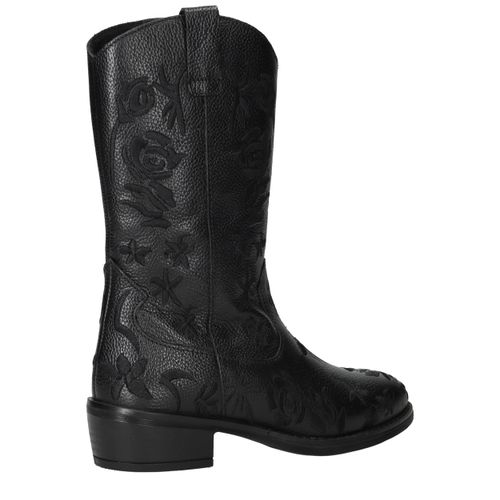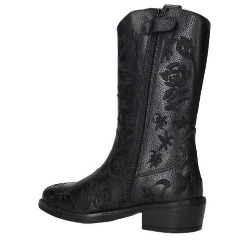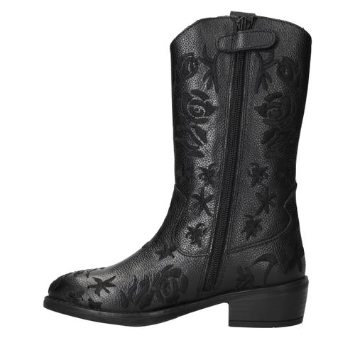 Deze stoere zwarte laarzen van Loff1881 zijn een echte eyecatcher voor meiden met stijl. Het leer is prachtig afgewerkt met bloemenmotief en de stevige hak zorgt voor een trendy westernlook. Dankzij het uitneembare voetbed zijn ze niet alleen mooi, maar ook supercomfortabel. Perfect voor school, feestjes of gewoon elke dag!