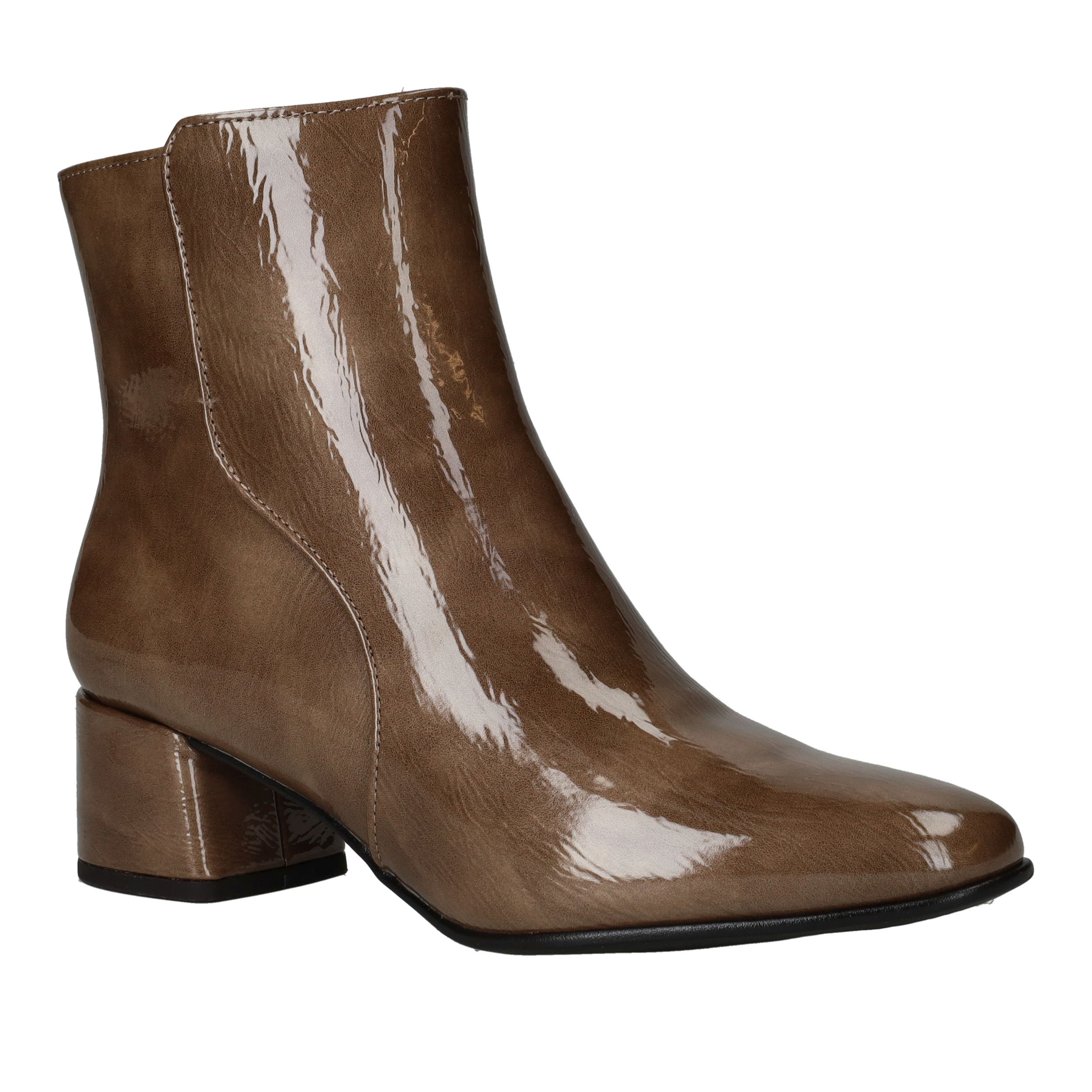 - Het kunstleer met subtiele glans geeft dit taupe enkellaarsje een moderne, vrouwelijke uitstraling.