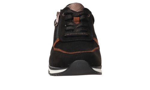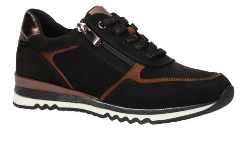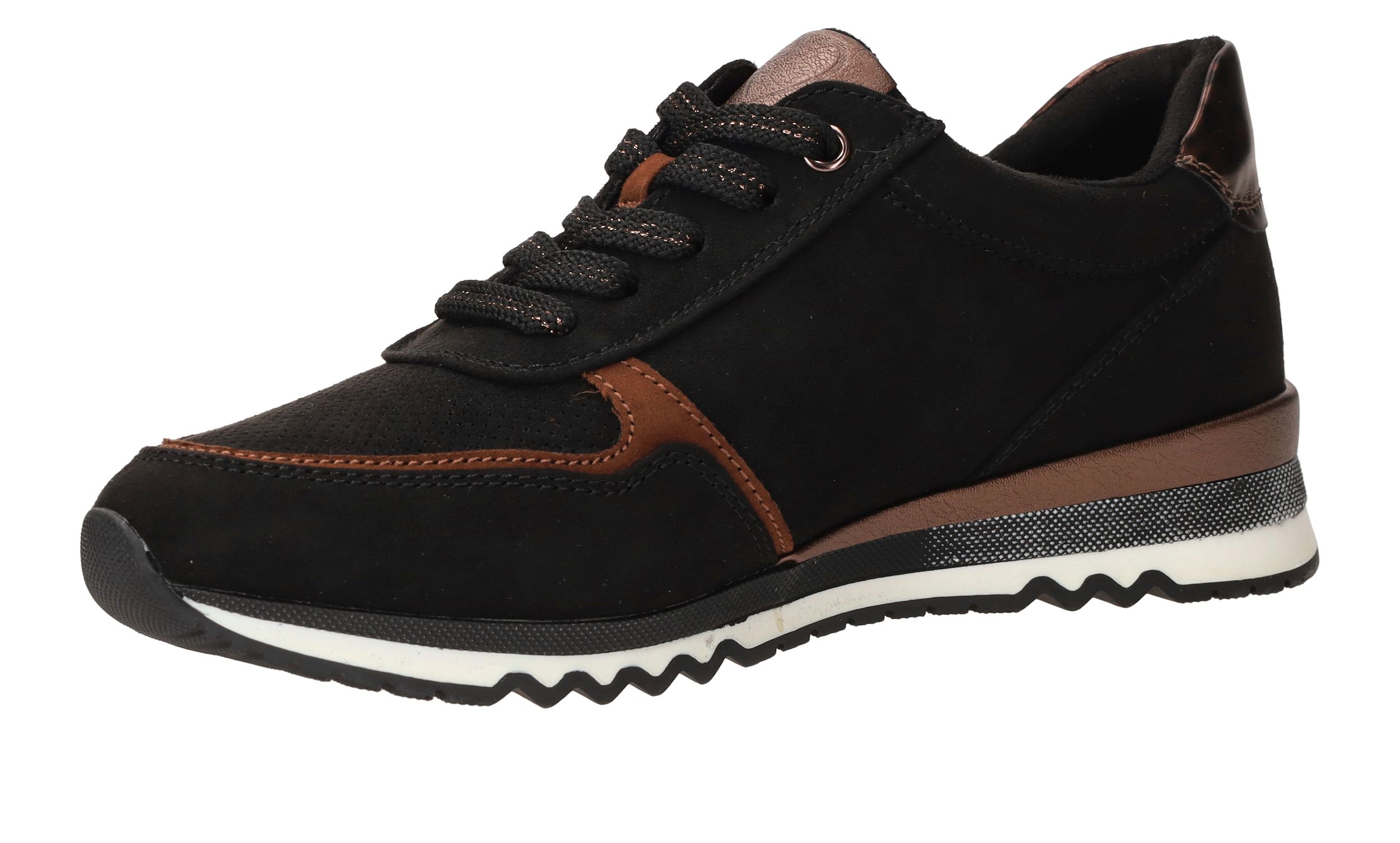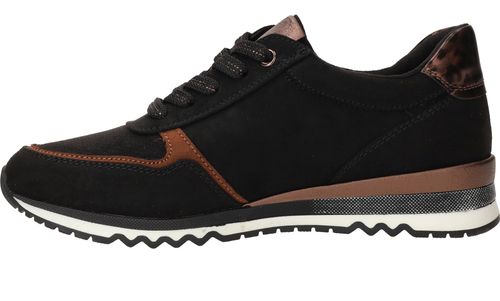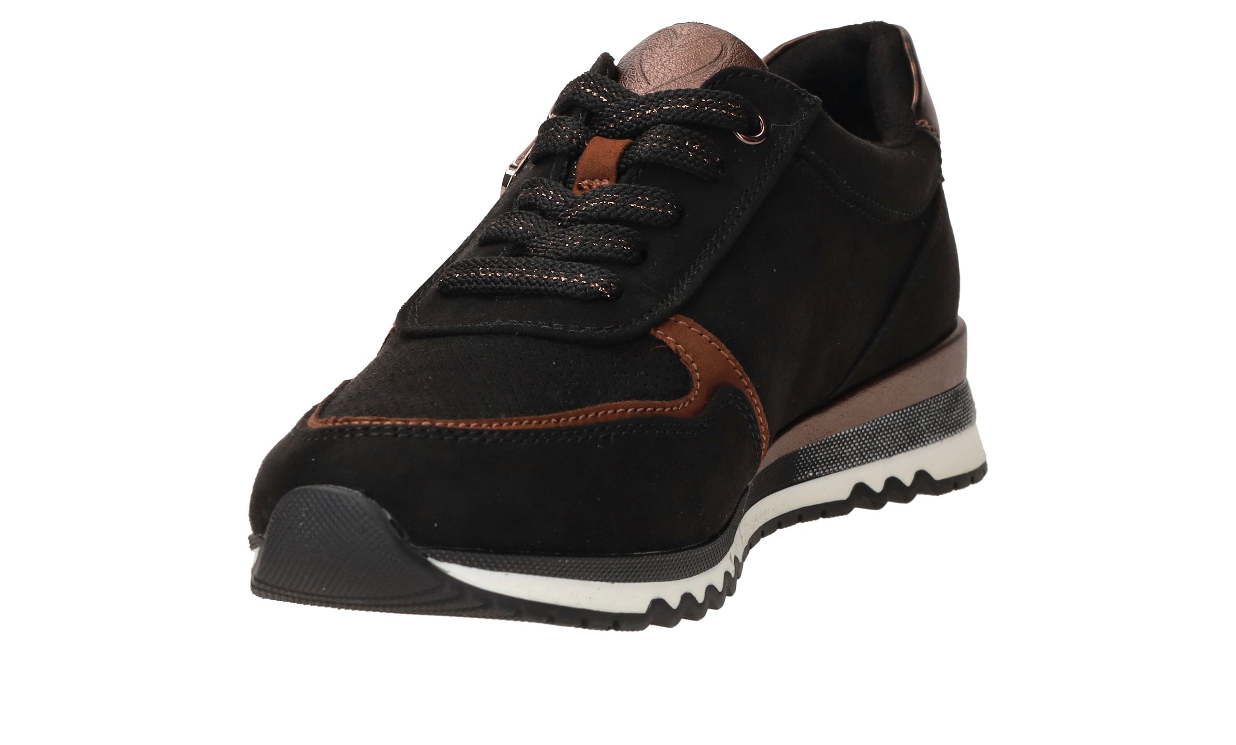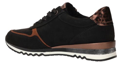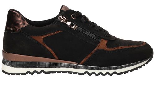Deze prachtig zwarte Marco Tozzi sneaker voor dames past bij elke outfit! De sneaker is gemaakt van zachte suedine en is afgewerkt met mooie cognac details.