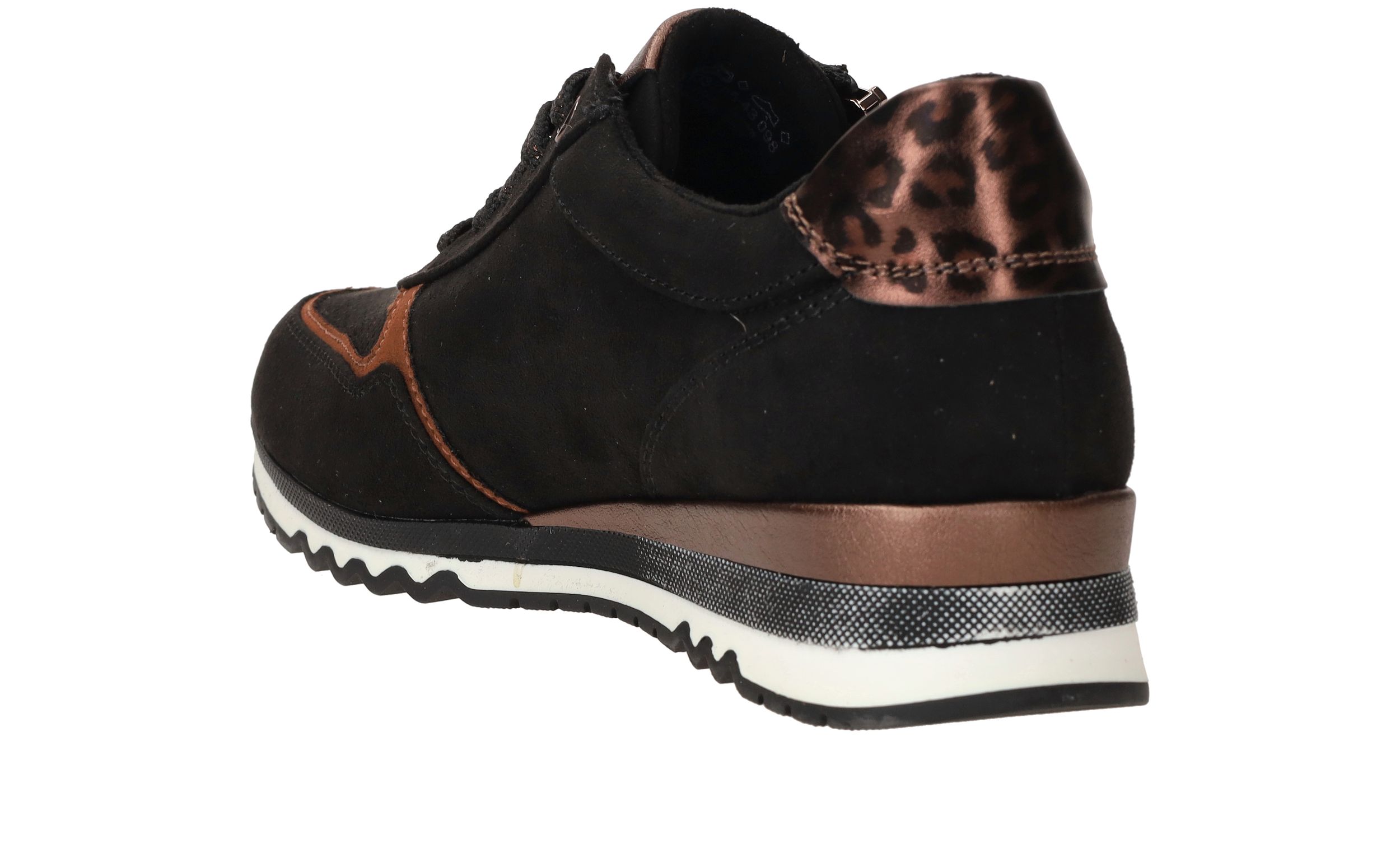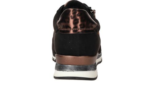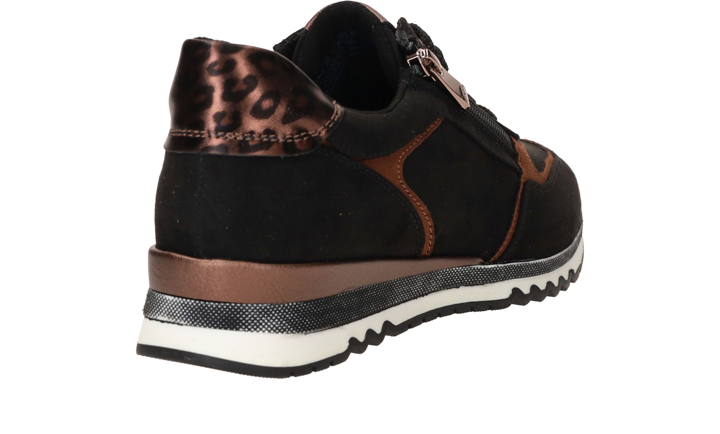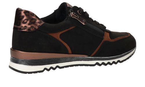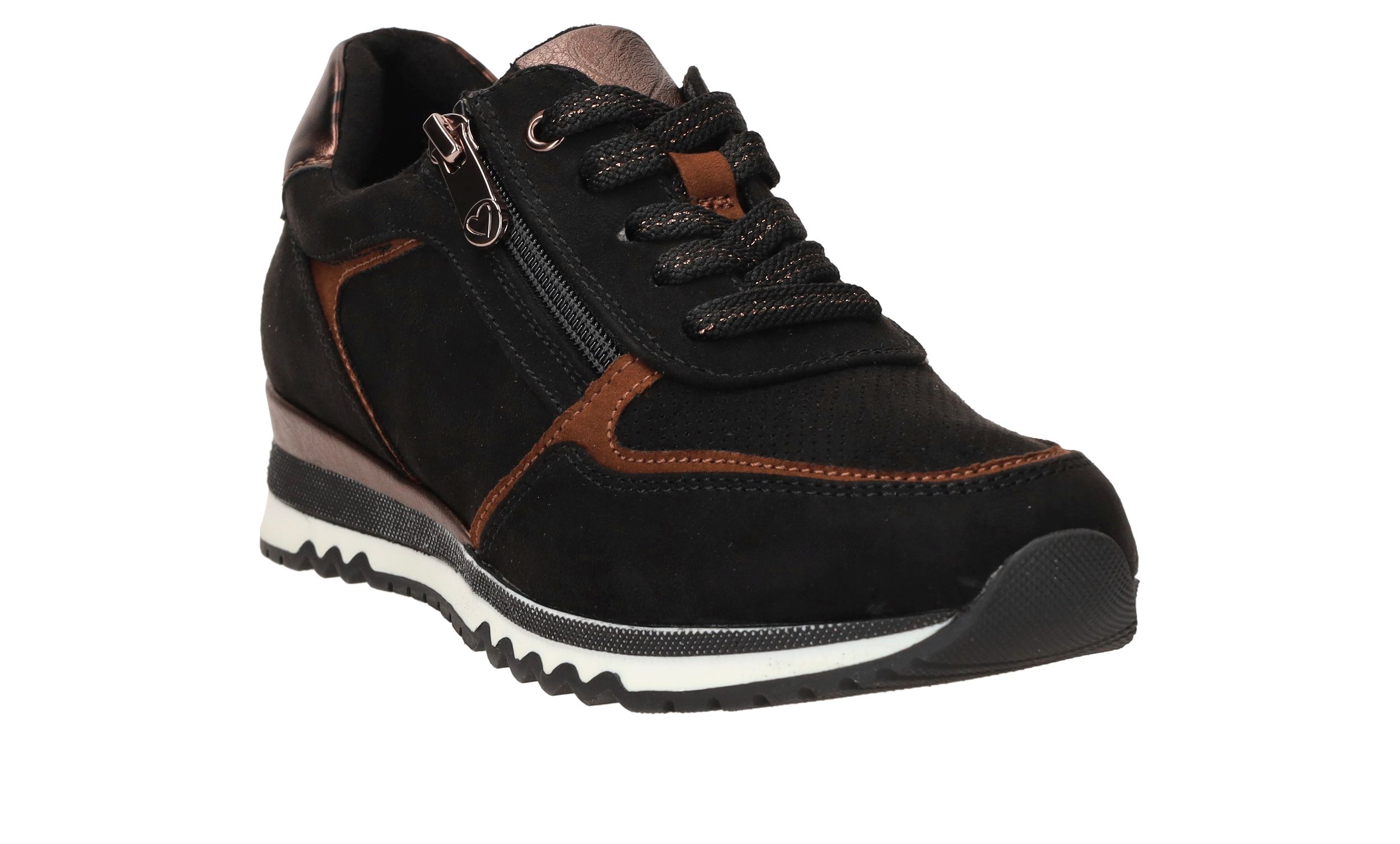 Deze prachtig zwarte Marco Tozzi sneaker voor dames past bij elke outfit! De sneaker is gemaakt van zachte suedine en is afgewerkt met mooie cognac details.