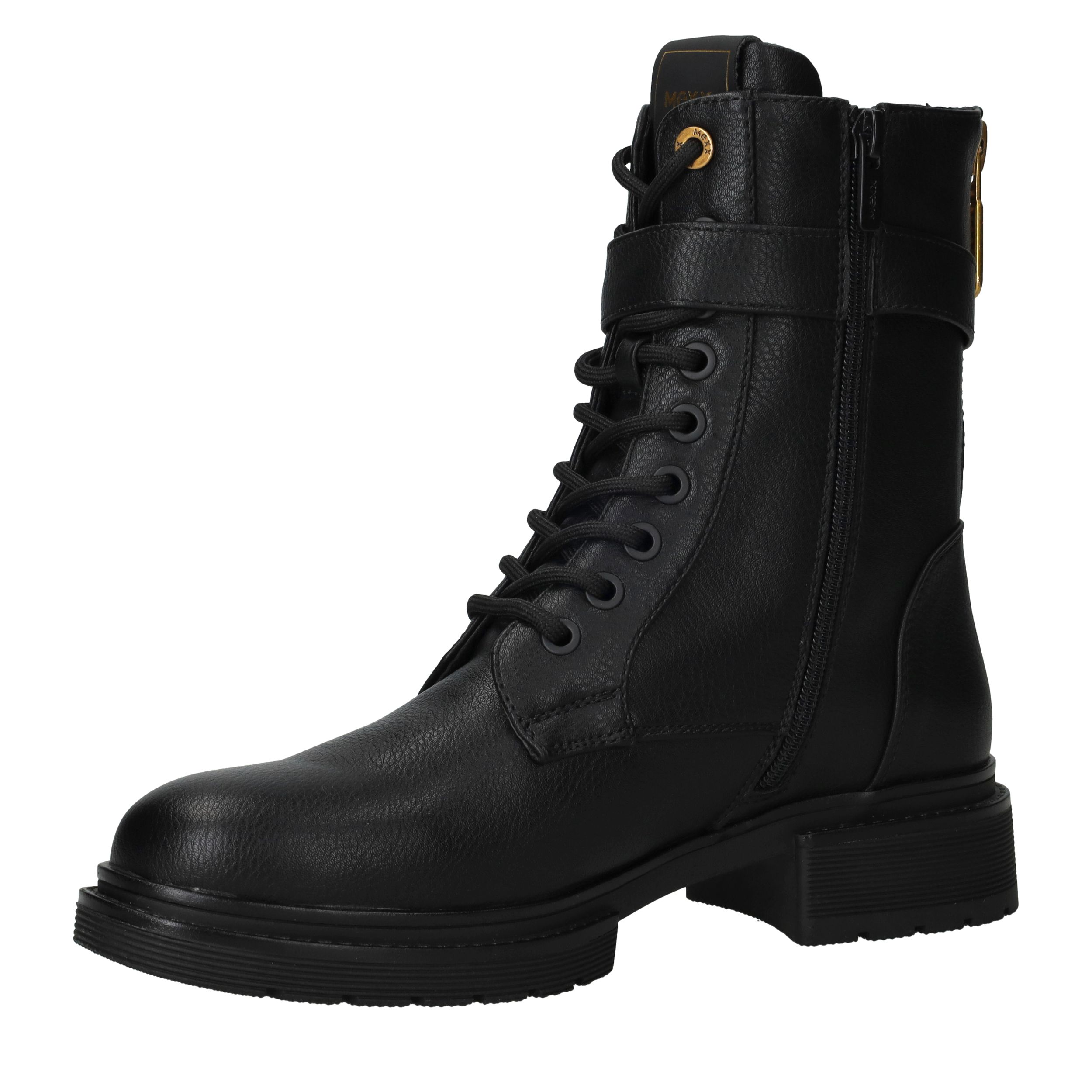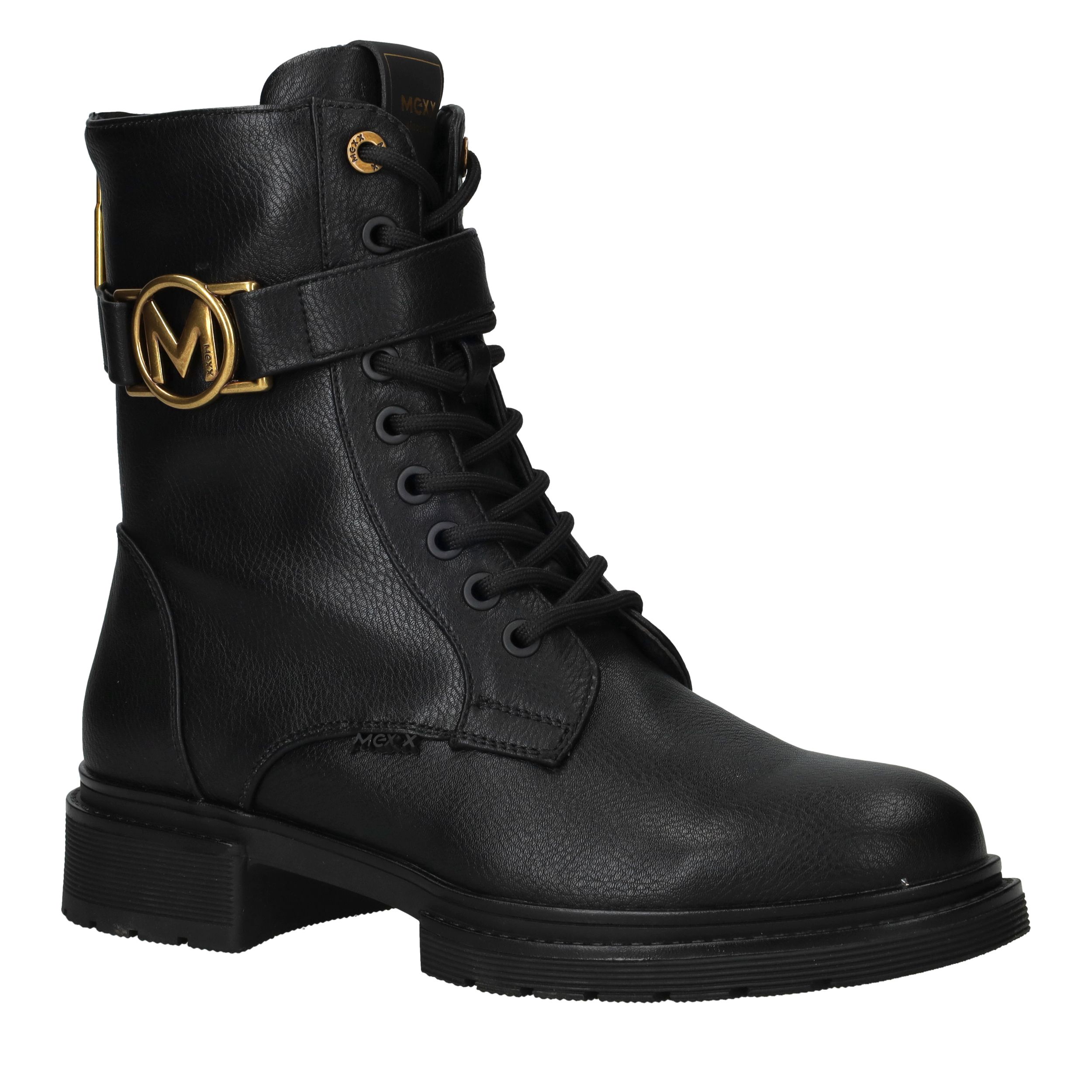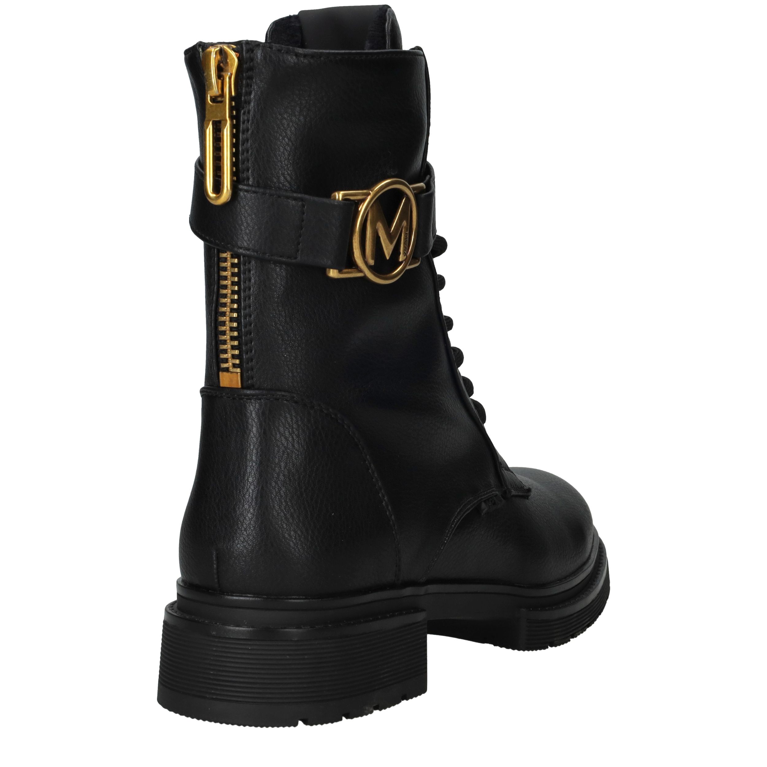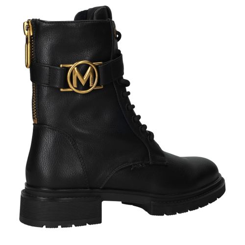 - Belangrijke kenmerken zijn het gouden M-embleem, de stevige profielzool en de ritssluiting aan de achterkant.
