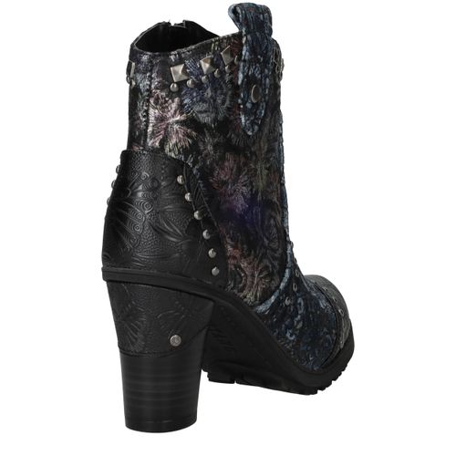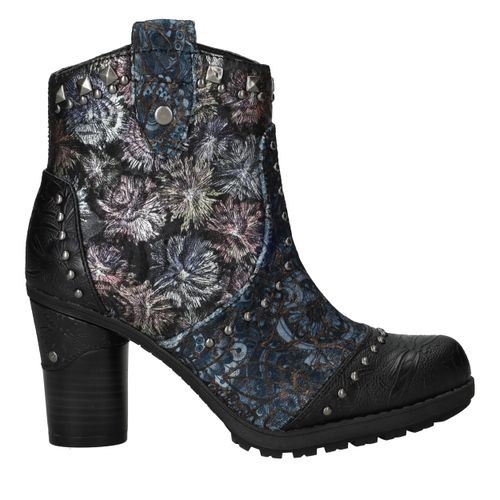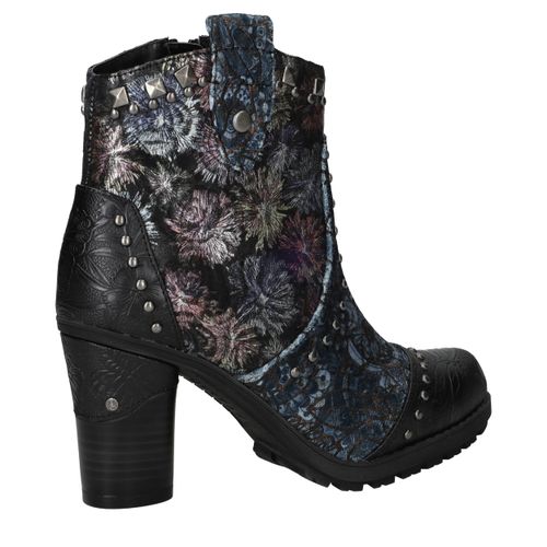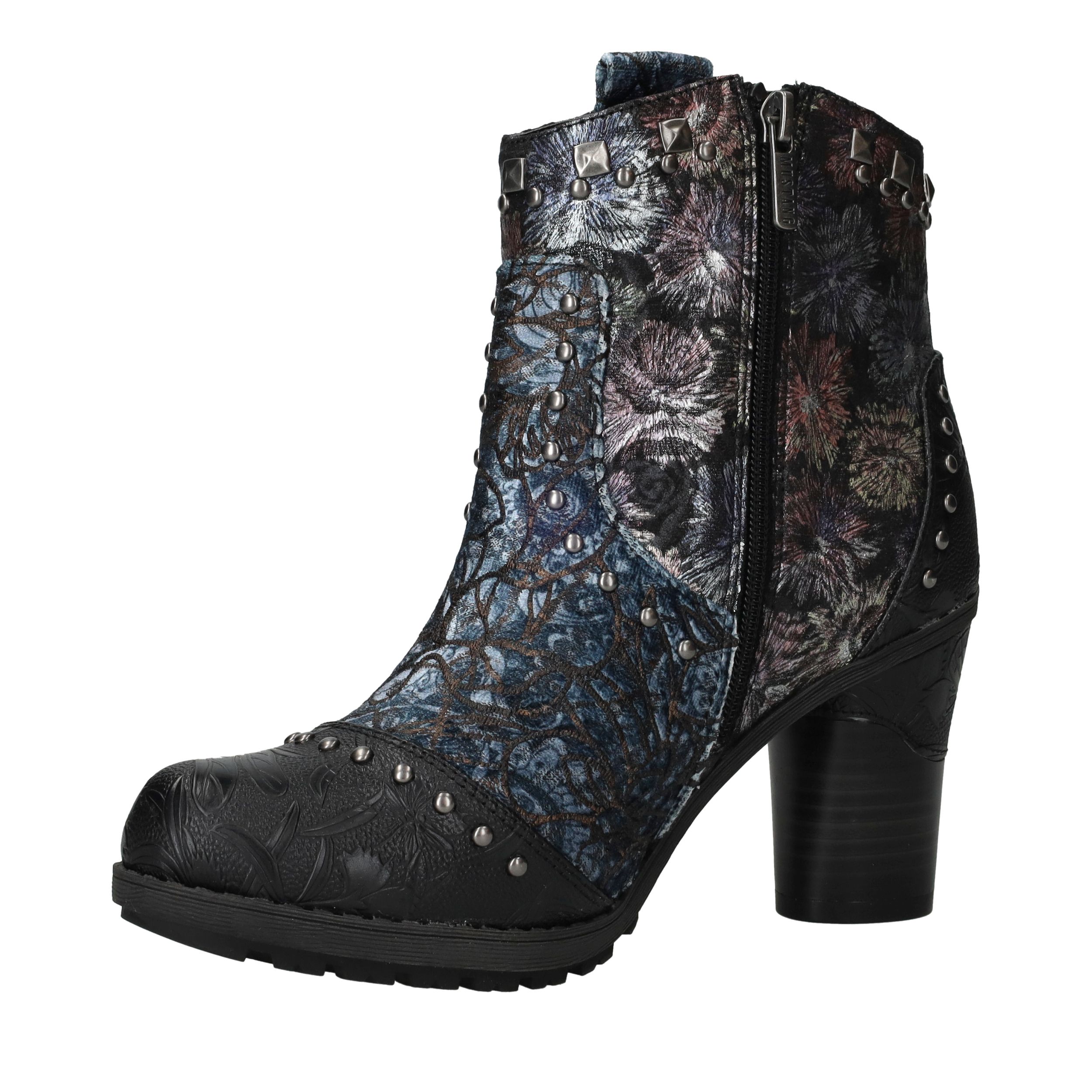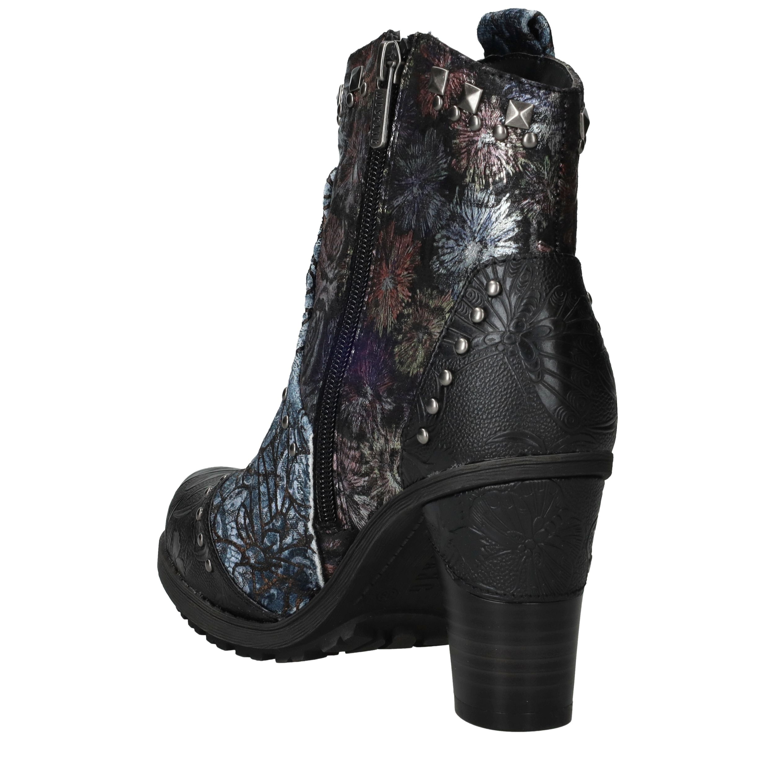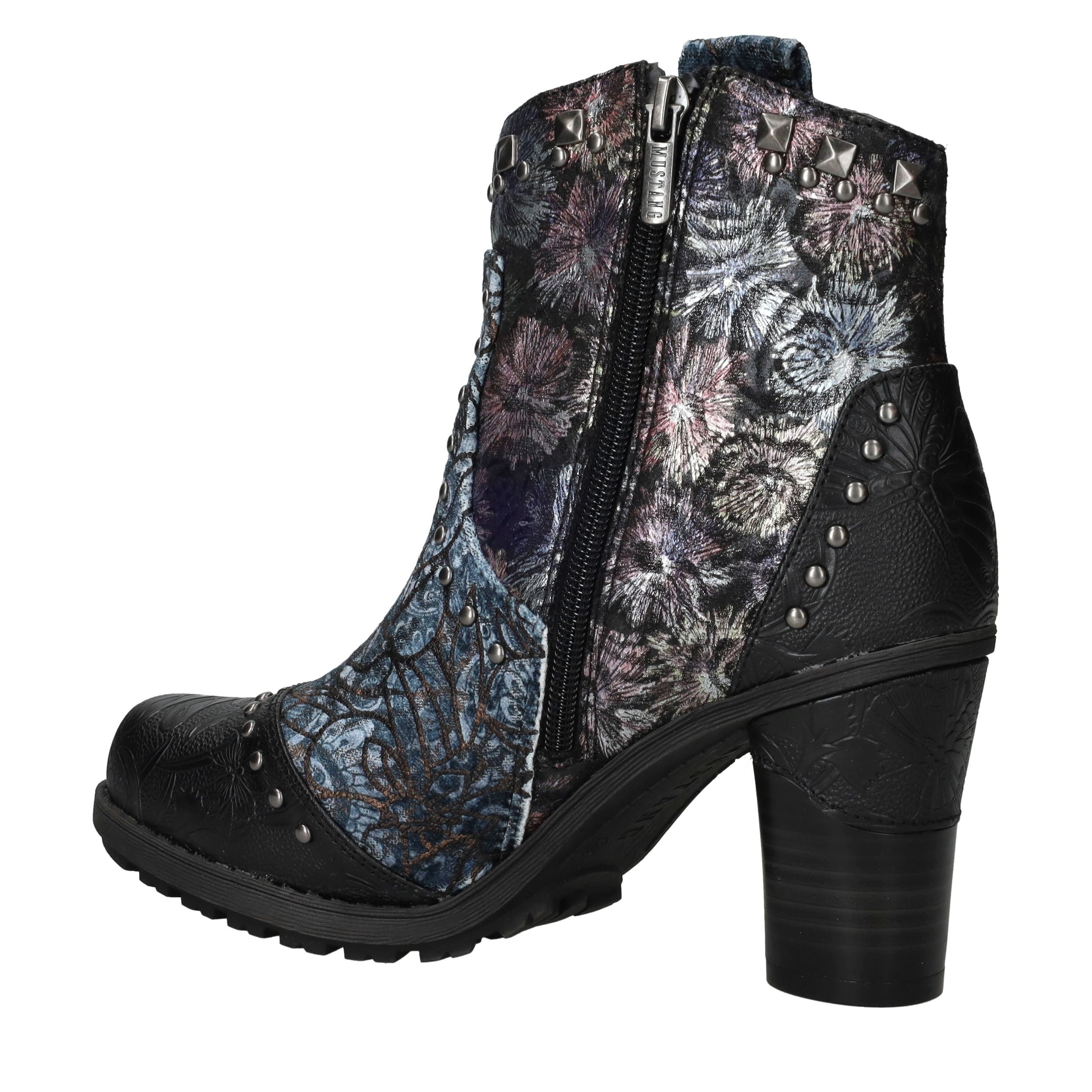 Deze unieke Mustang enkellaarsjes zijn een echte eyecatcher. Het gebruik van kunstleer en textiel geeft de laarsjes een bijzondere uitstraling met veel diepte en detail. De donkergekleurde bloemenprint gecombineerd met stoere studs en een stevige hak maakt ze perfect voor modebewuste dames. Dankzij de comfortabele voetbreedte G geniet je bovendien van een prettige pasvorm.