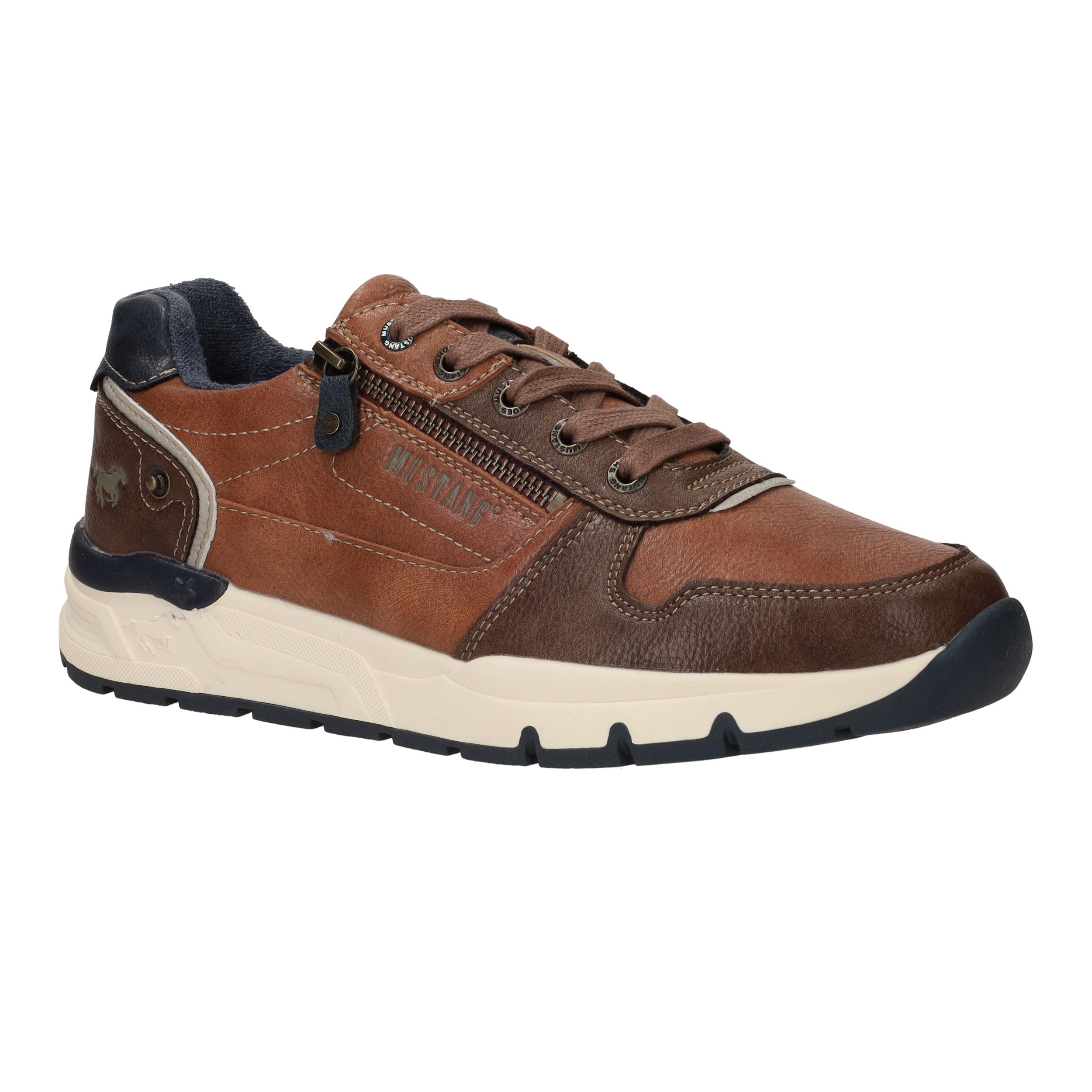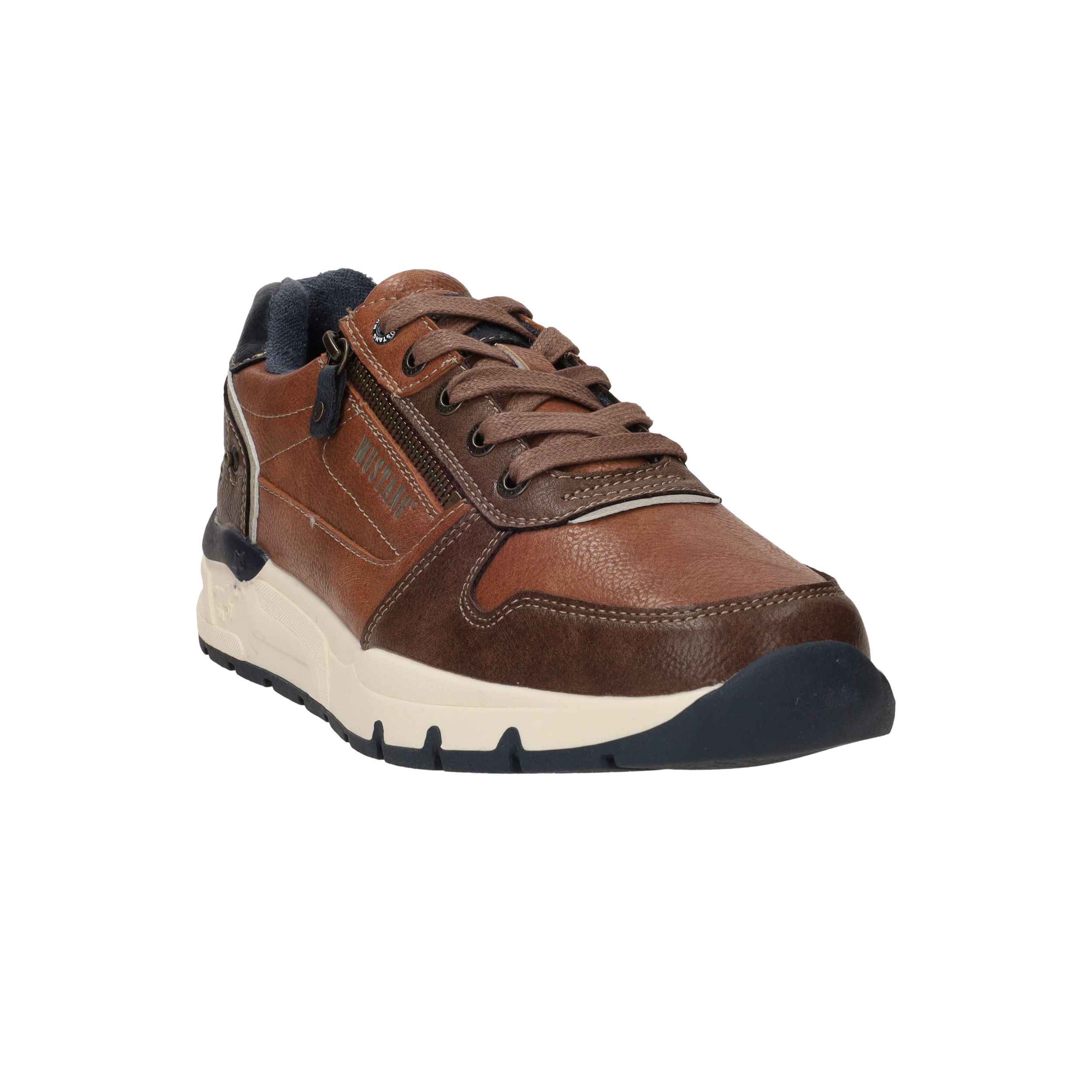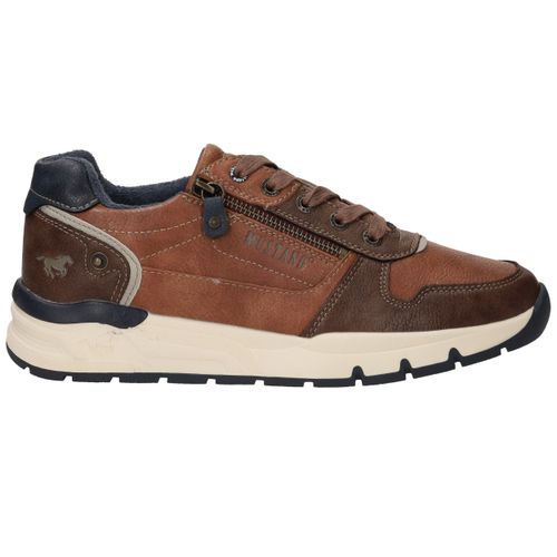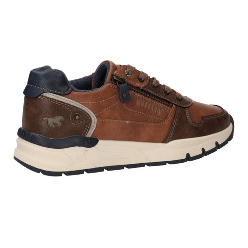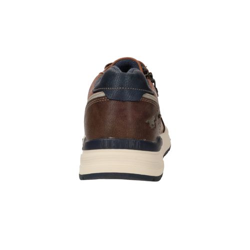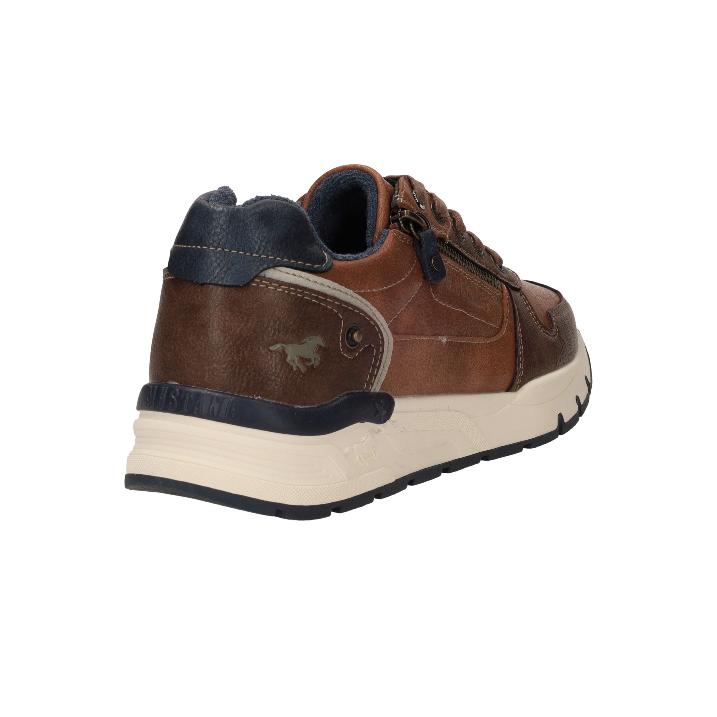 Deze sportieve Mustang sneakers in bruin kunstleer combineren stijl met comfort. De donkerblauwe accenten en de stevige witte zool geven de schoenen een moderne uitstraling. Dankzij de comfortabele voetbreedte G zitten ze perfect, ook bij dagelijks gebruik. Ideaal voor heren die houden van een casual maar verzorgde look.