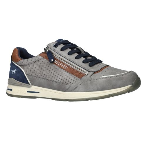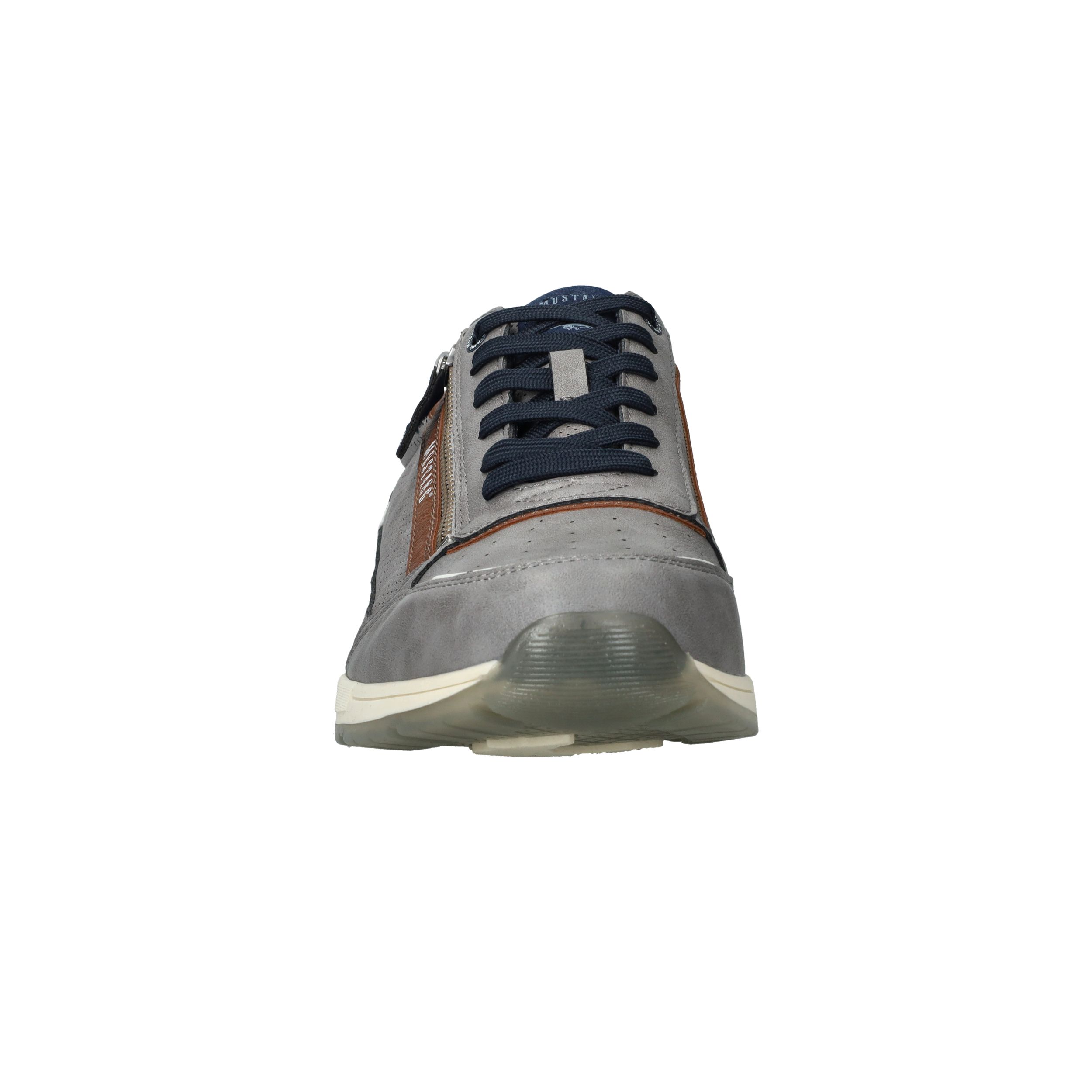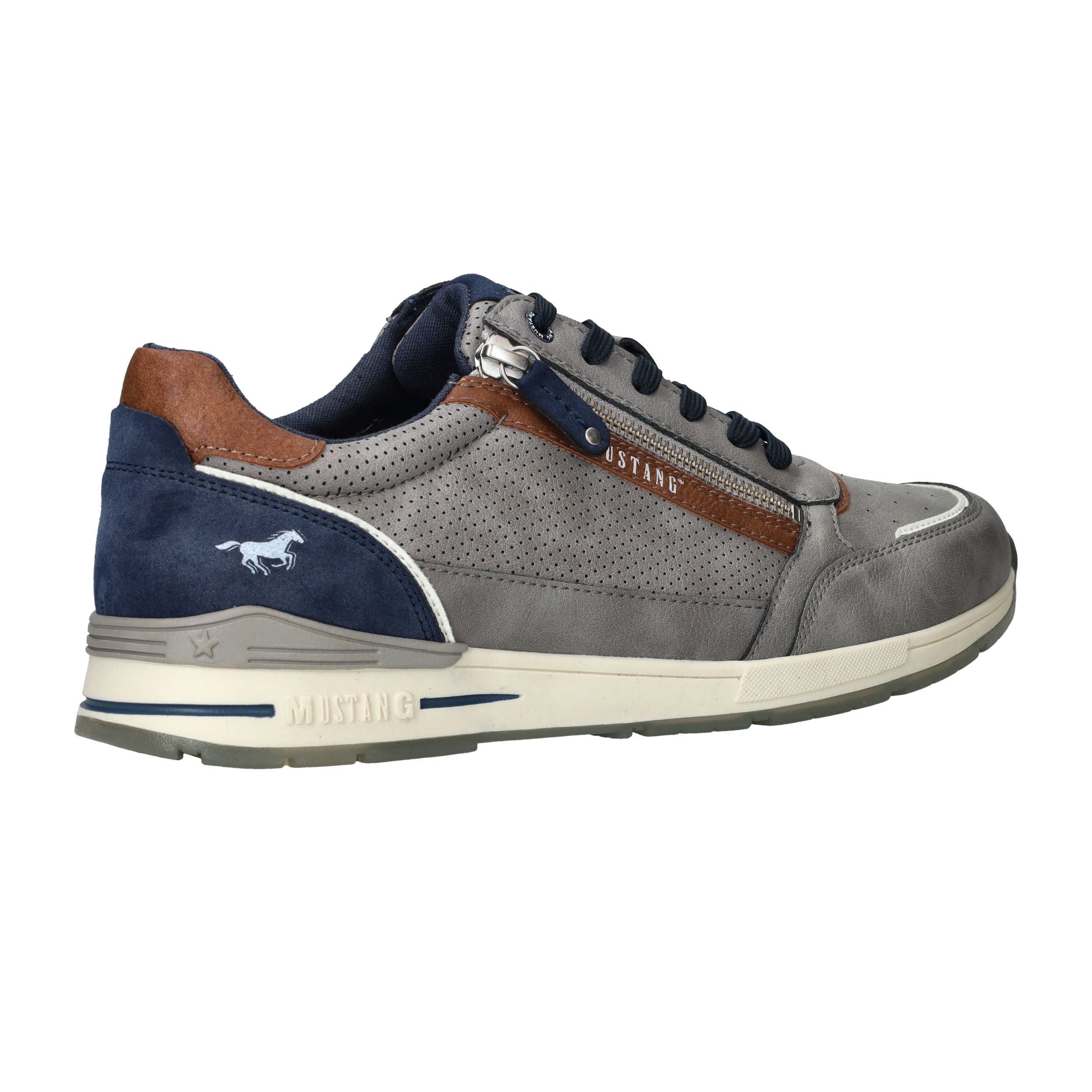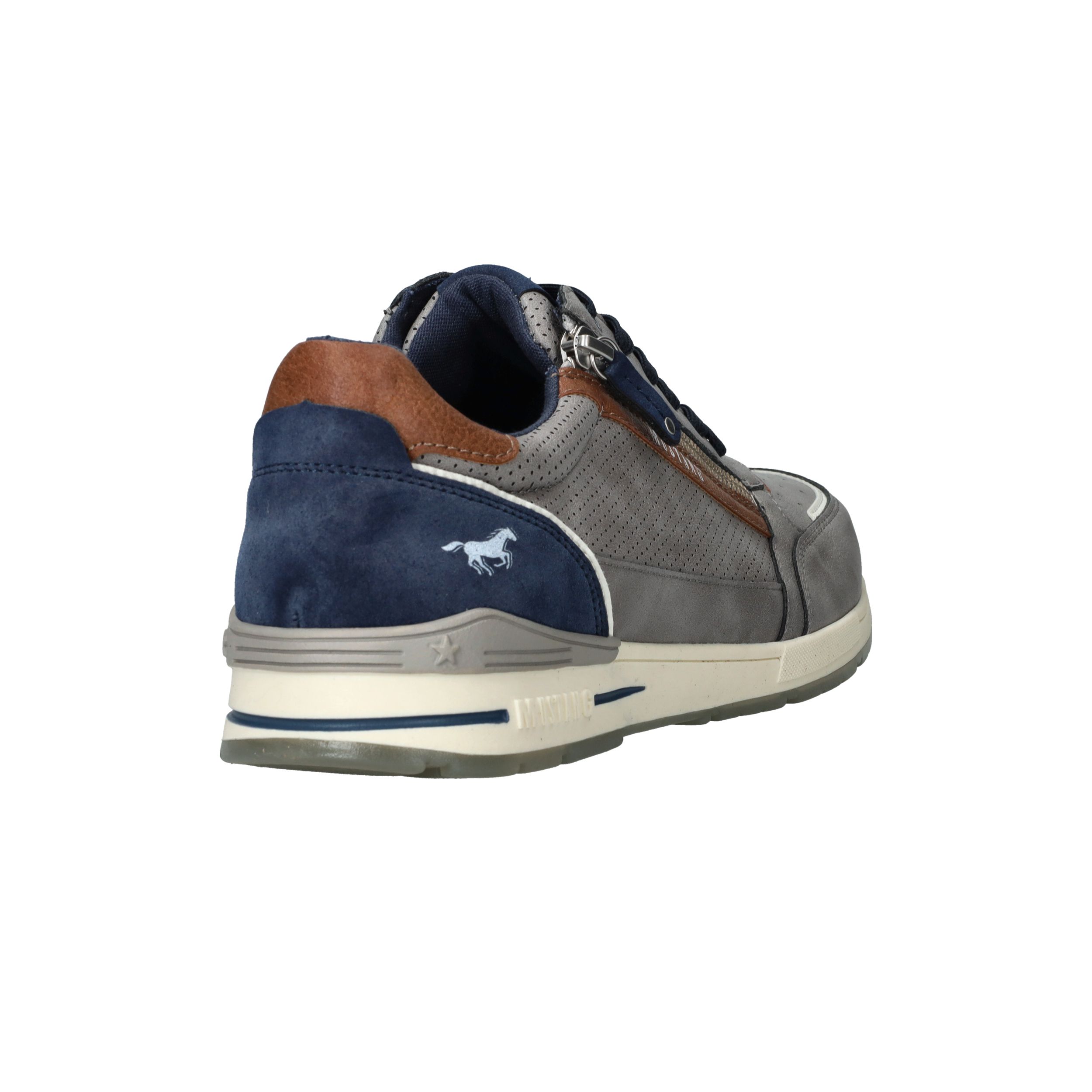 Mooie warmgrijze Mustang sneaker met cognac en blauwe details. Deze herensneaker is makkelijk te combineren met al je outfits.