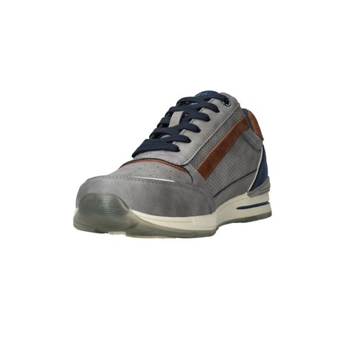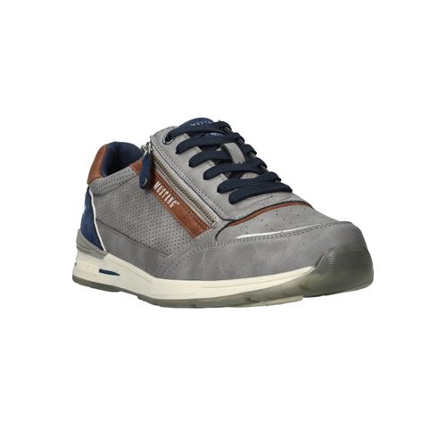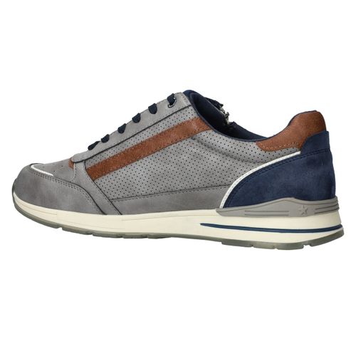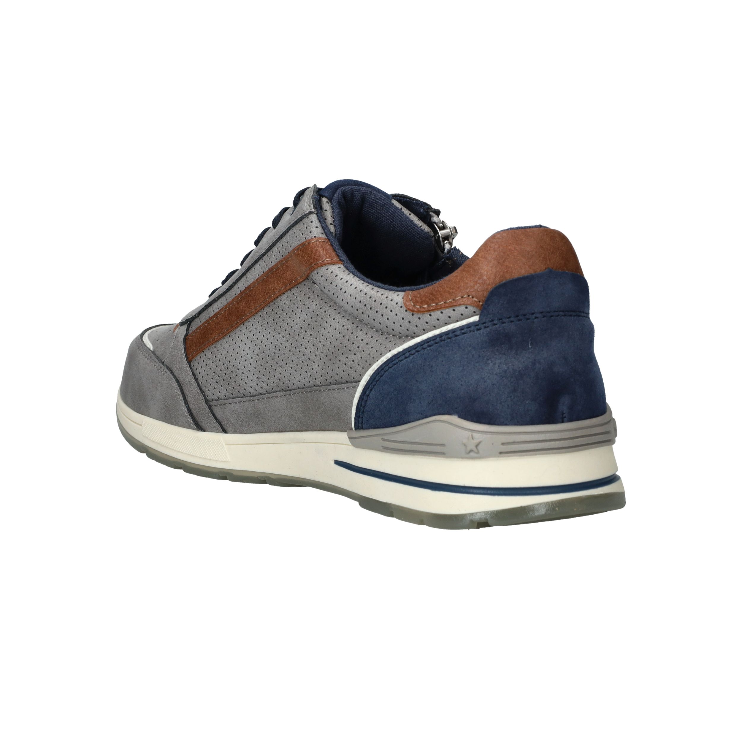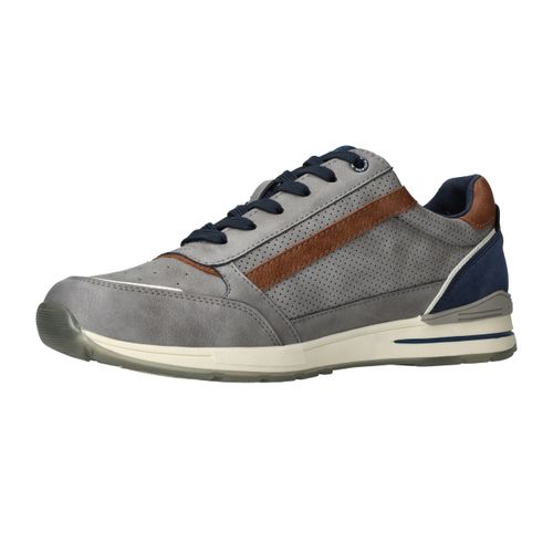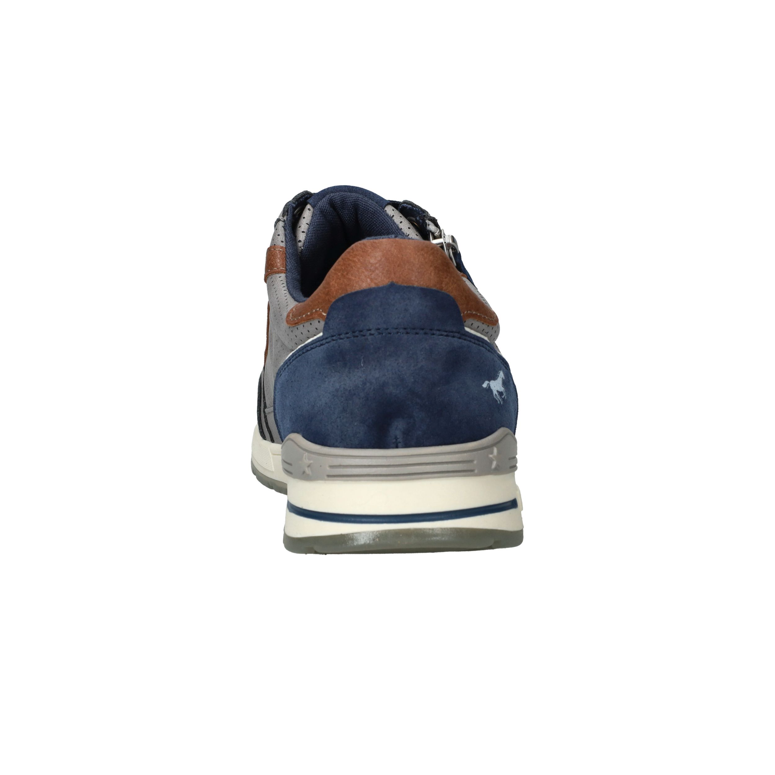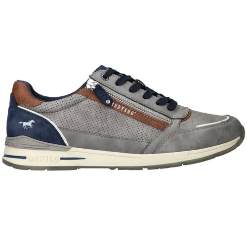 Mooie warmgrijze Mustang sneaker met cognac en blauwe details. Deze herensneaker is makkelijk te combineren met al je outfits.