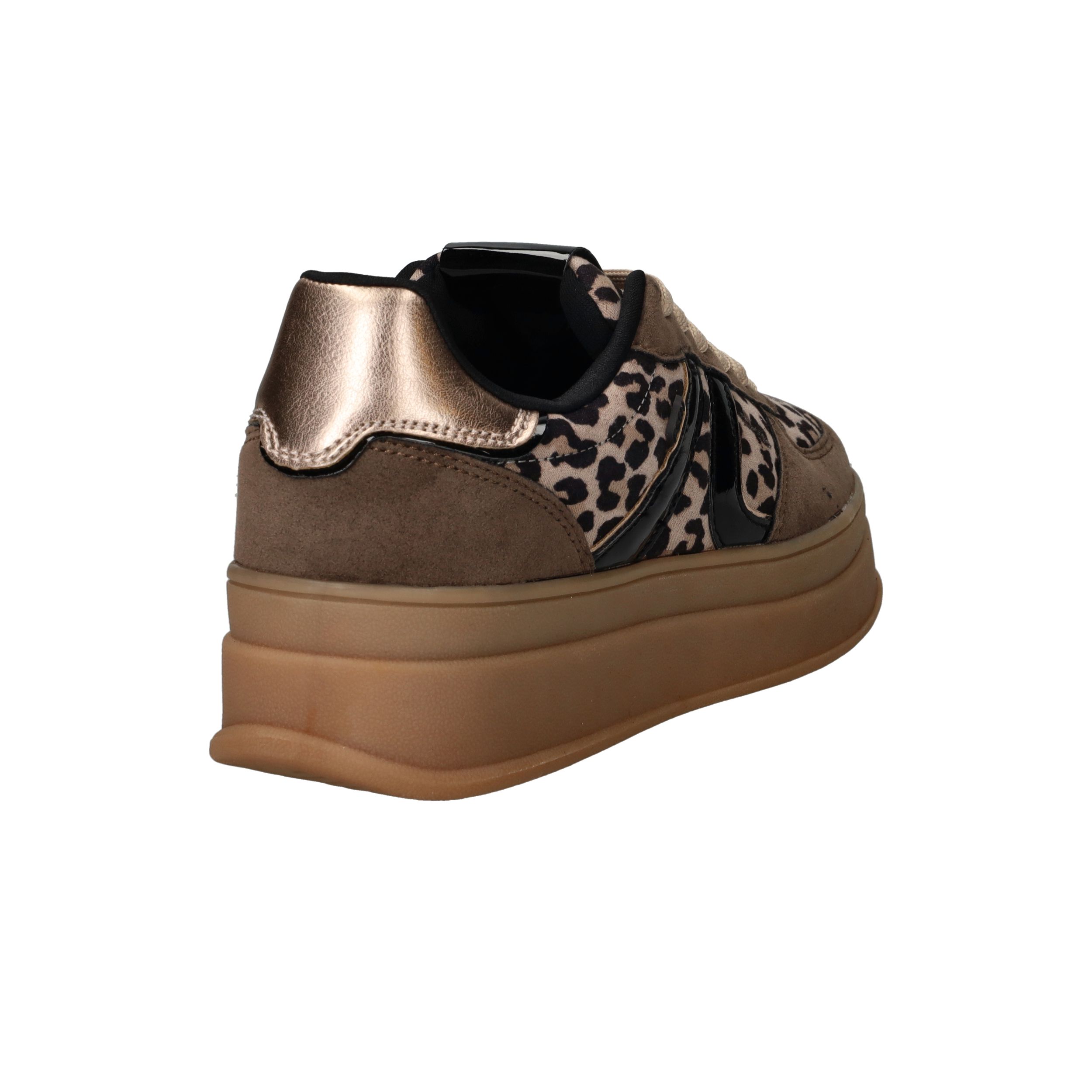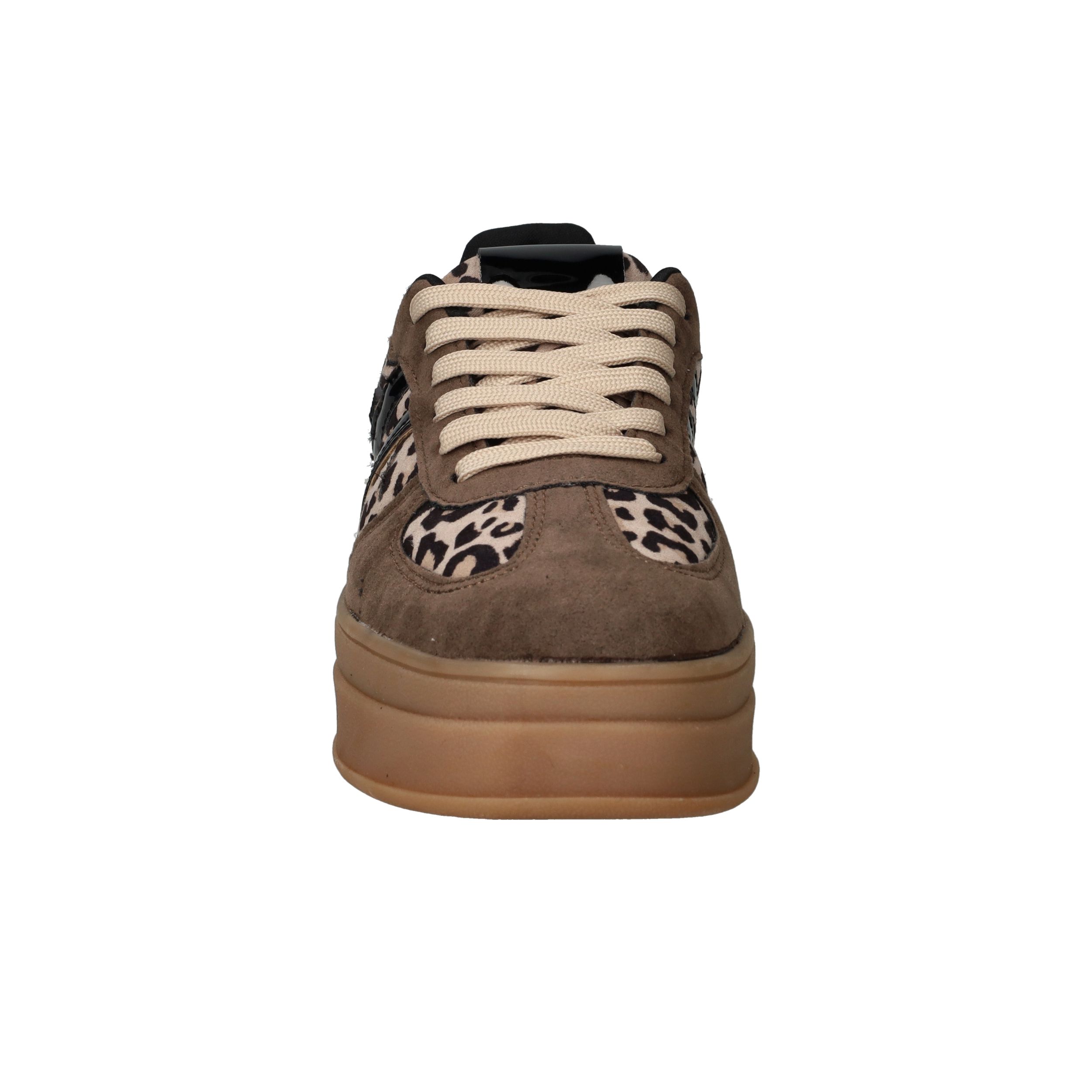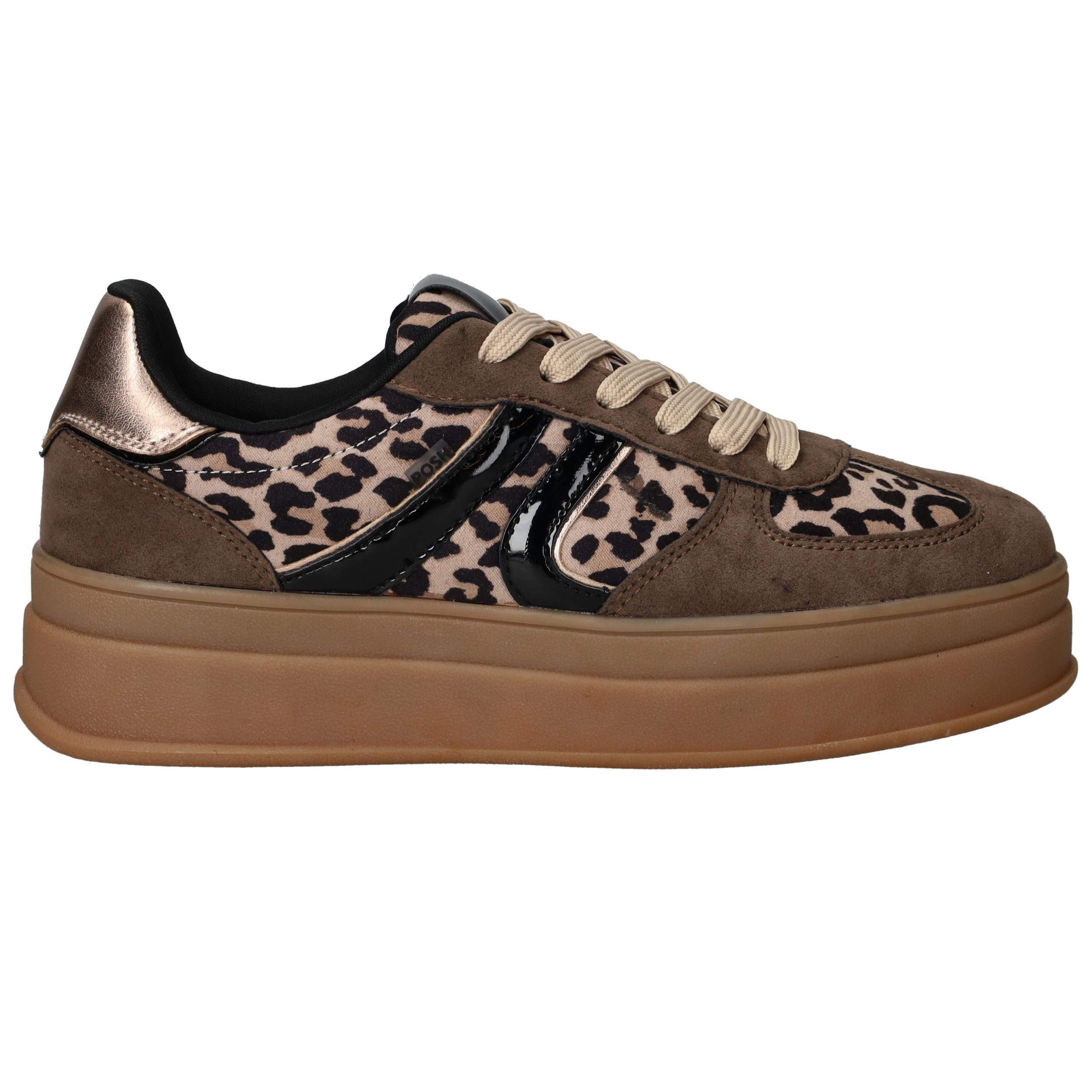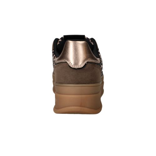 Deze sneaker van POSH by Poelman steelt absoluut de show met haar opvallende panterprint en trendy plateauzool. De combinatie van taupe, zwart en metallic accenten maakt deze meidensneaker een stoere en stijlvolle keuze voor elke jonge fashionista.