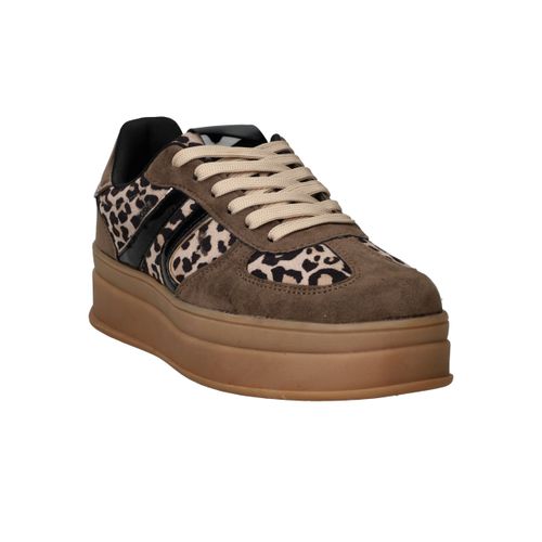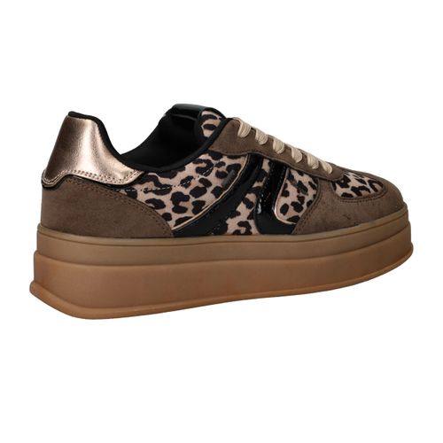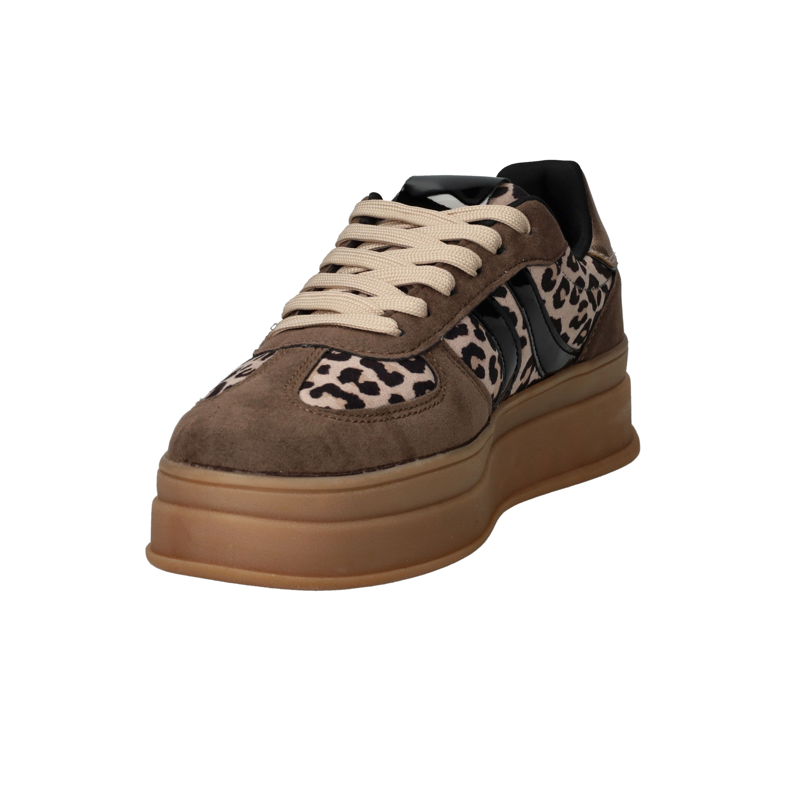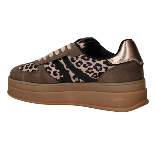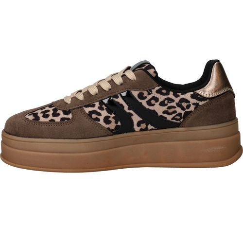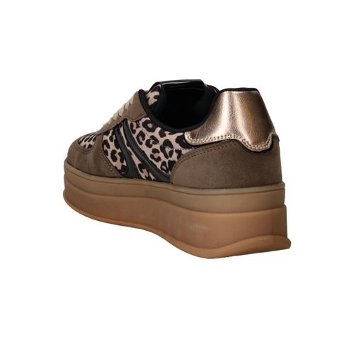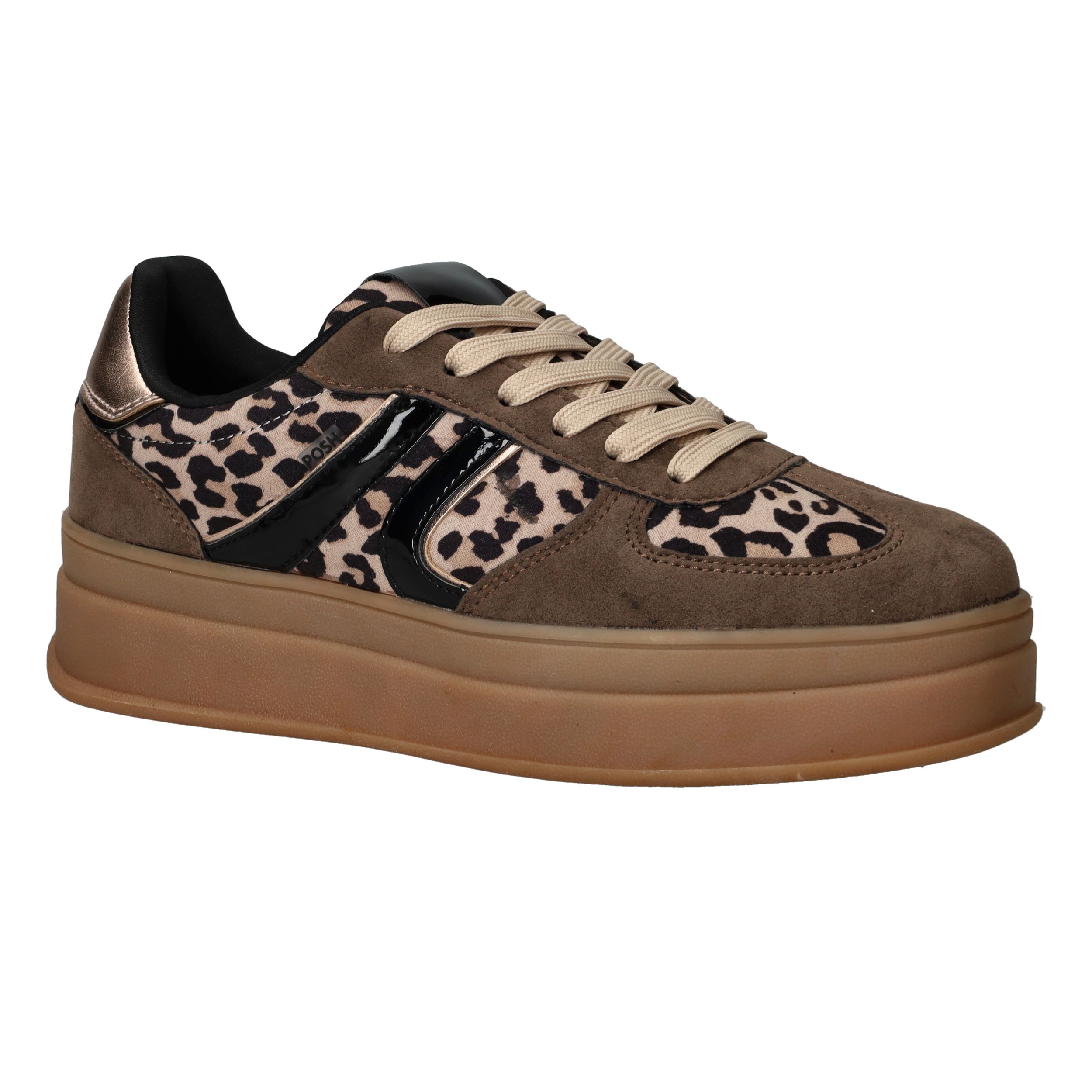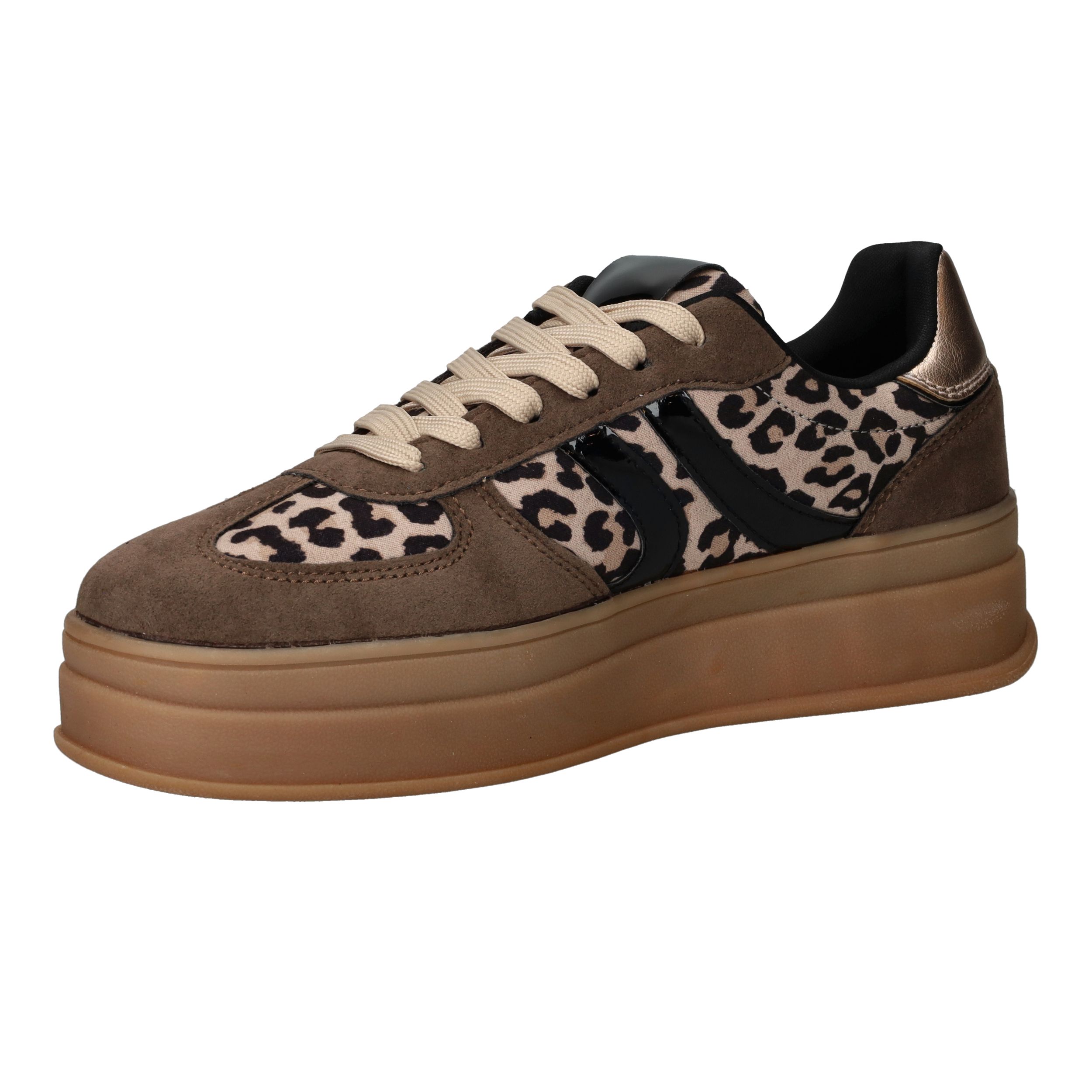 Deze sneaker van POSH by Poelman steelt absoluut de show met haar opvallende panterprint en trendy plateauzool. De combinatie van taupe, zwart en metallic accenten maakt deze meidensneaker een stoere en stijlvolle keuze voor elke jonge fashionista.