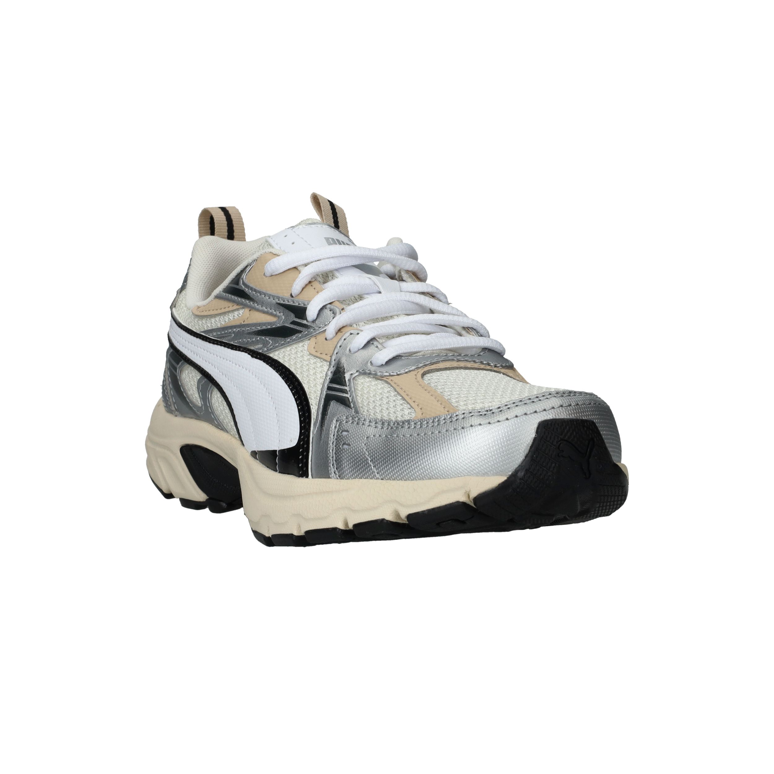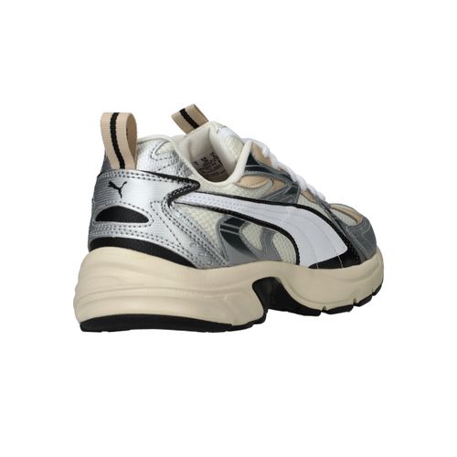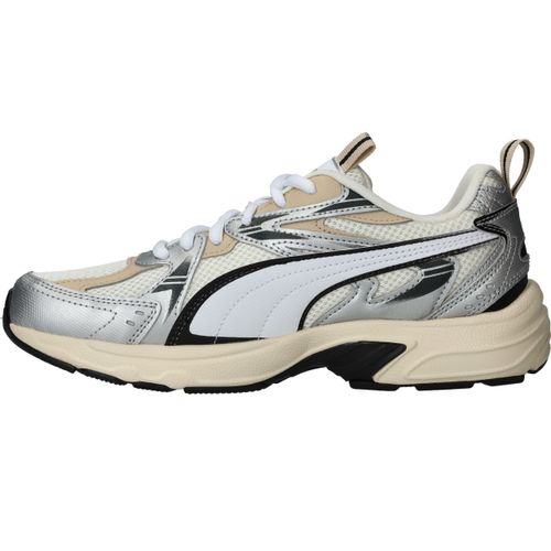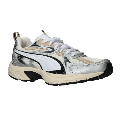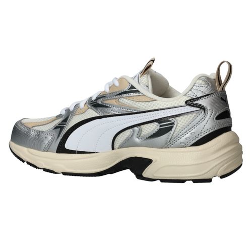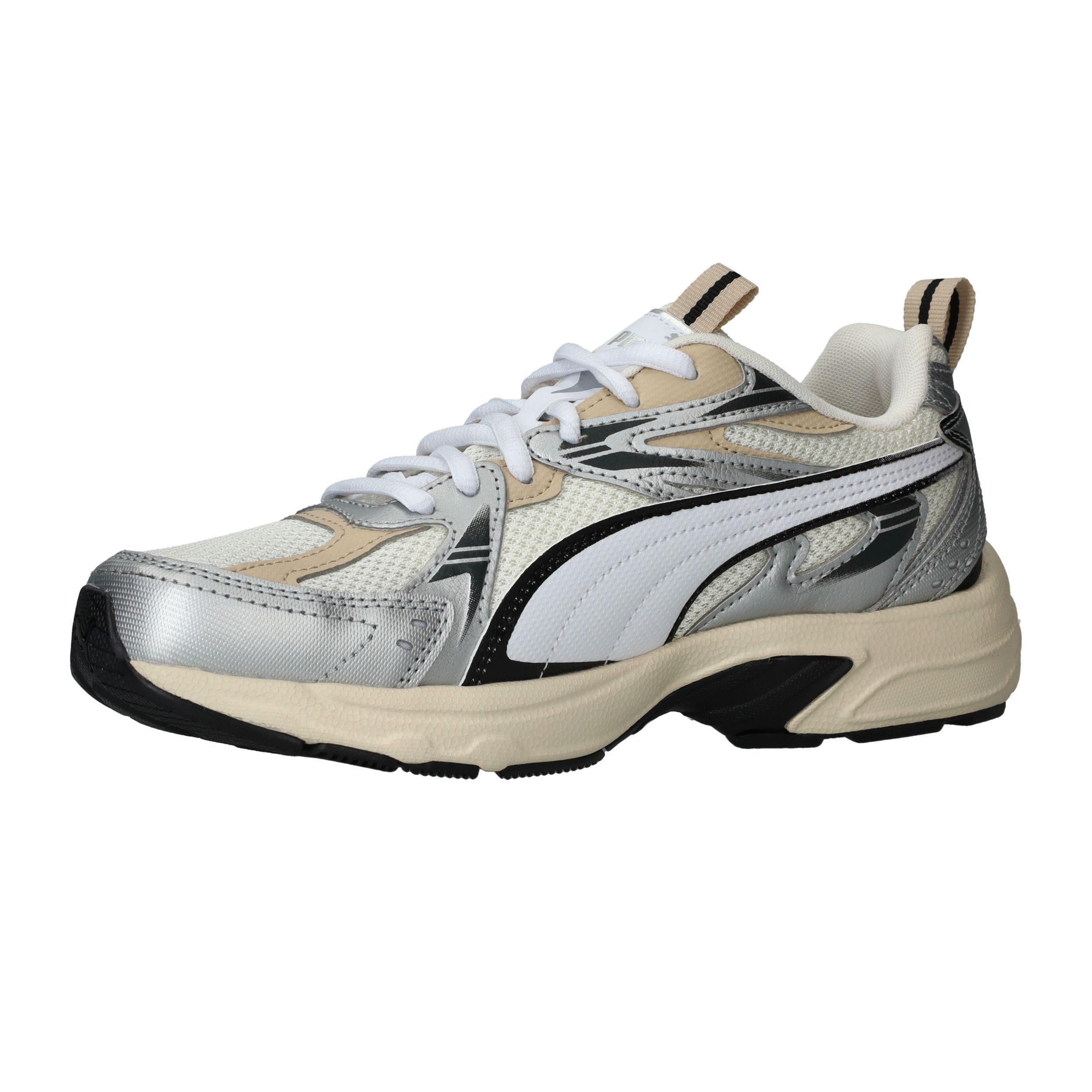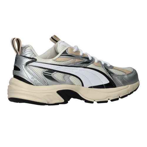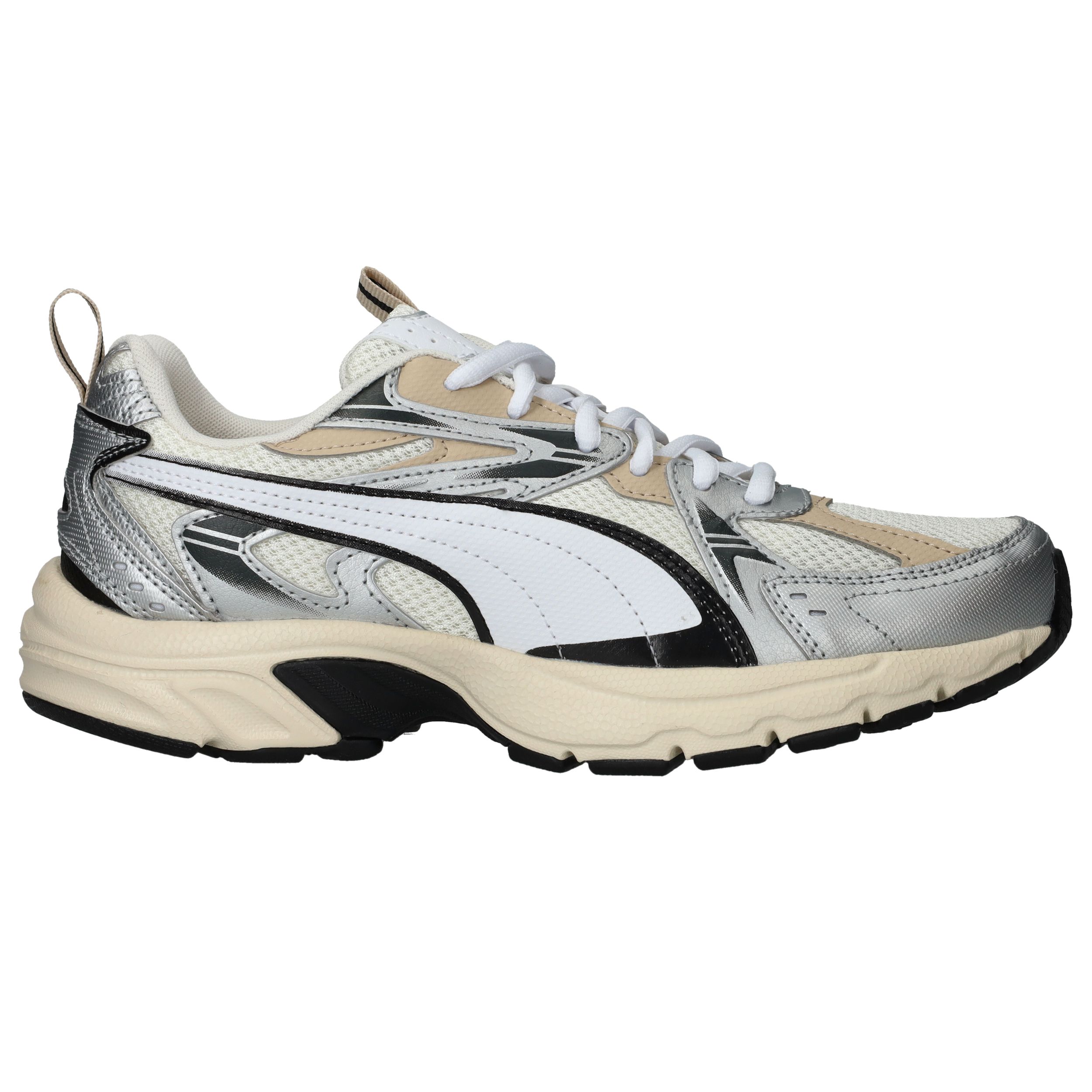 Sportieve Puma Millenio Tech sneaker voor dames. De beige sneaker heeft zwart, witte en zilveren accenten en is licht van gewicht.