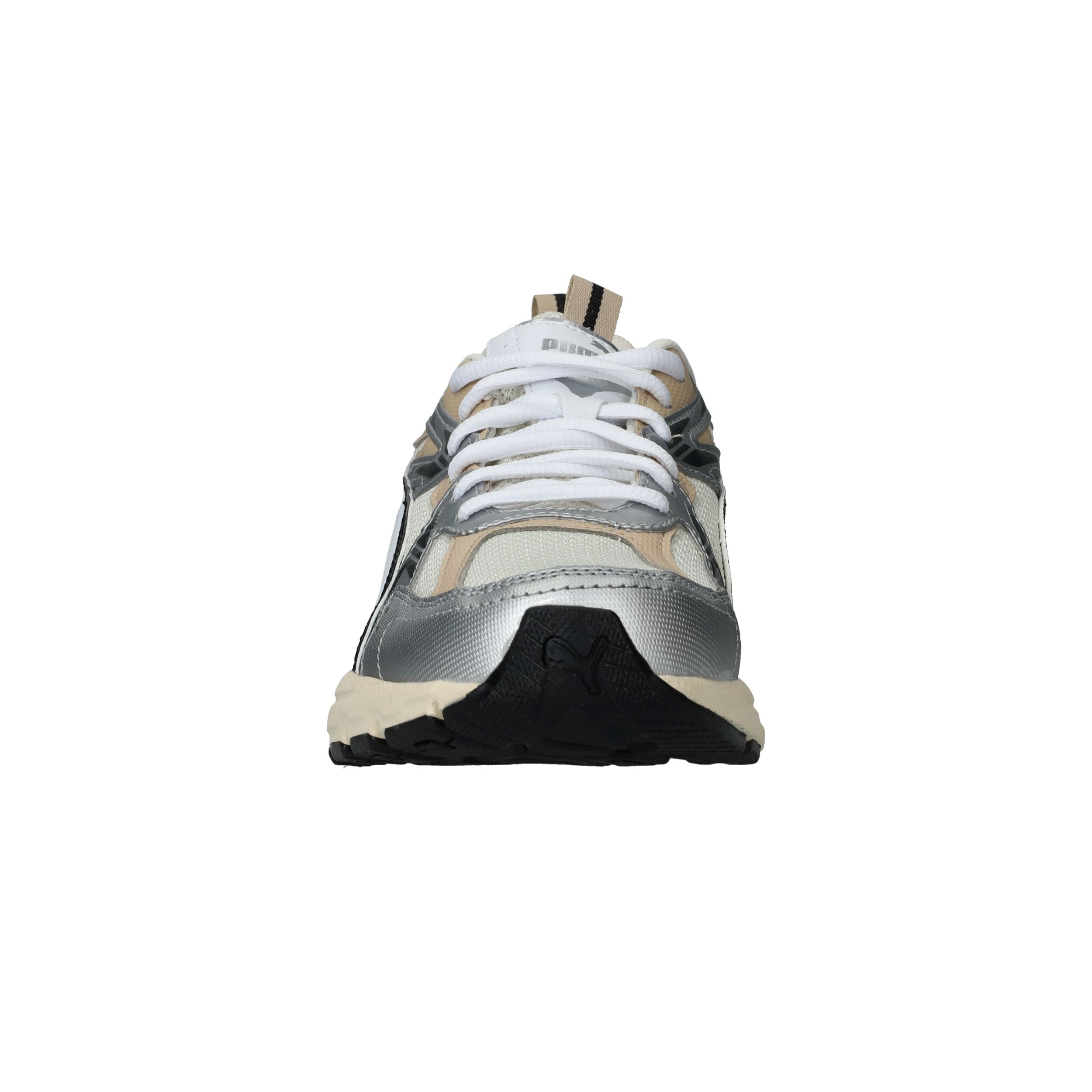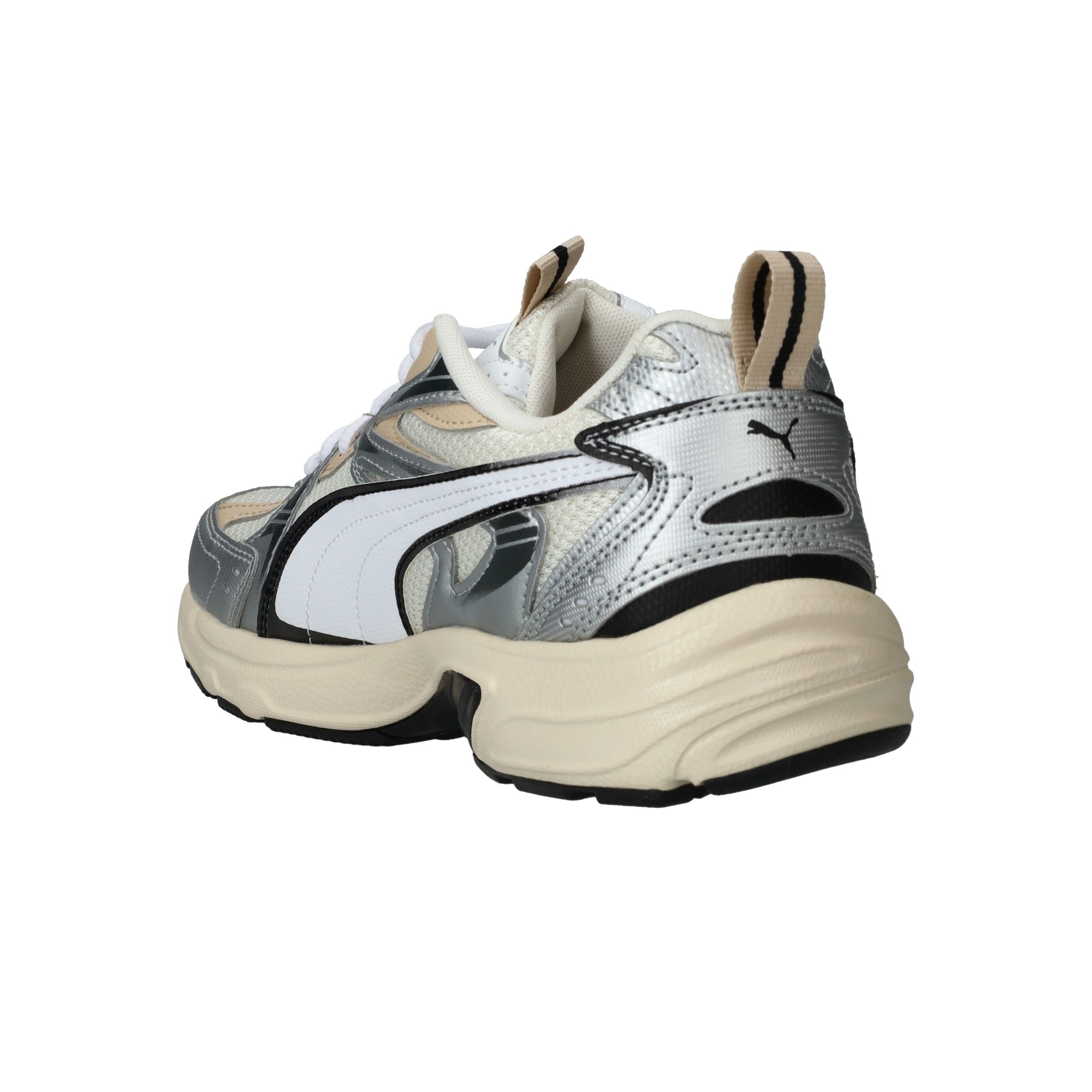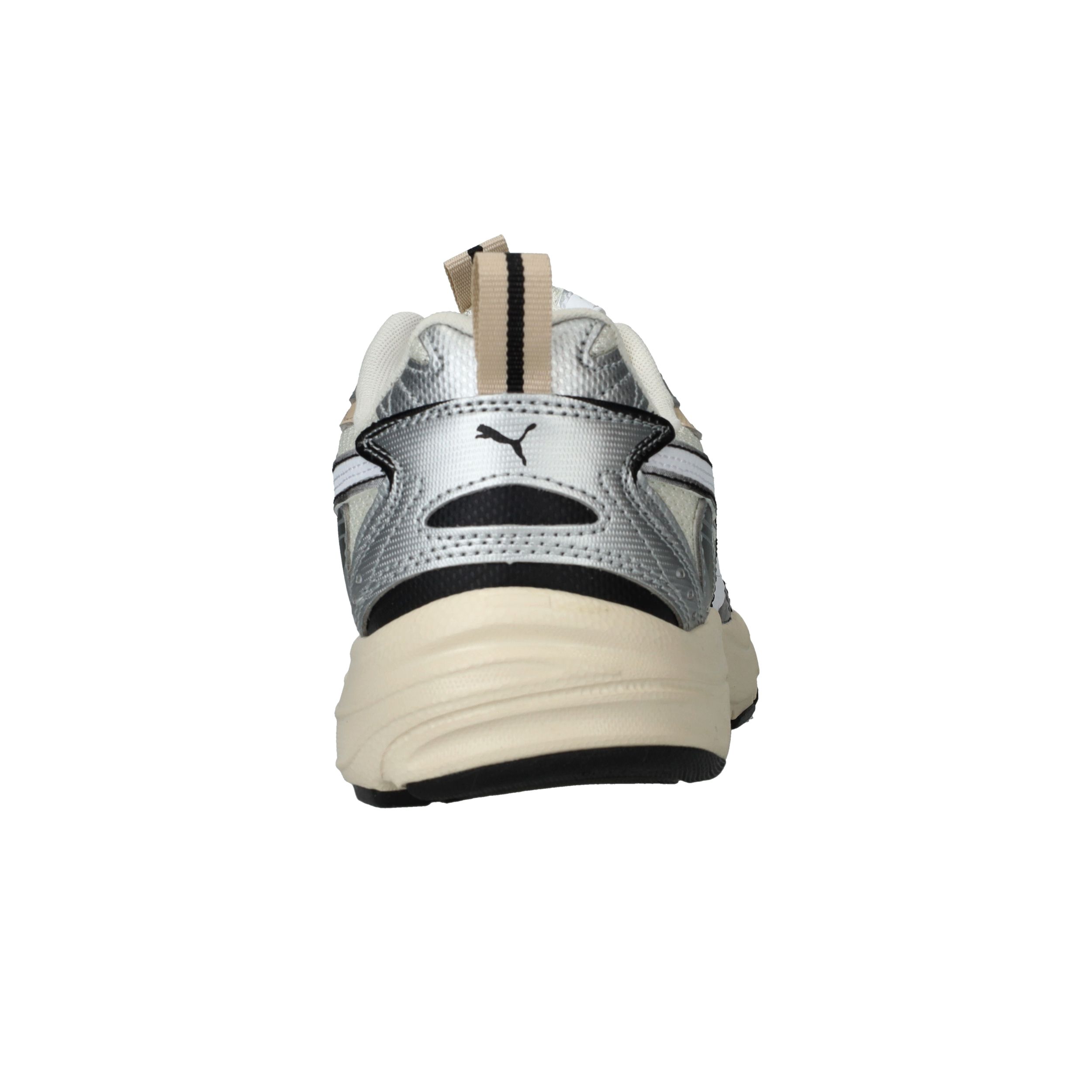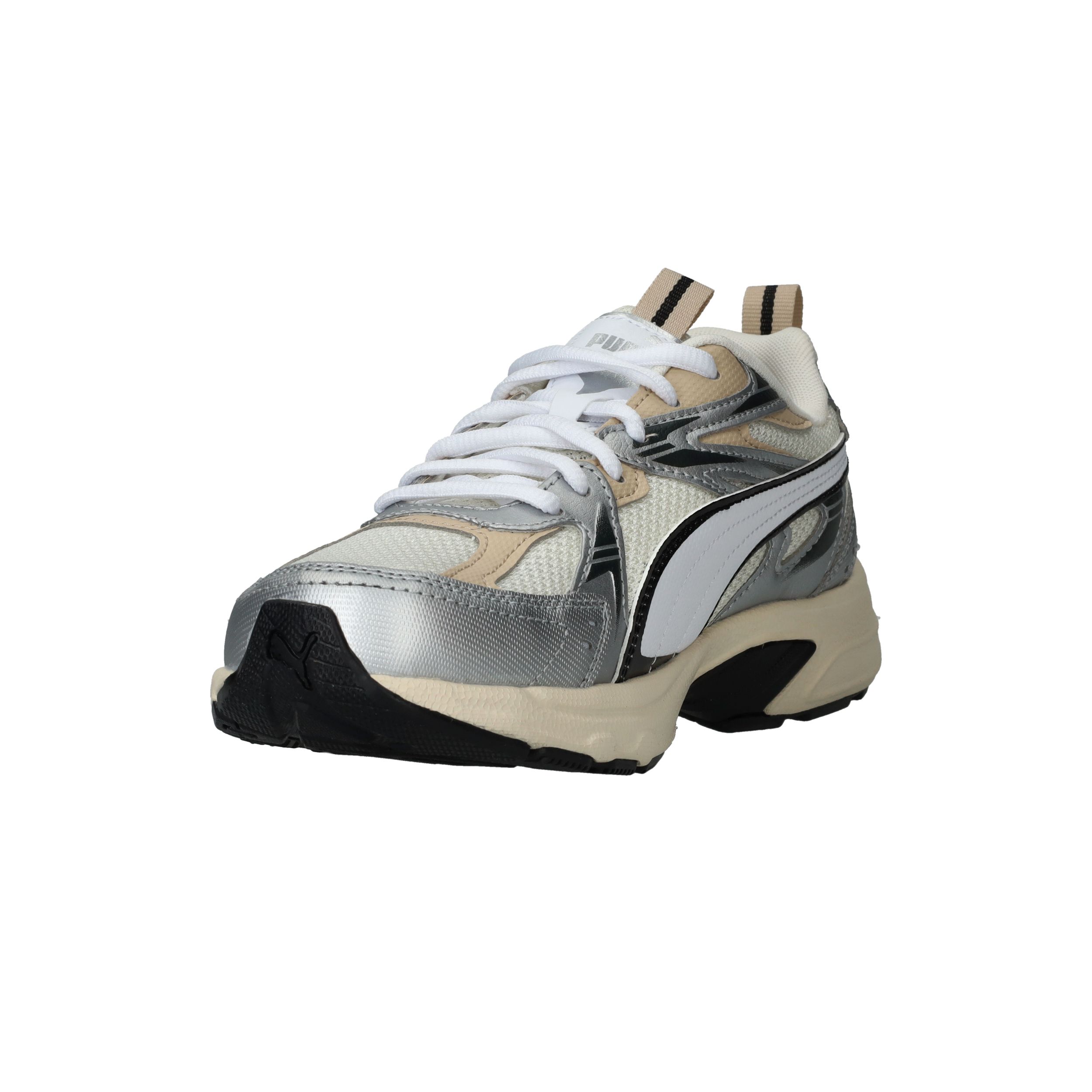 Sportieve Puma Millenio Tech sneaker voor dames. De beige sneaker heeft zwart, witte en zilveren accenten en is licht van gewicht.