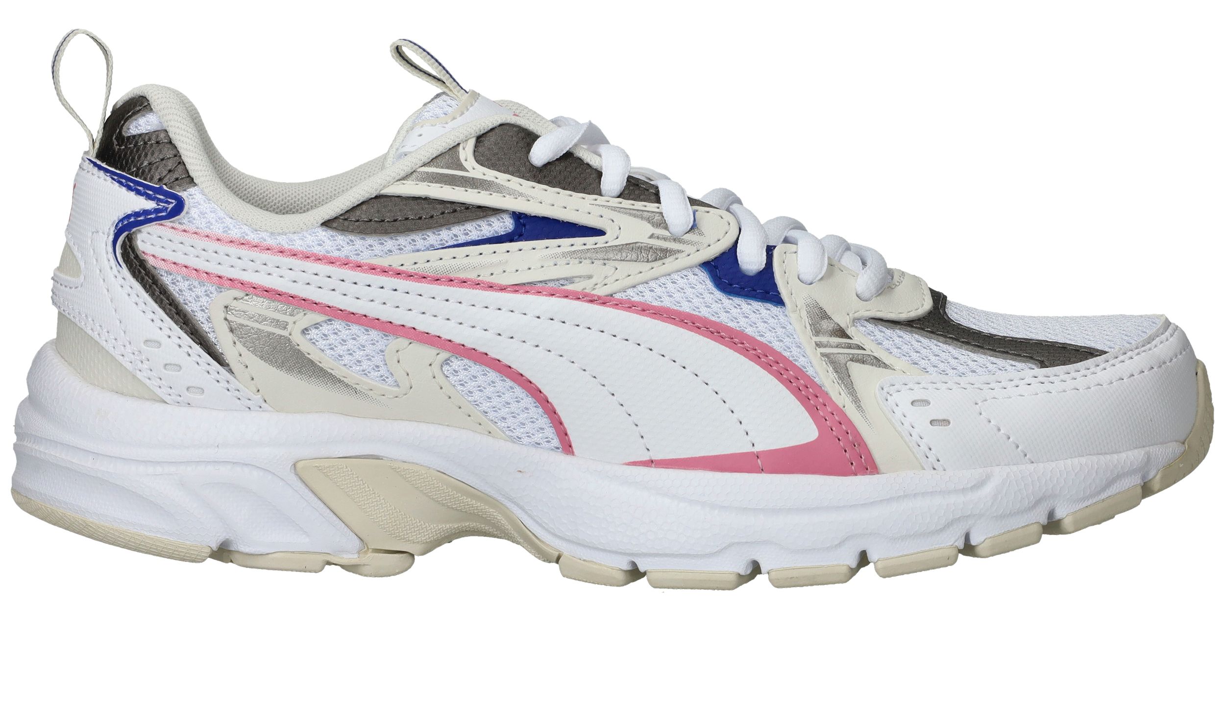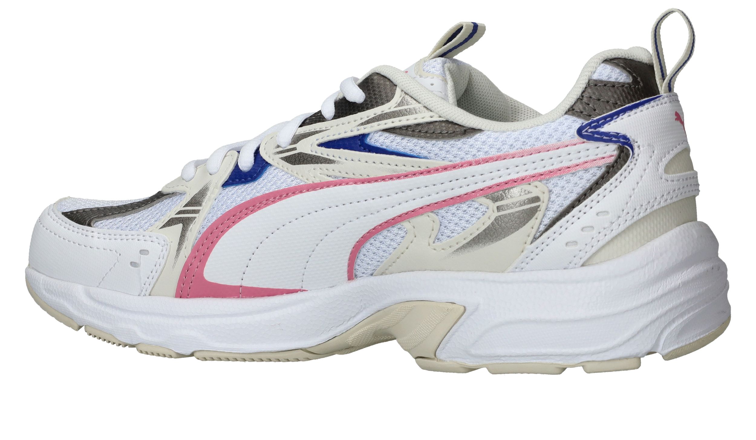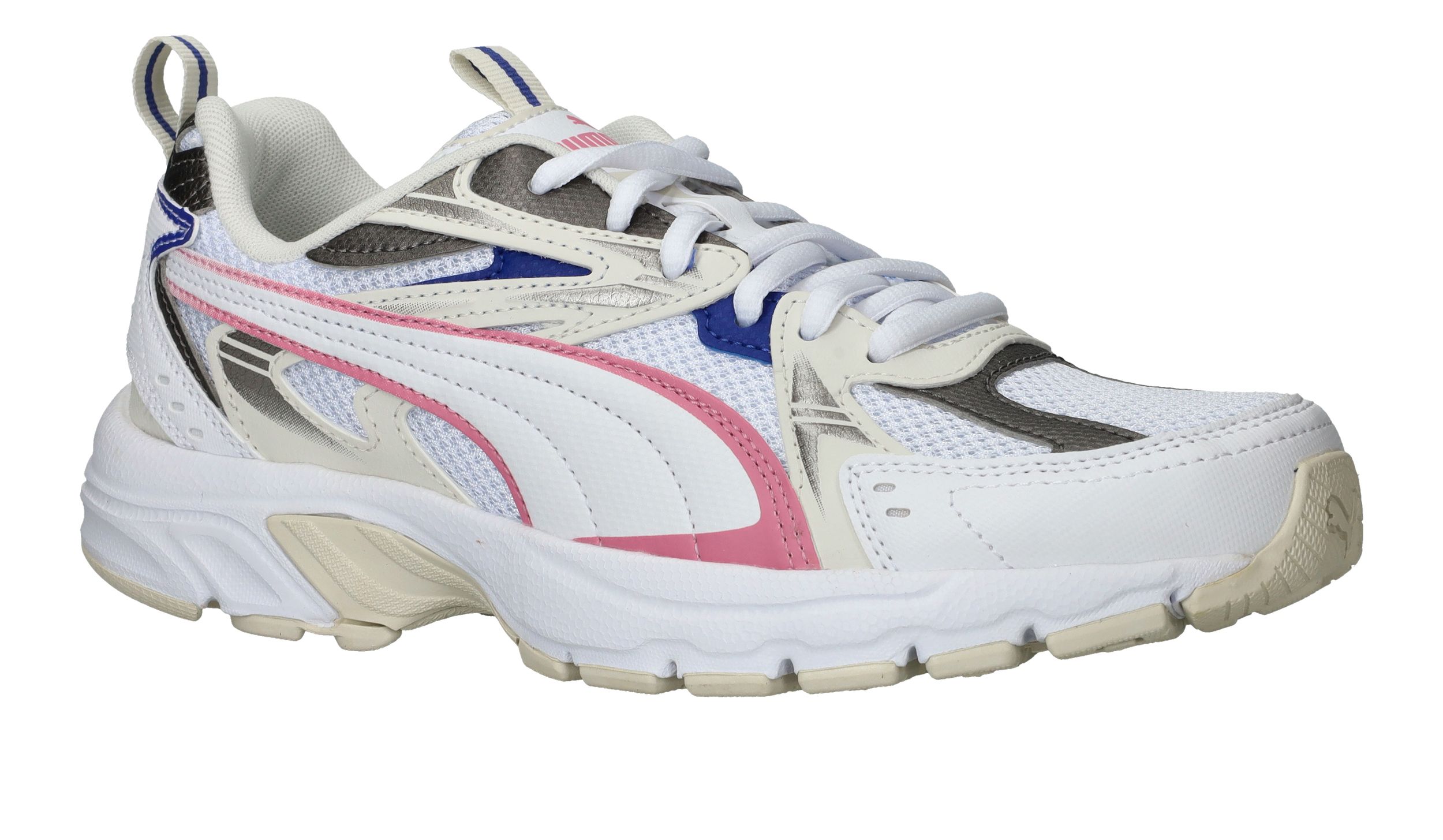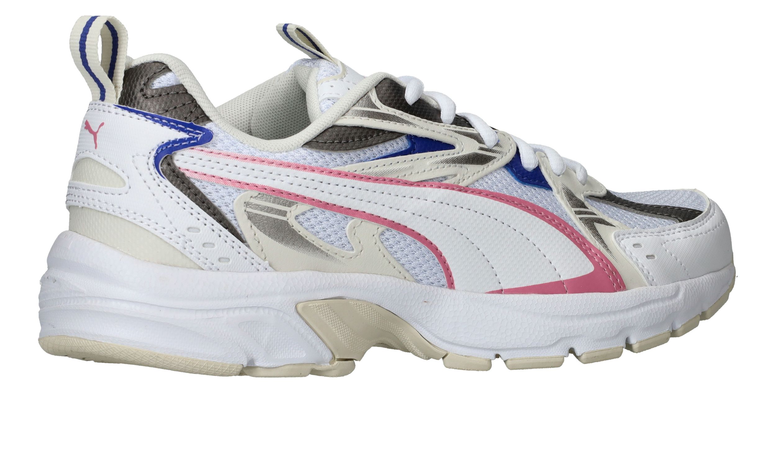 Sportieve Puma Millenio Tech sneaker voor dames. De witte sneaker heeft beige, zilveren en roze accenten en is licht van gewicht.