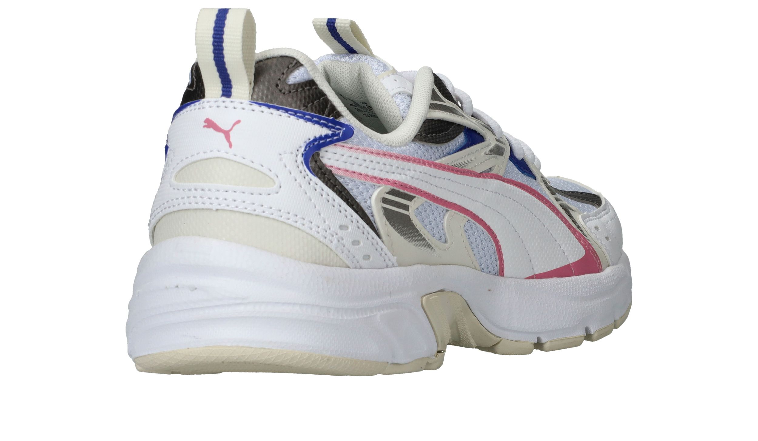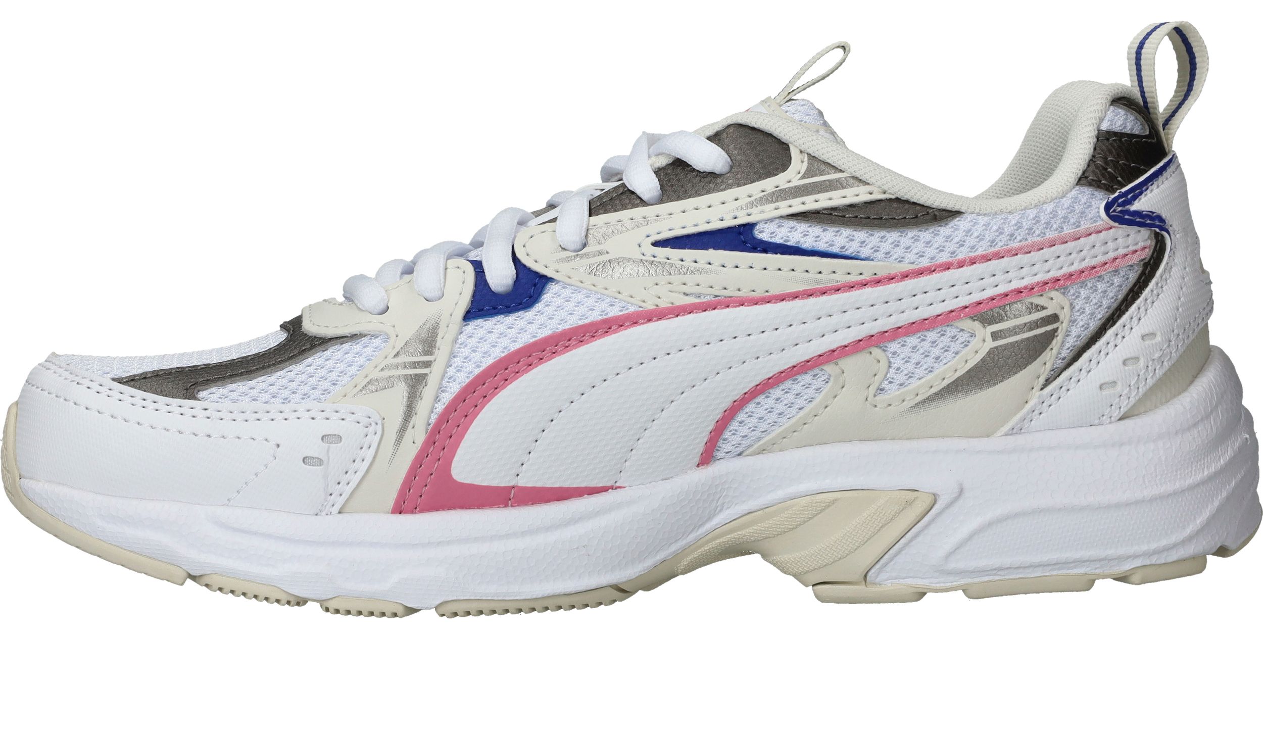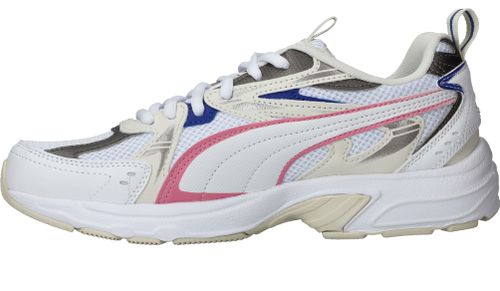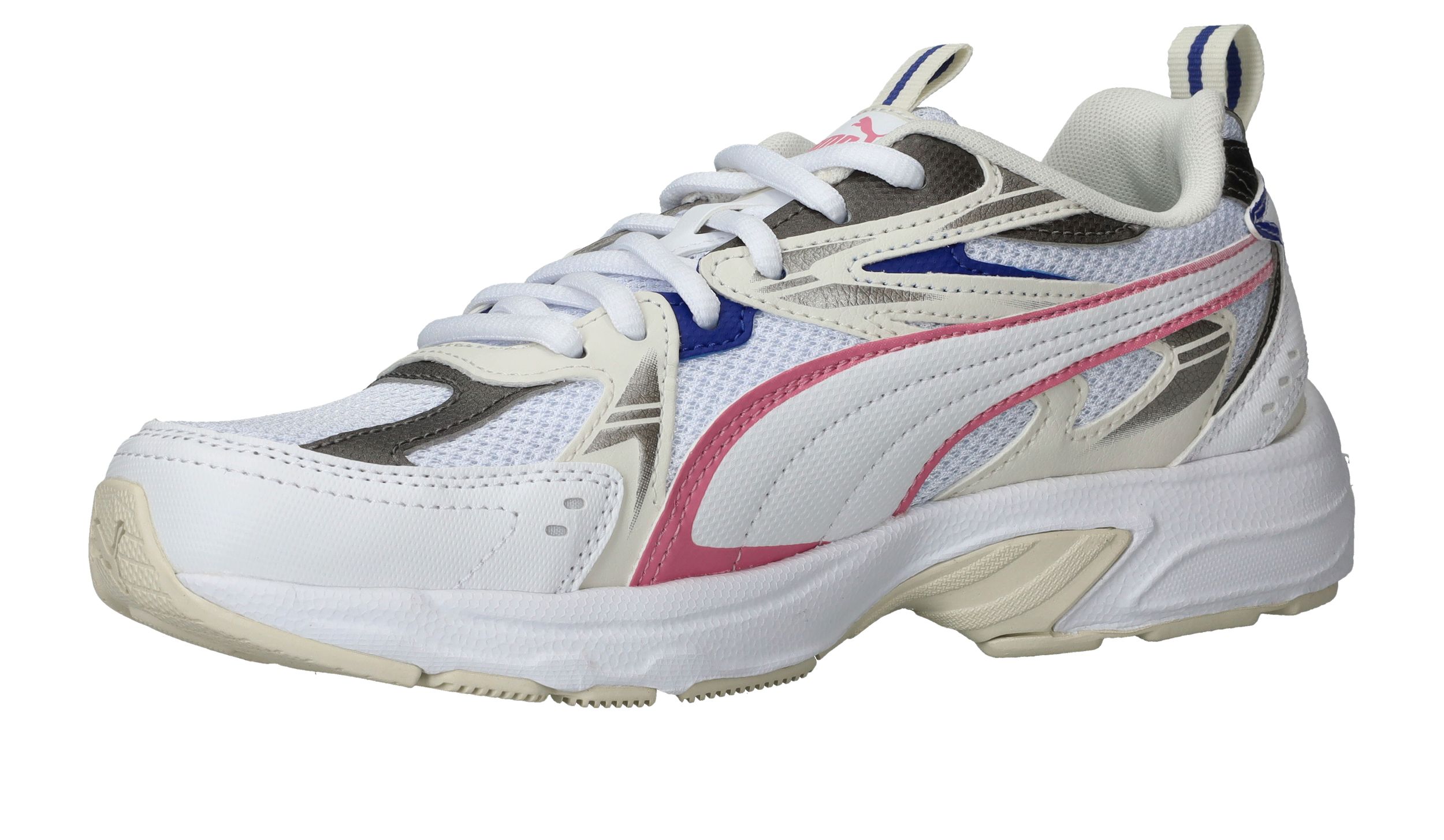 Sportieve Puma Millenio Tech sneaker voor dames. De witte sneaker heeft beige, zilveren en roze accenten en is licht van gewicht.