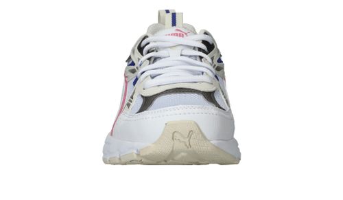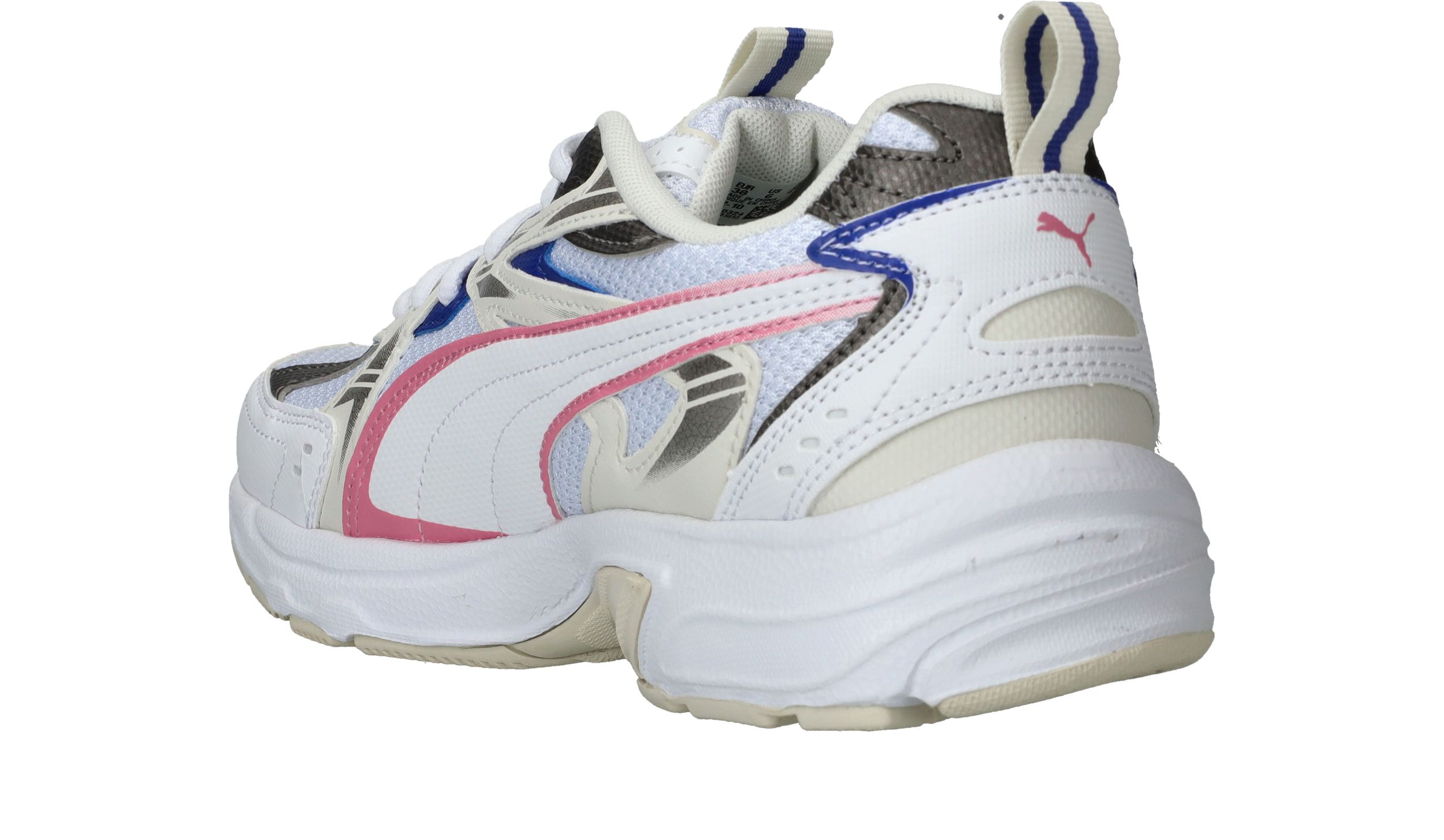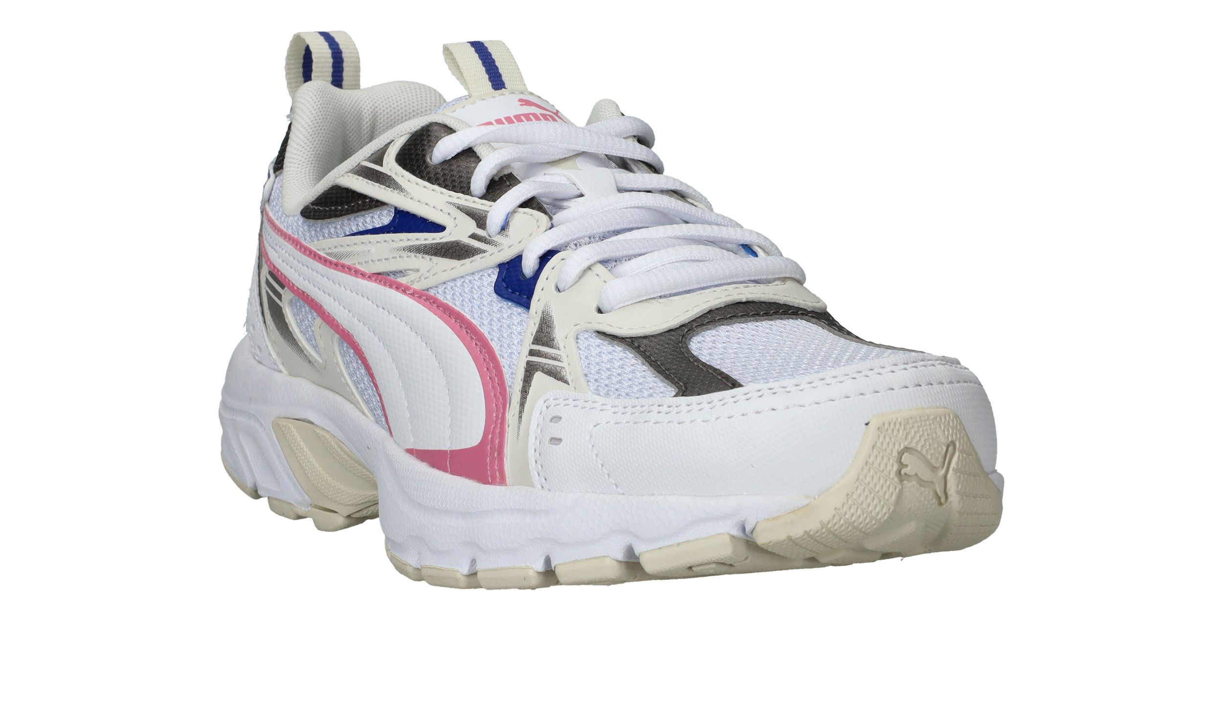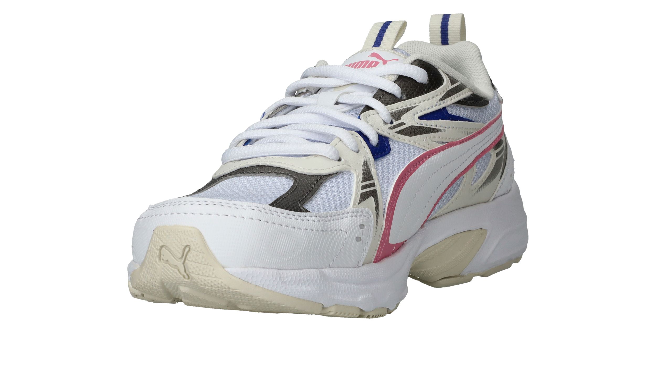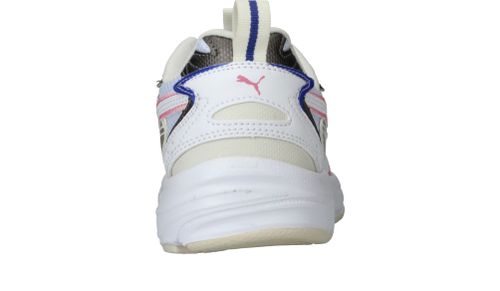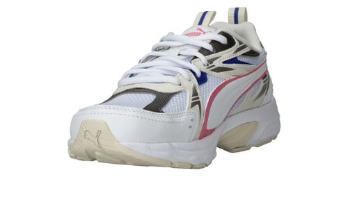Sportieve Puma Millenio Tech sneaker voor dames. De witte sneaker heeft beige, zilveren en roze accenten en is licht van gewicht.