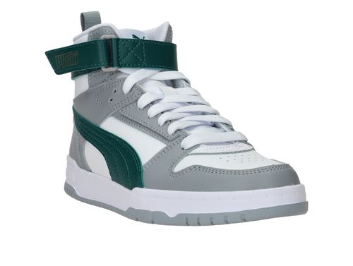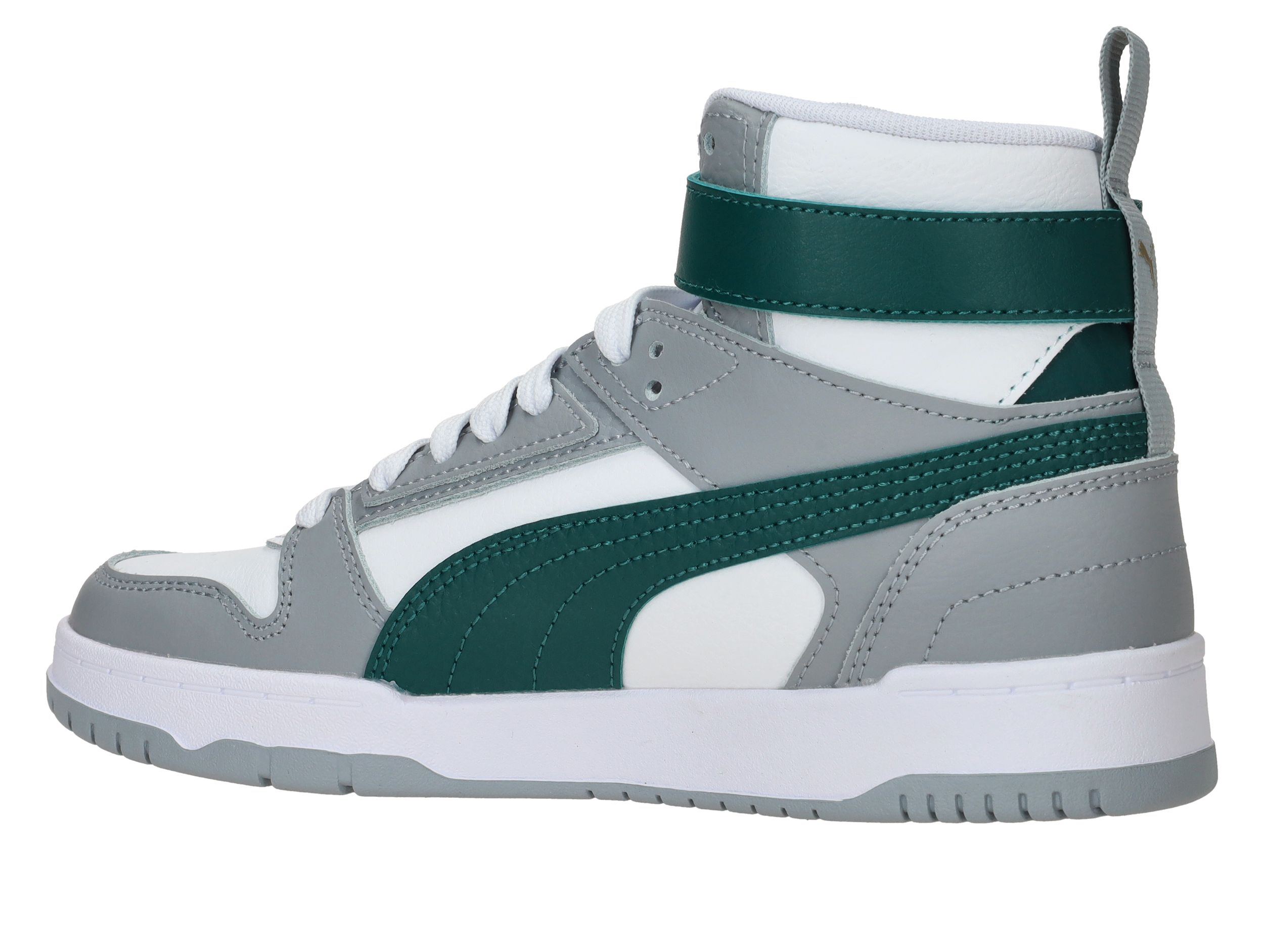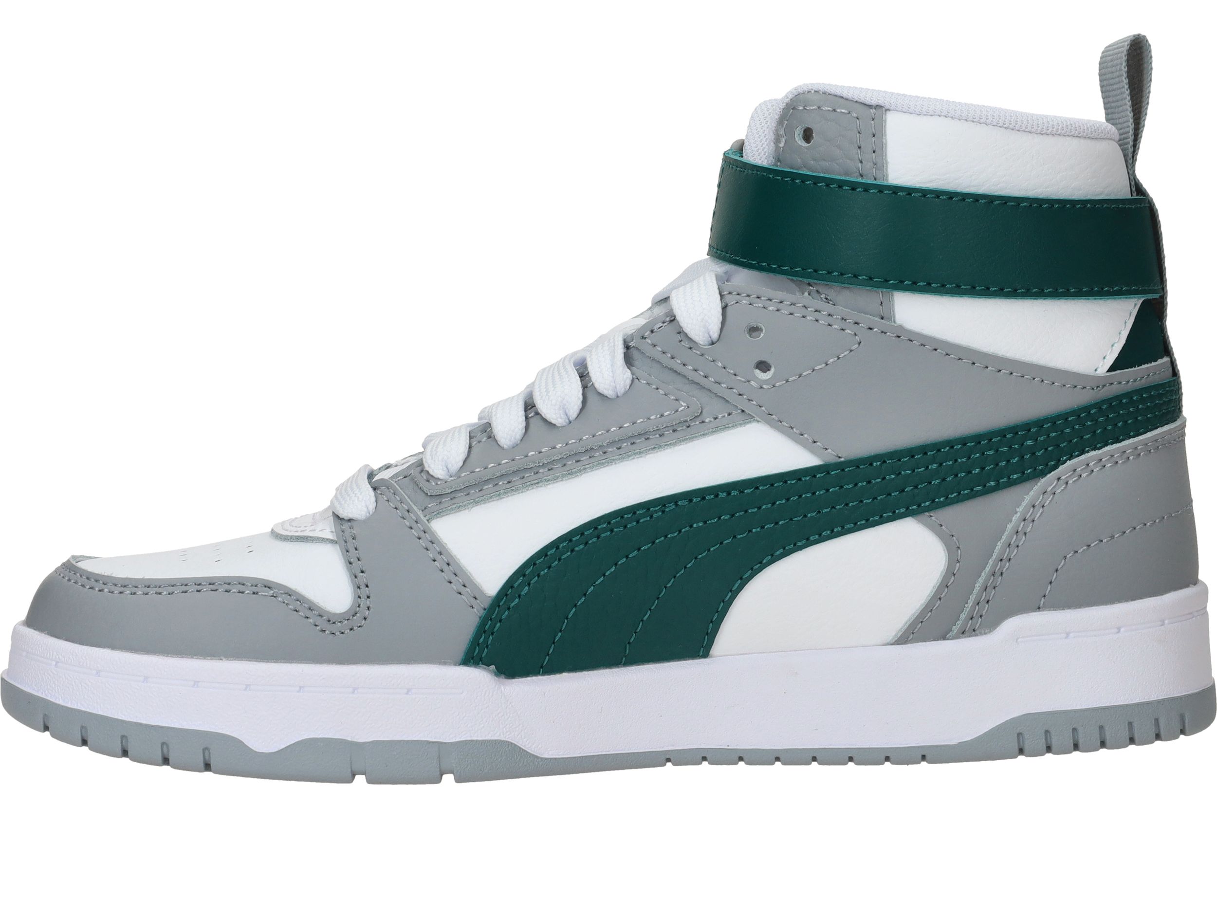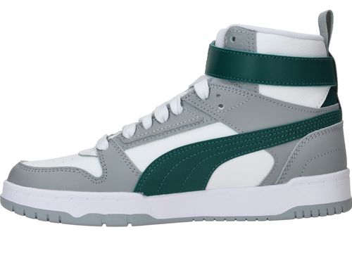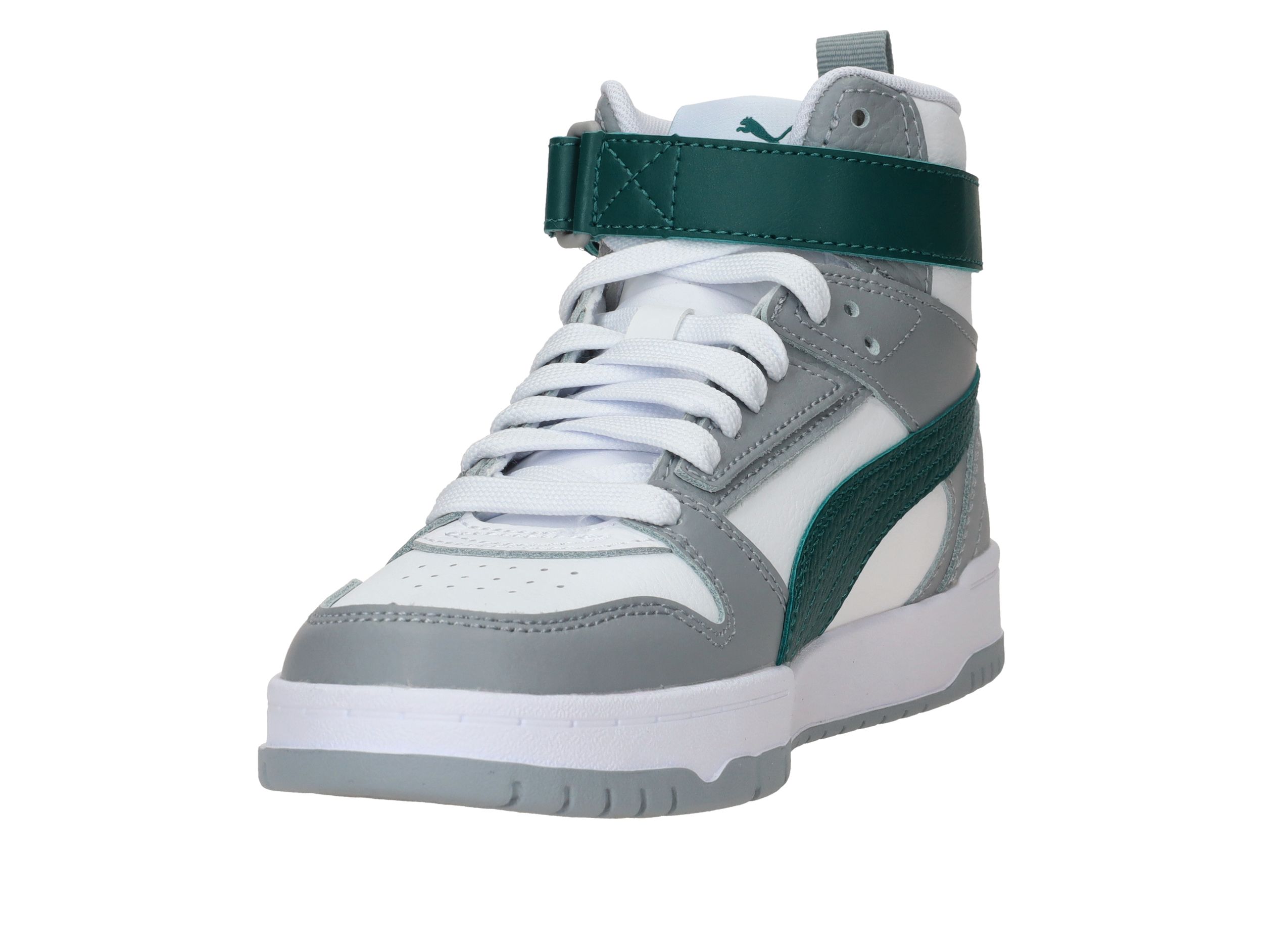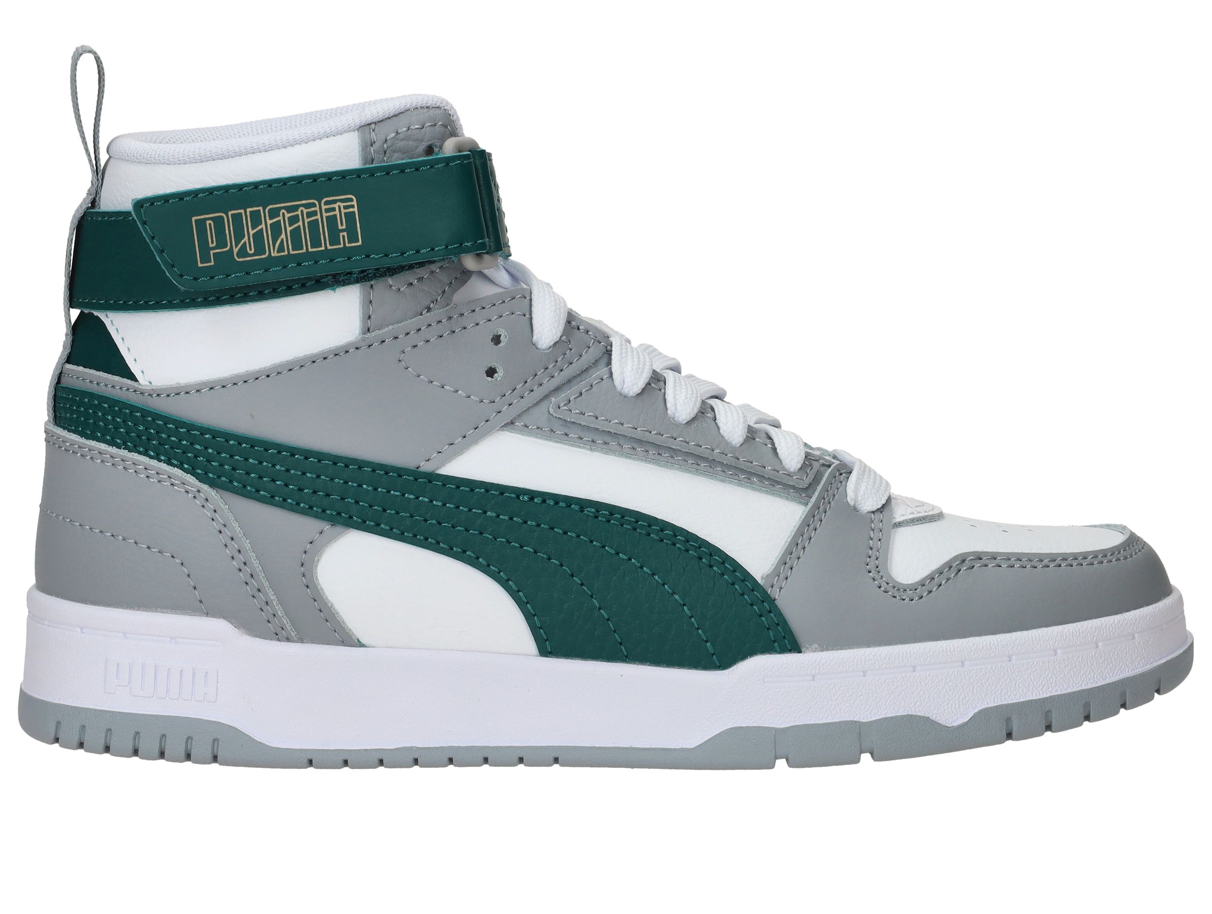 Stoere witte Puma RBD Game JR halfhoge sneaker voor jongens. De sneaker heeft grijze en groene accenten en heeft een veter- en klittenbandsluiting.