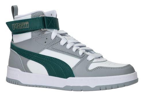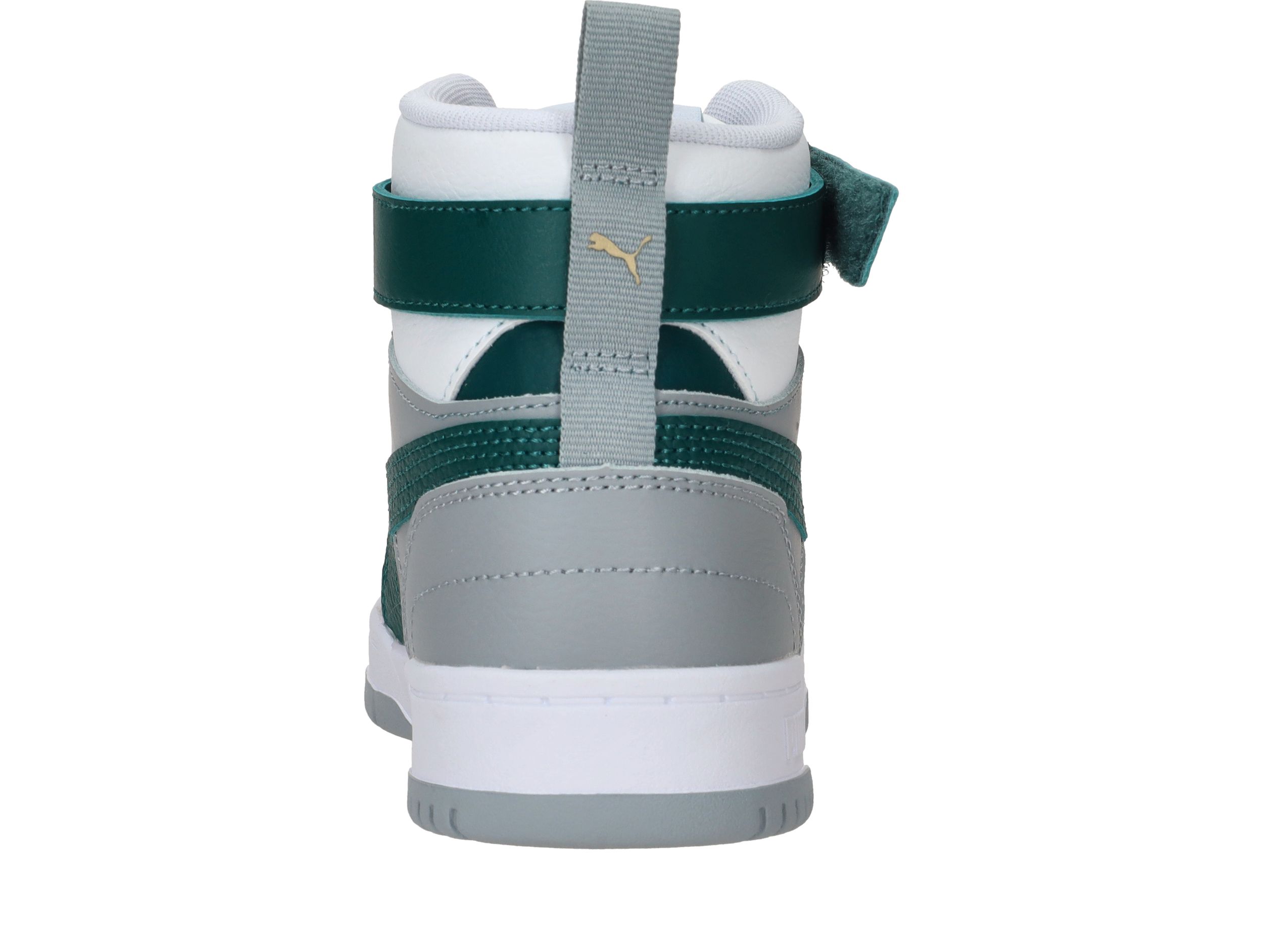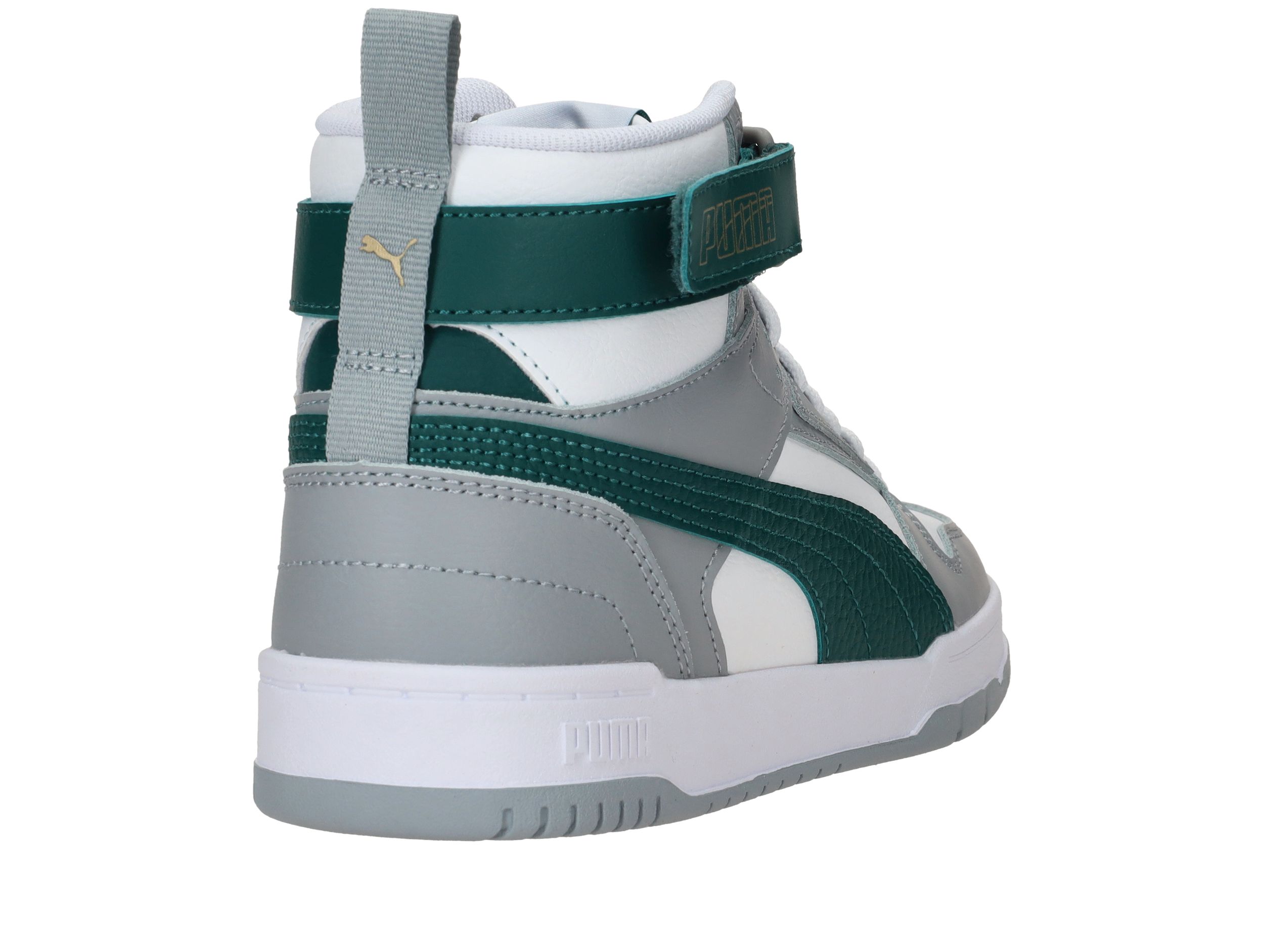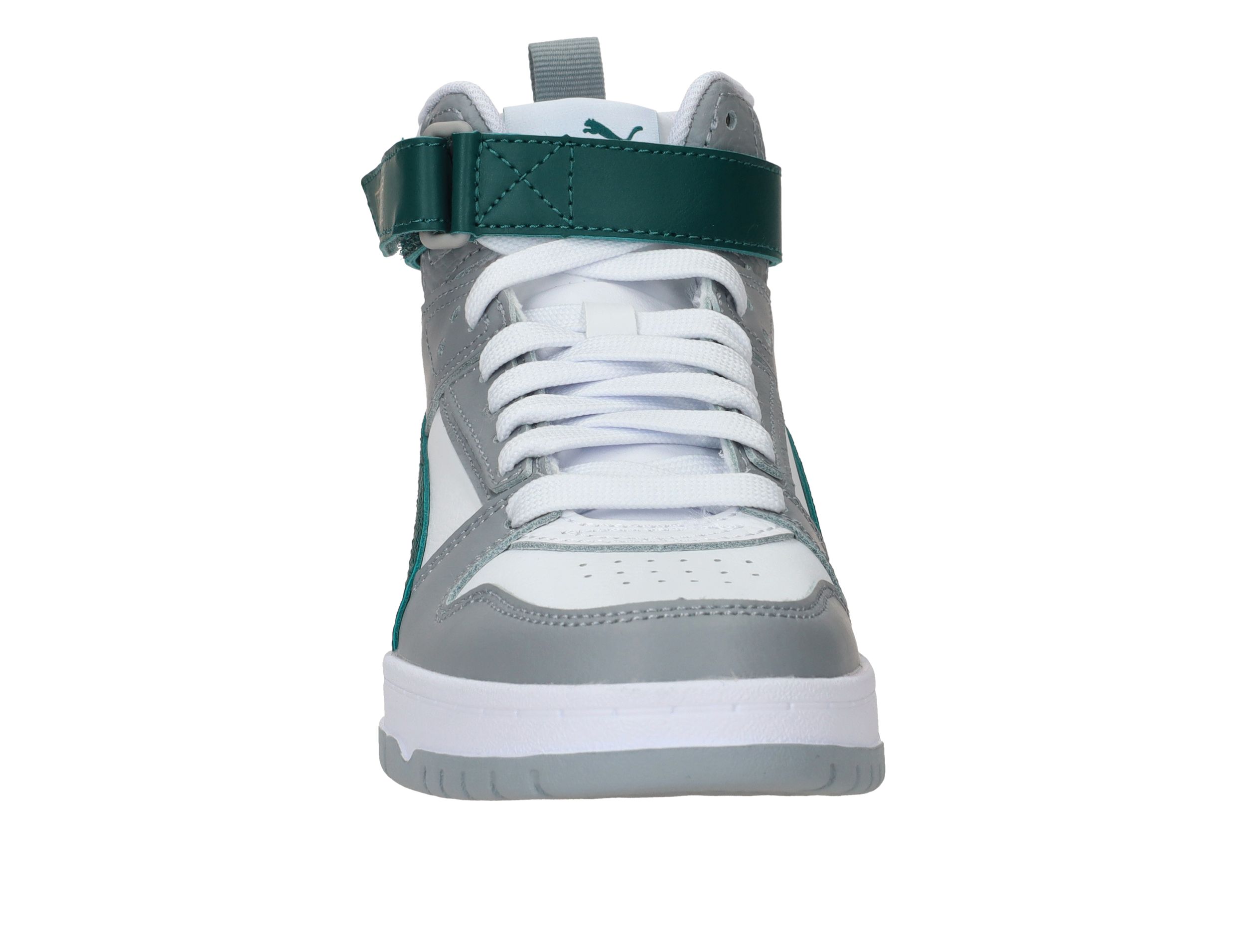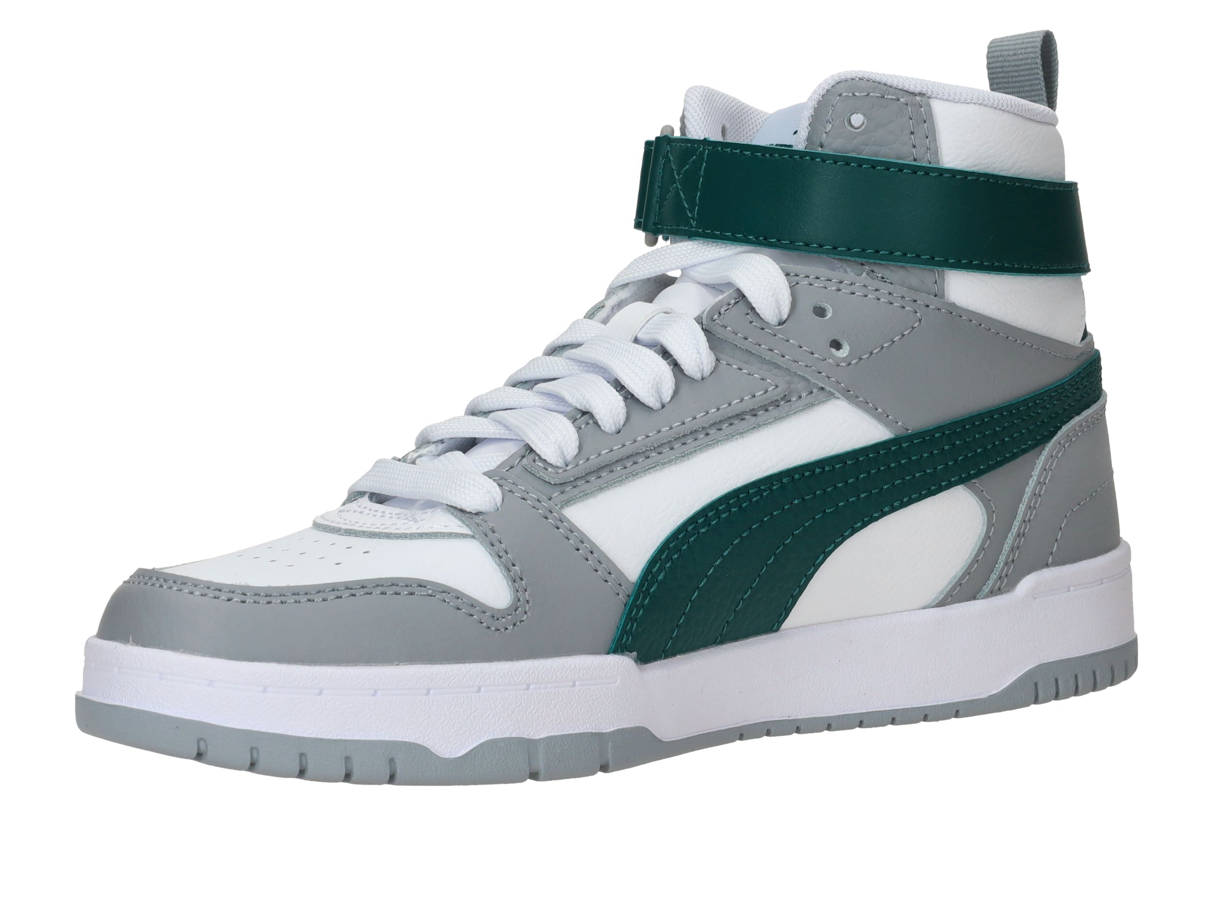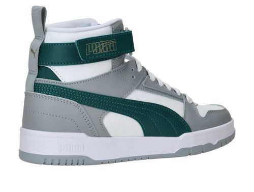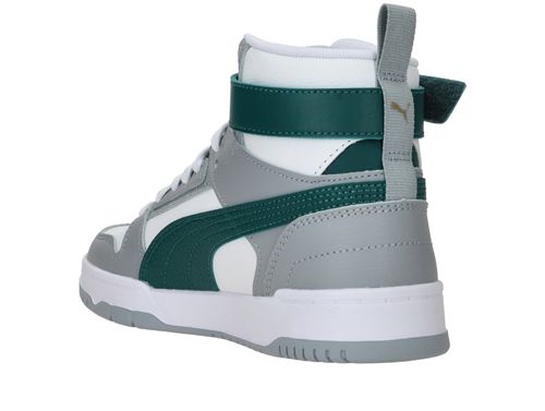 Stoere witte Puma RBD Game JR halfhoge sneaker voor jongens. De sneaker heeft grijze en groene accenten en heeft een veter- en klittenbandsluiting.